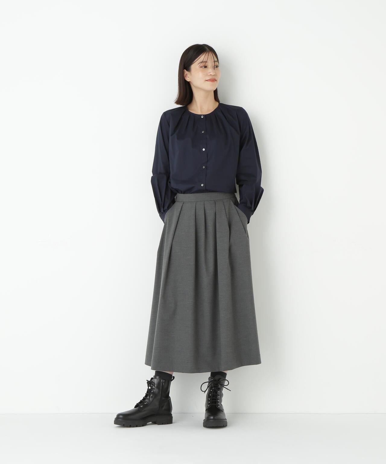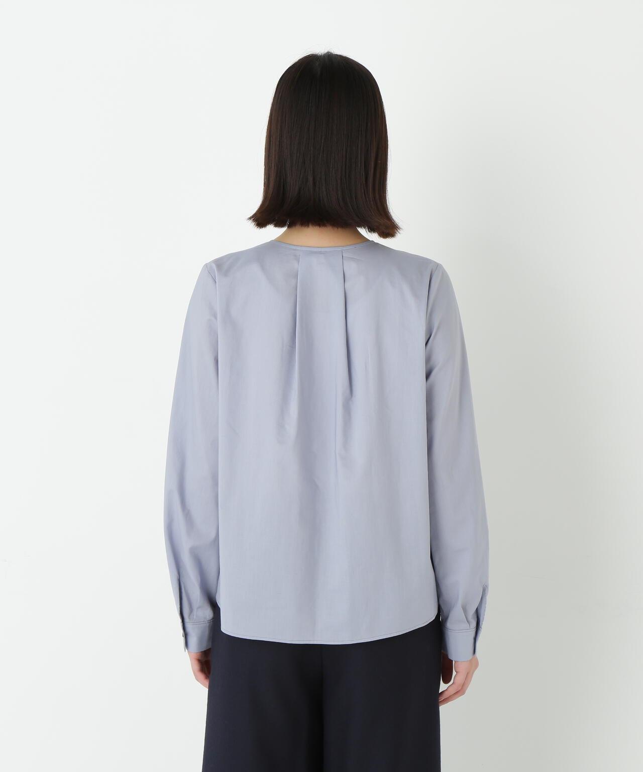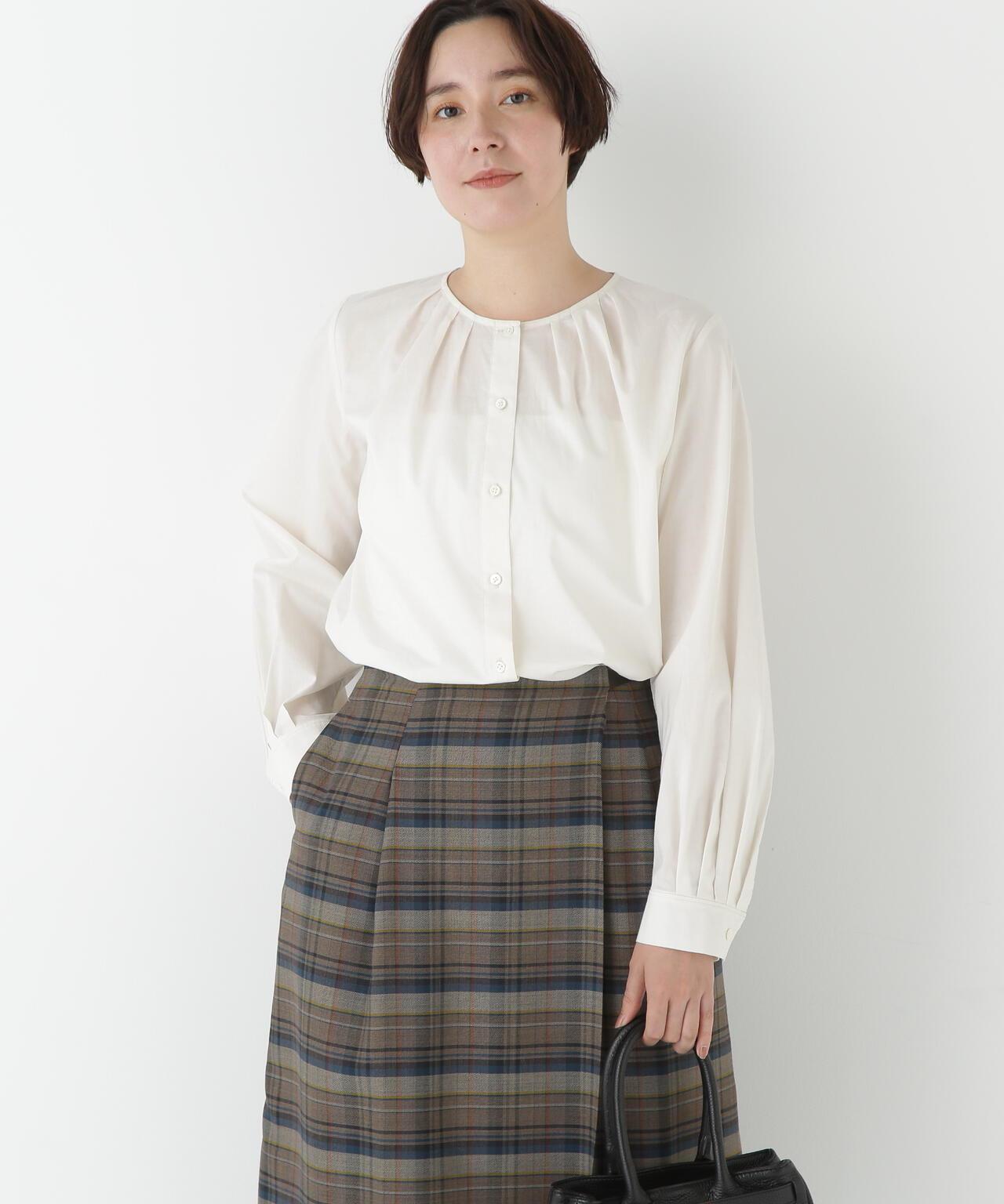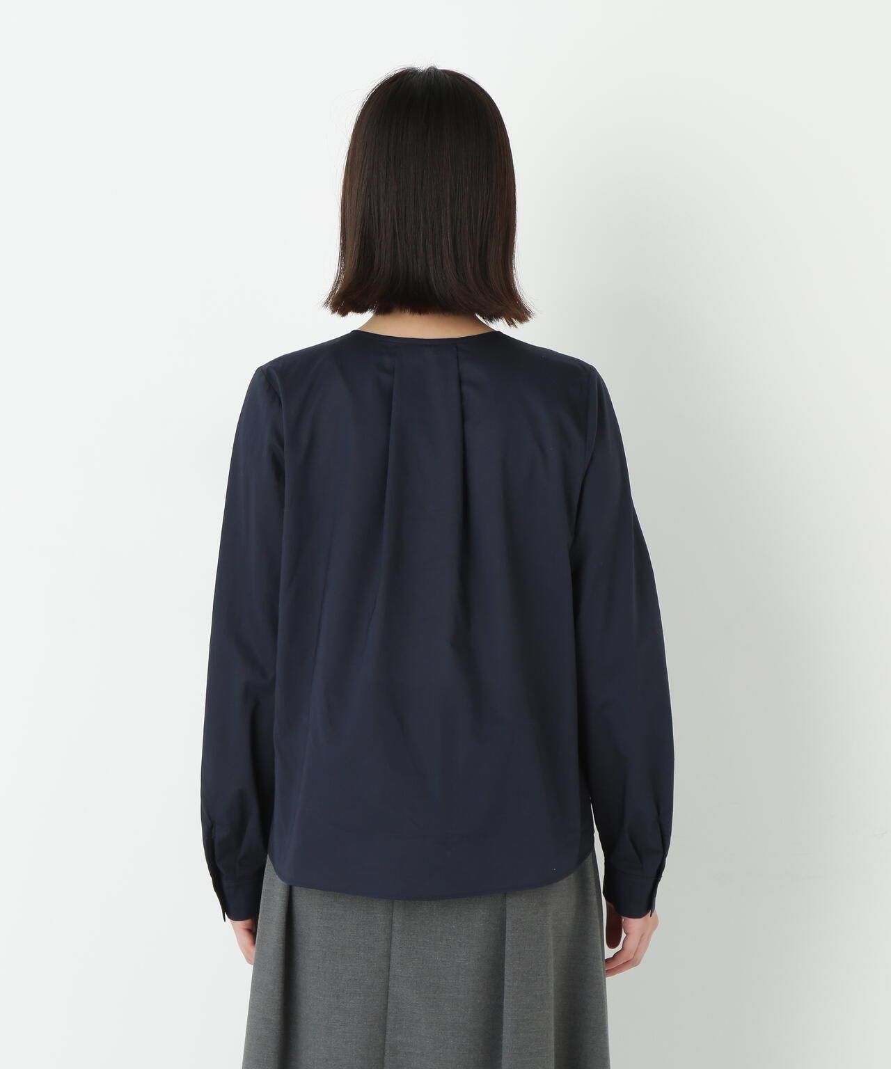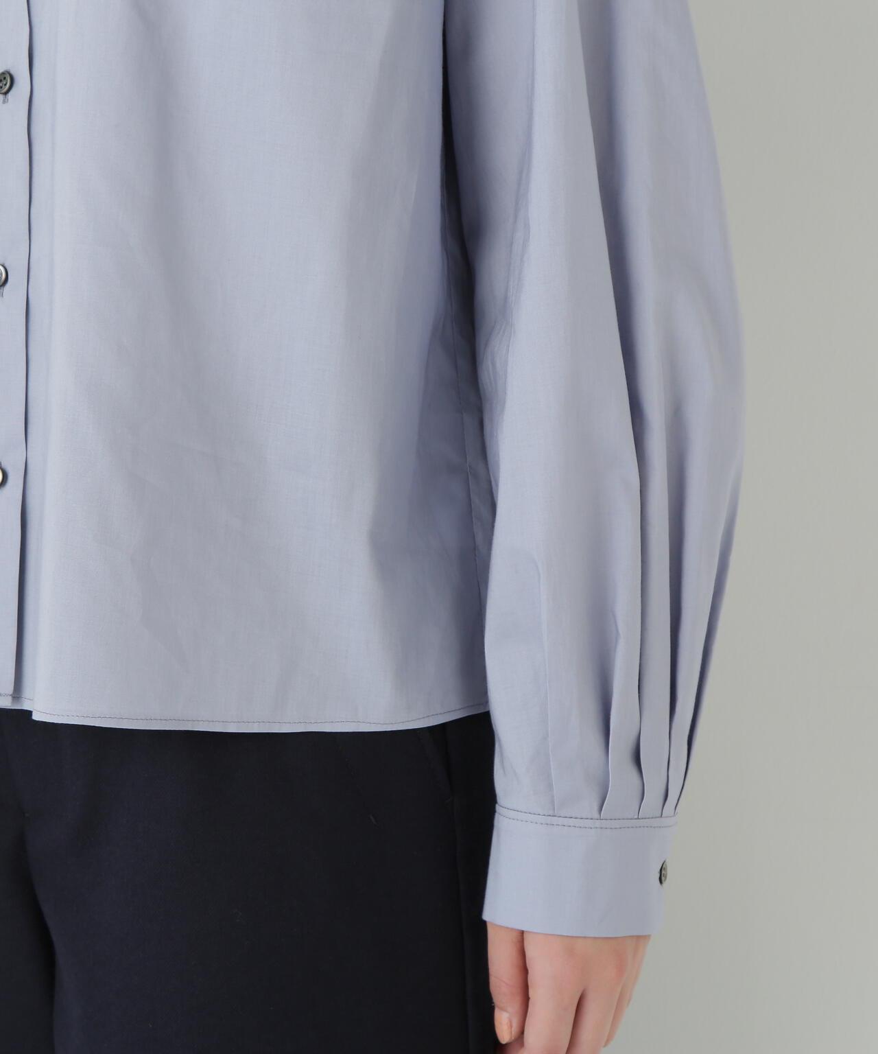 褶襉無領上衣 [設計要點] 這款前開襟圓領上衣在頸部有細微的隨意褶襉。簡潔的肩寬使袖子具有良好的體積感。上衣採用棉質打字機面料,經過空氣翻滾處理,具有水洗效果。推薦座標】這是一件可以搭配任何下裝的設計感上衣。在辦公室場景中也很實用,因為它具有美麗的氛圍。
