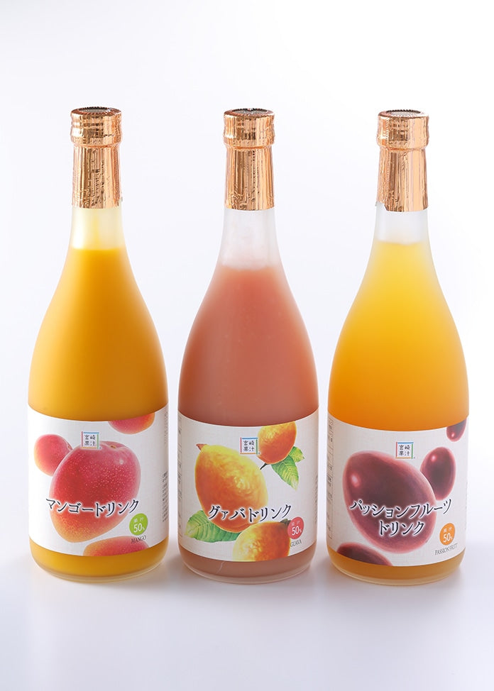 該套裝包括三瓶720毫升的番石榴、百香果和芒果飲料。番石榴有一種溫和的味道,讓人想起桃子的味道。百香果有一種清爽的味道,你不會厭倦。芒果具有恰到好處的甜味和豐富的口感。番石榴飲料是由粉紅番石榴製成的,在它完全不為人知的時候,它就已經在公司自己的農場裡種植了。它有一種豐富的果味。