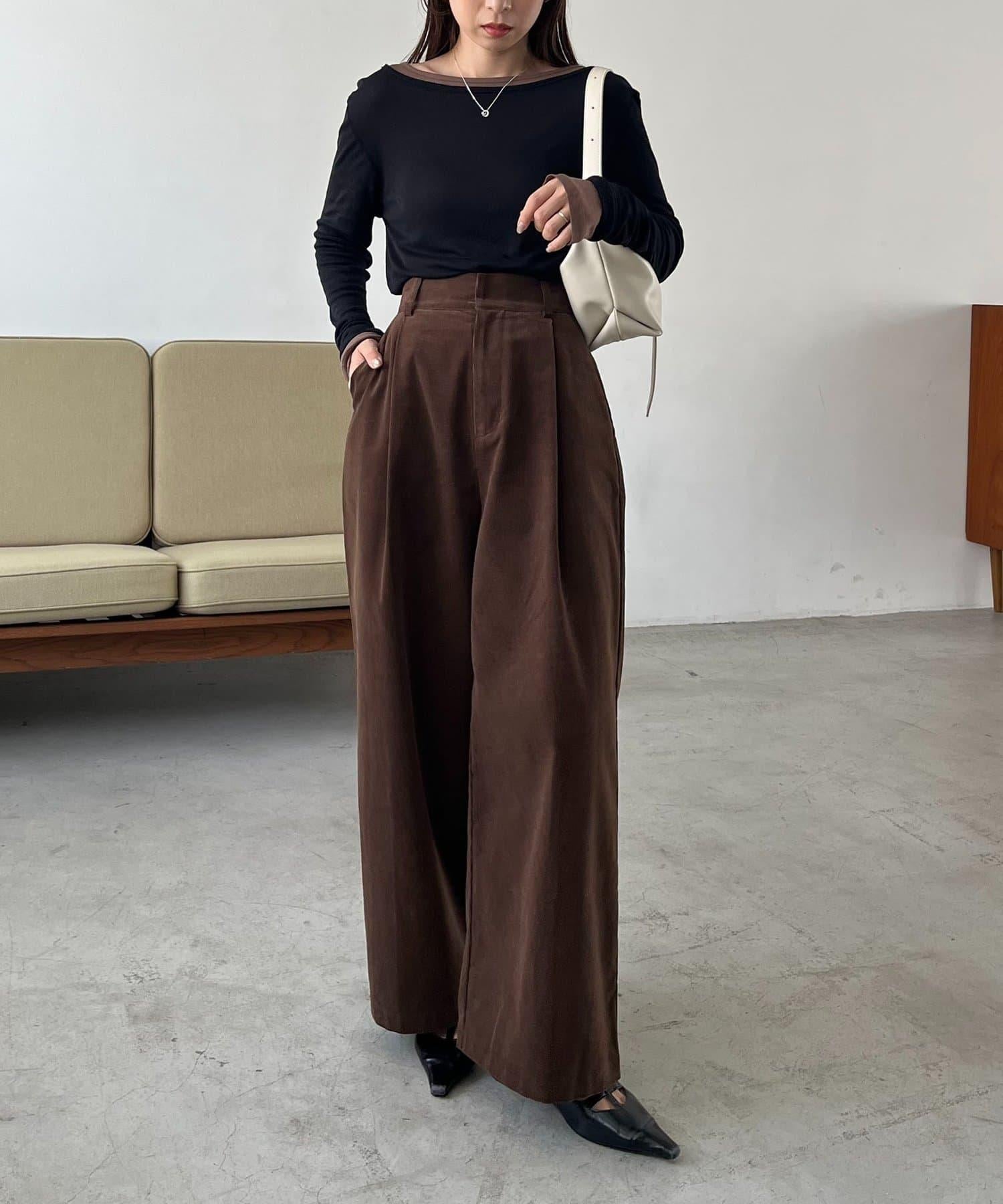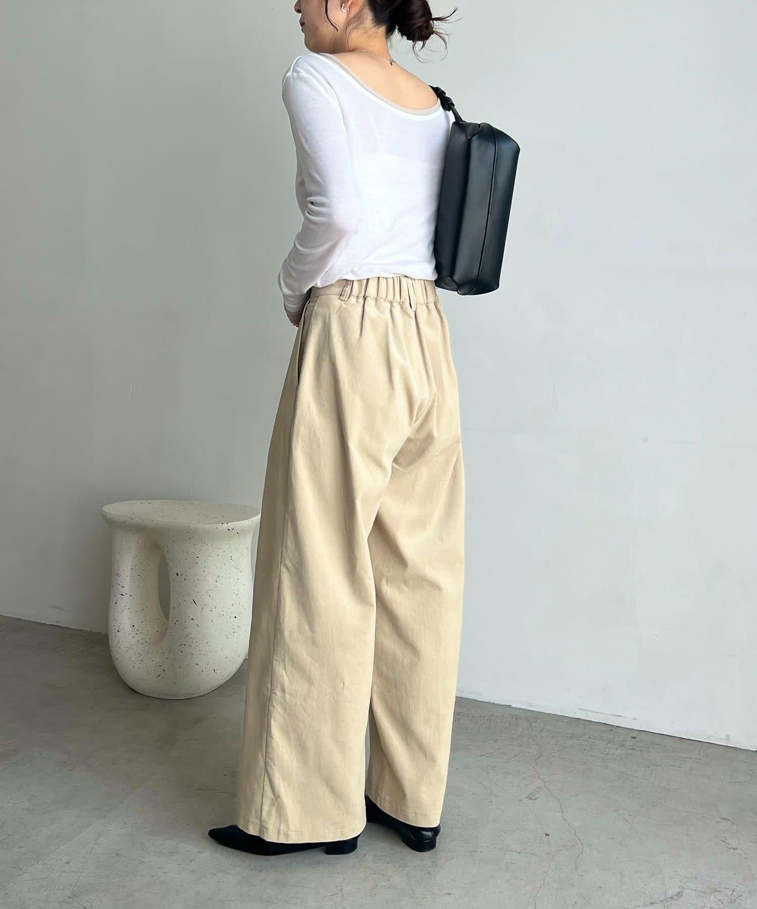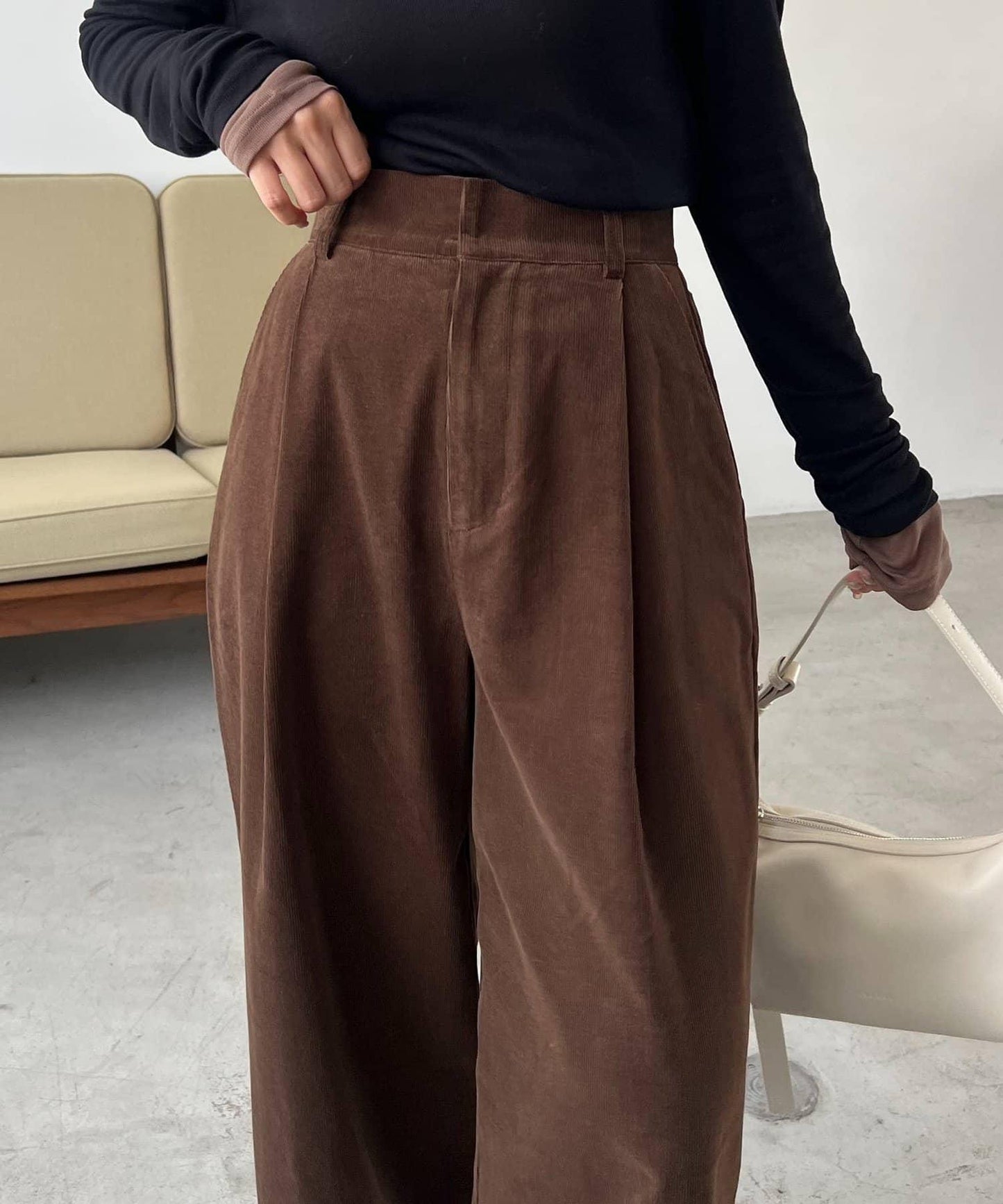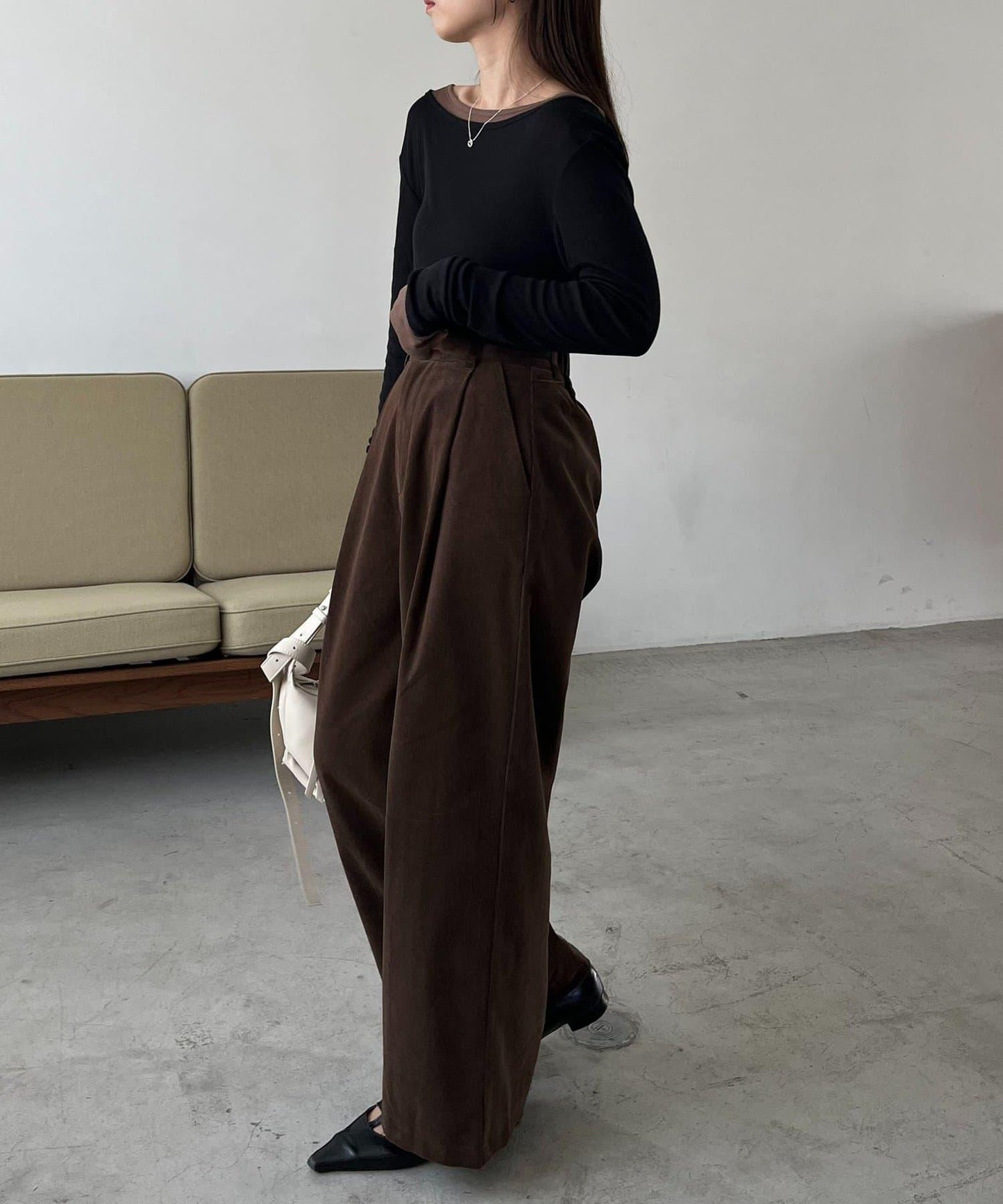 長褲的材質讓它即使搭配簡單的上衣也顯得時尚。