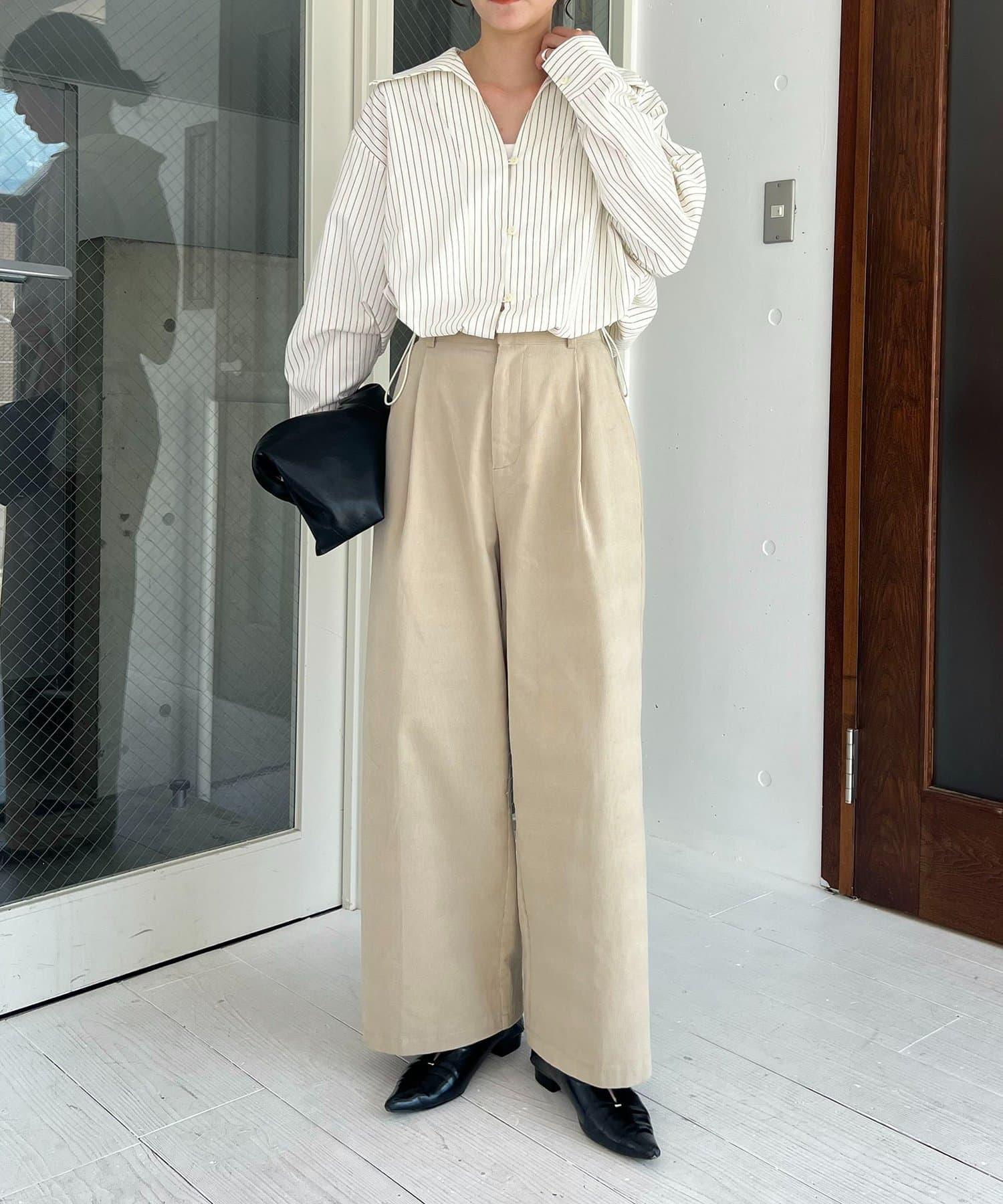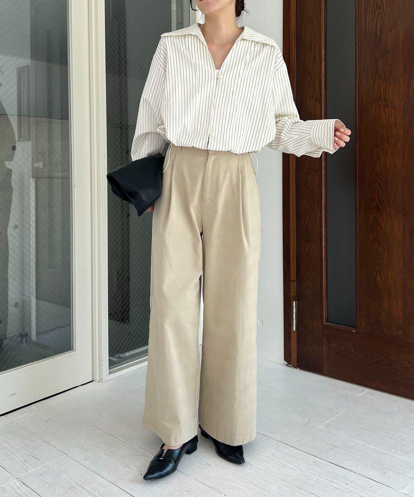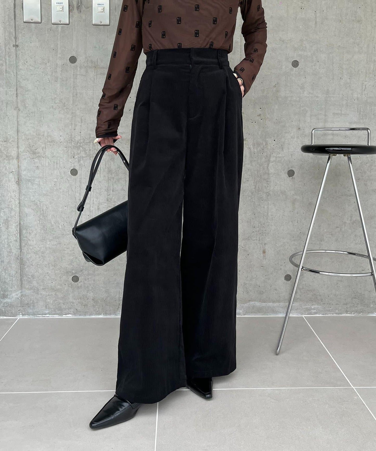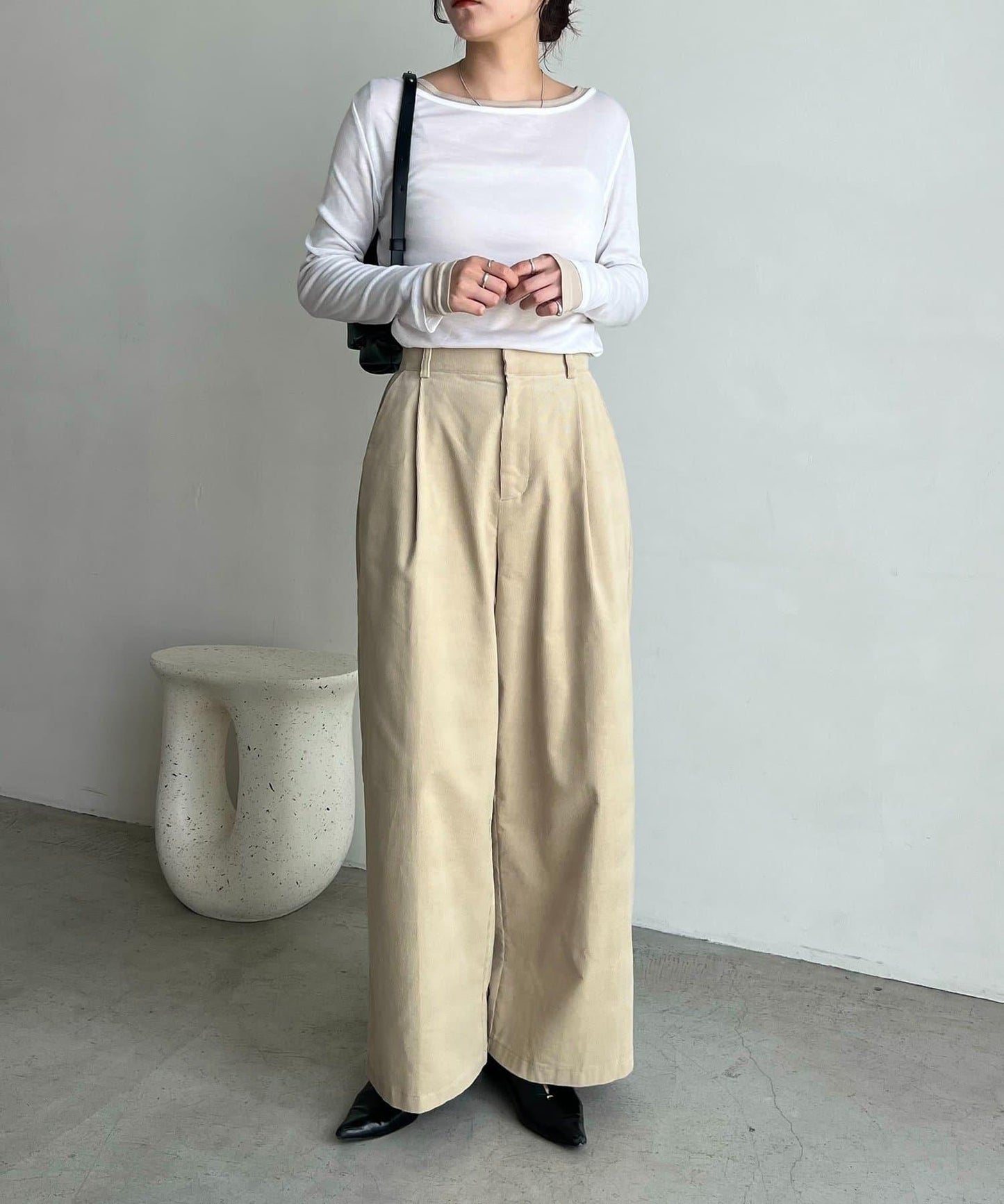 長褲的材質讓它即使搭配簡單的上衣也顯得時尚。