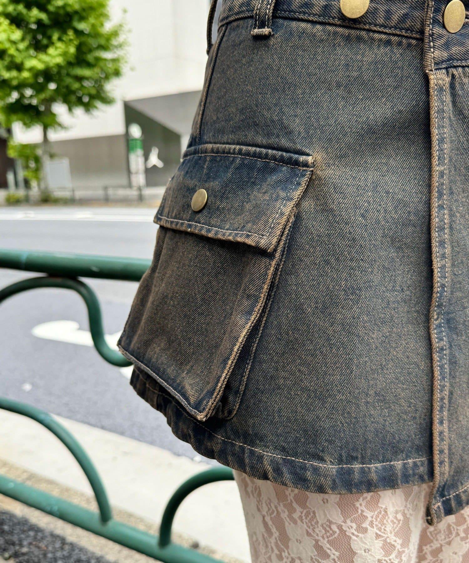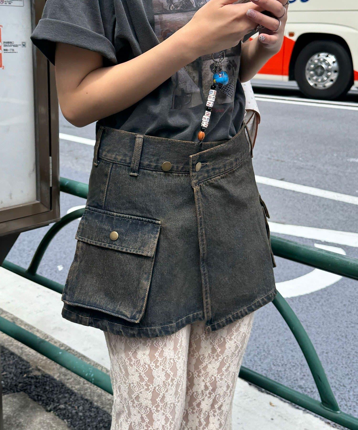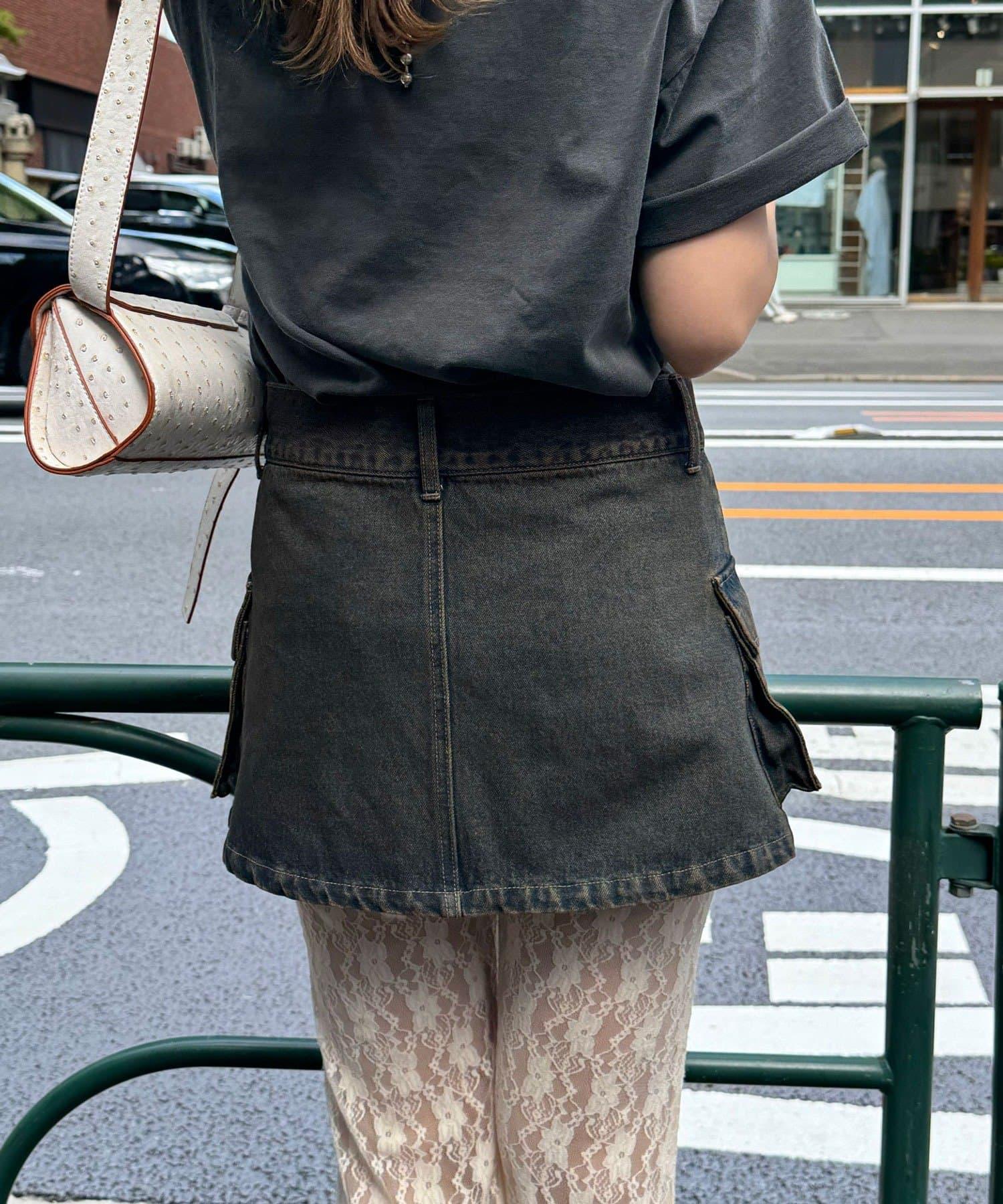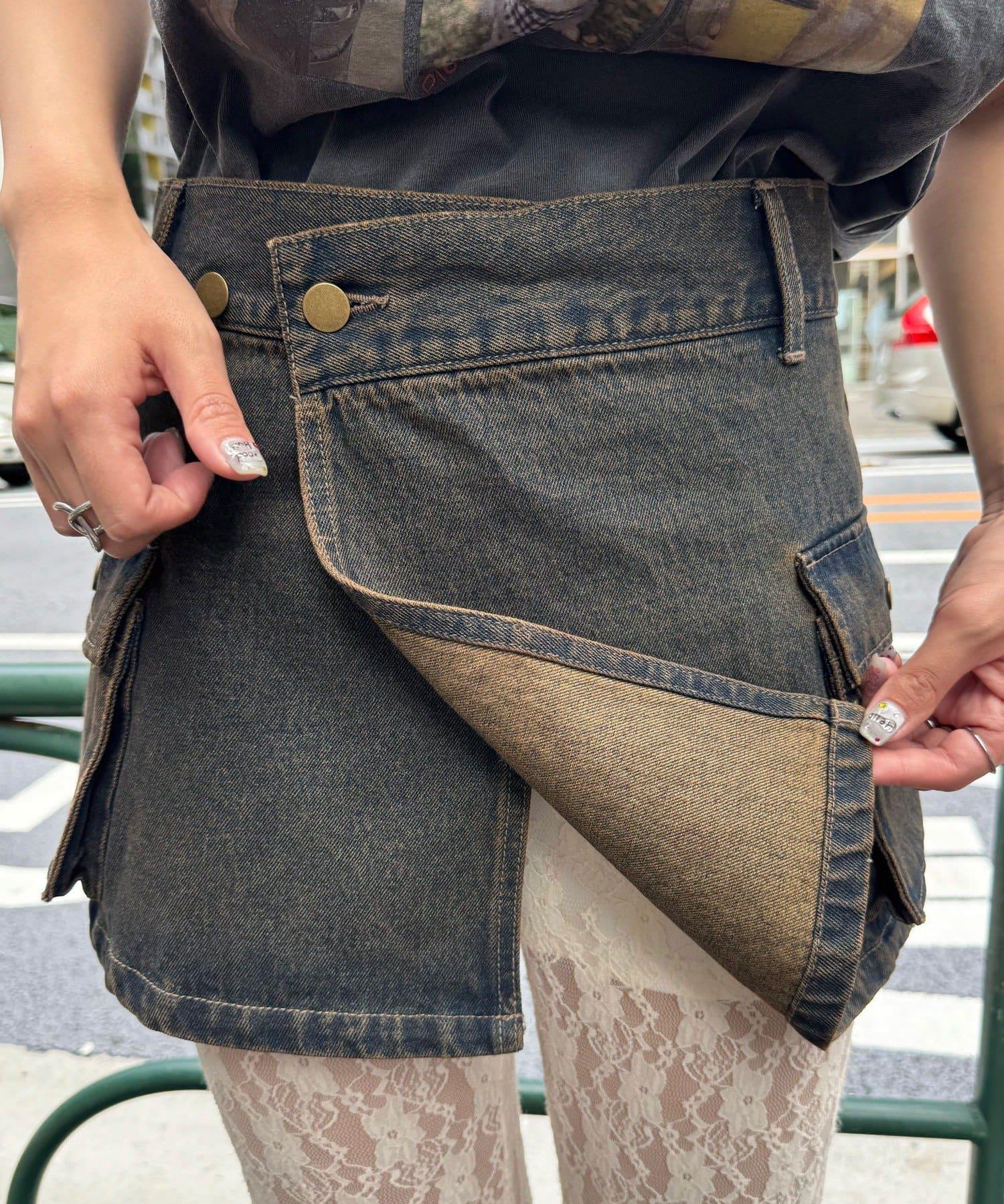 這款罩染牛仔卷邊裙有著復古般的褪色效果。