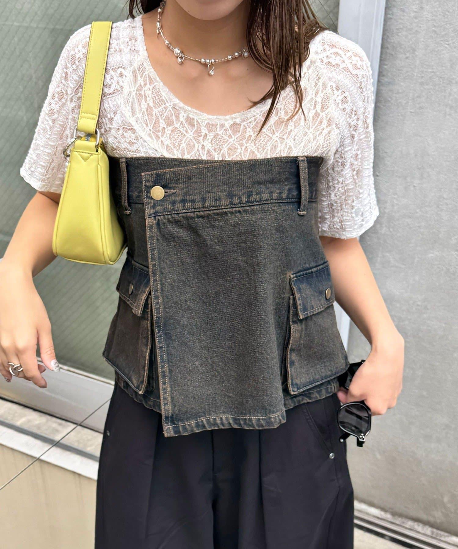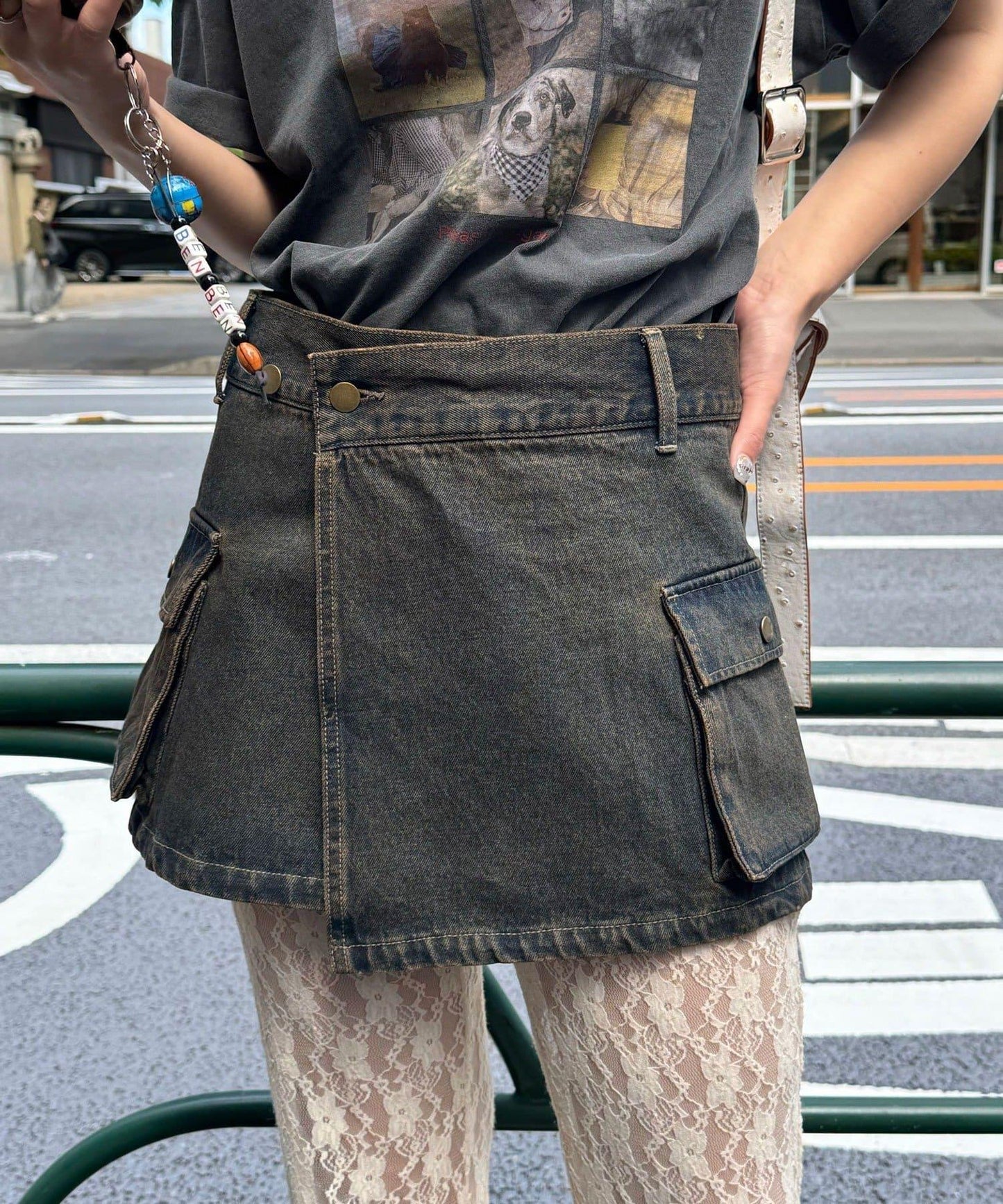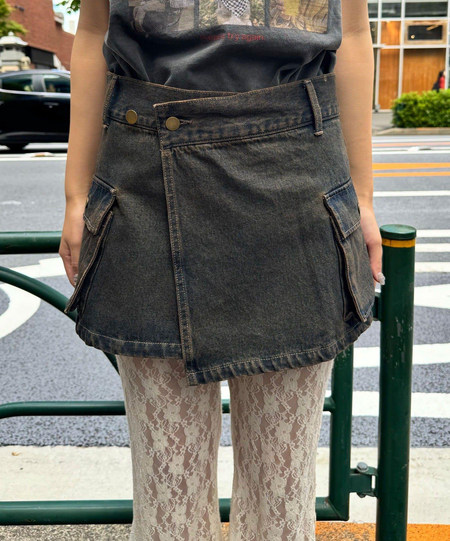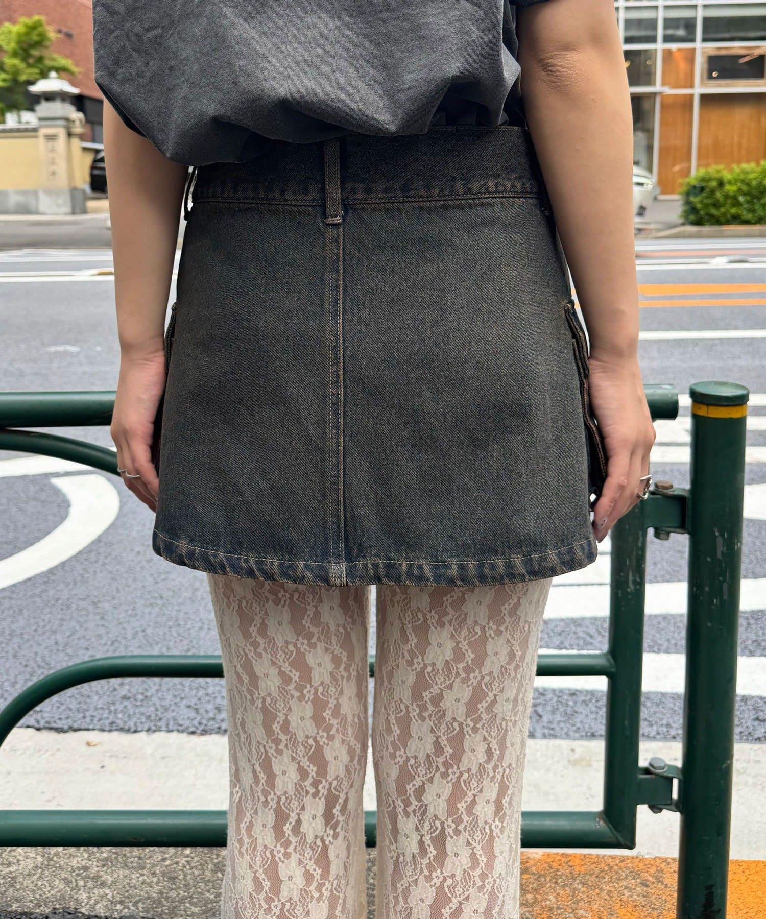 這款罩染牛仔卷邊裙有著復古般的褪色效果。