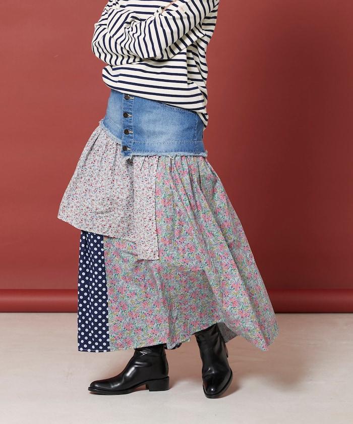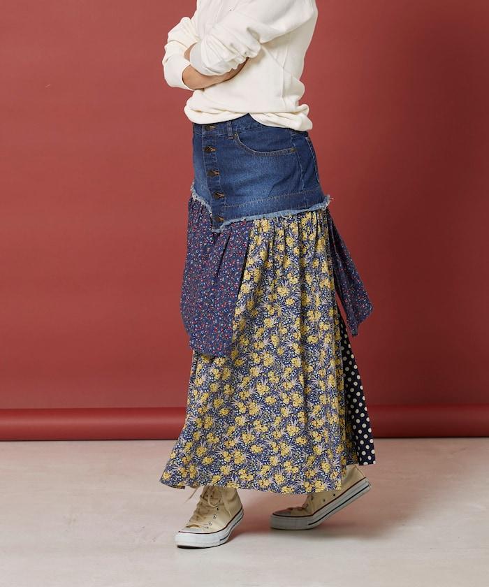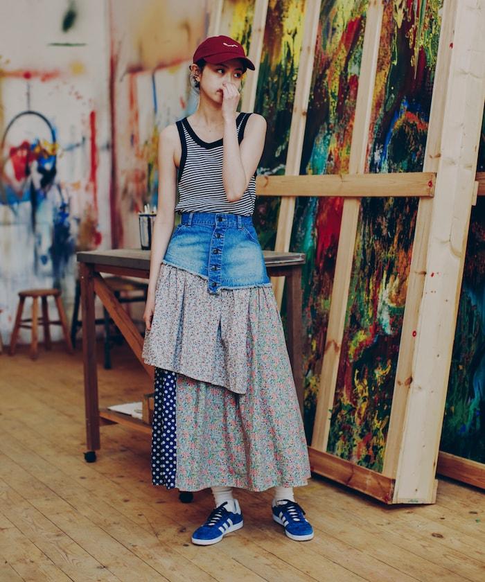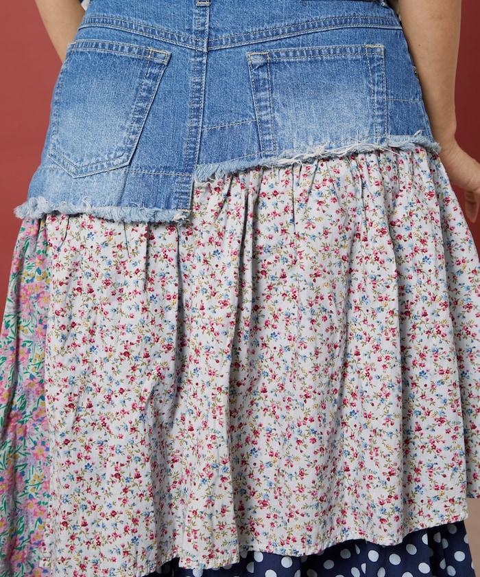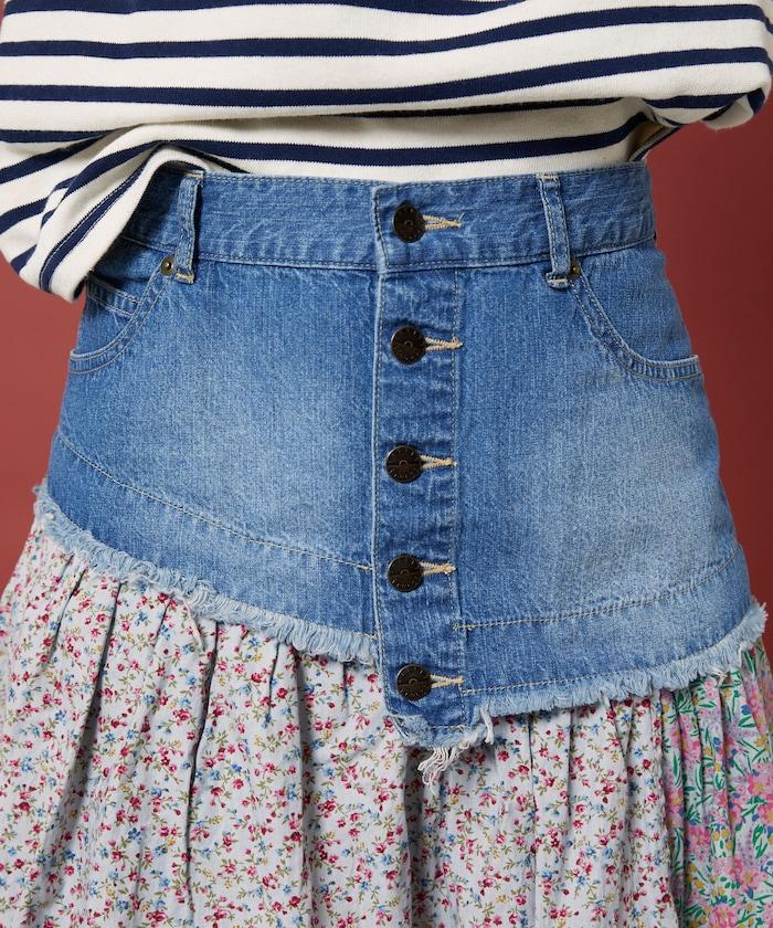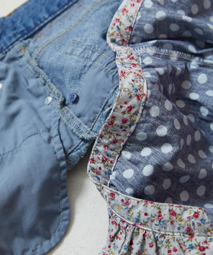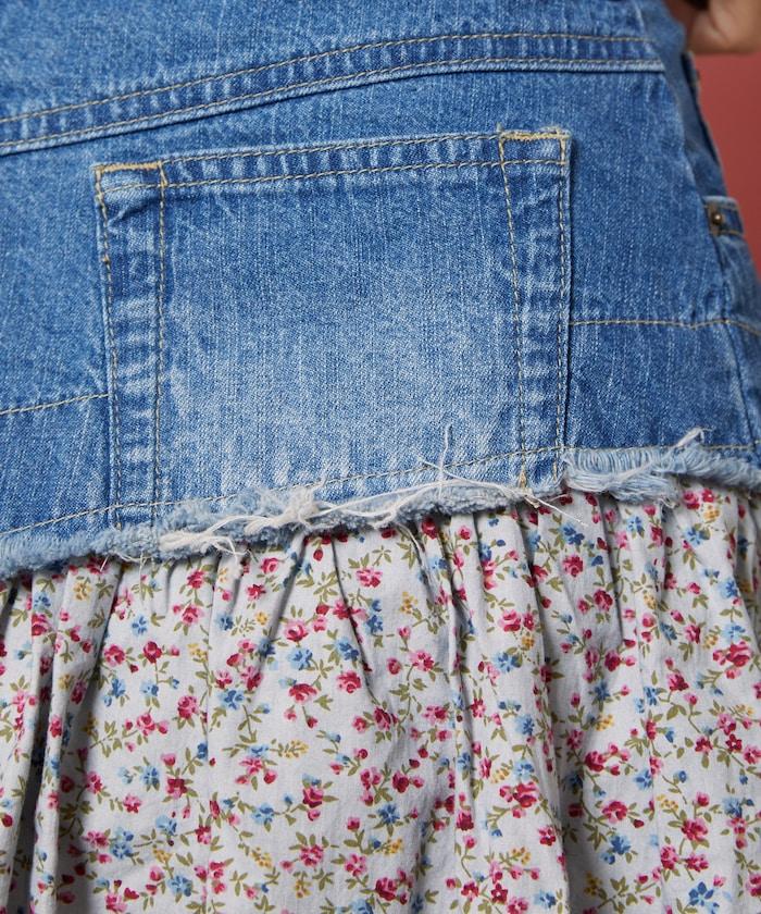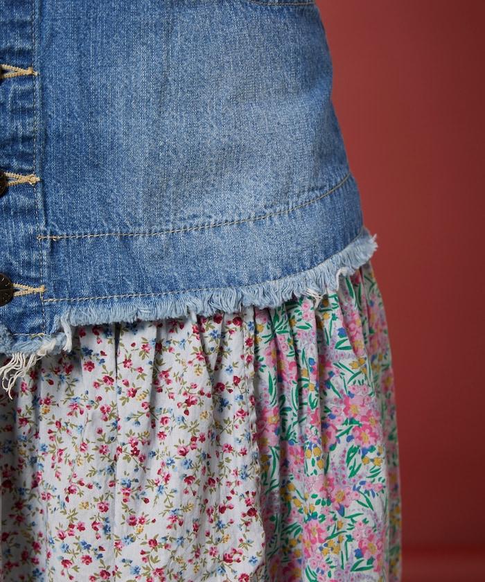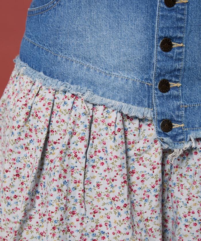 復古風十足的牛仔裙,宛如牛仔裙的翻版,牛仔布下是 Freada 標誌性的碎花和圓點拼接面料。