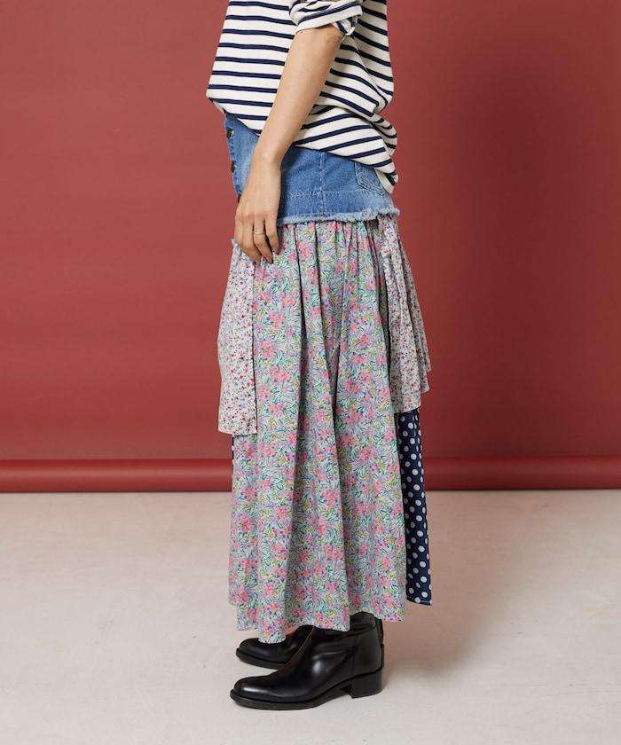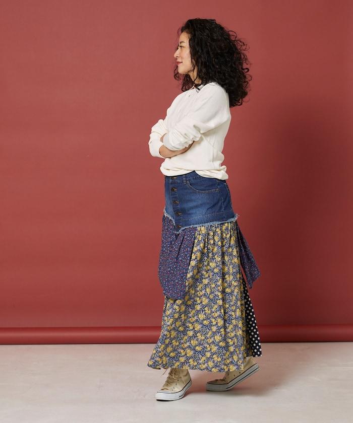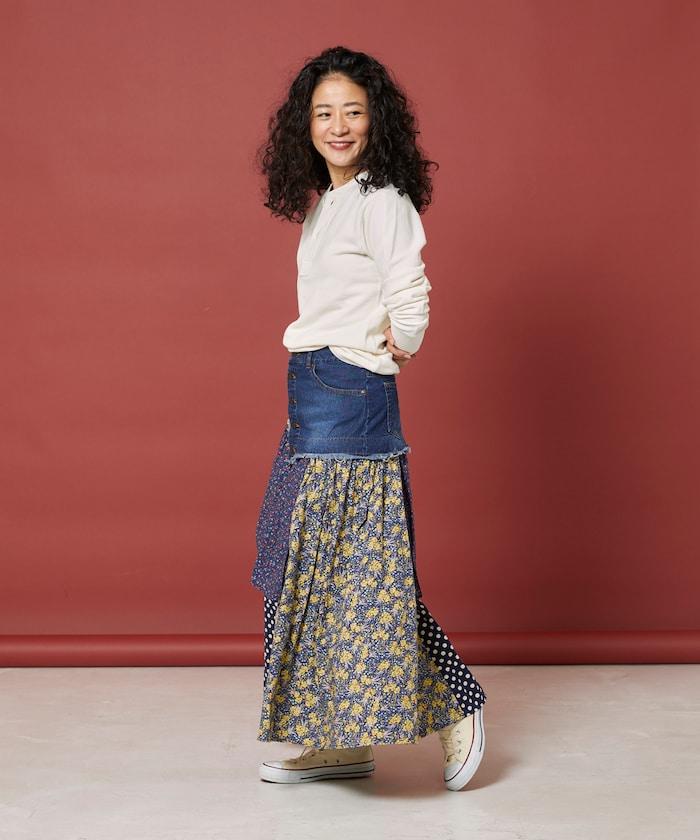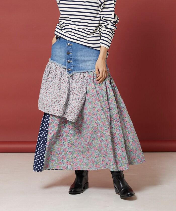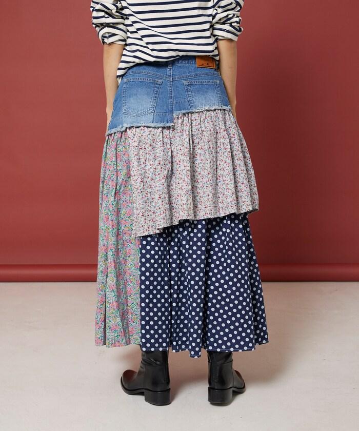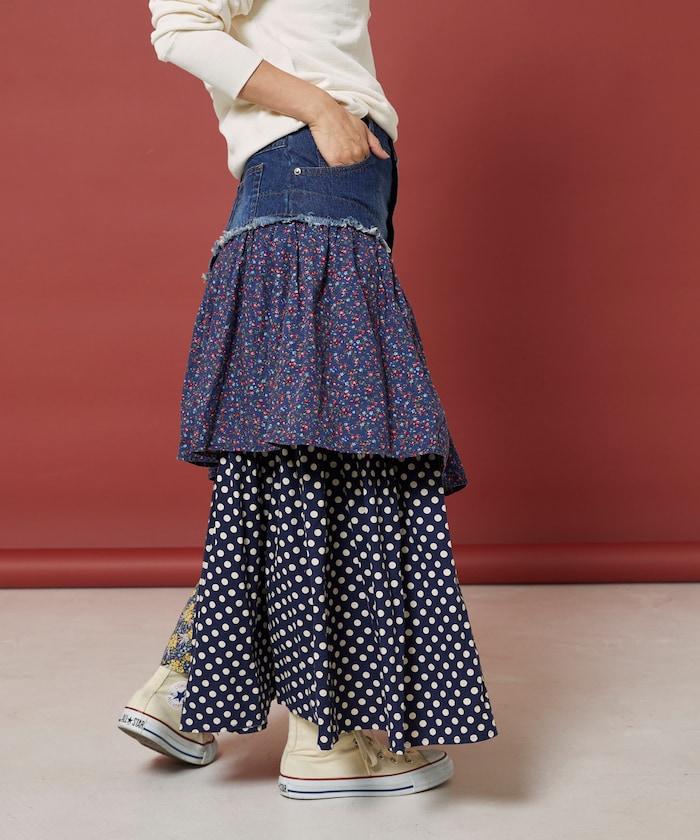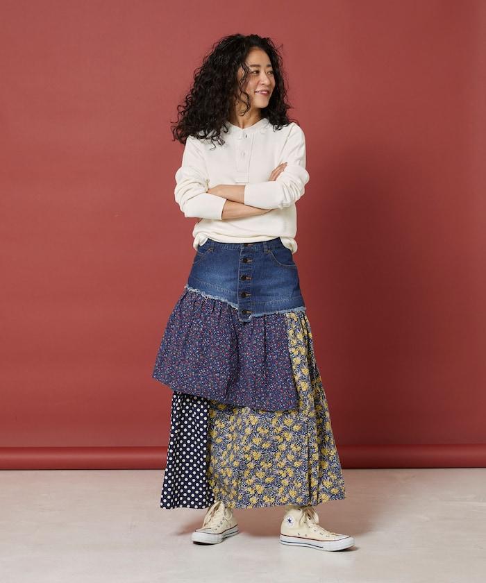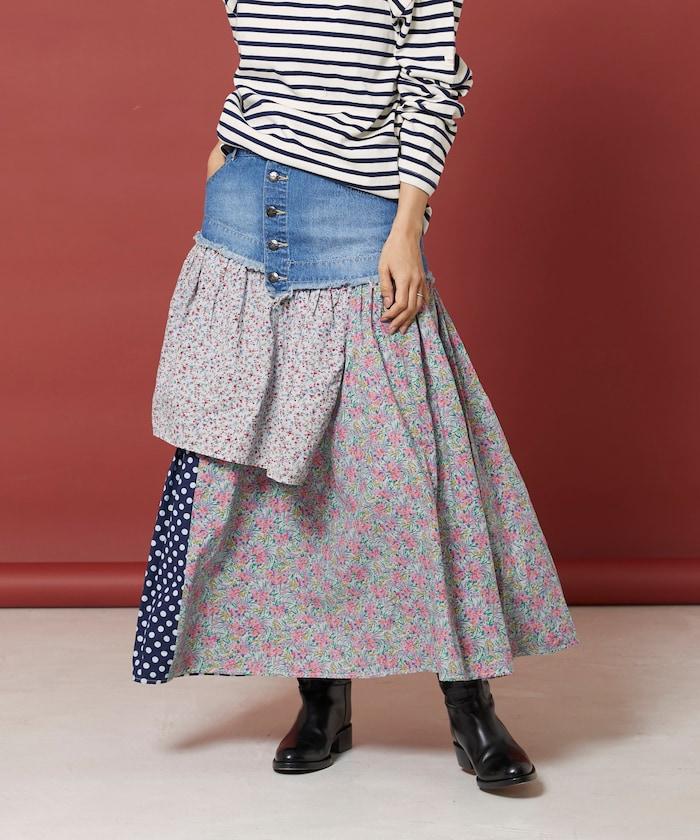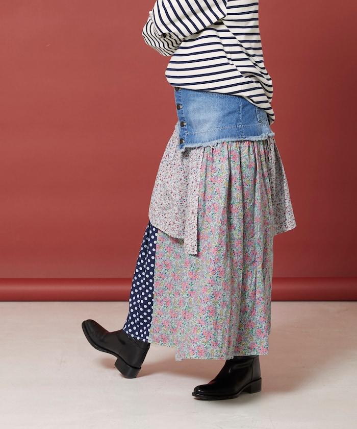 復古風十足的牛仔裙,宛如牛仔裙的翻版,牛仔布下是 Freada 標誌性的碎花和圓點拼接面料。