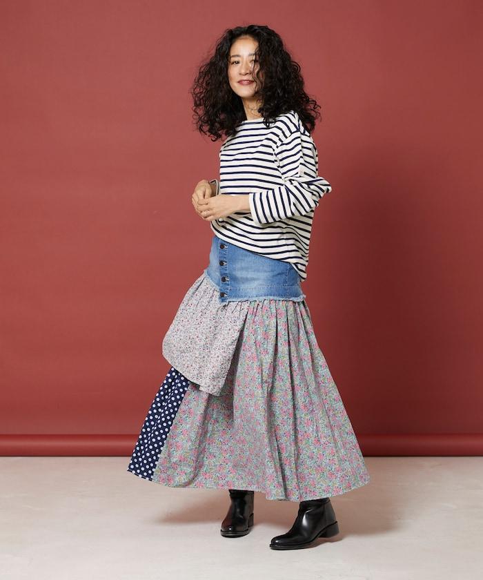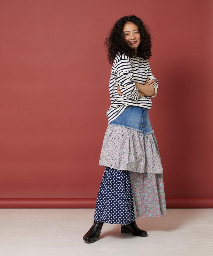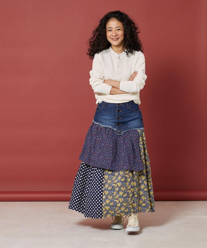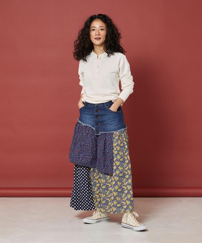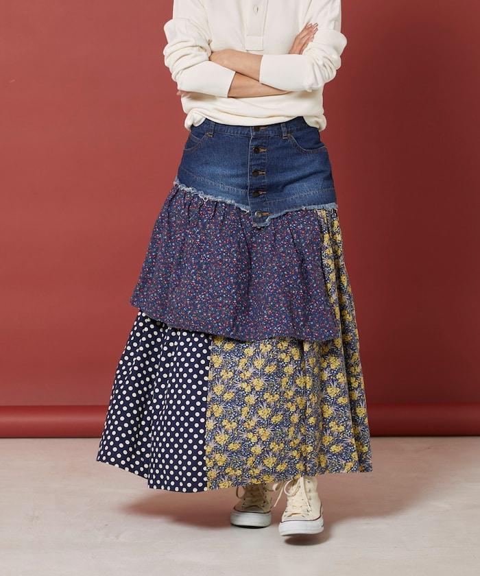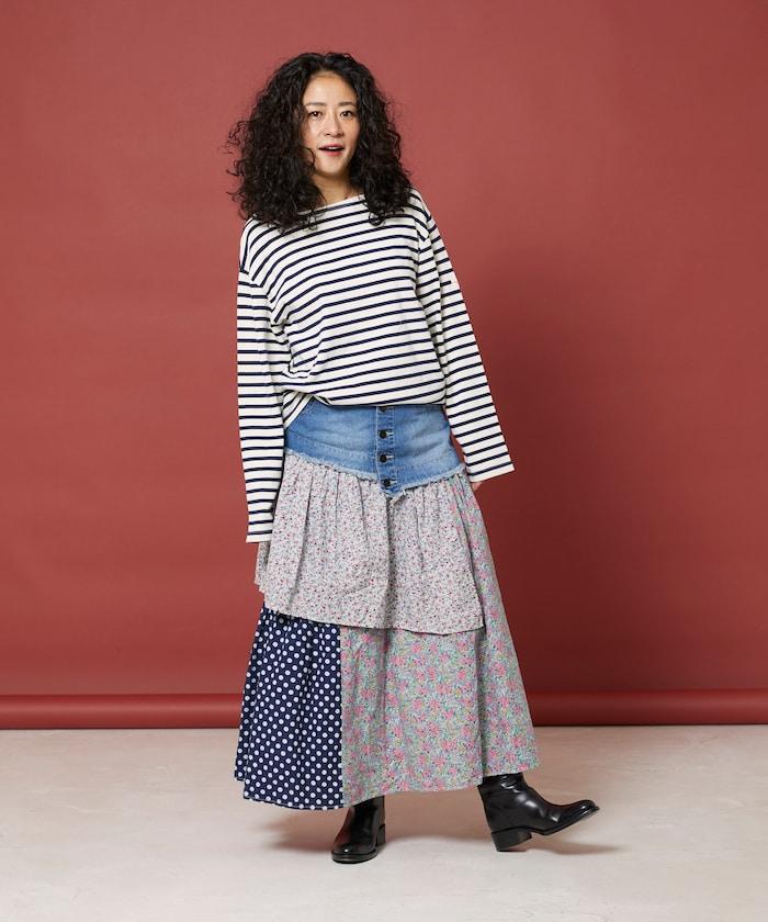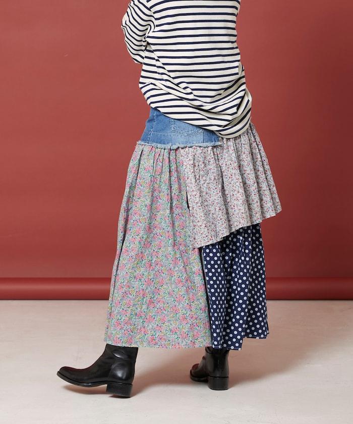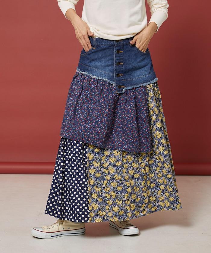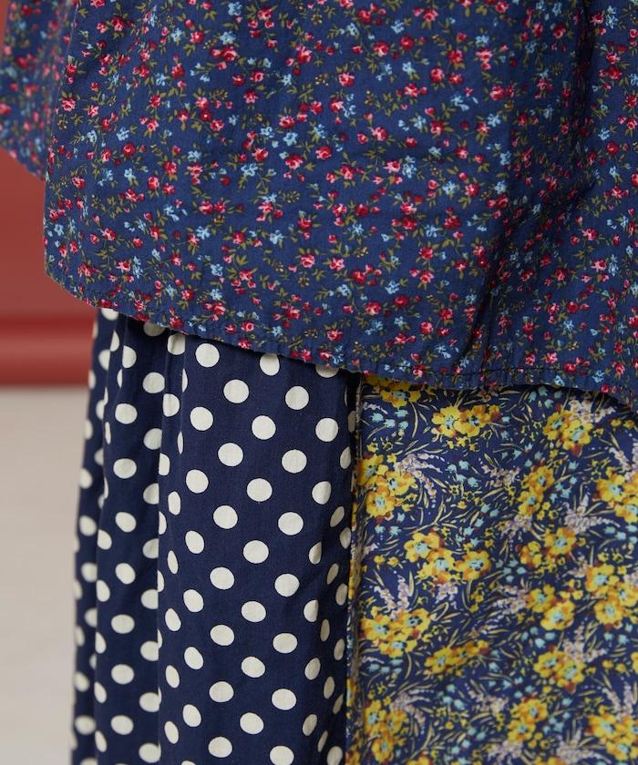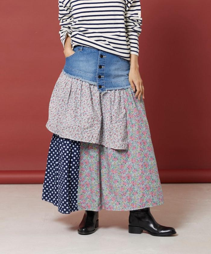 復古風十足的牛仔裙,宛如牛仔裙的翻版,牛仔布下是 Freada 標誌性的碎花和圓點拼接面料。