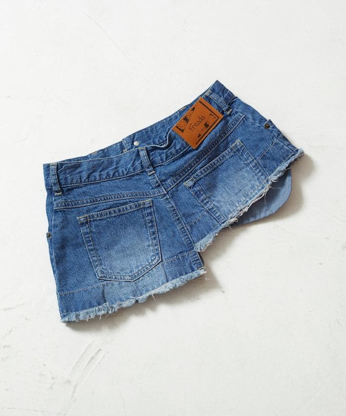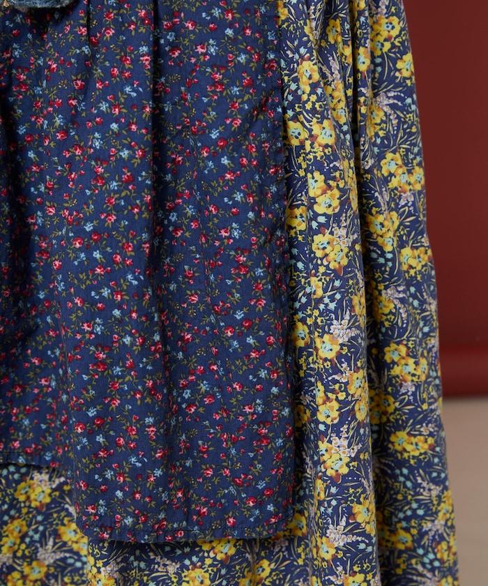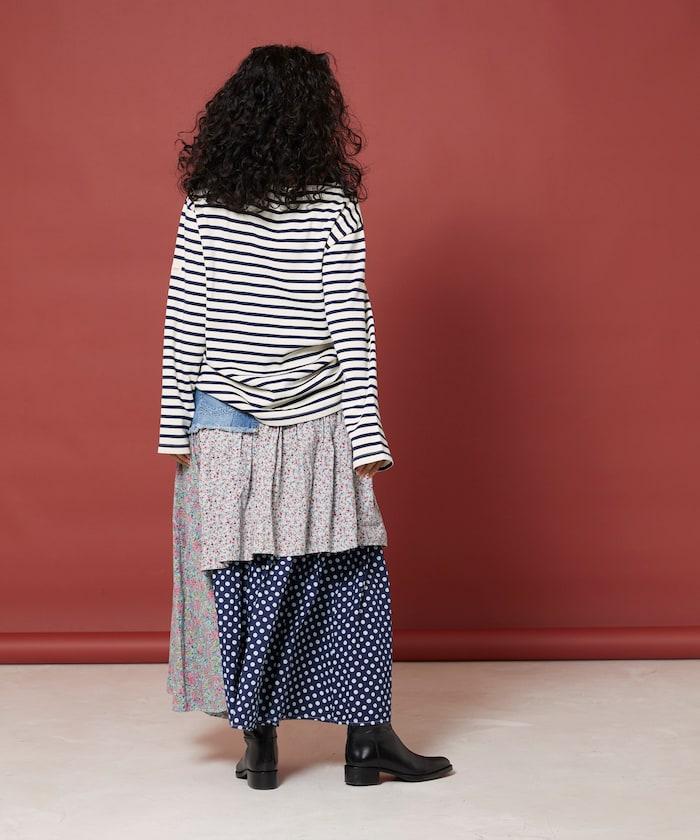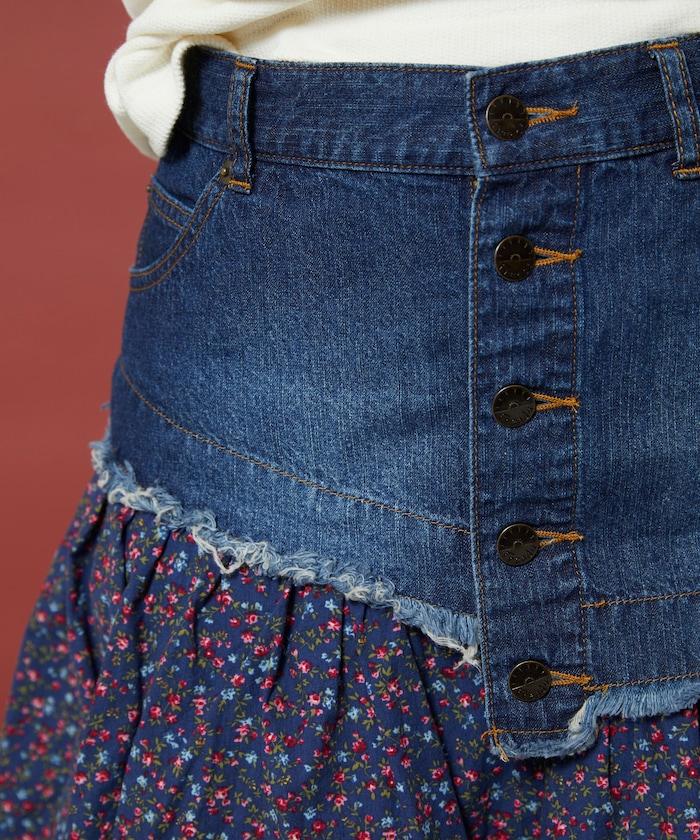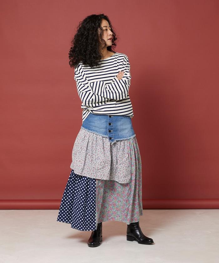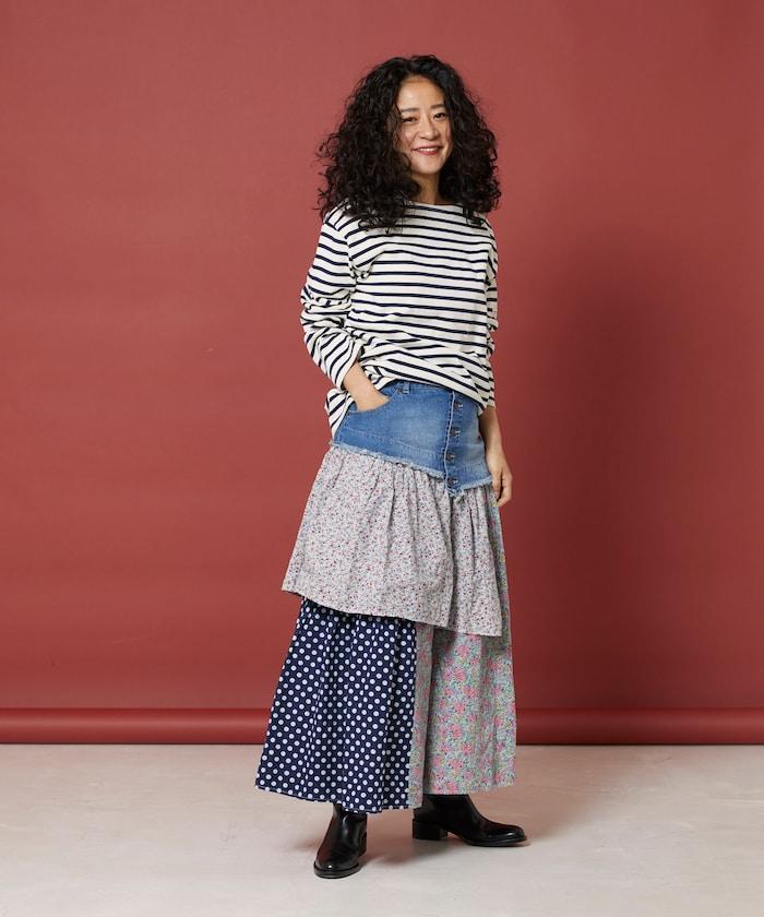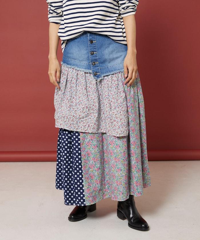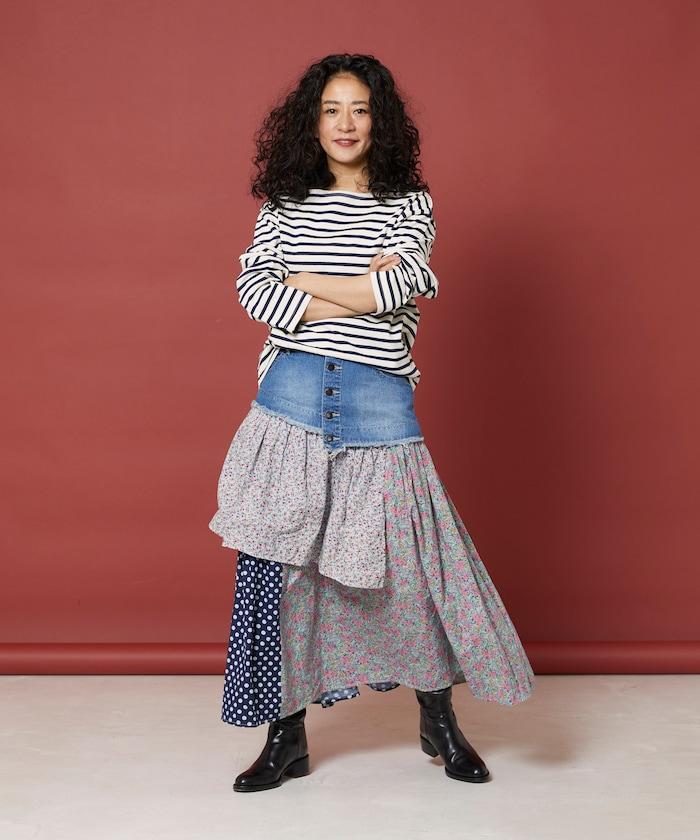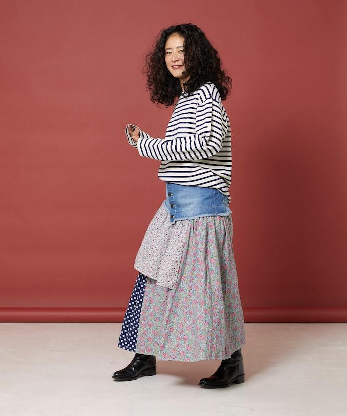 復古風十足的牛仔裙,宛如牛仔裙的翻版,牛仔布下是 Freada 標誌性的碎花和圓點拼接面料。