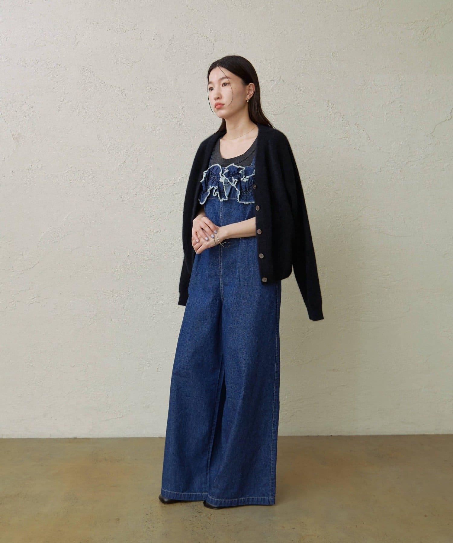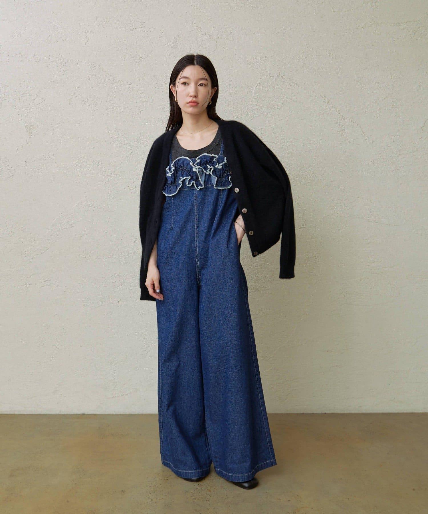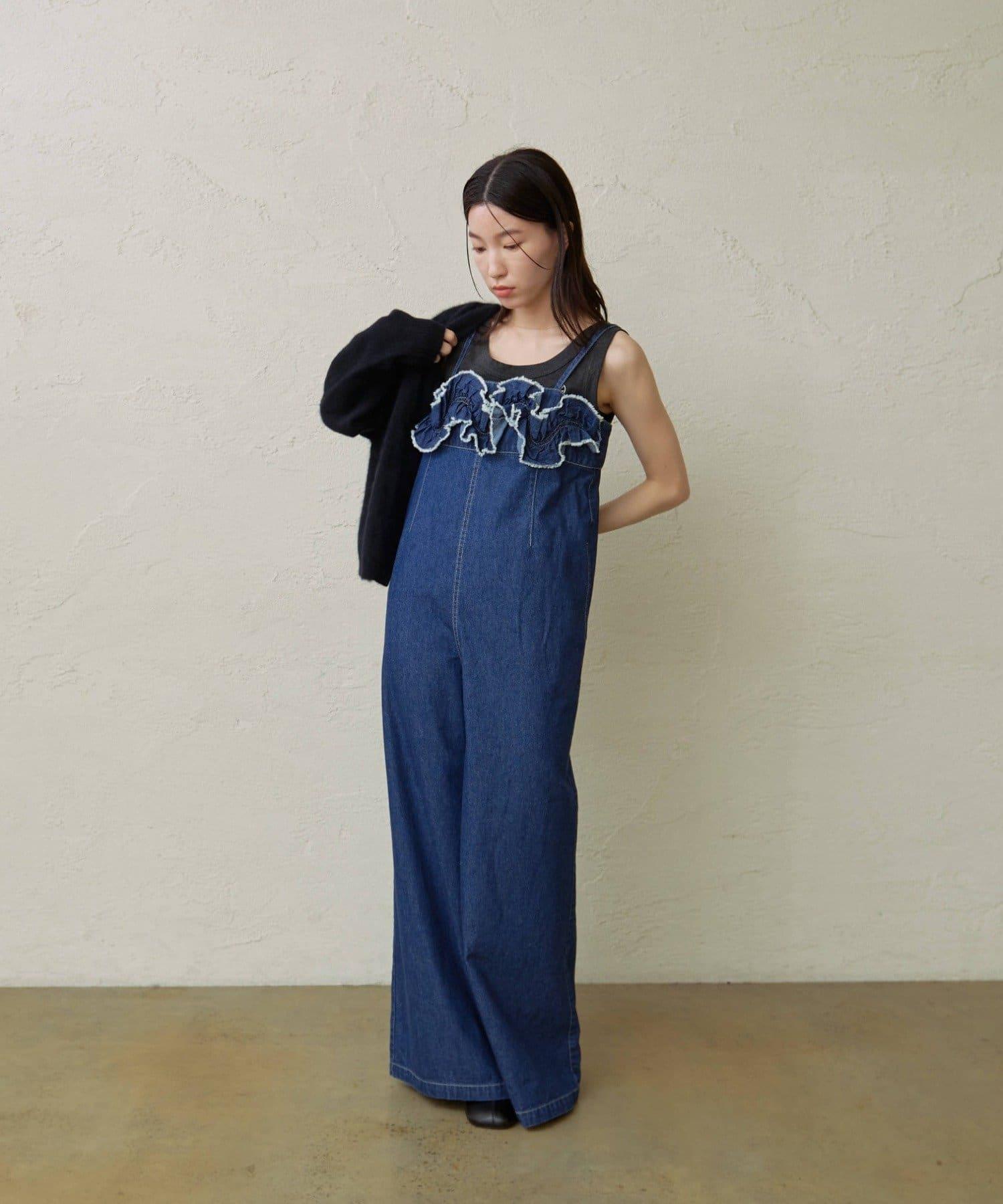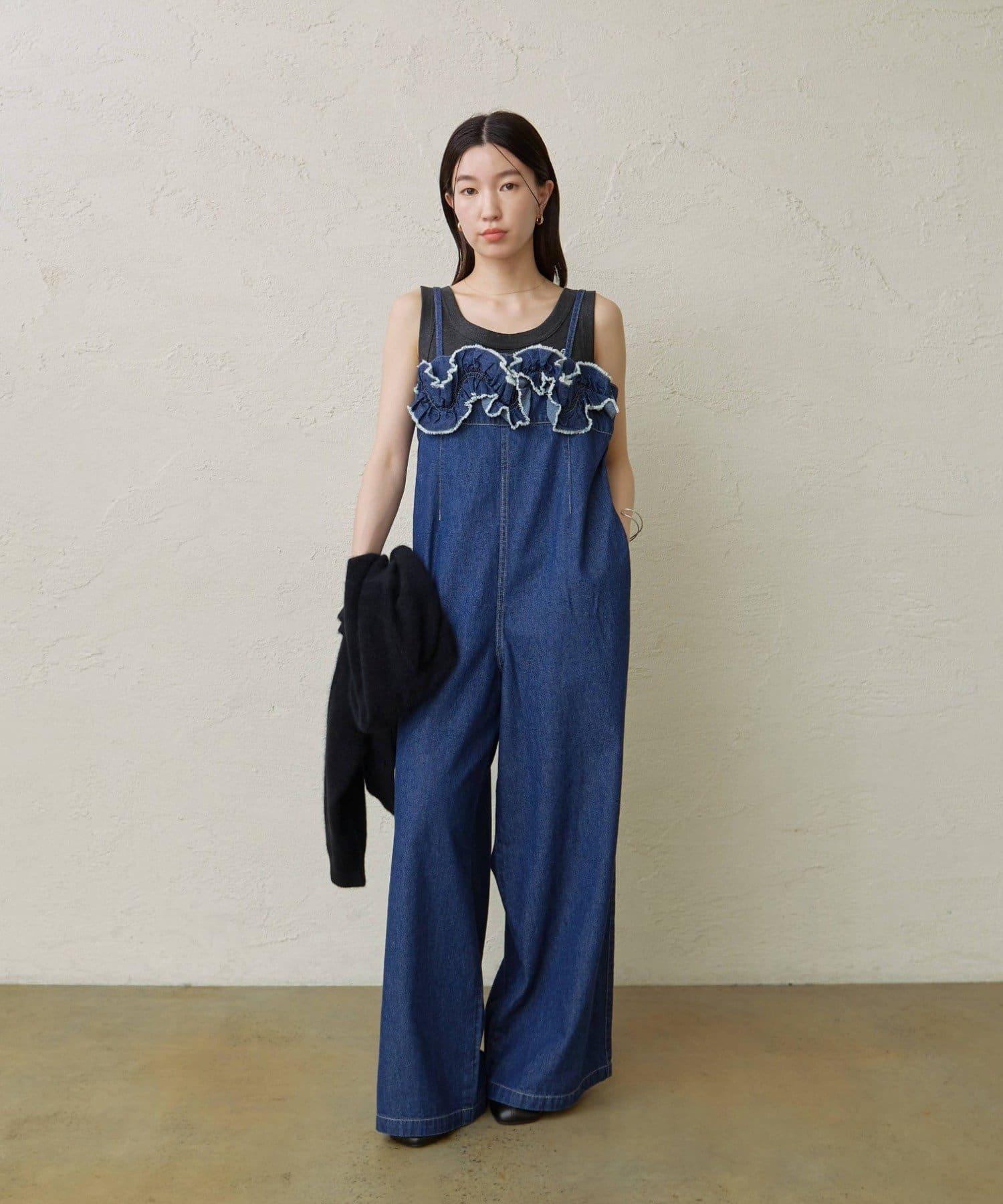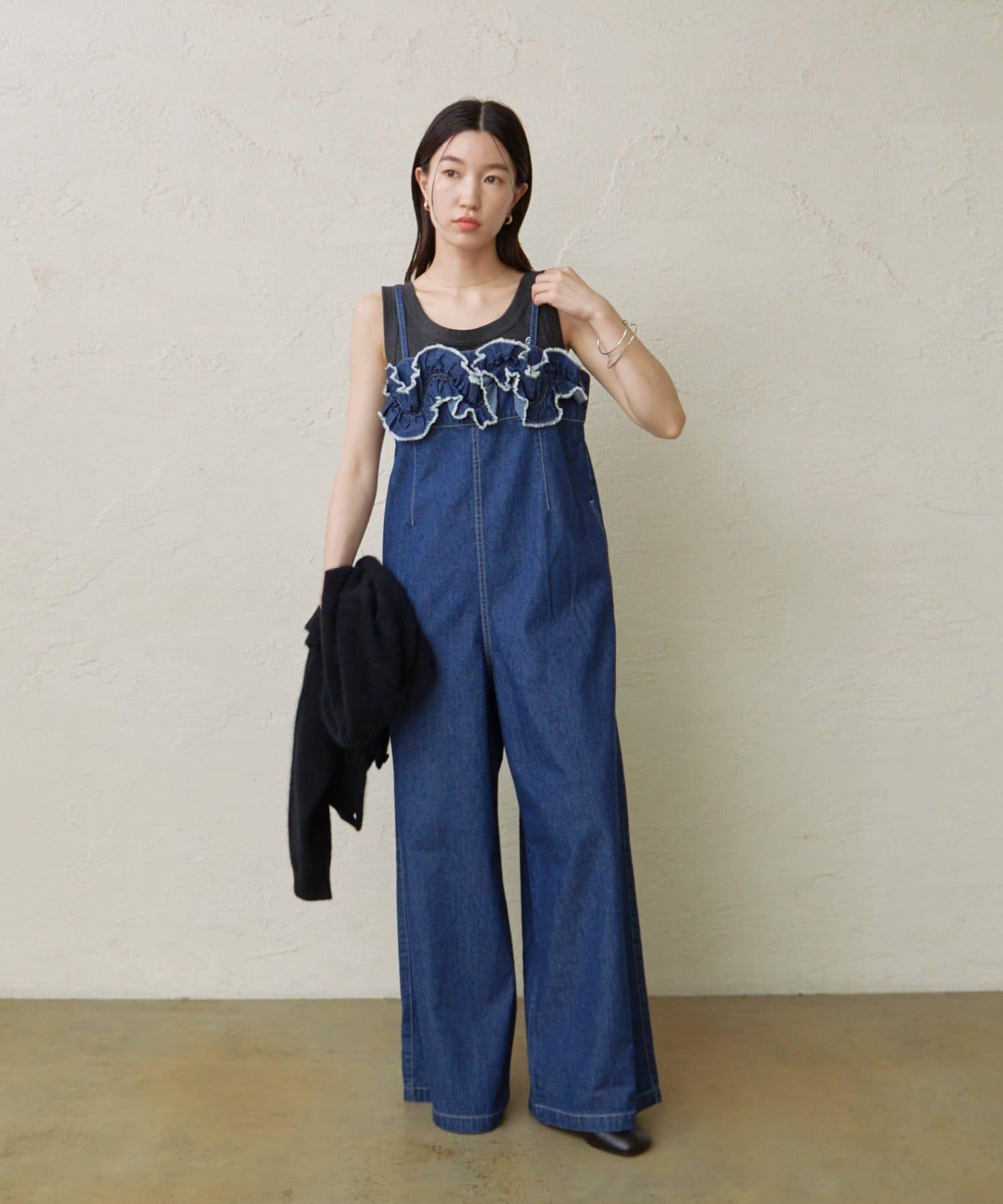 牛仔吊帶長褲,胸前飾有荷葉邊,盡顯女性魅力。