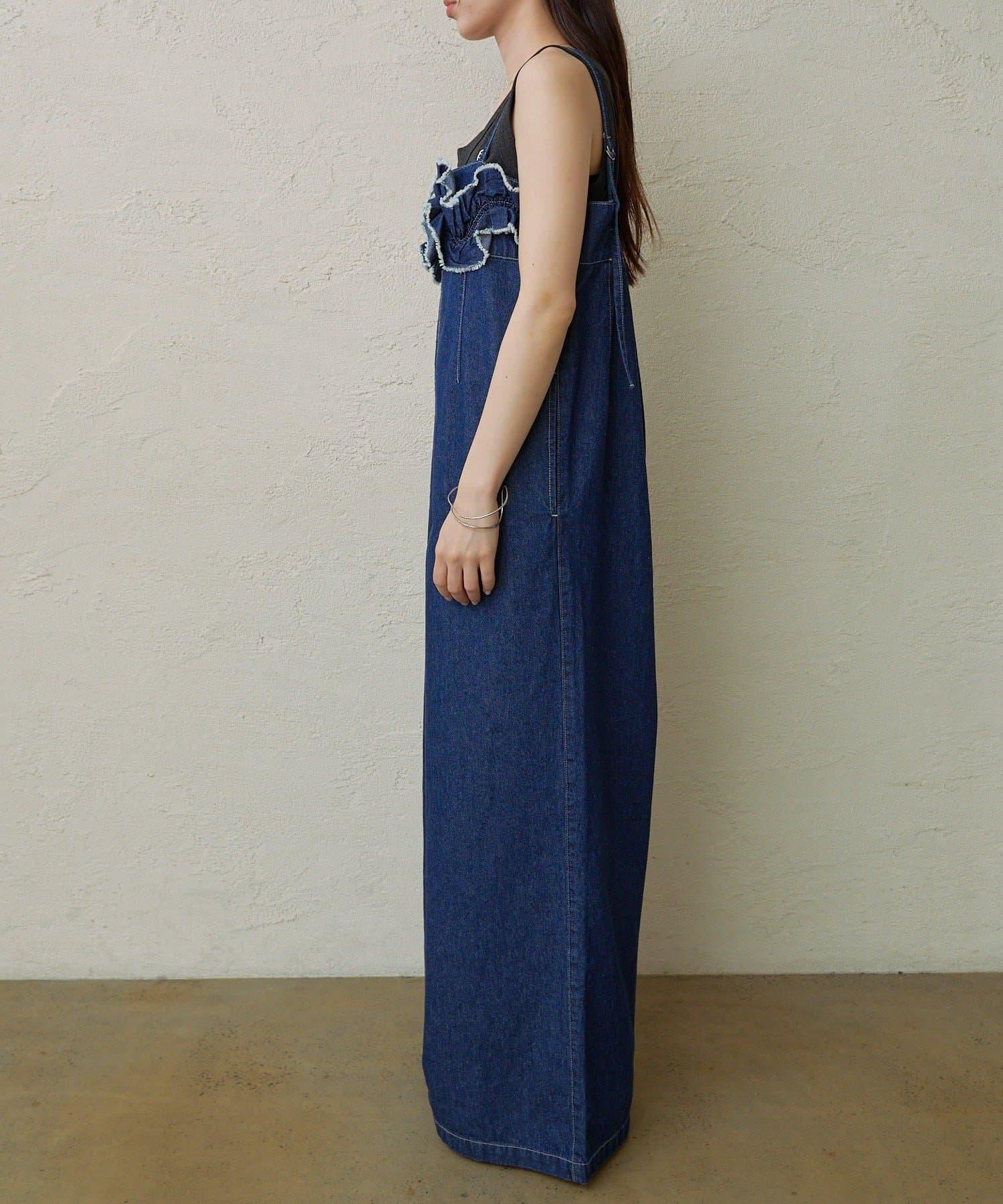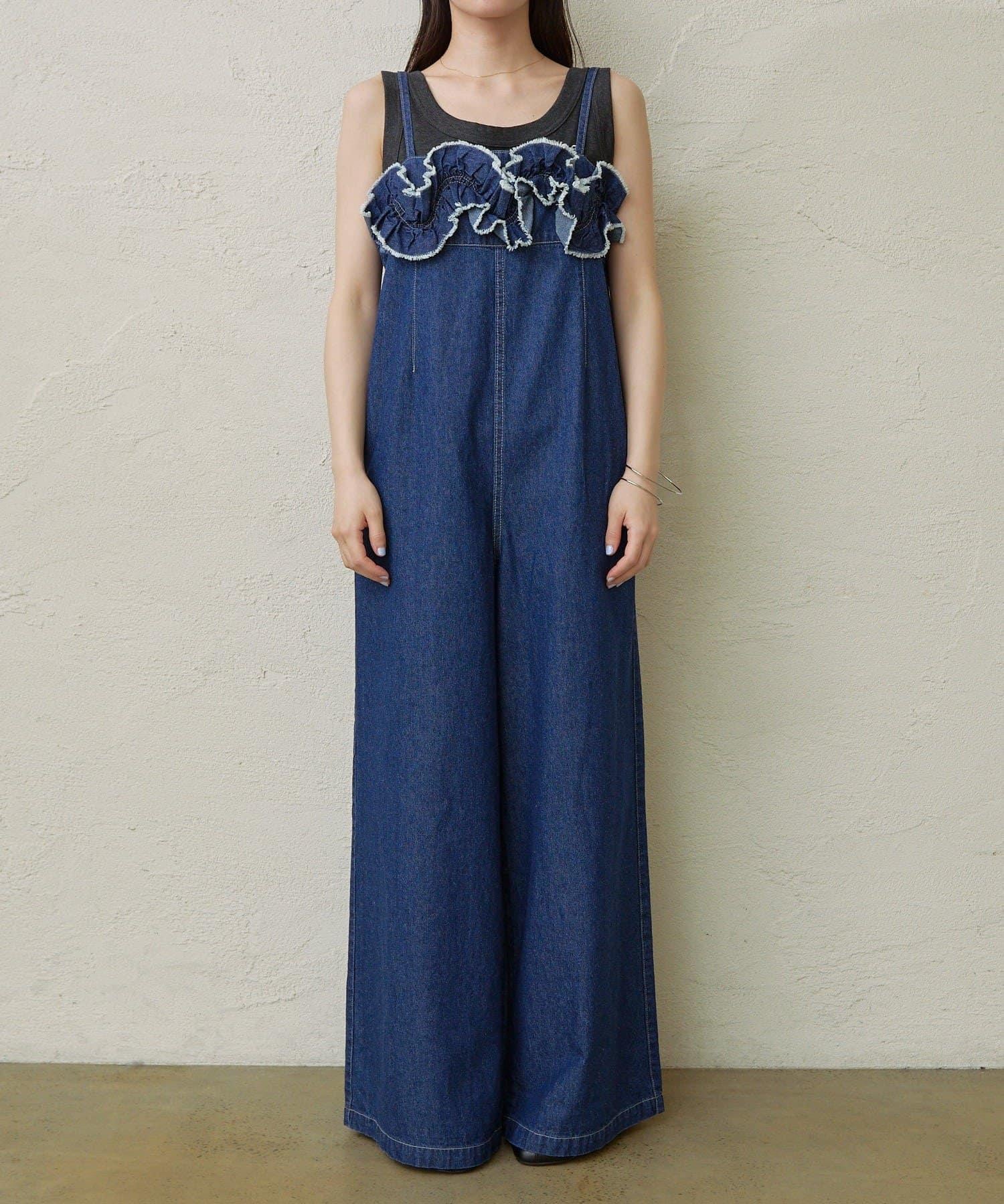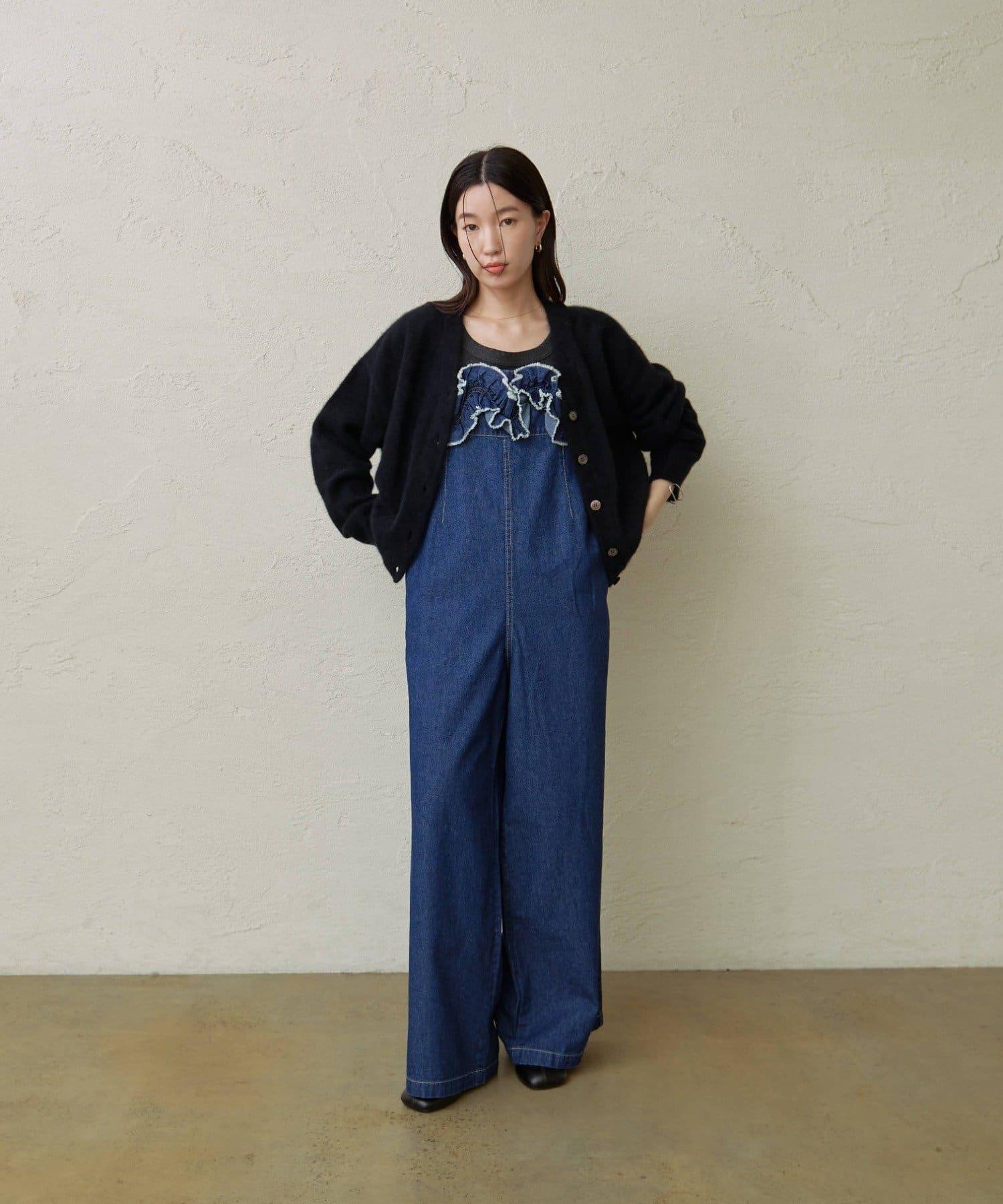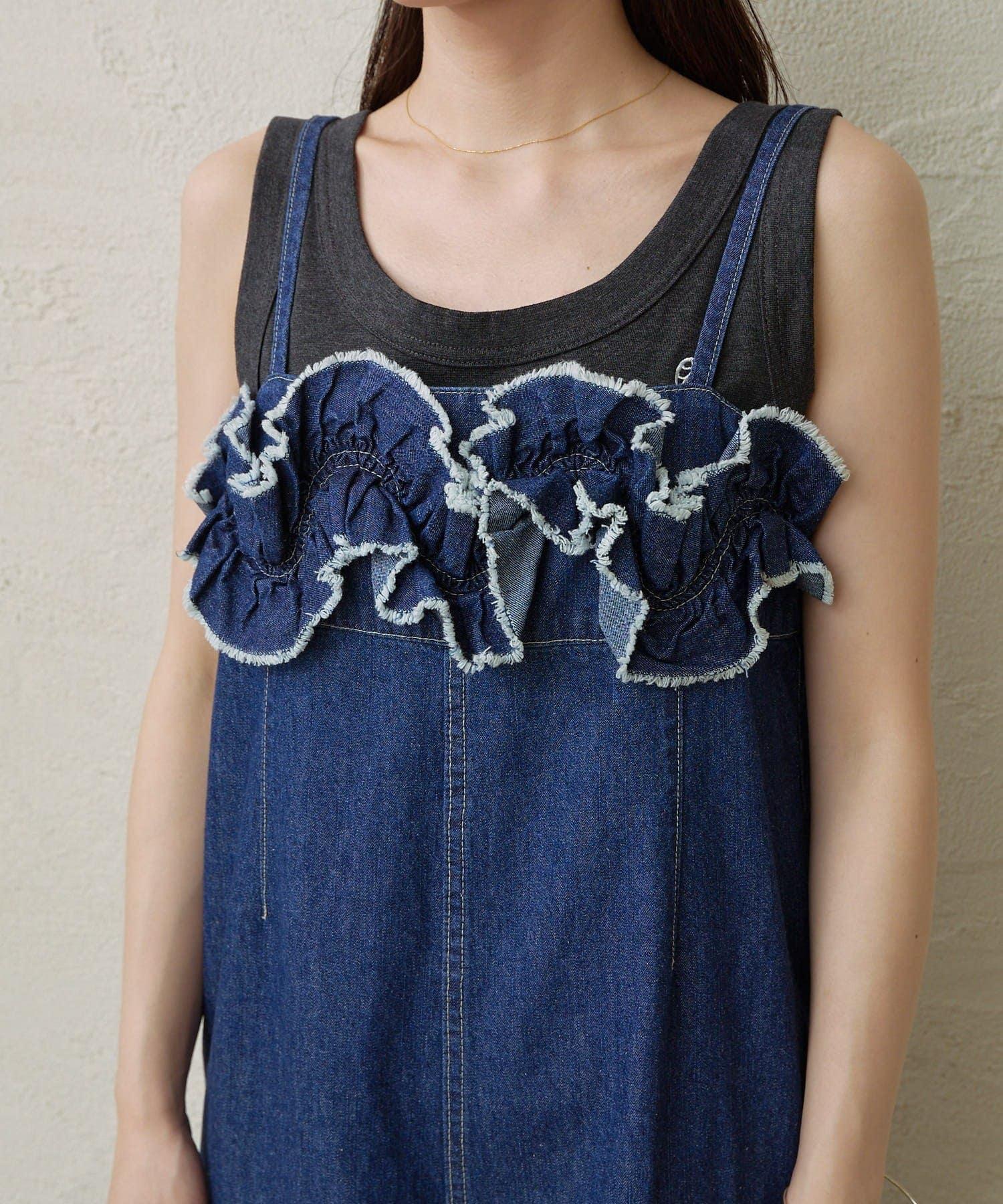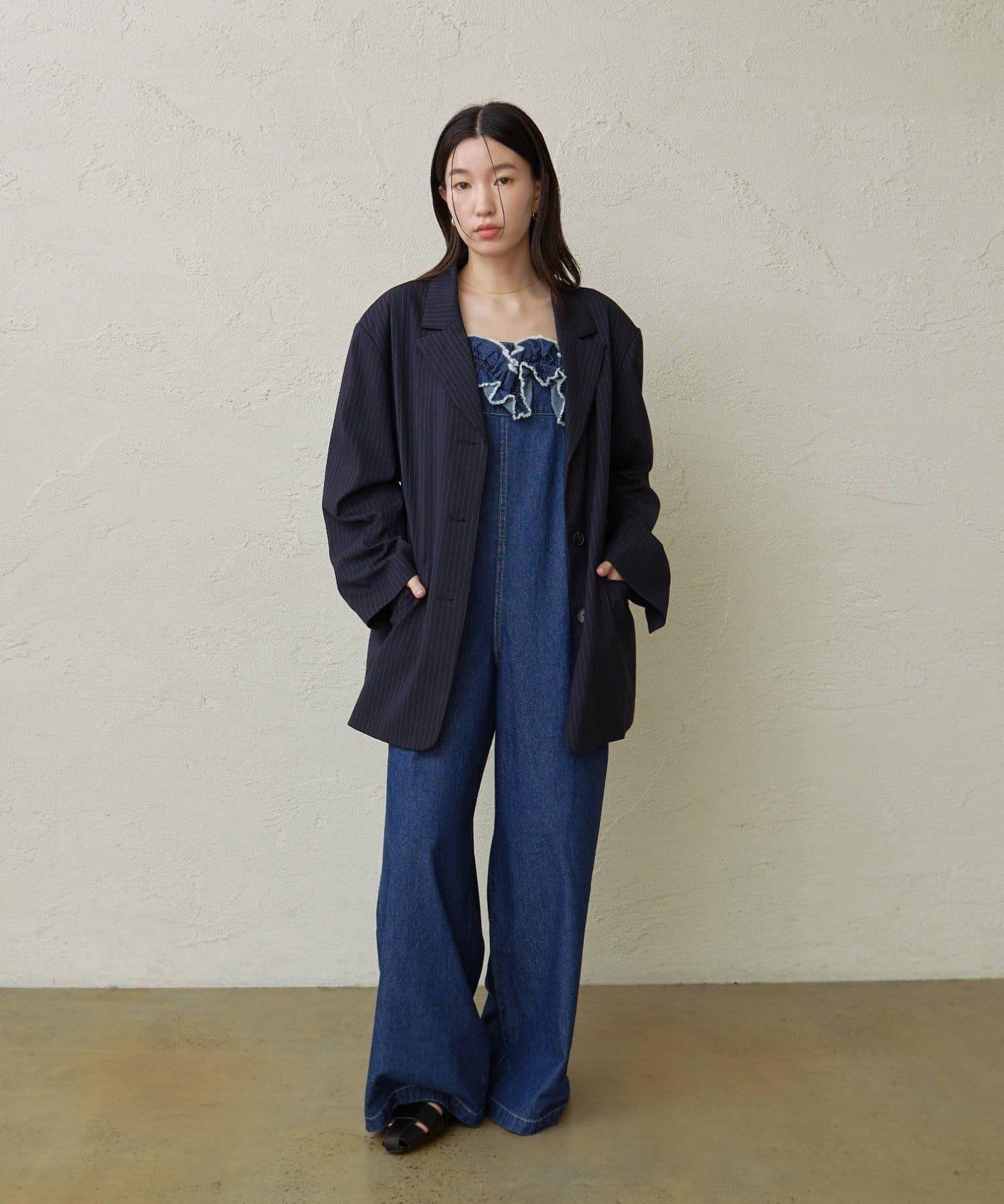 牛仔吊帶長褲,胸前飾有荷葉邊,盡顯女性魅力。