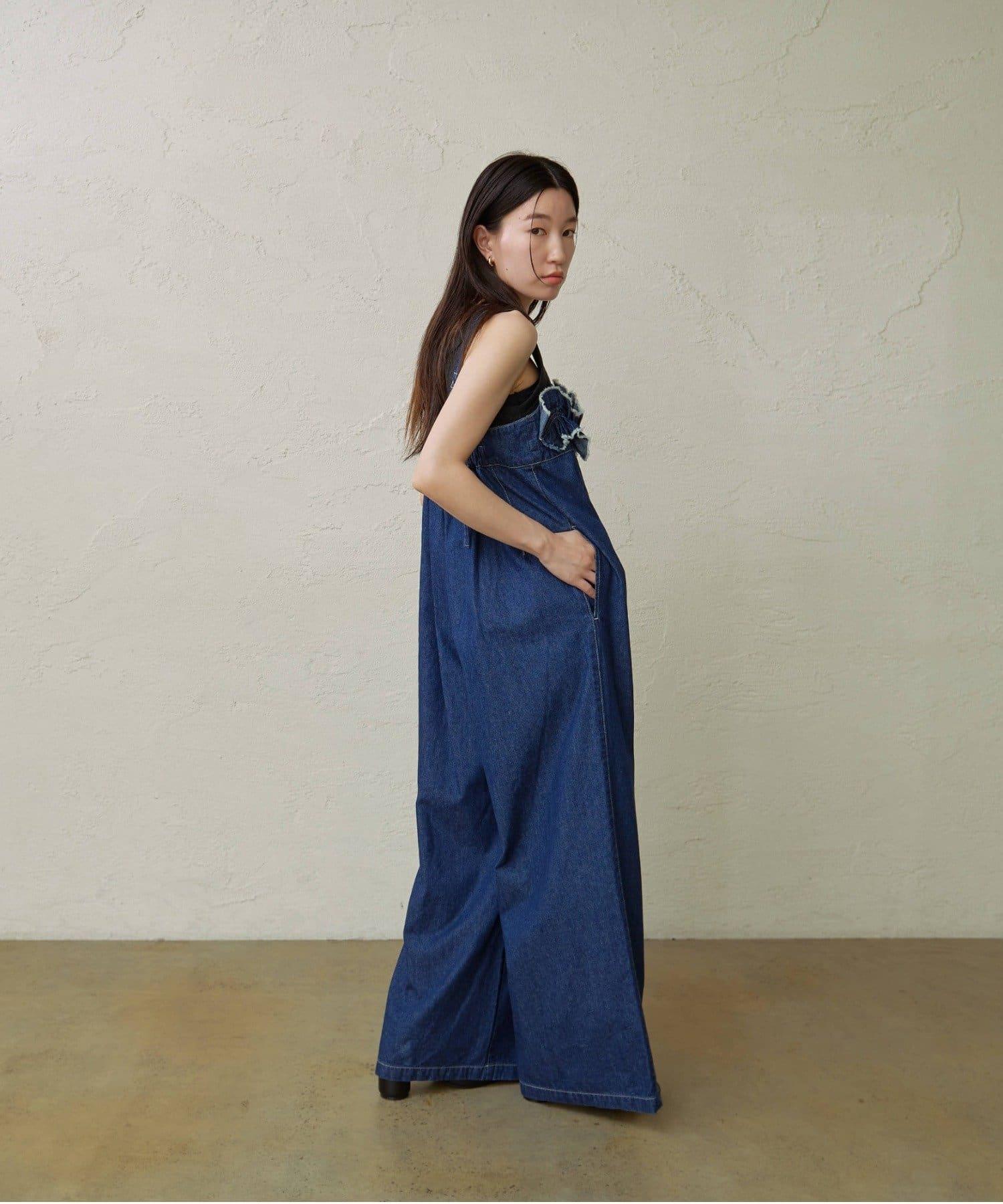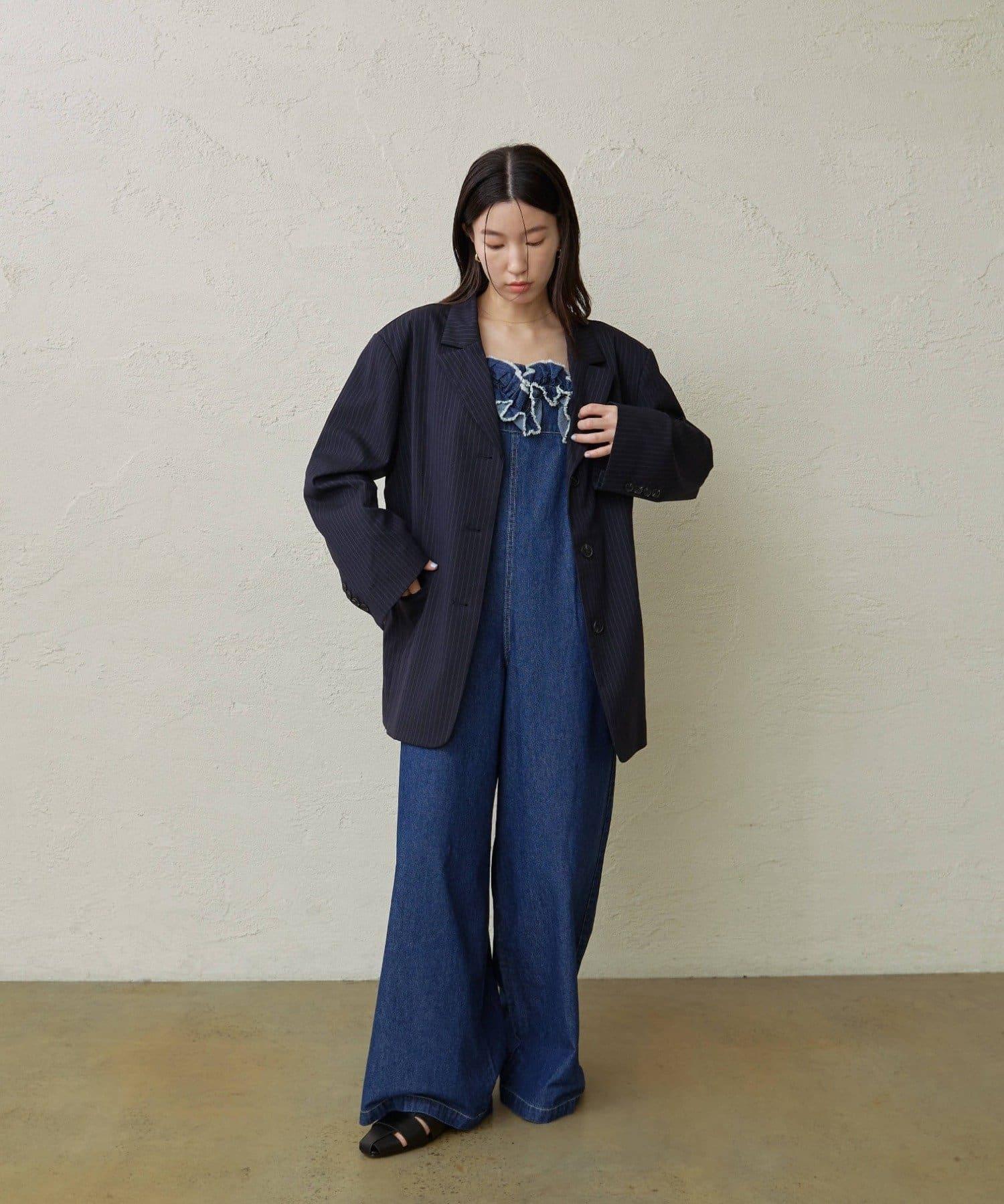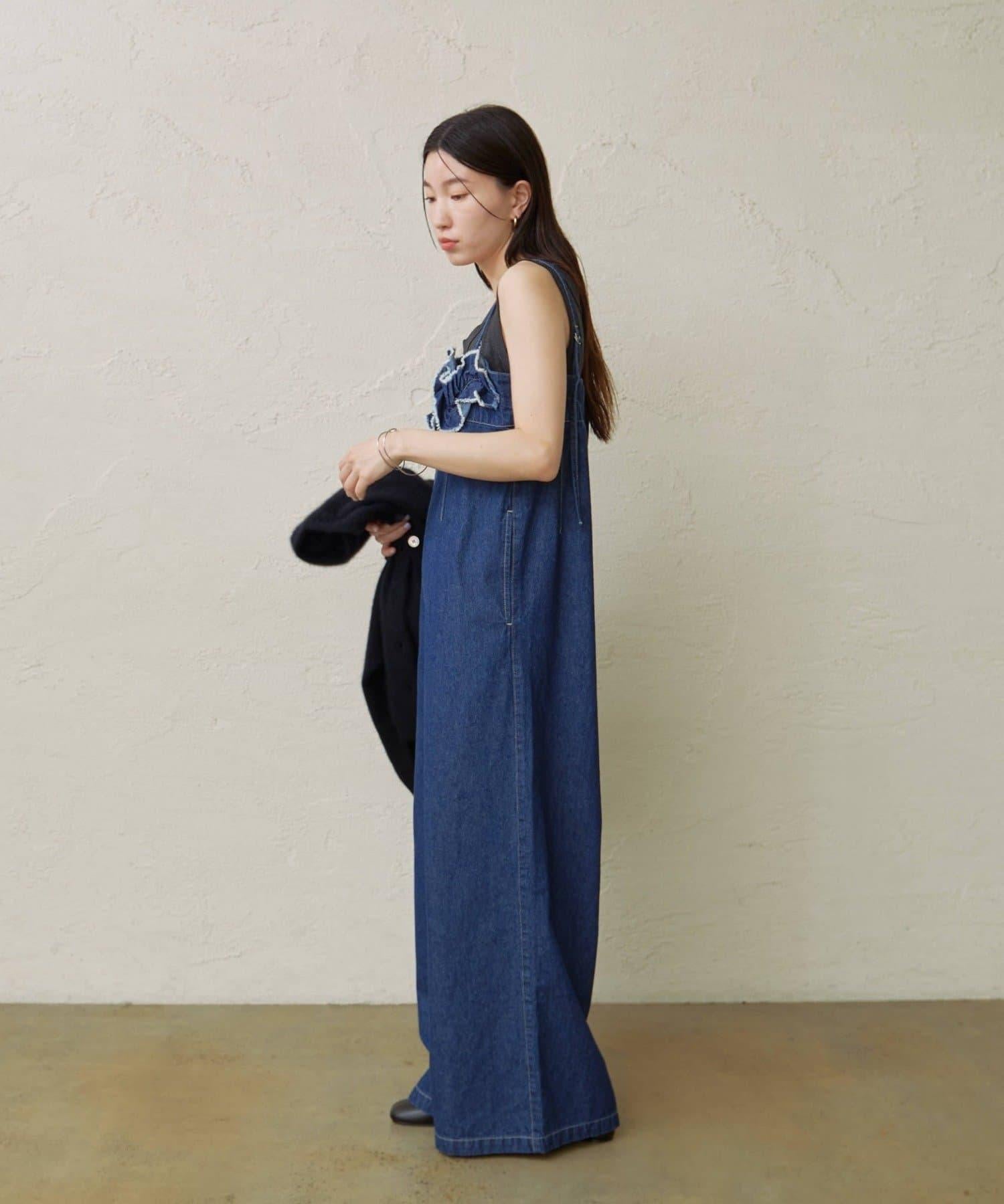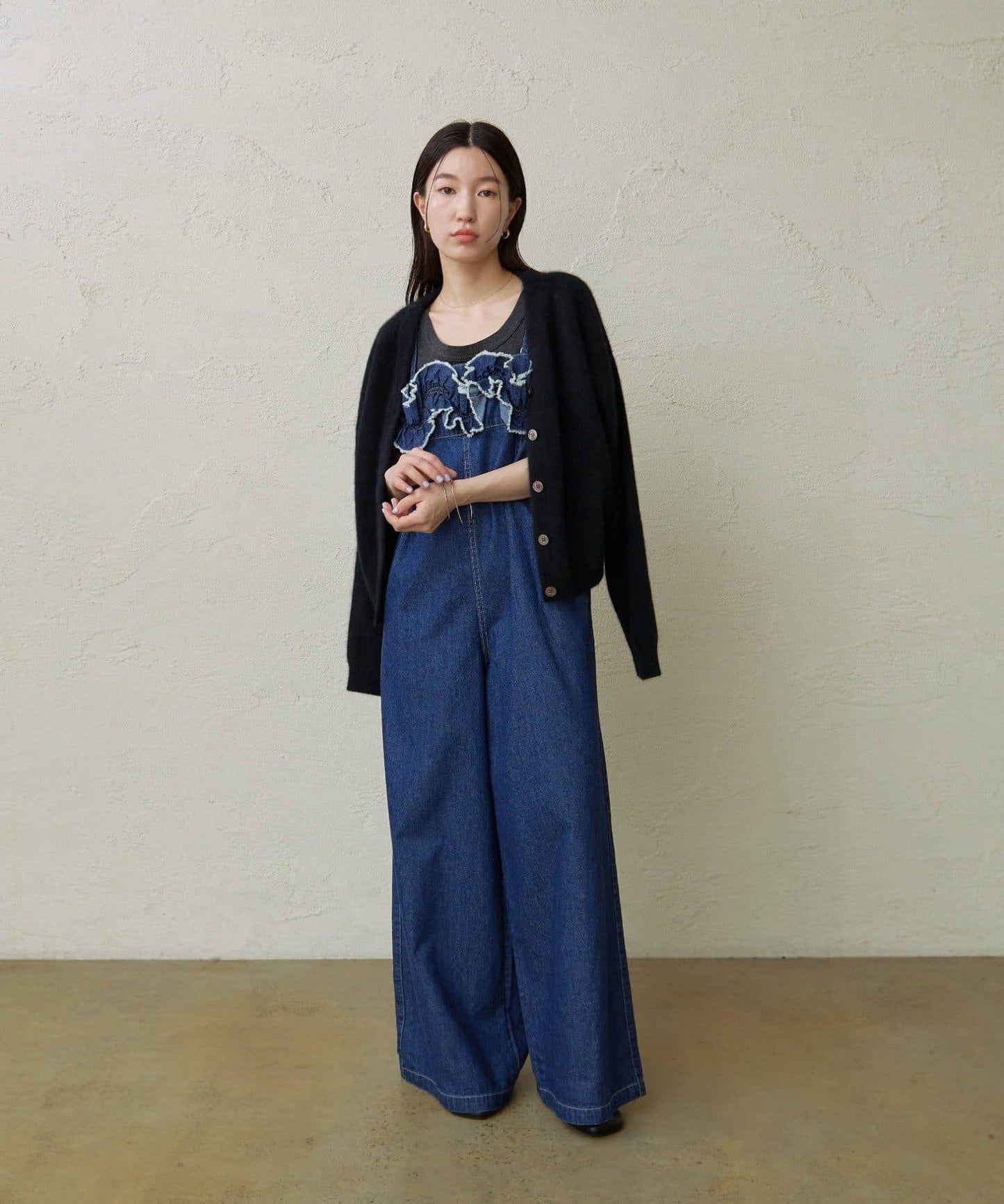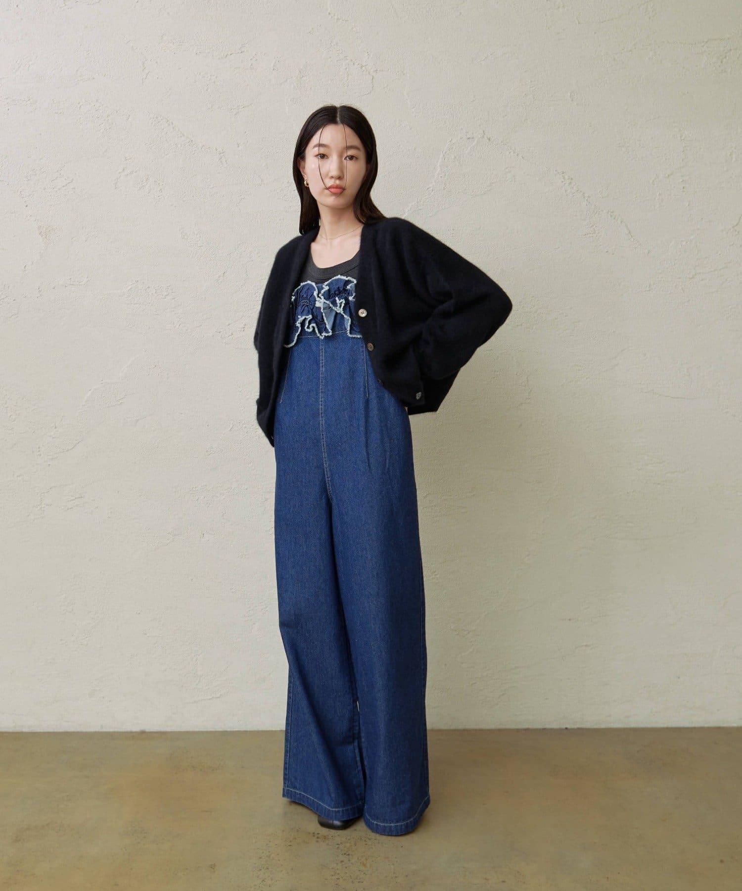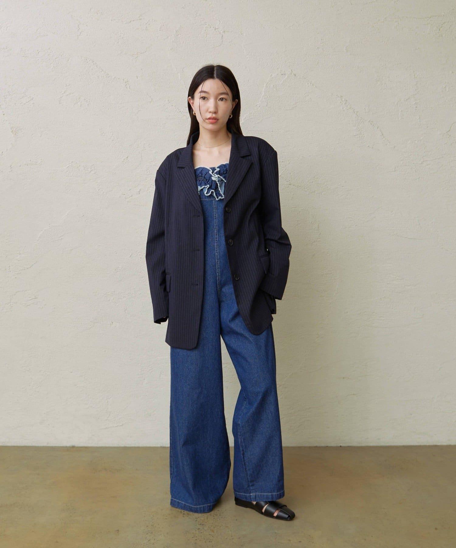 牛仔吊帶長褲,胸前飾有荷葉邊,盡顯女性魅力。