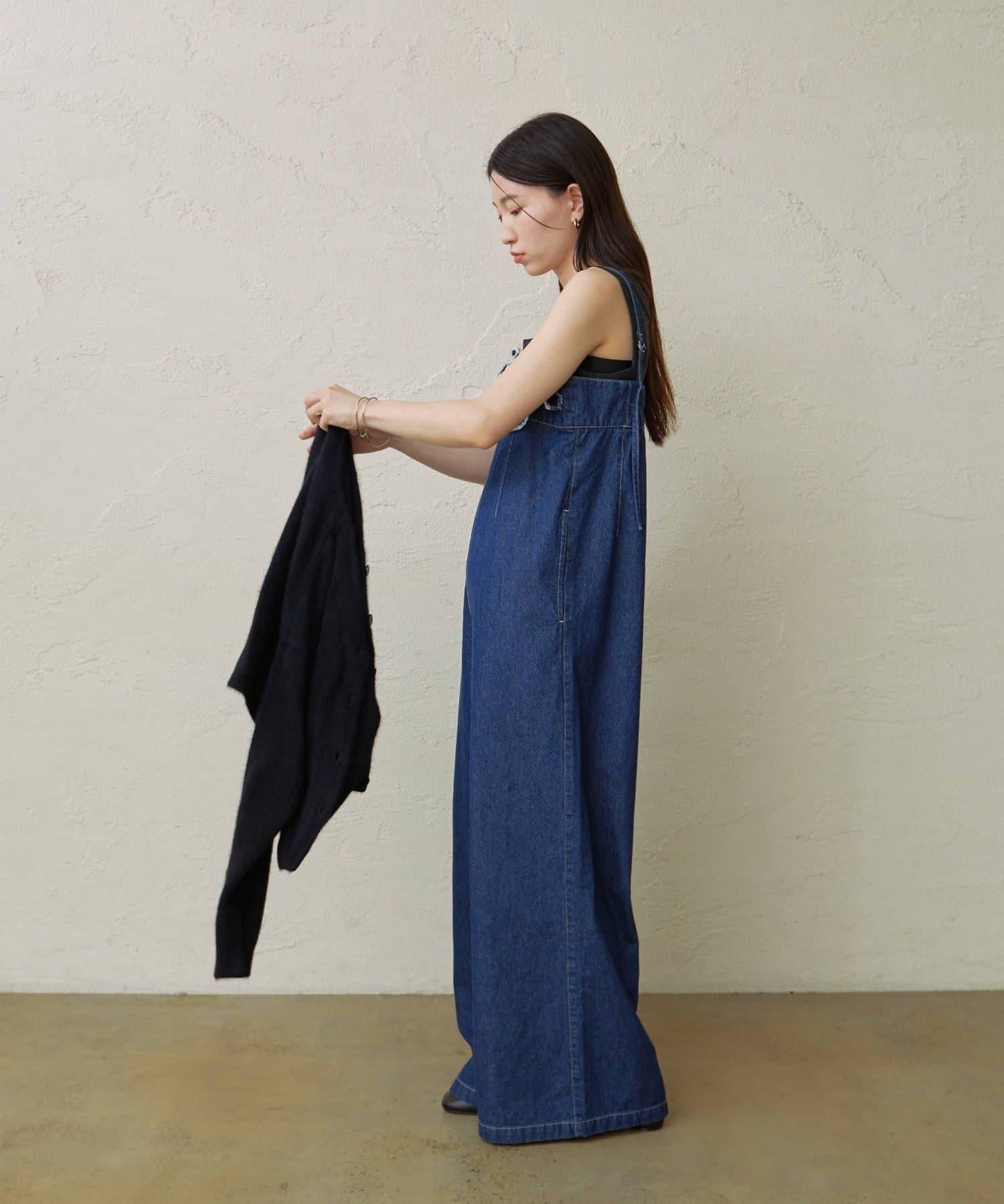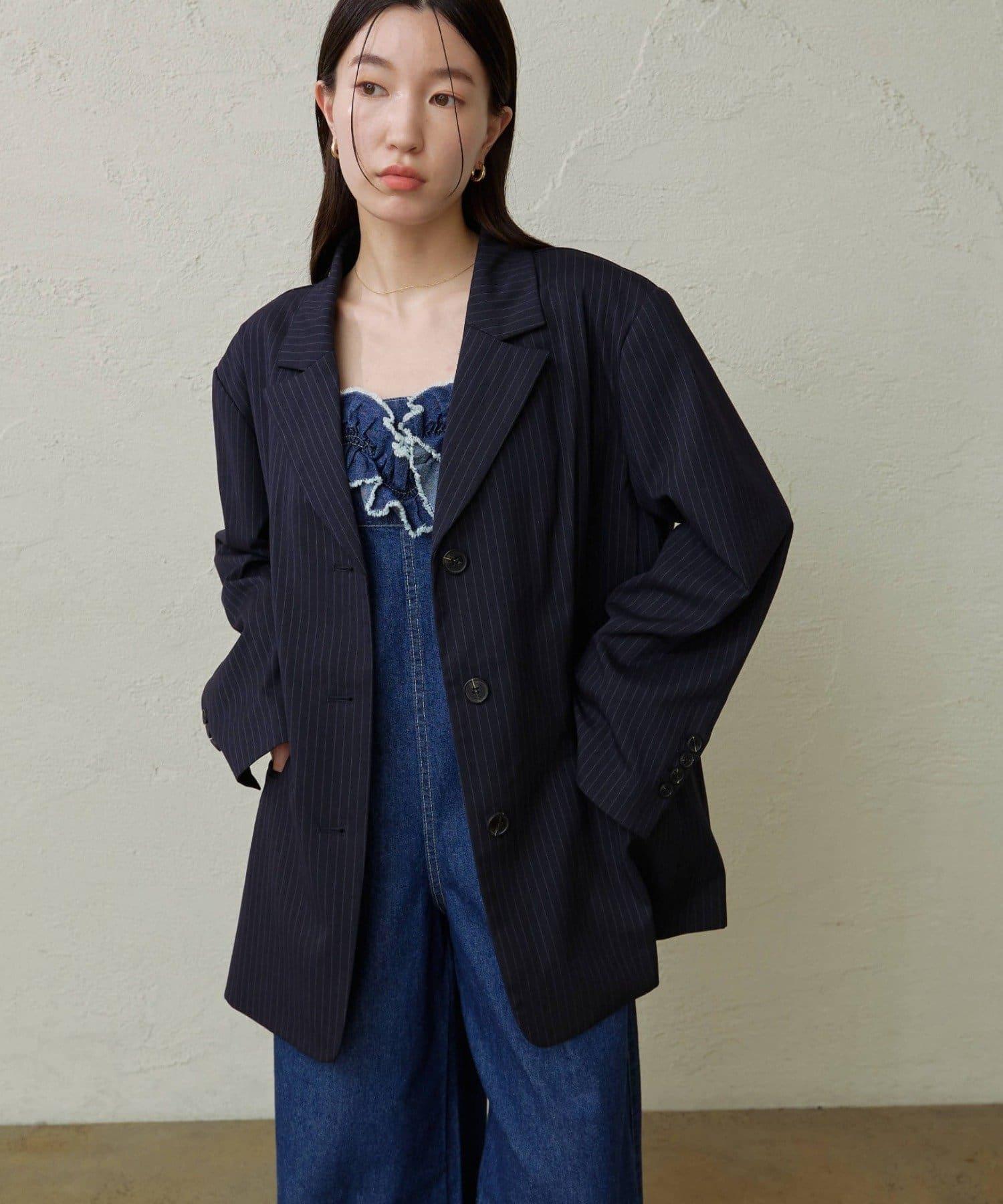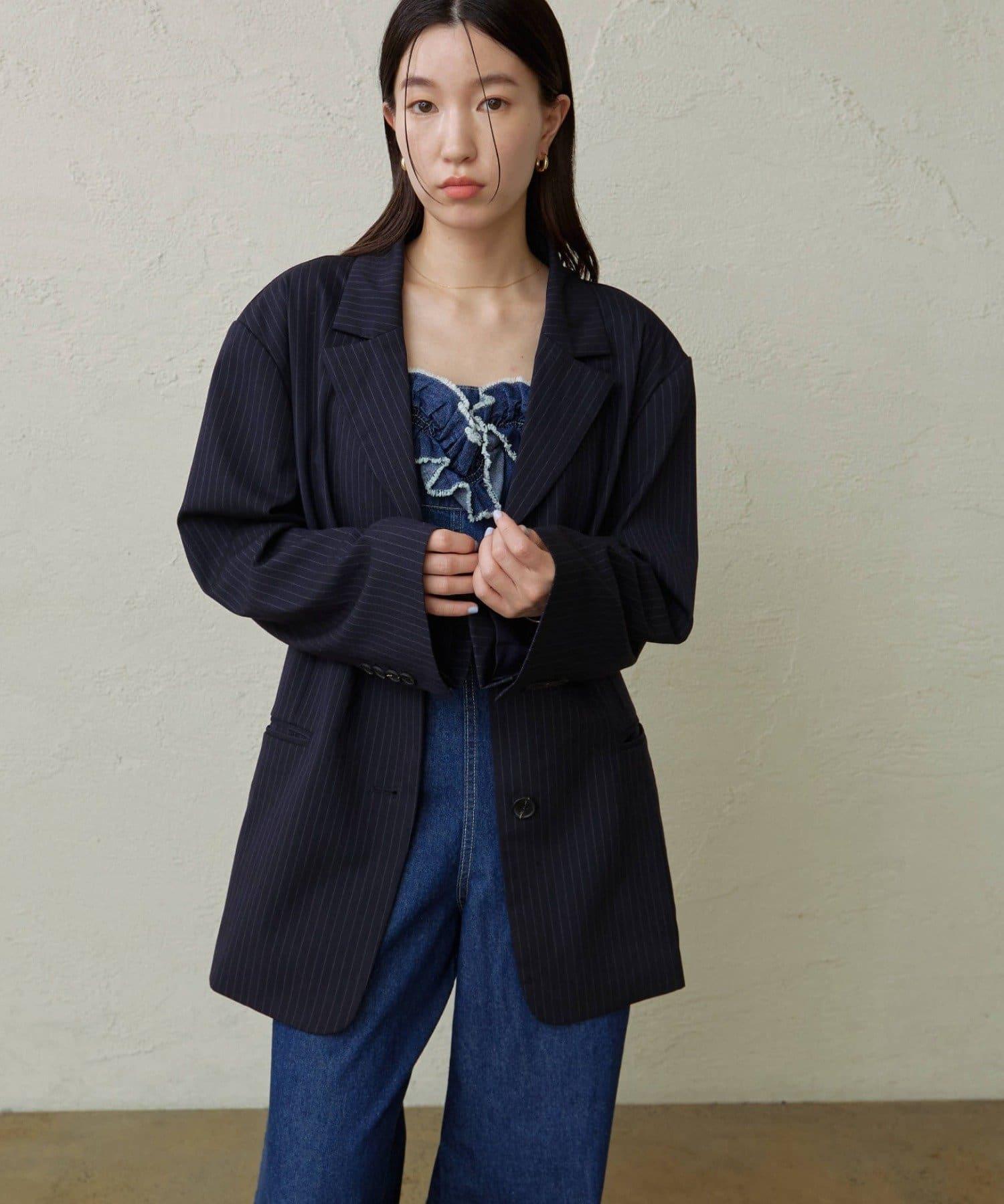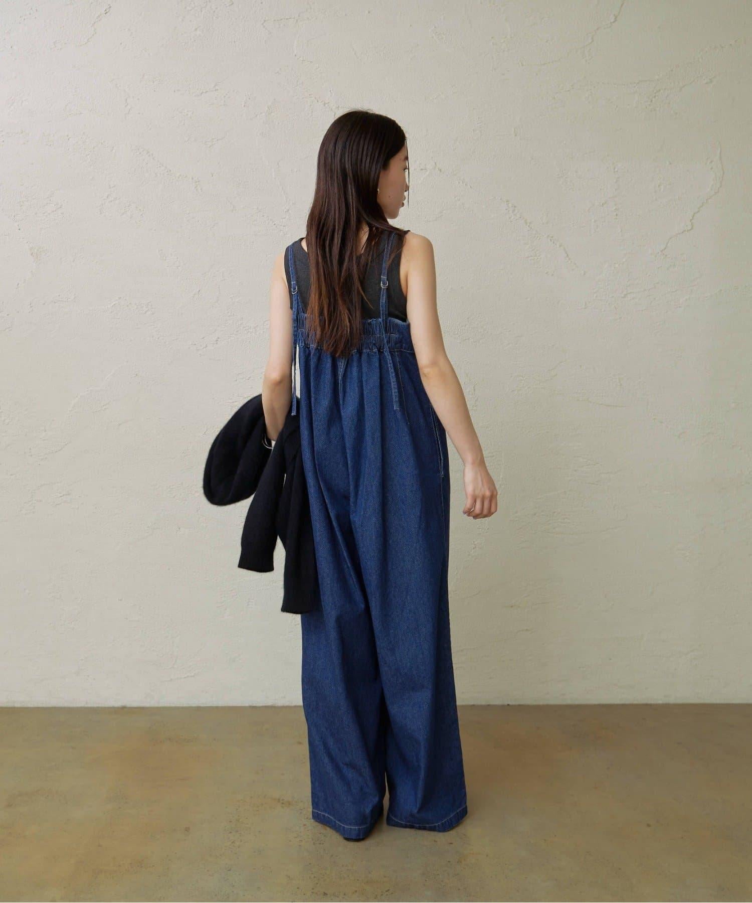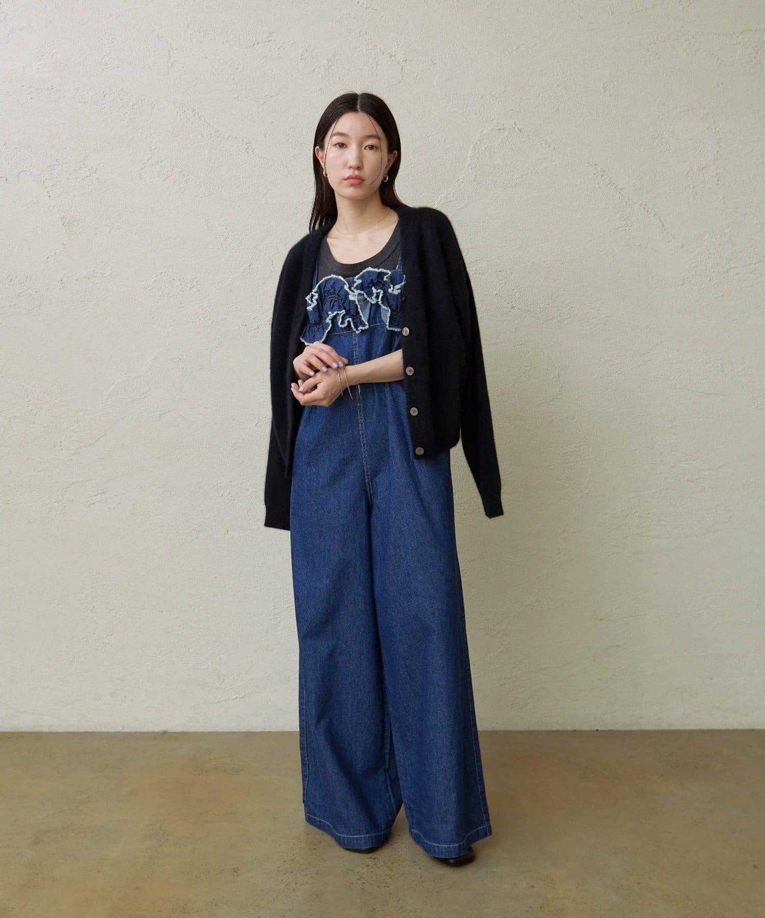 牛仔吊帶長褲,胸前飾有荷葉邊,盡顯女性魅力。