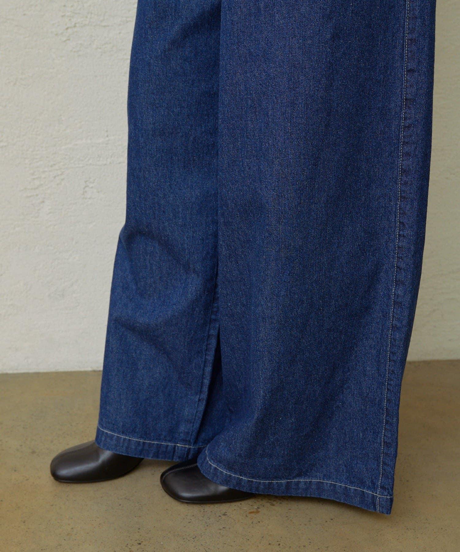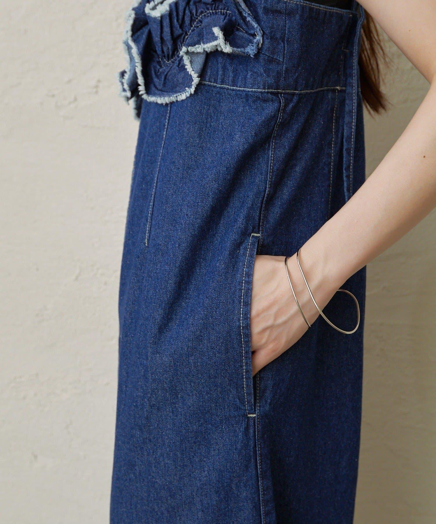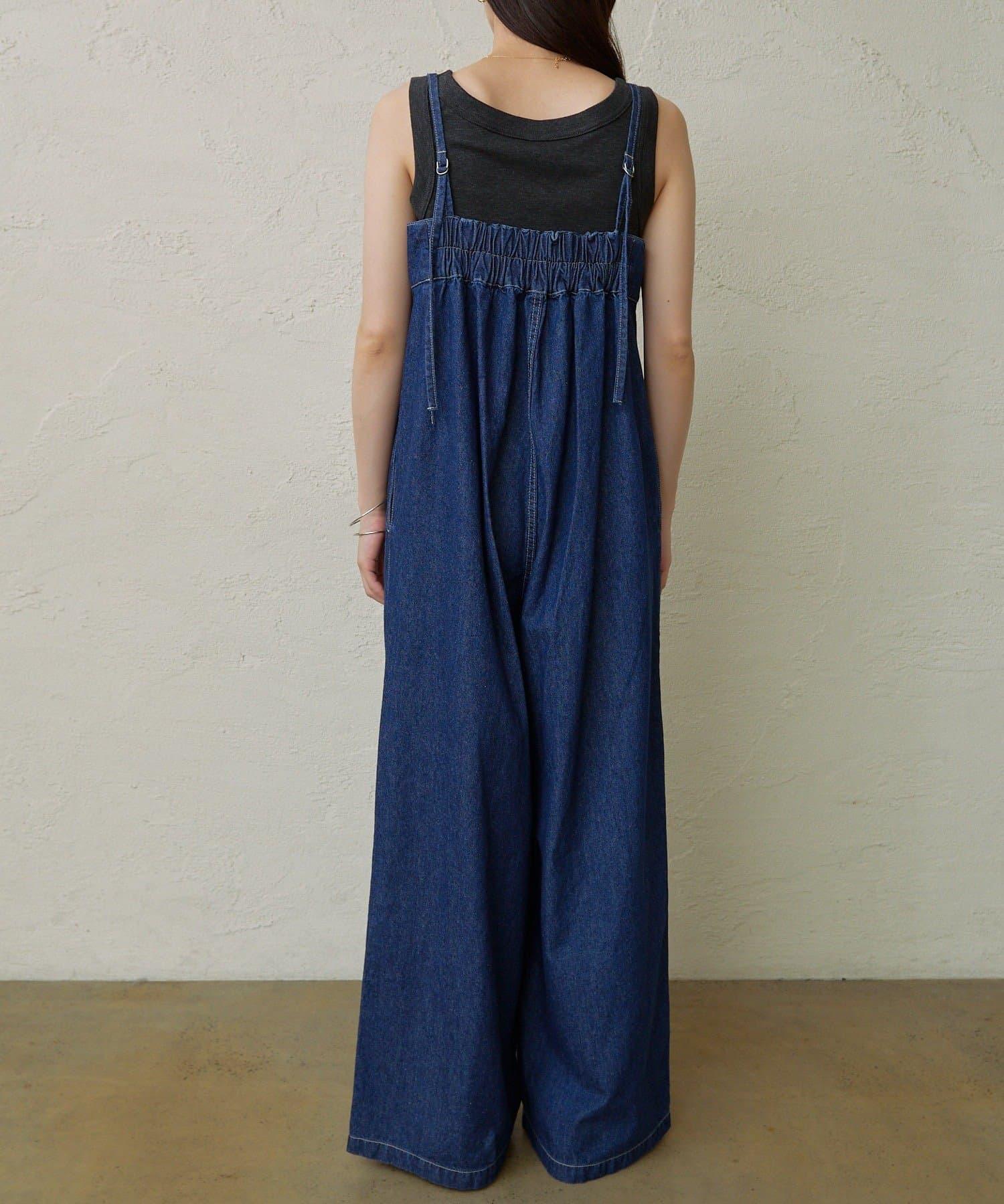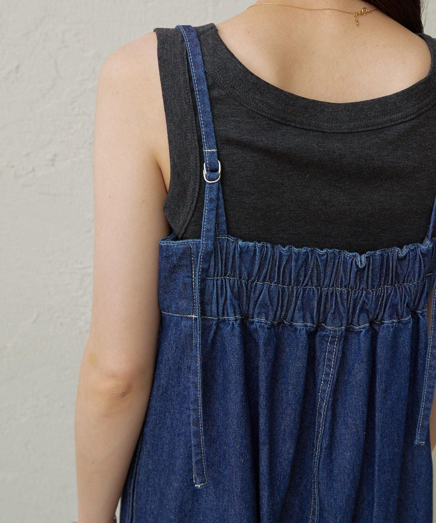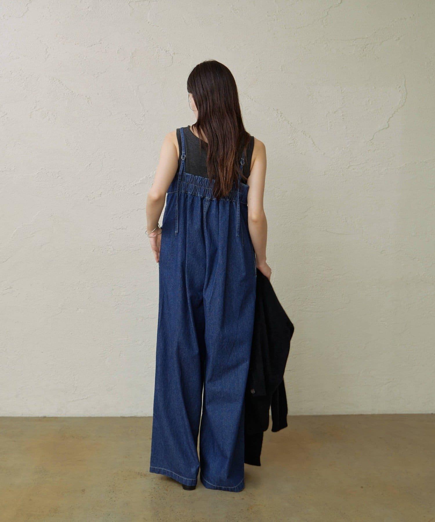 牛仔吊帶長褲,胸前飾有荷葉邊,盡顯女性魅力。