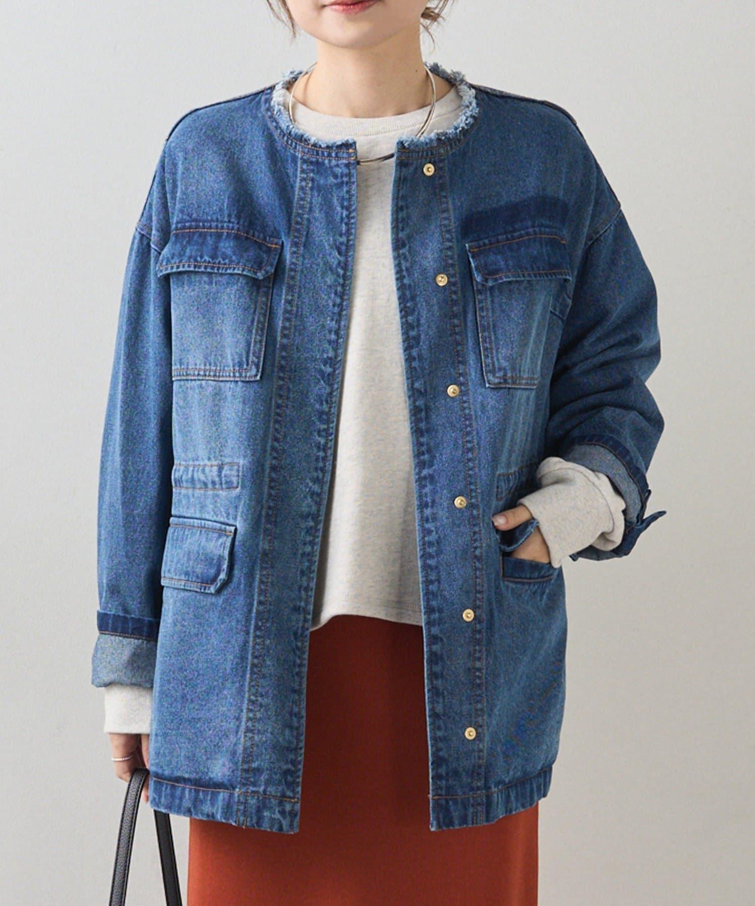 這款夾克既有牛仔布的休閒感,又有無領的精緻感、