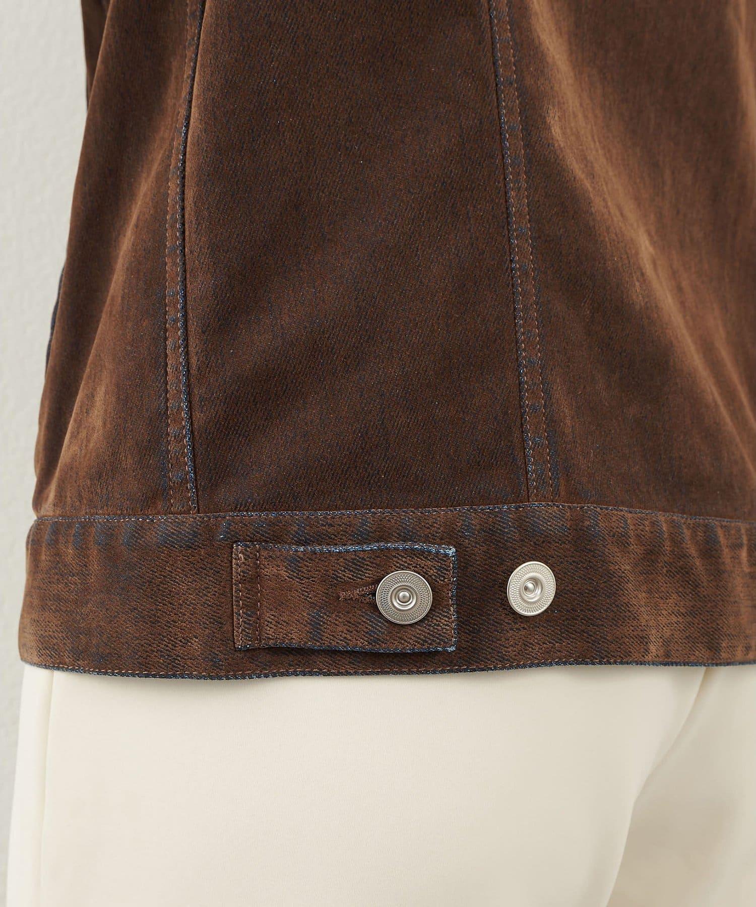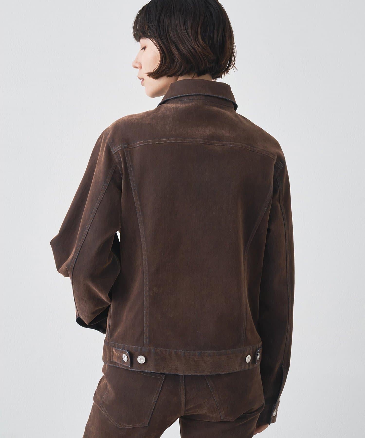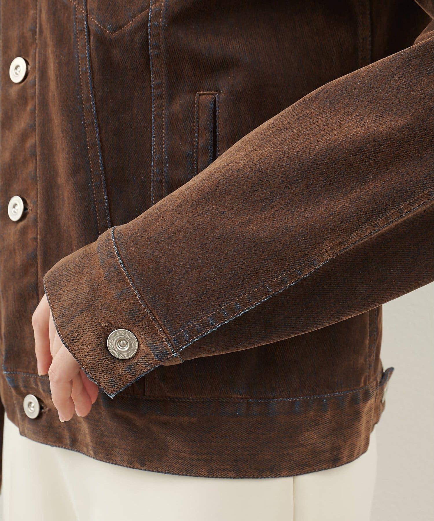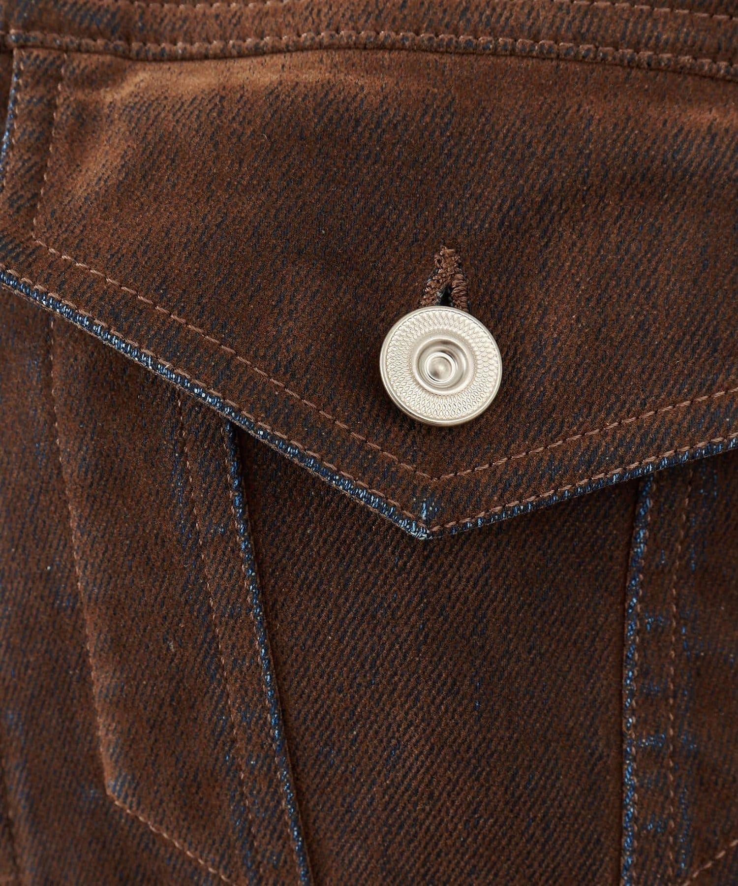 牛仔夾克採用 12 盎司厚牛仔布,印有醒目的全身植絨圖案。