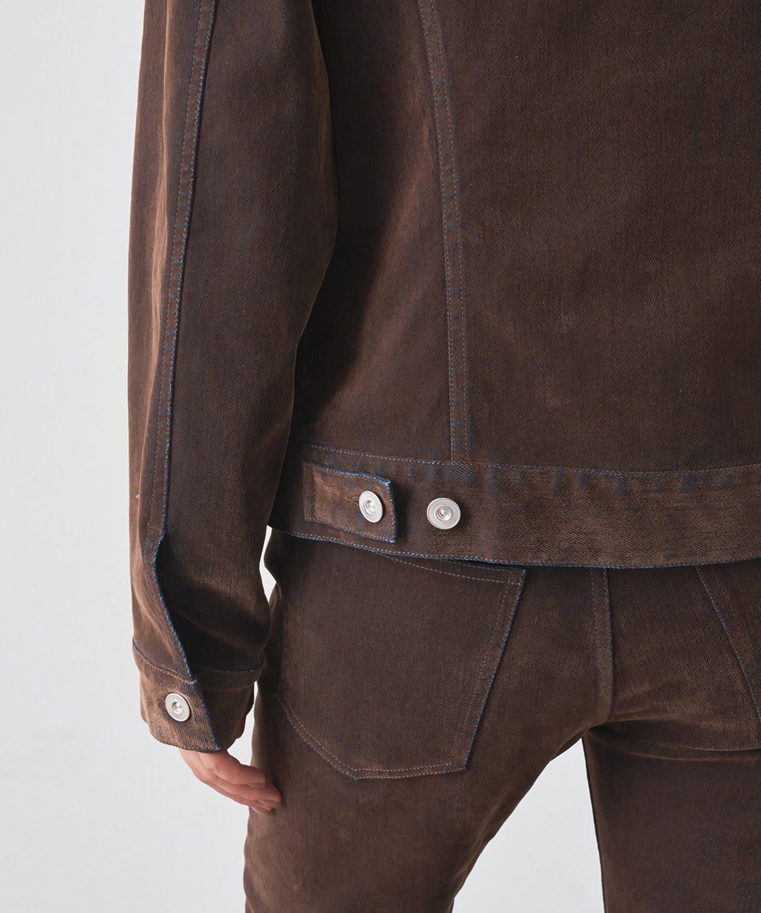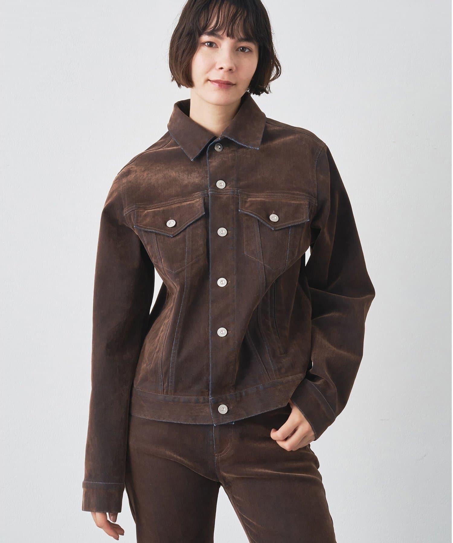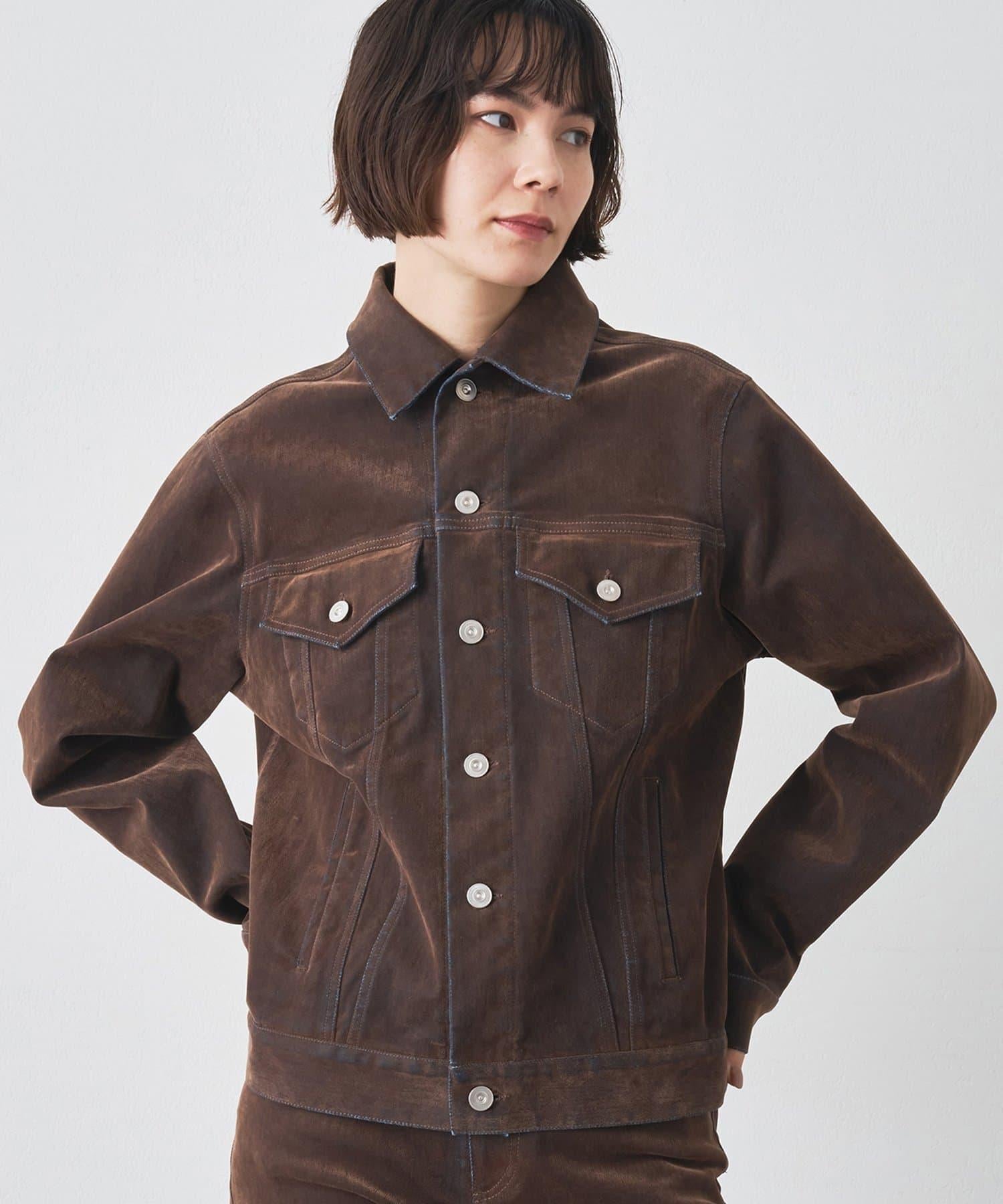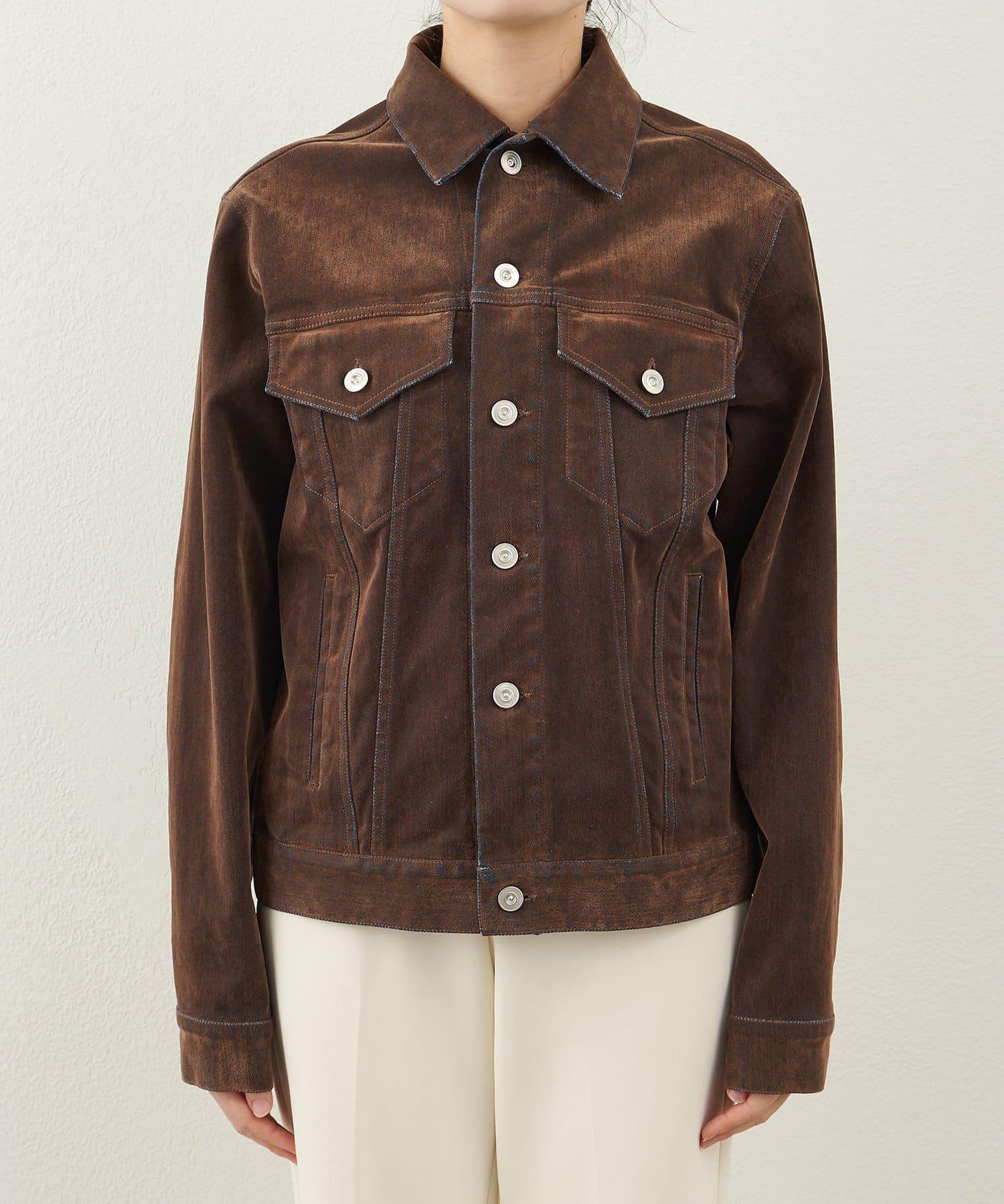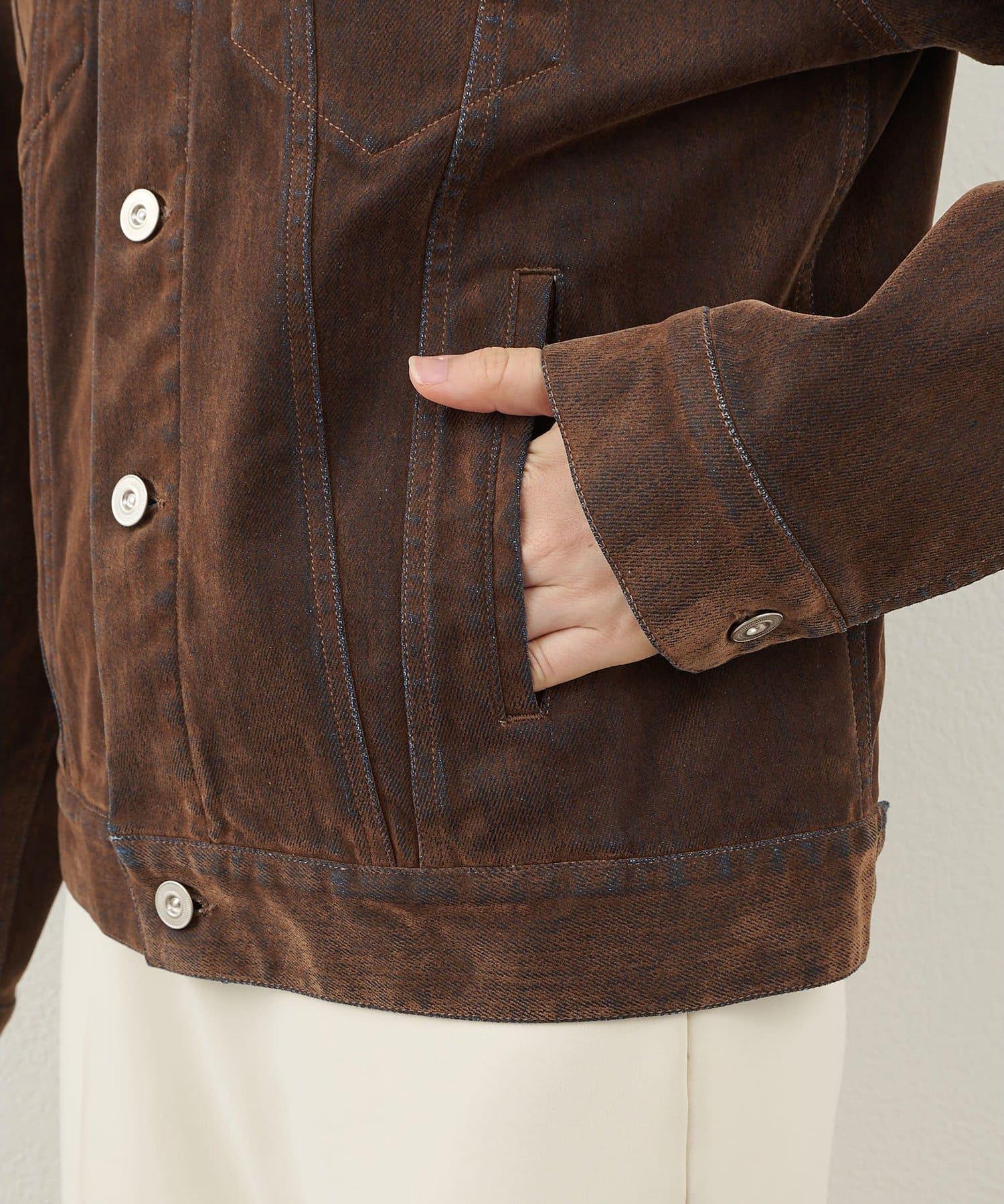 牛仔夾克採用 12 盎司厚牛仔布,印有醒目的全身植絨圖案。