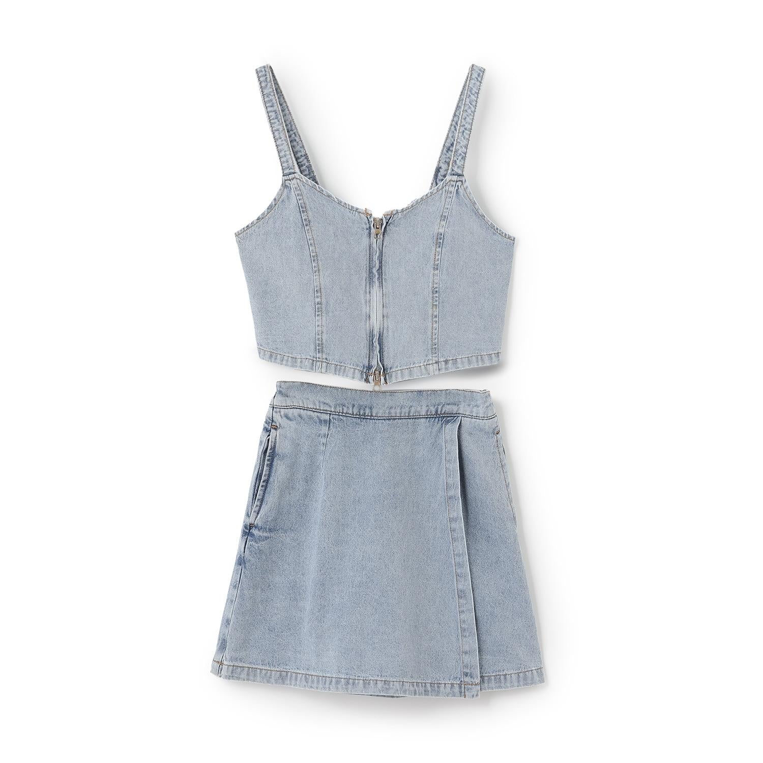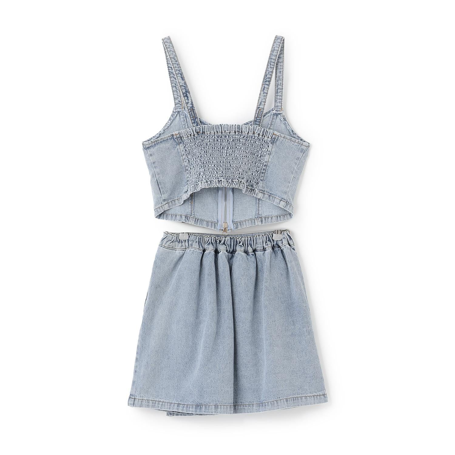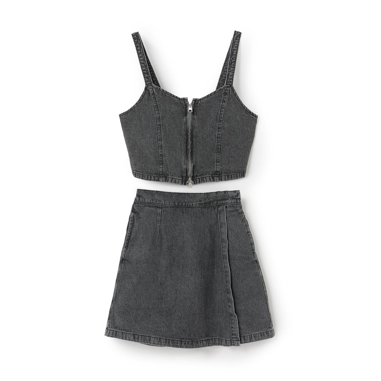 半身裙採用 V 形剪裁設計,時尚感十足。