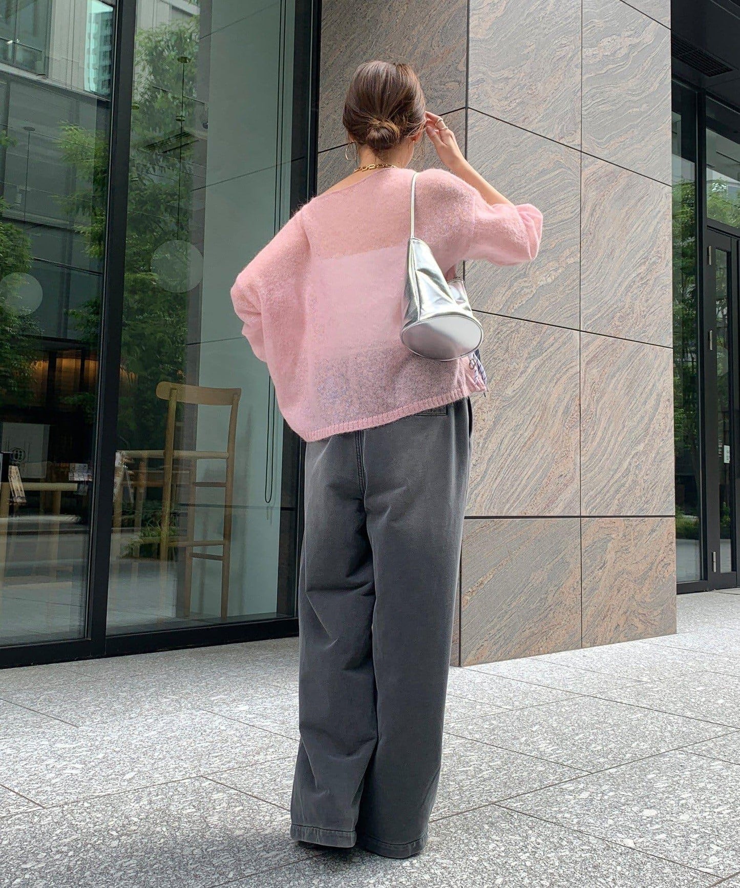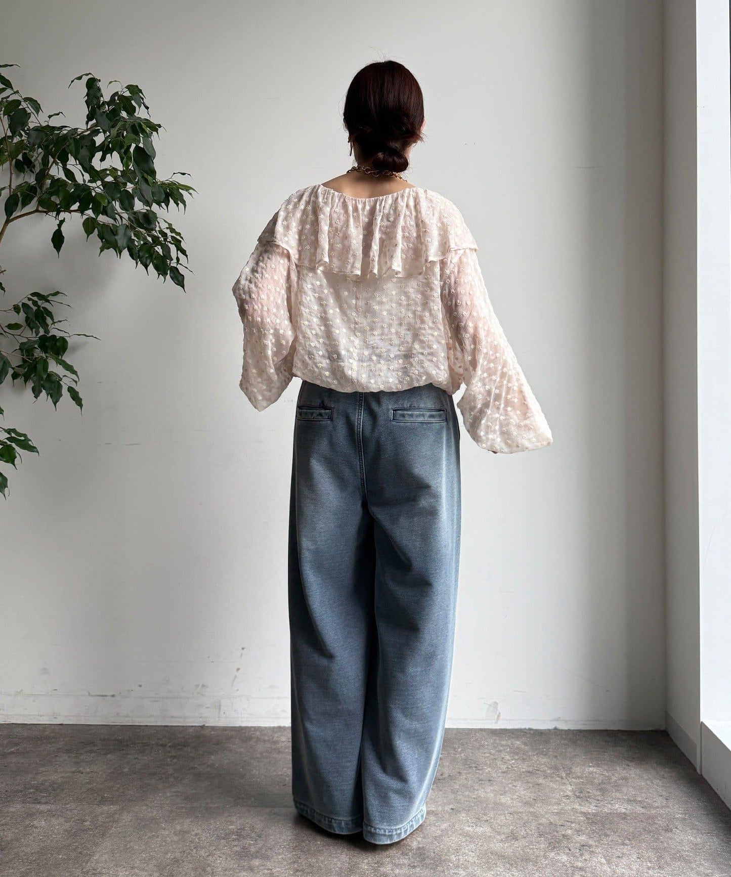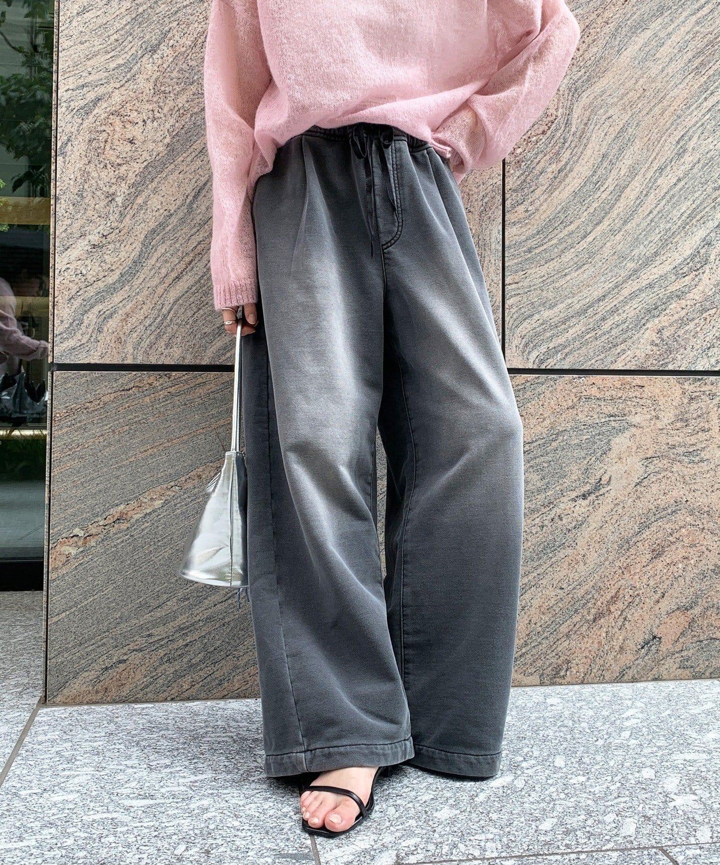 兩側的開關線設計向內收向下擺,使腿部線條更加簡潔,收腰的設計營造出一種自然下墜的輪廓感。