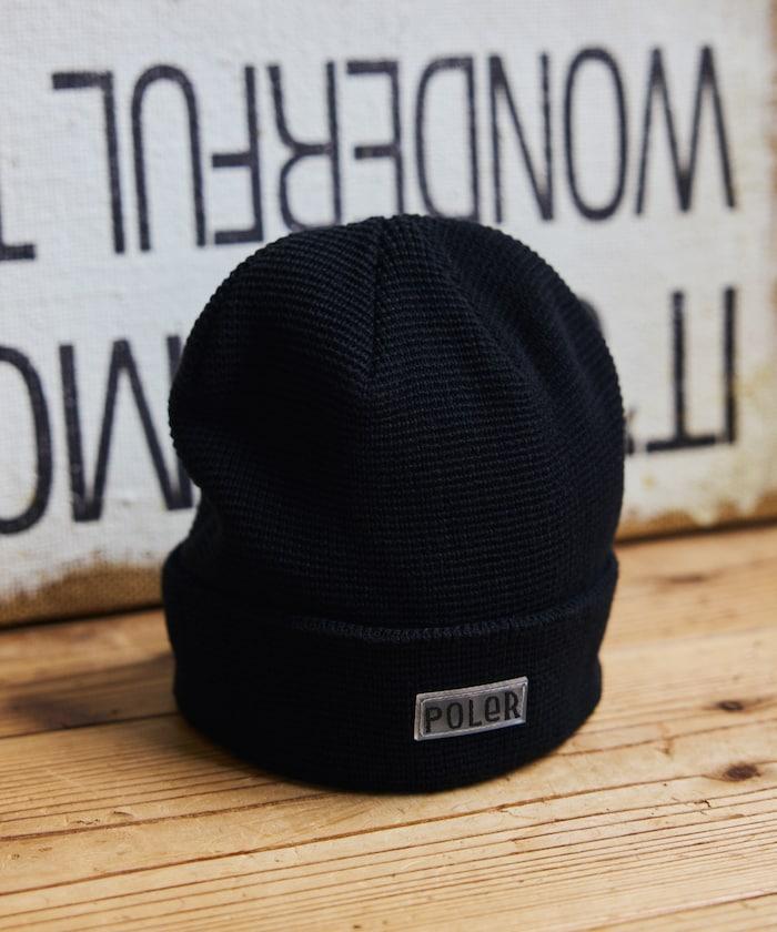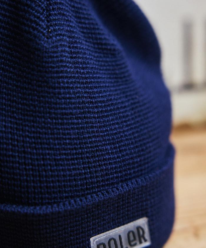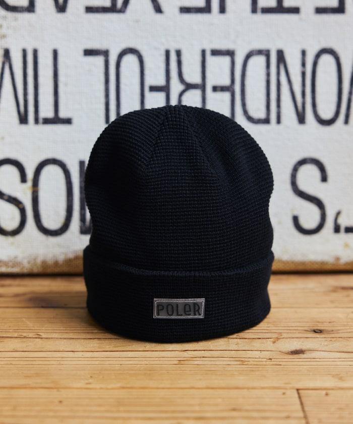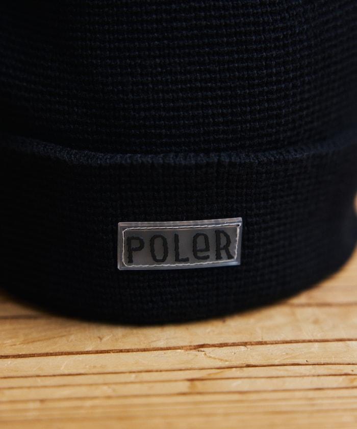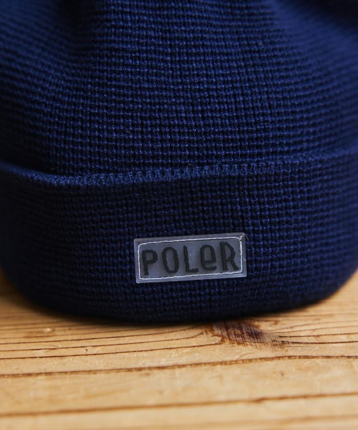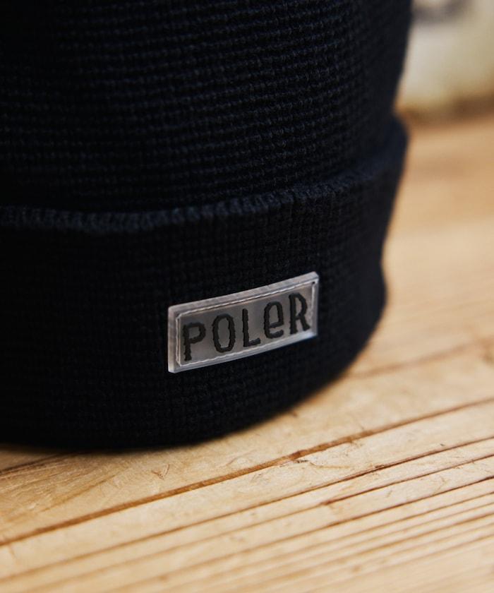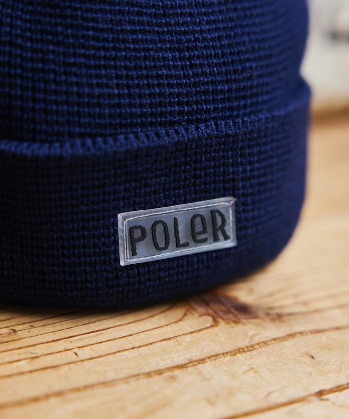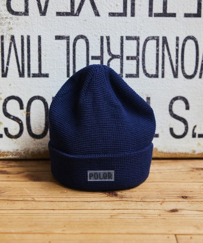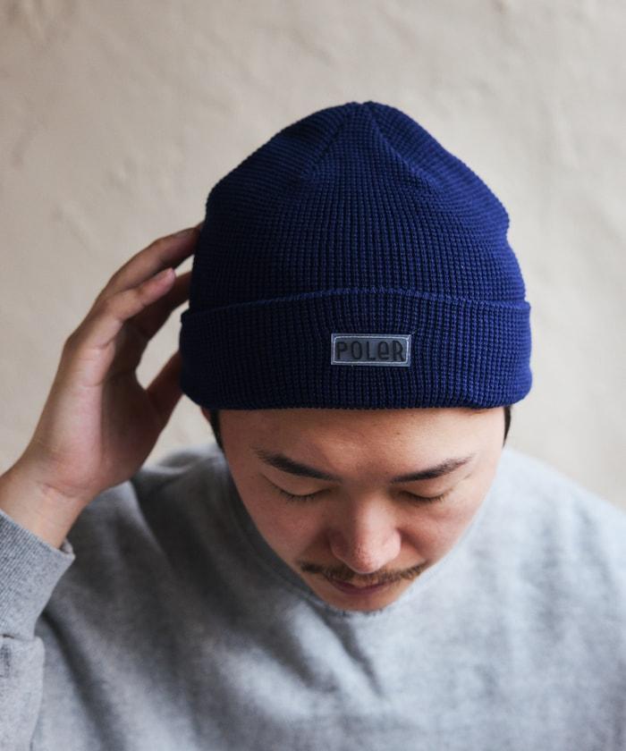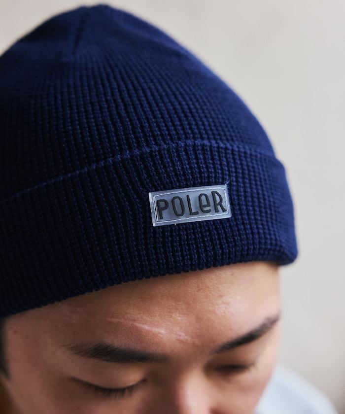 在 POLeR 的標準針織帽 "WORKERMAN BEANIE "上印有立體橡膠標誌的特別定製款。