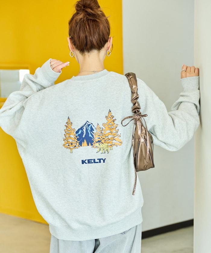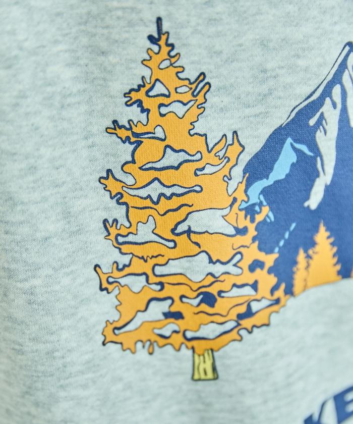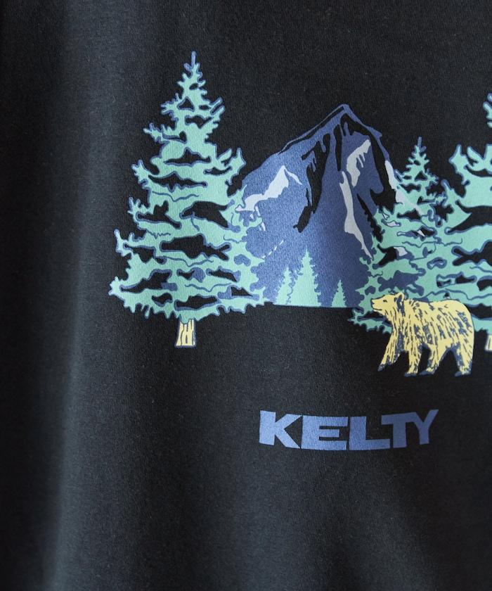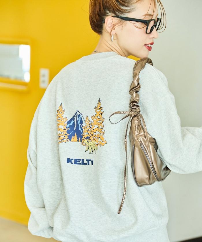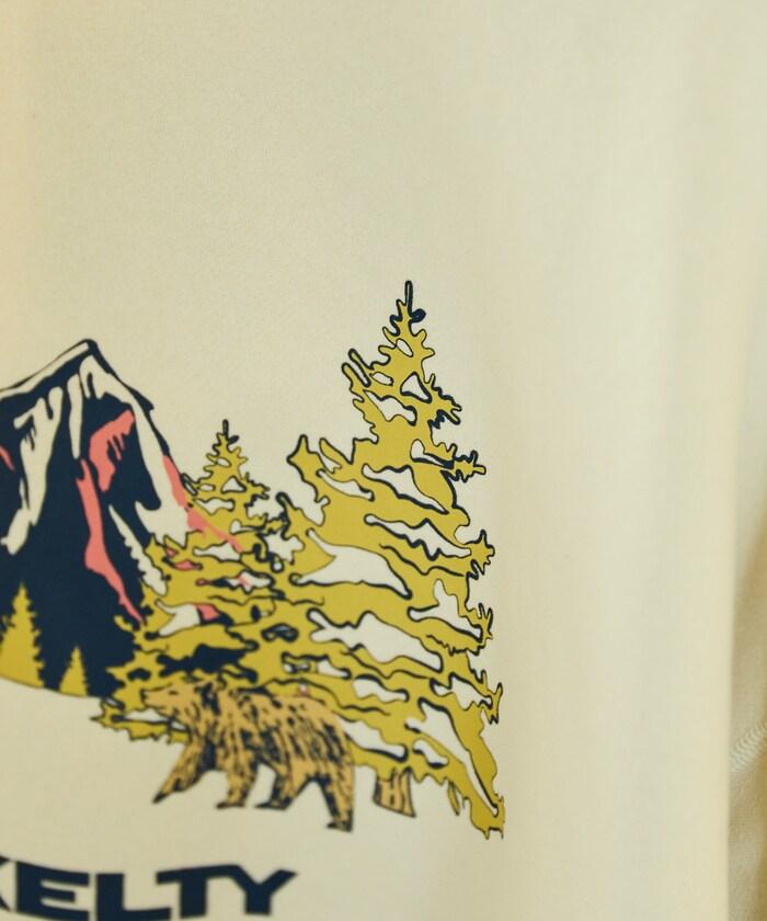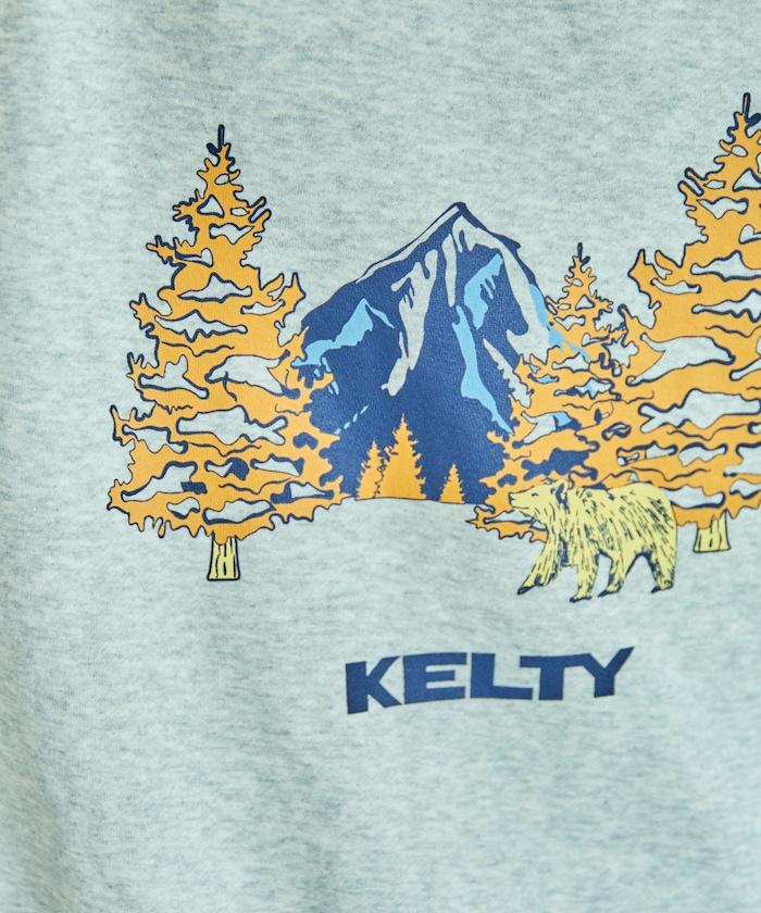 運動衫背面印有戶外風格的印花圖案,彰顯獨特的 Kelty 風格。