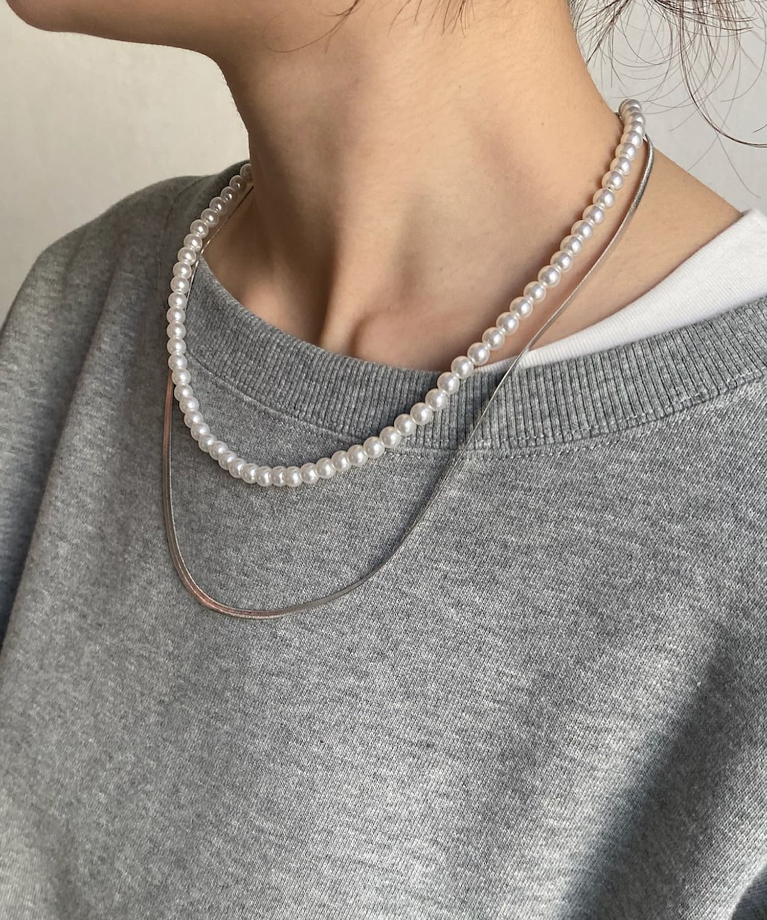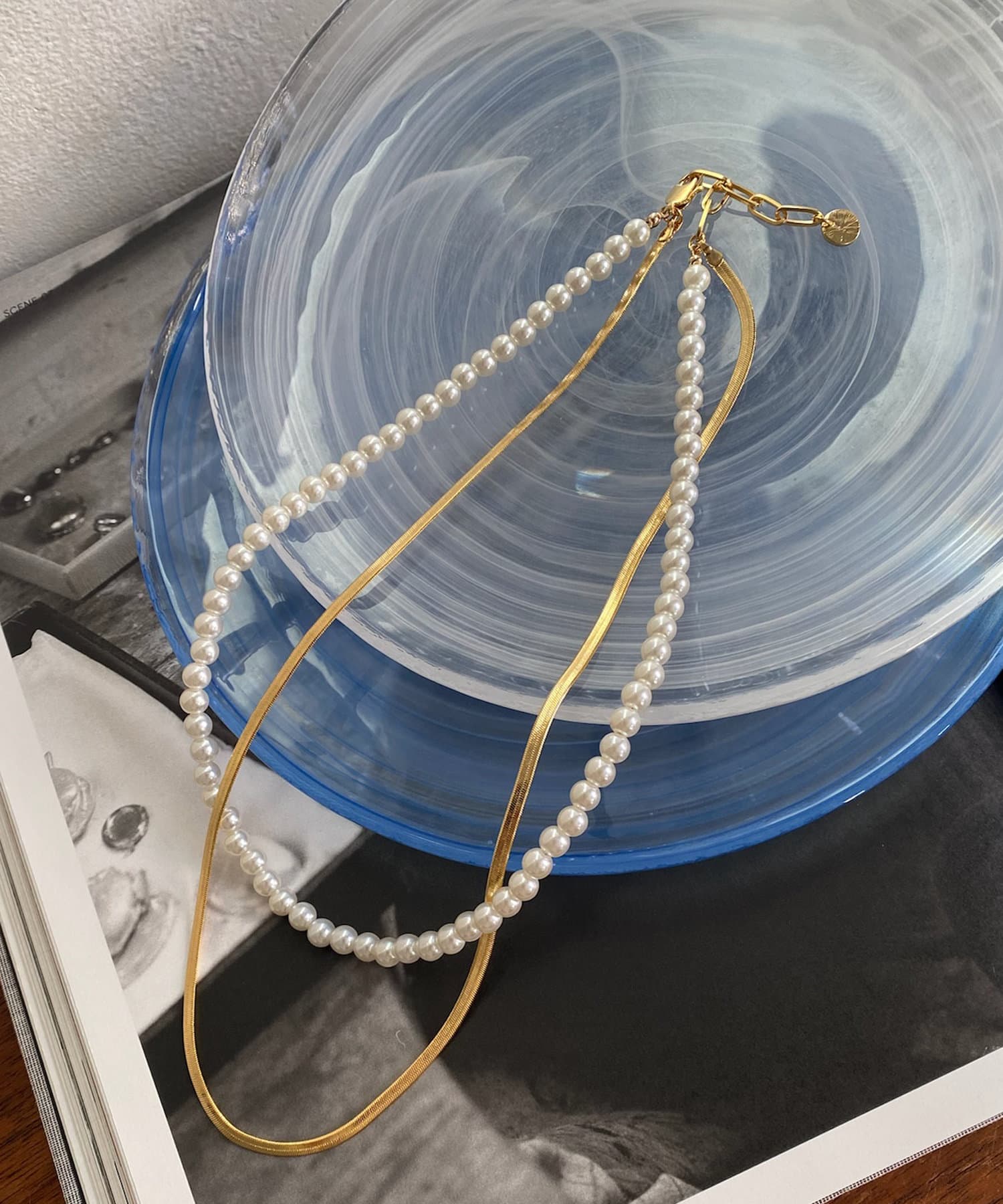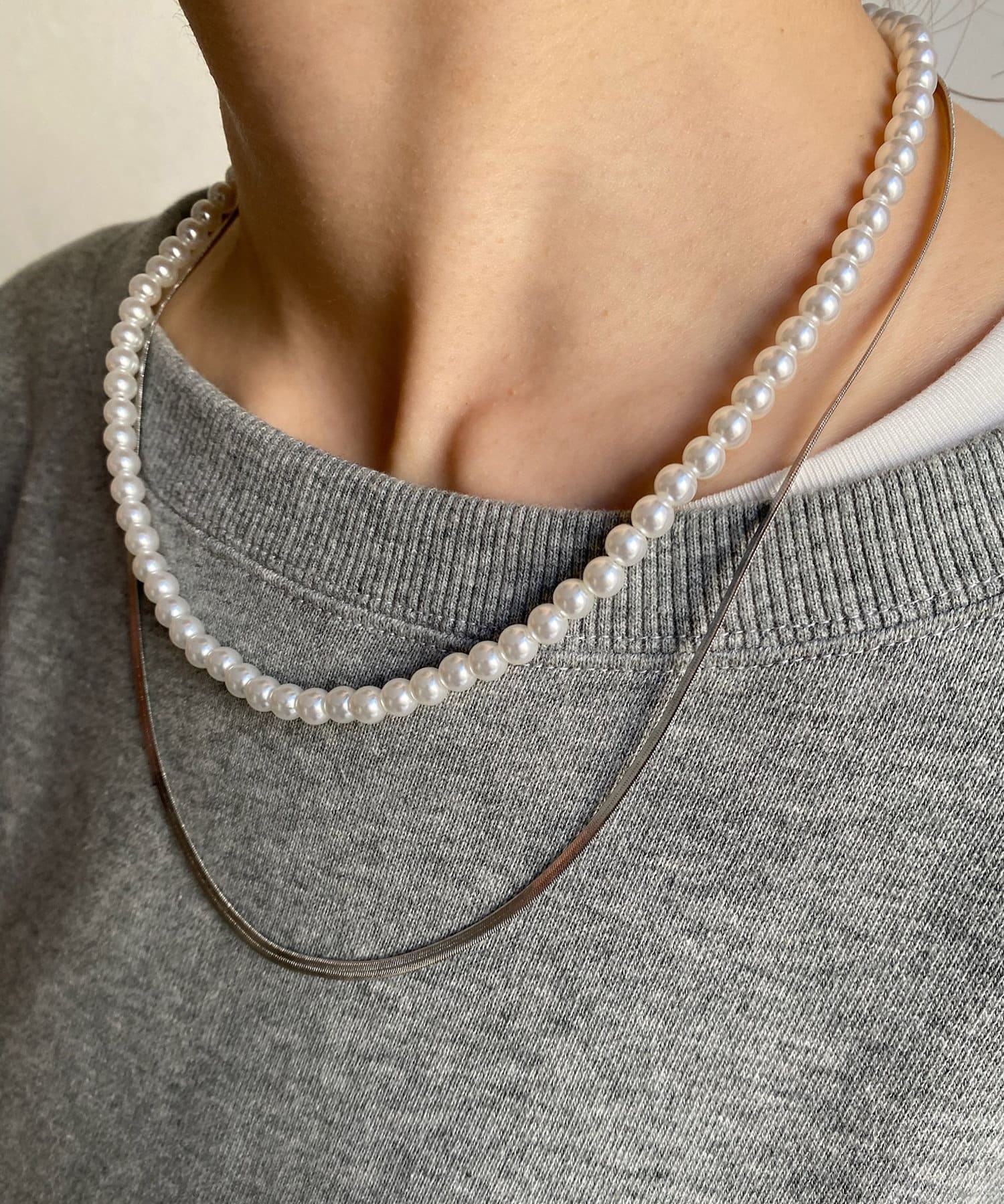 這條項鍊由兩串珍珠鏈和平蛇形鏈設計而成!