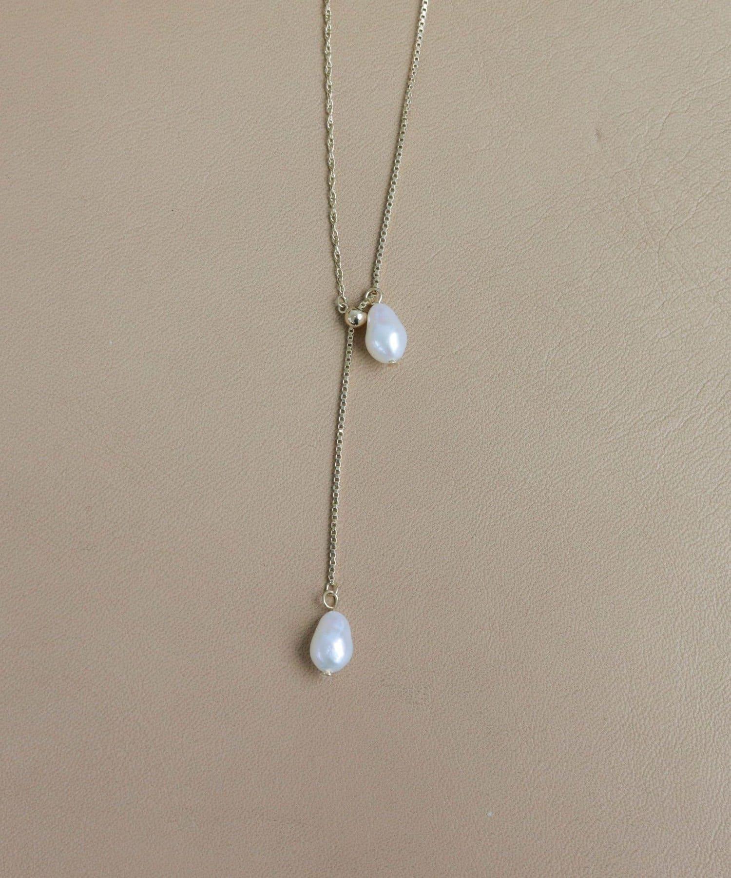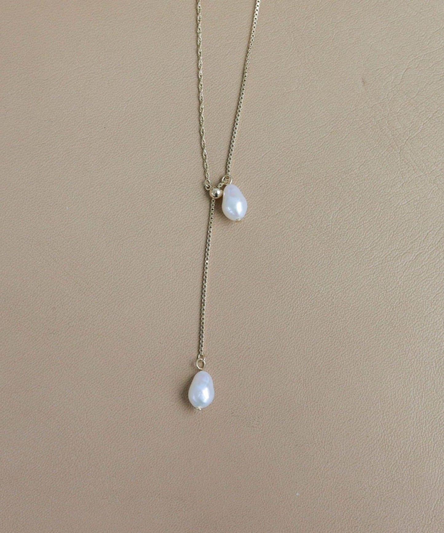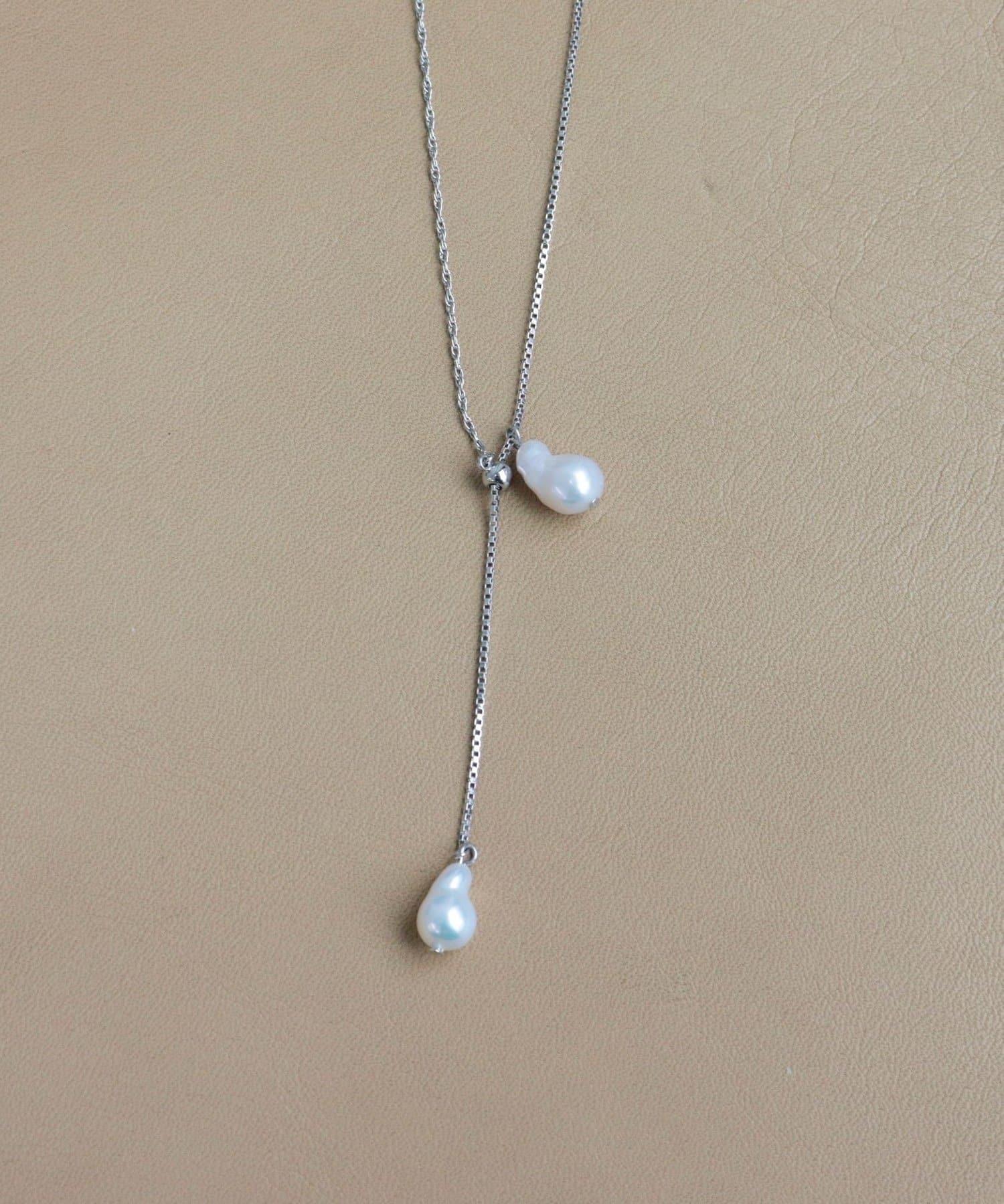 這款項鍊採用 Y 形設計,鑲嵌著優雅的珍珠。