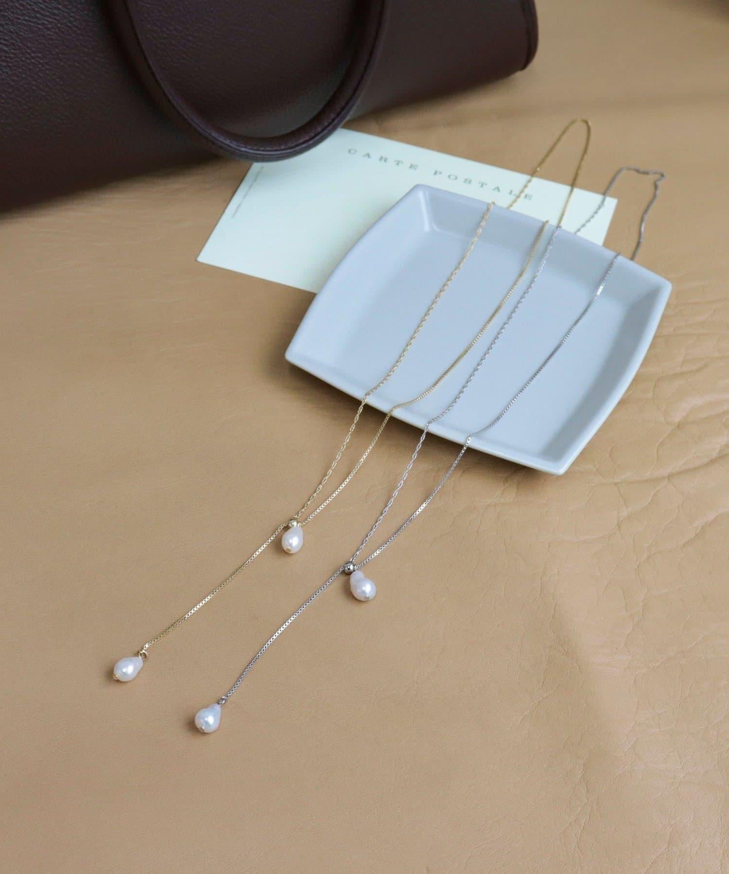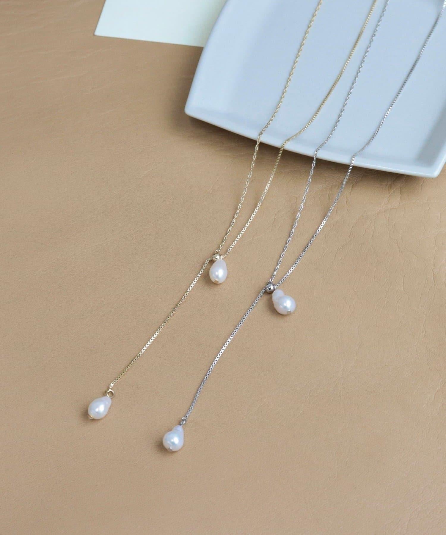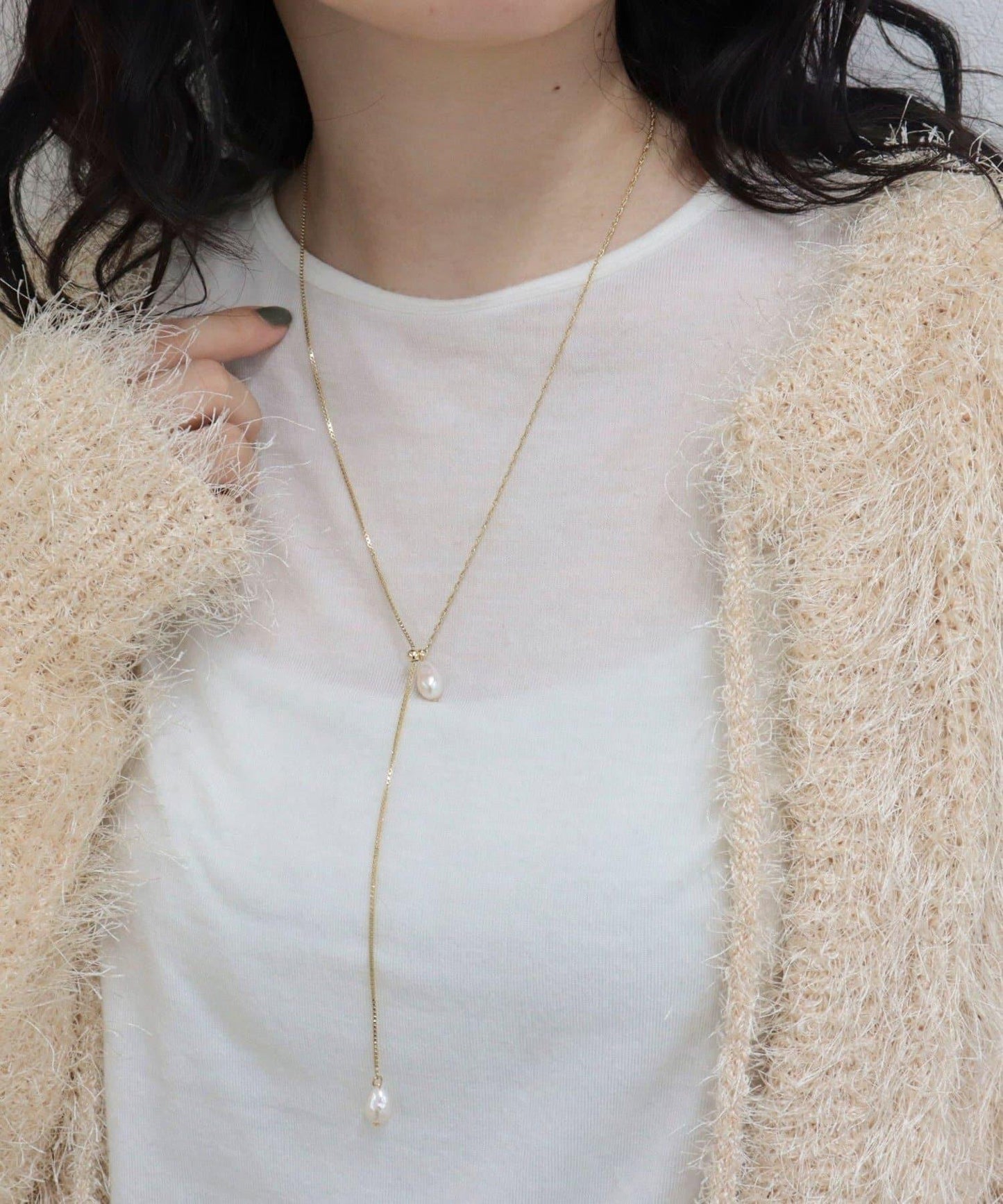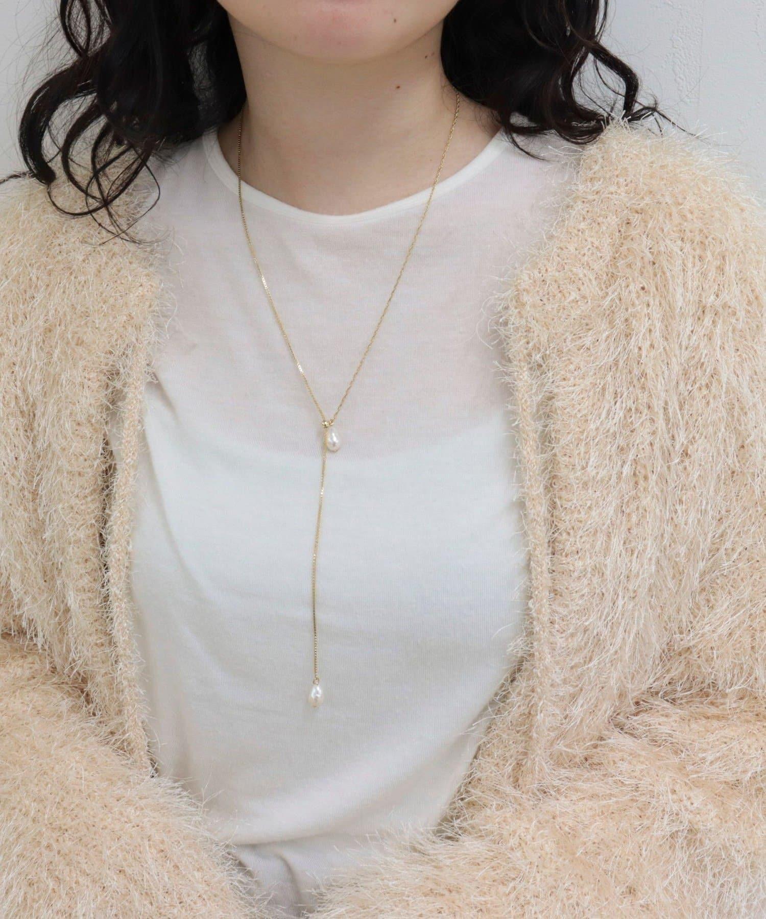這款項鍊採用 Y 形設計,鑲嵌著優雅的珍珠。
