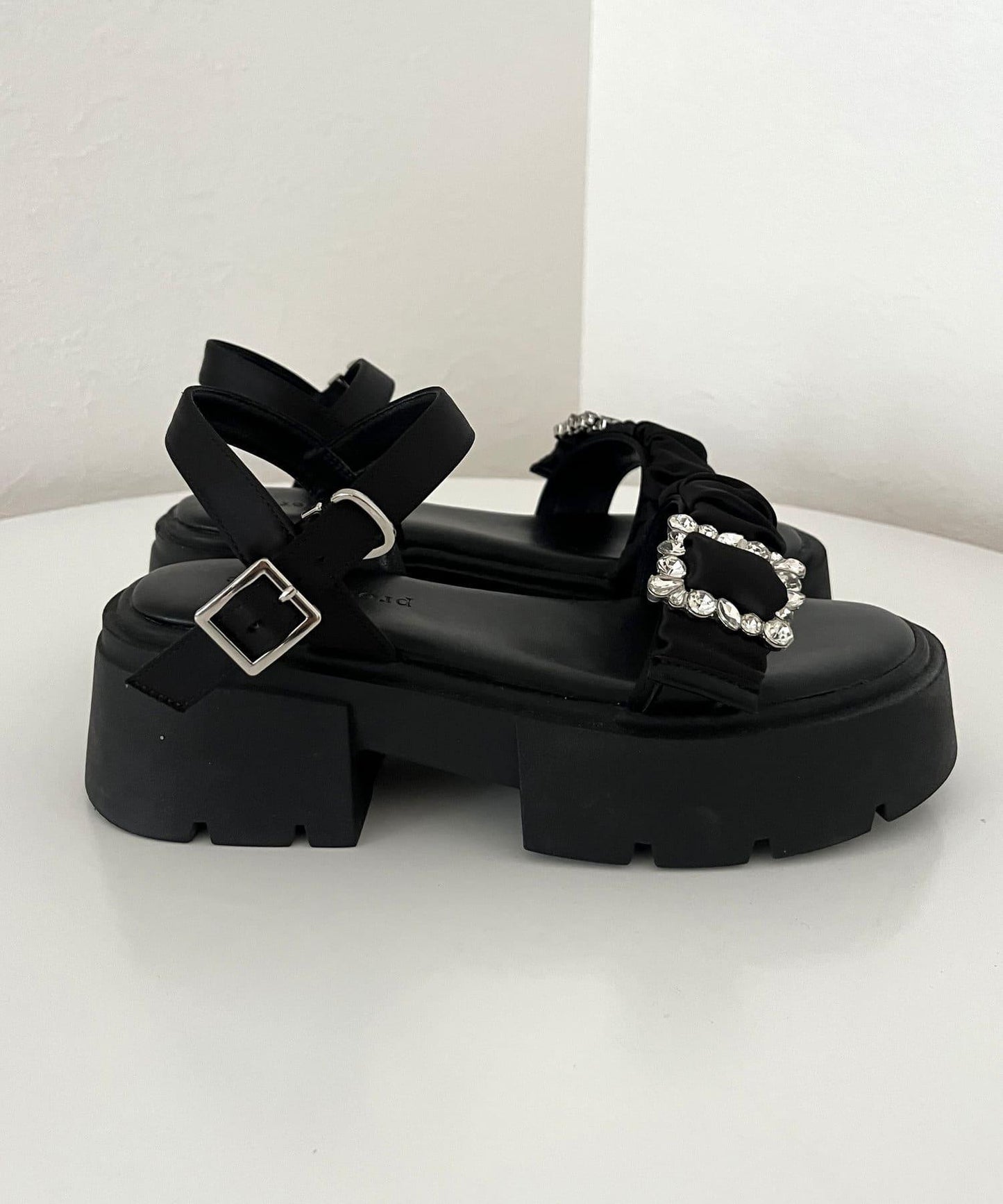 厚底涼鞋,鞋底飾有醒目的鑲嵌寶石。