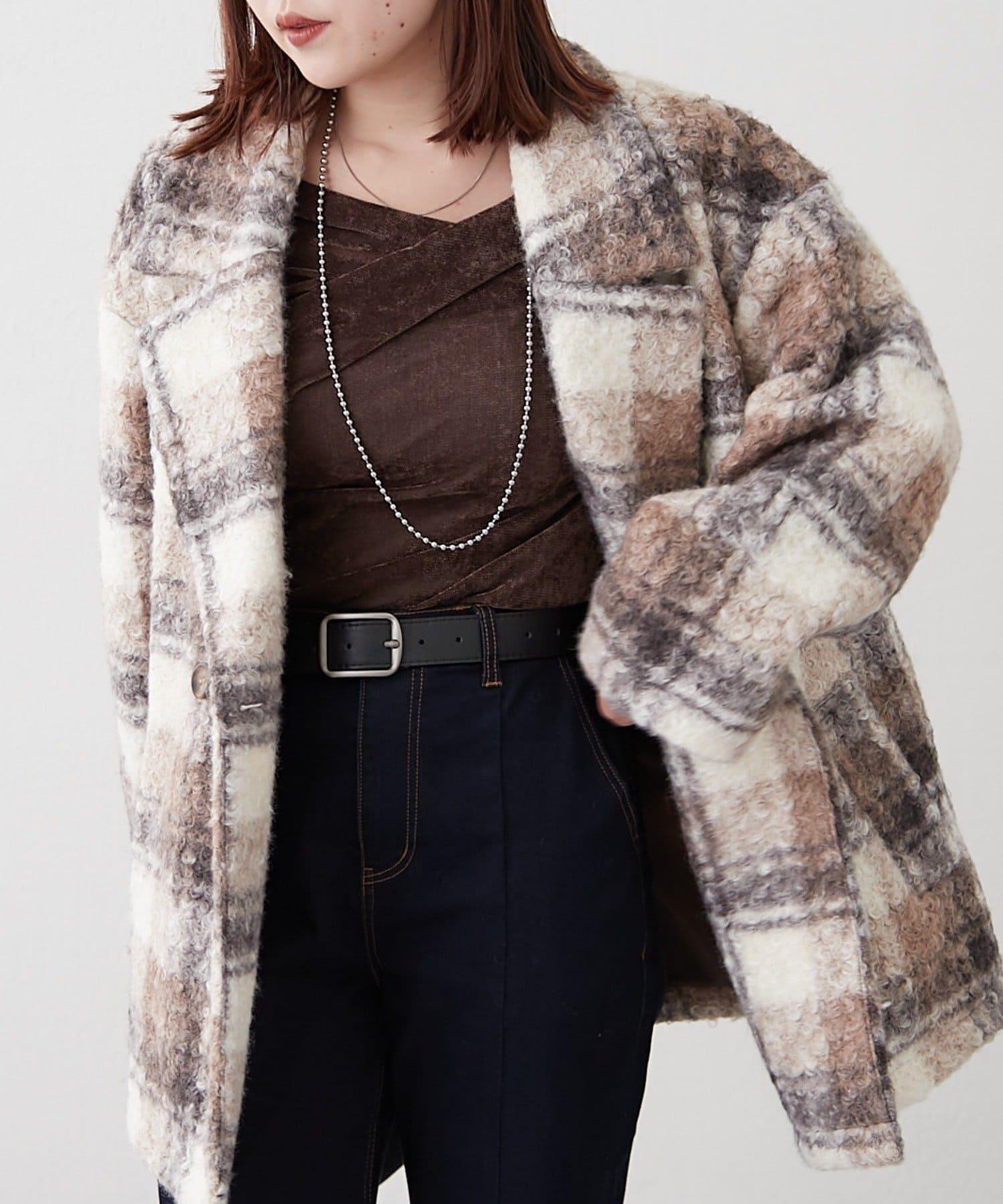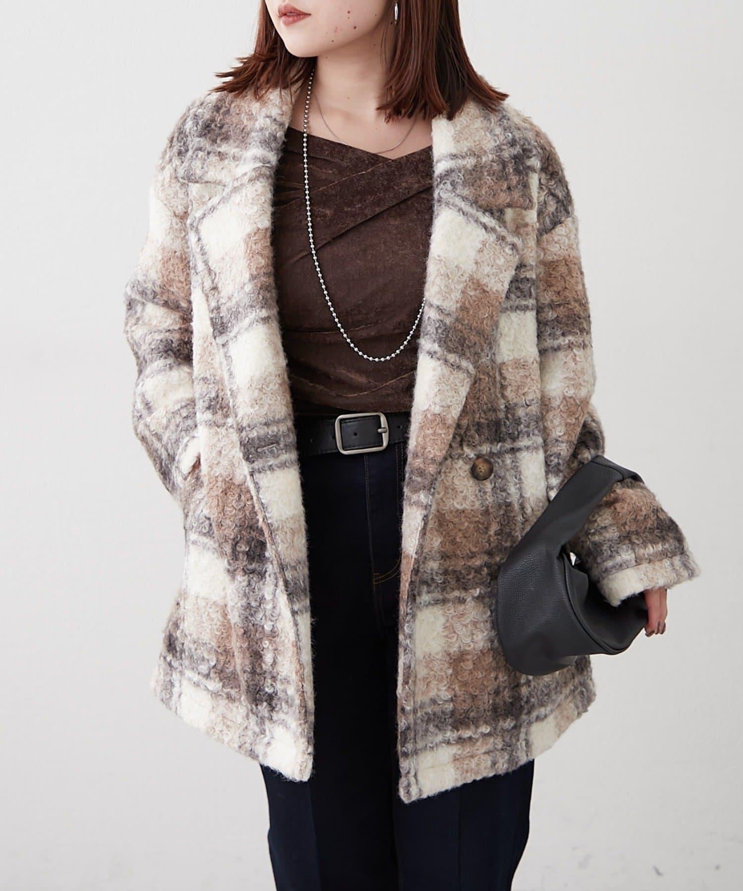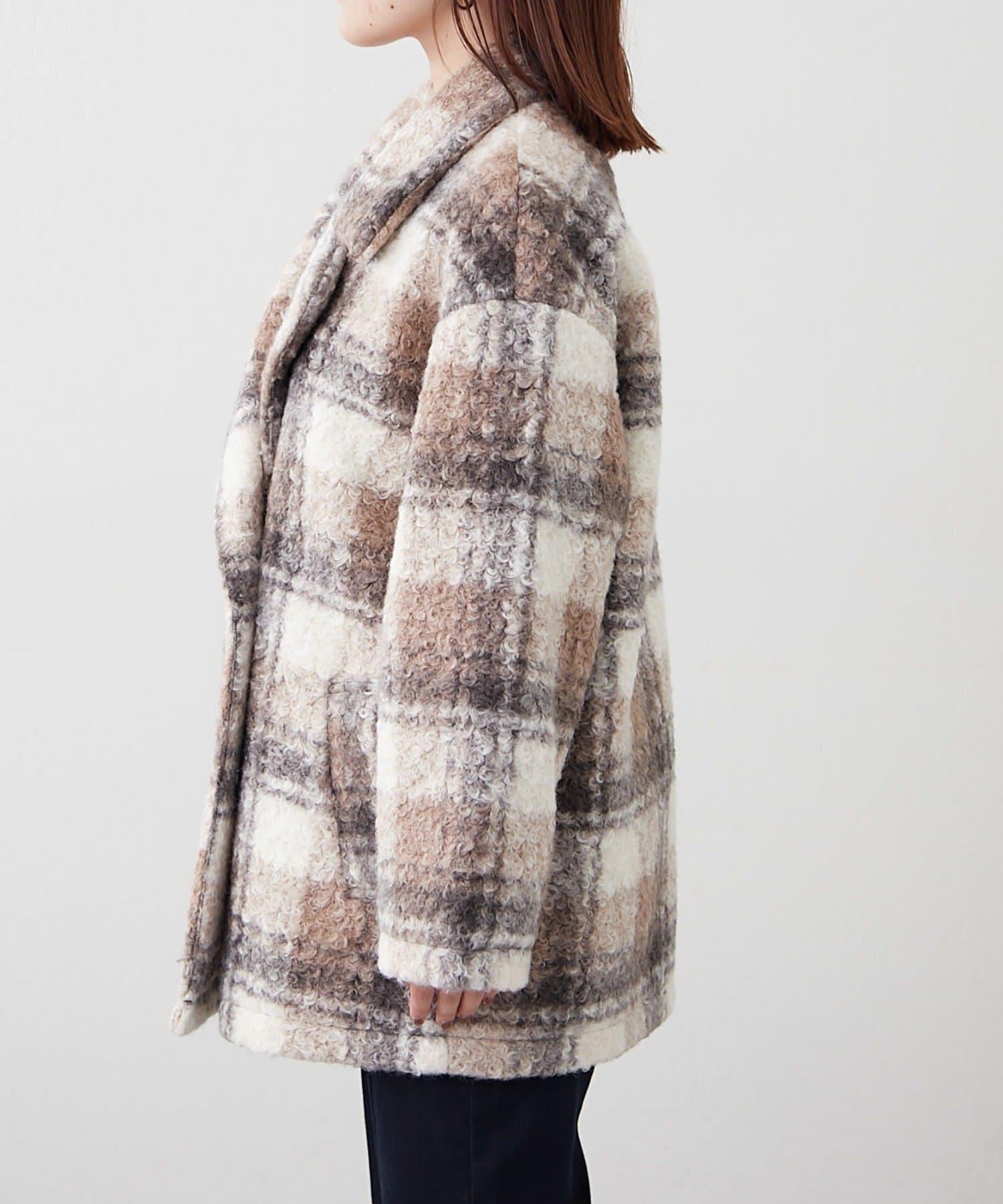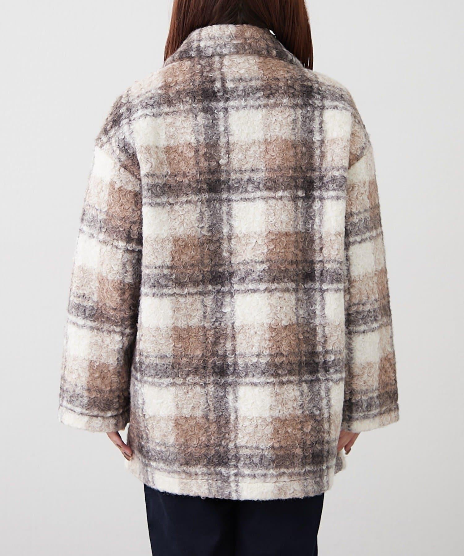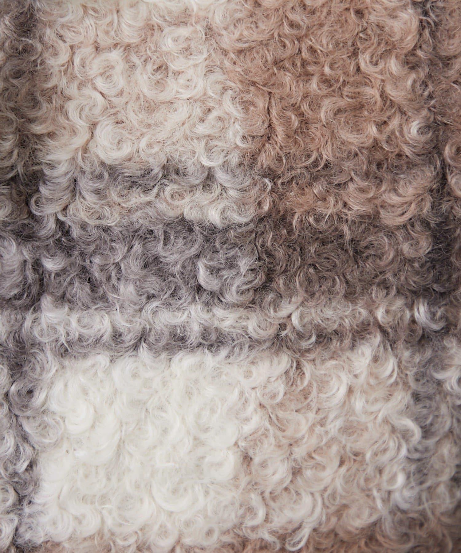 這款夾克採用捲曲的環狀羊毛面料製成,大面積的棋盤格圖案讓它成為全場的焦點。