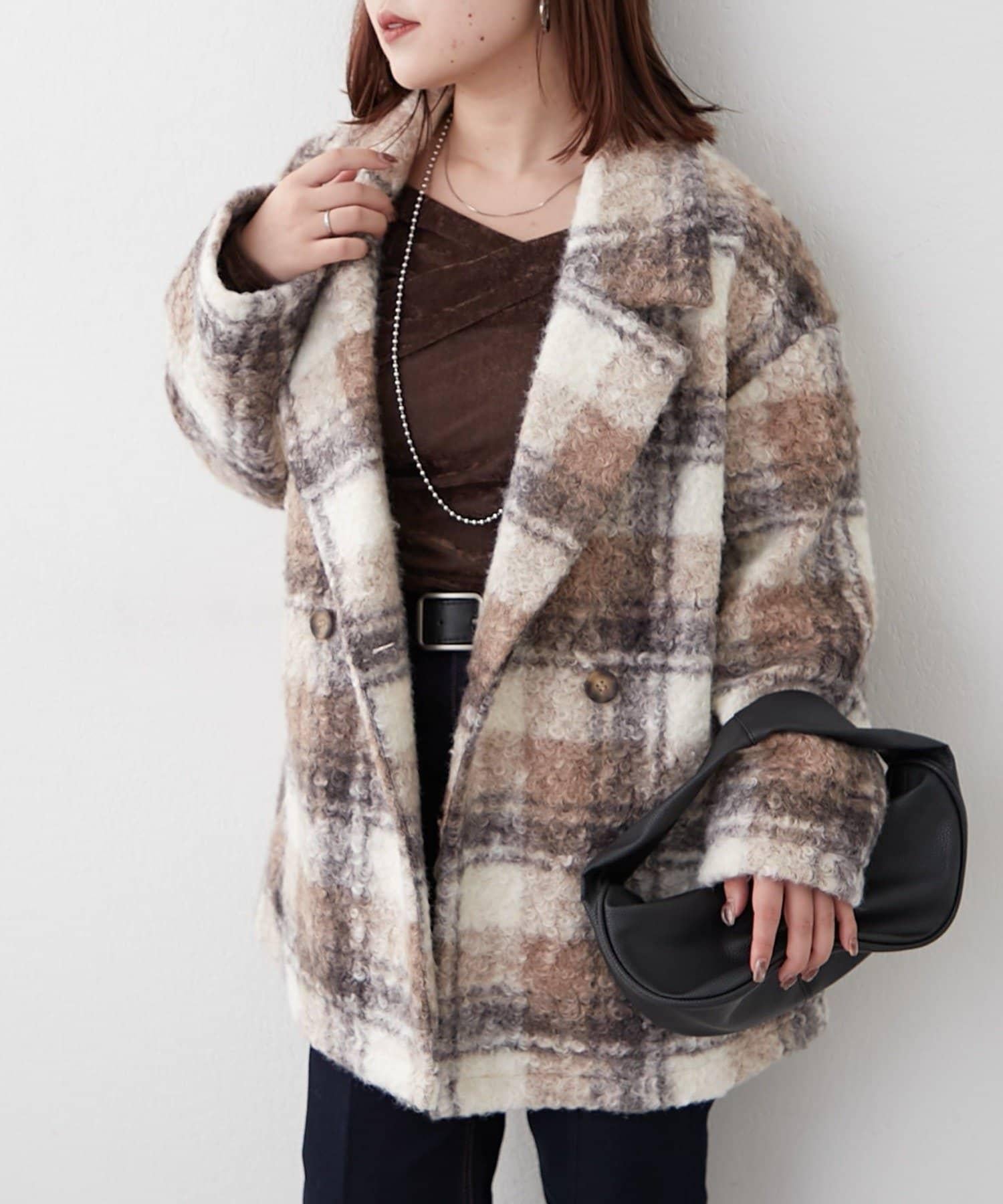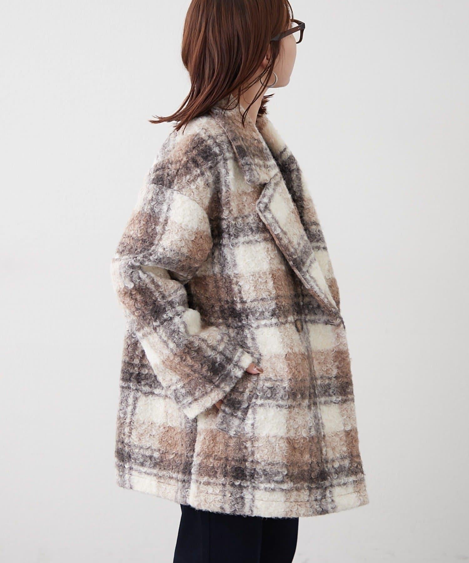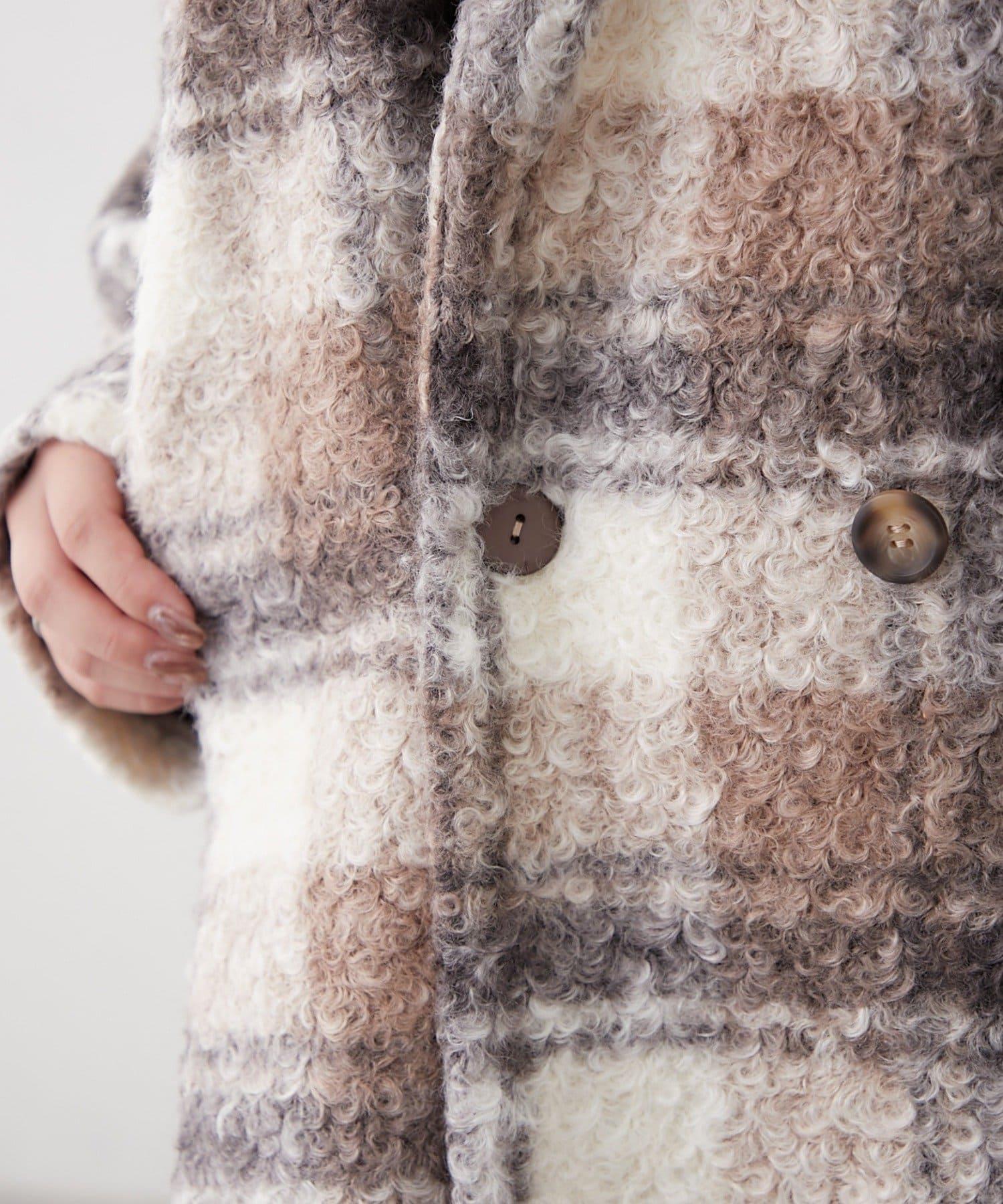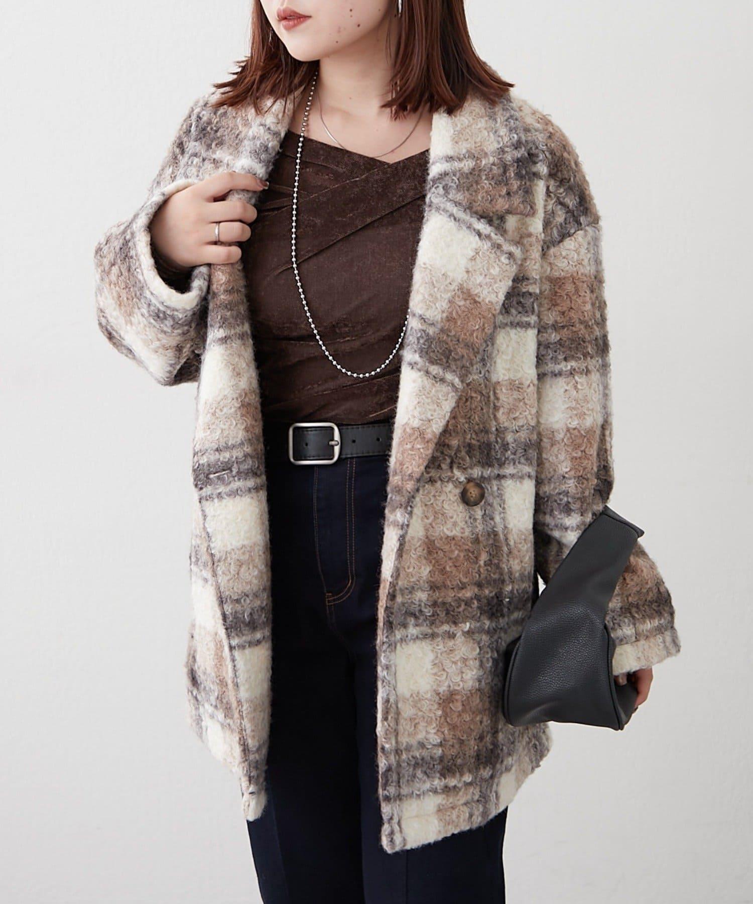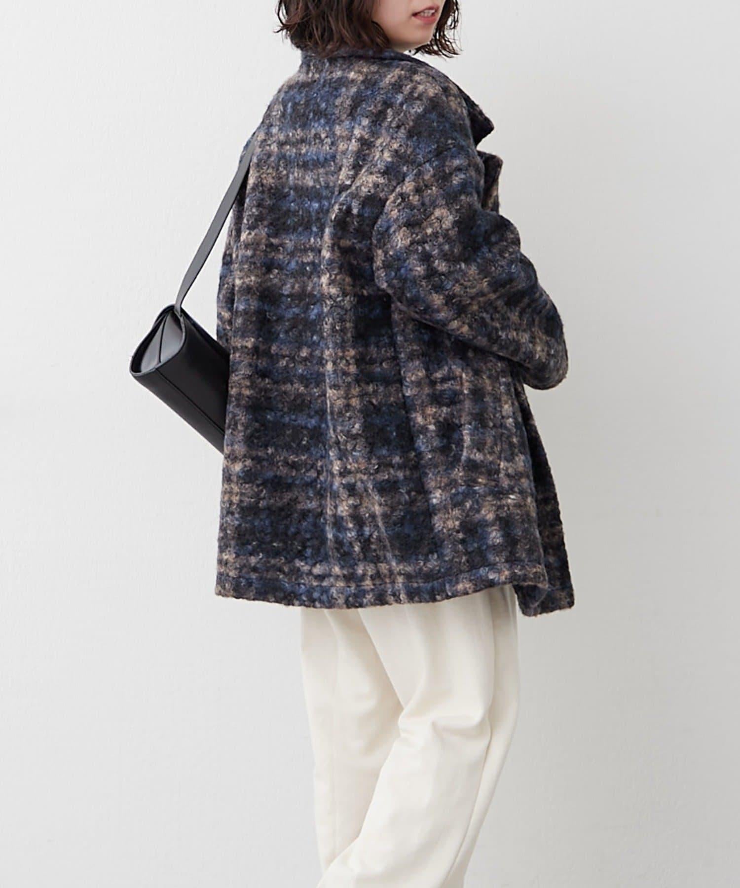 這款夾克採用捲曲的環狀羊毛面料製成,大面積的棋盤格圖案讓它成為全場的焦點。