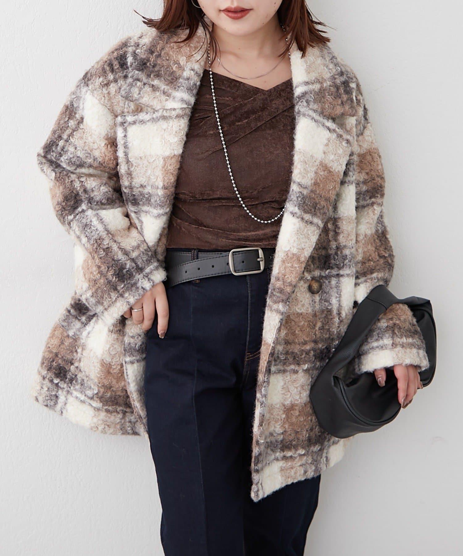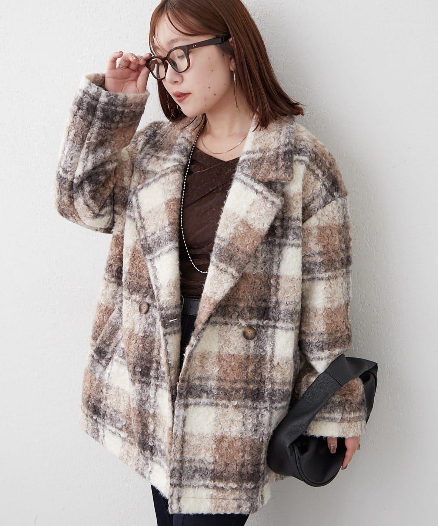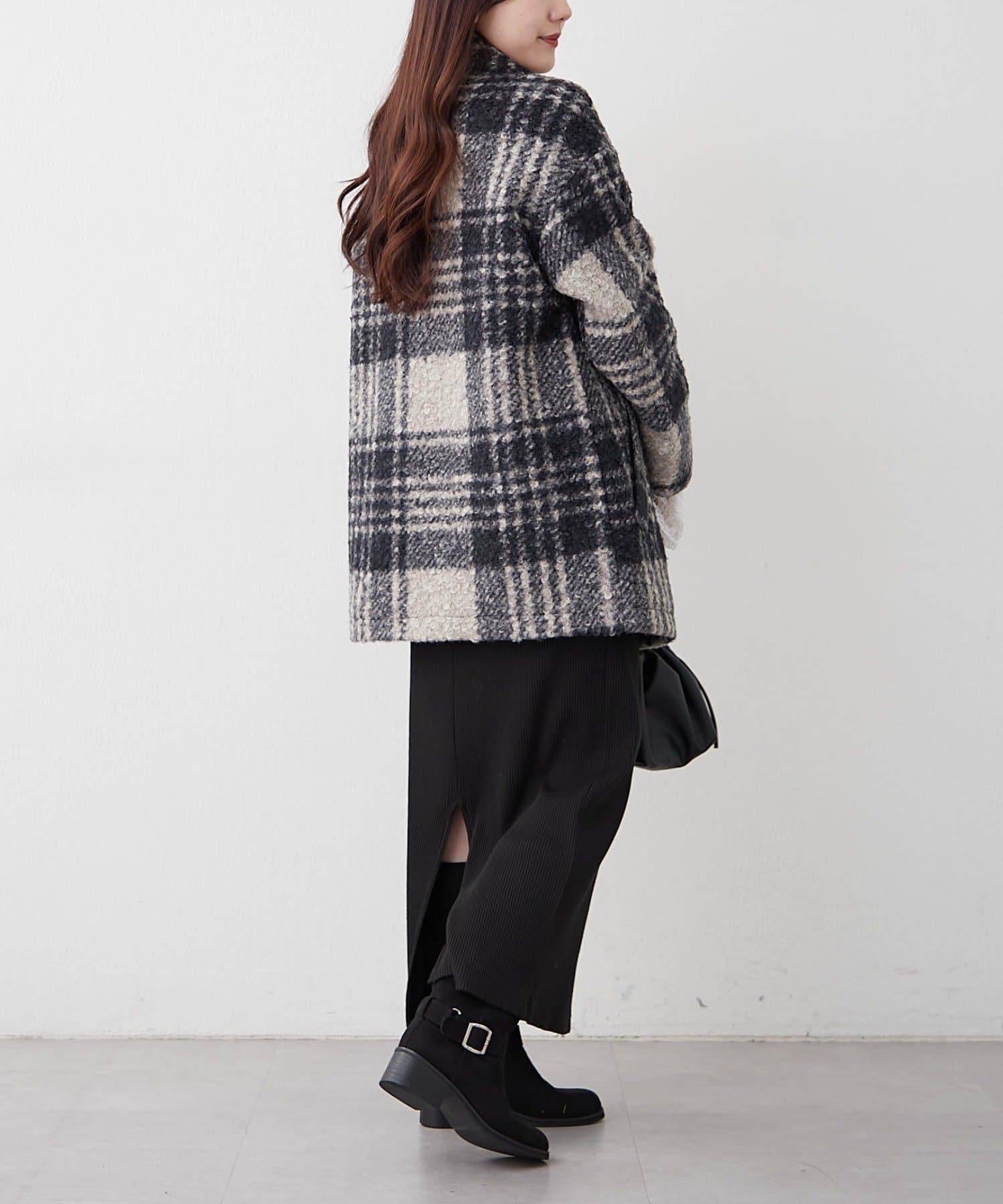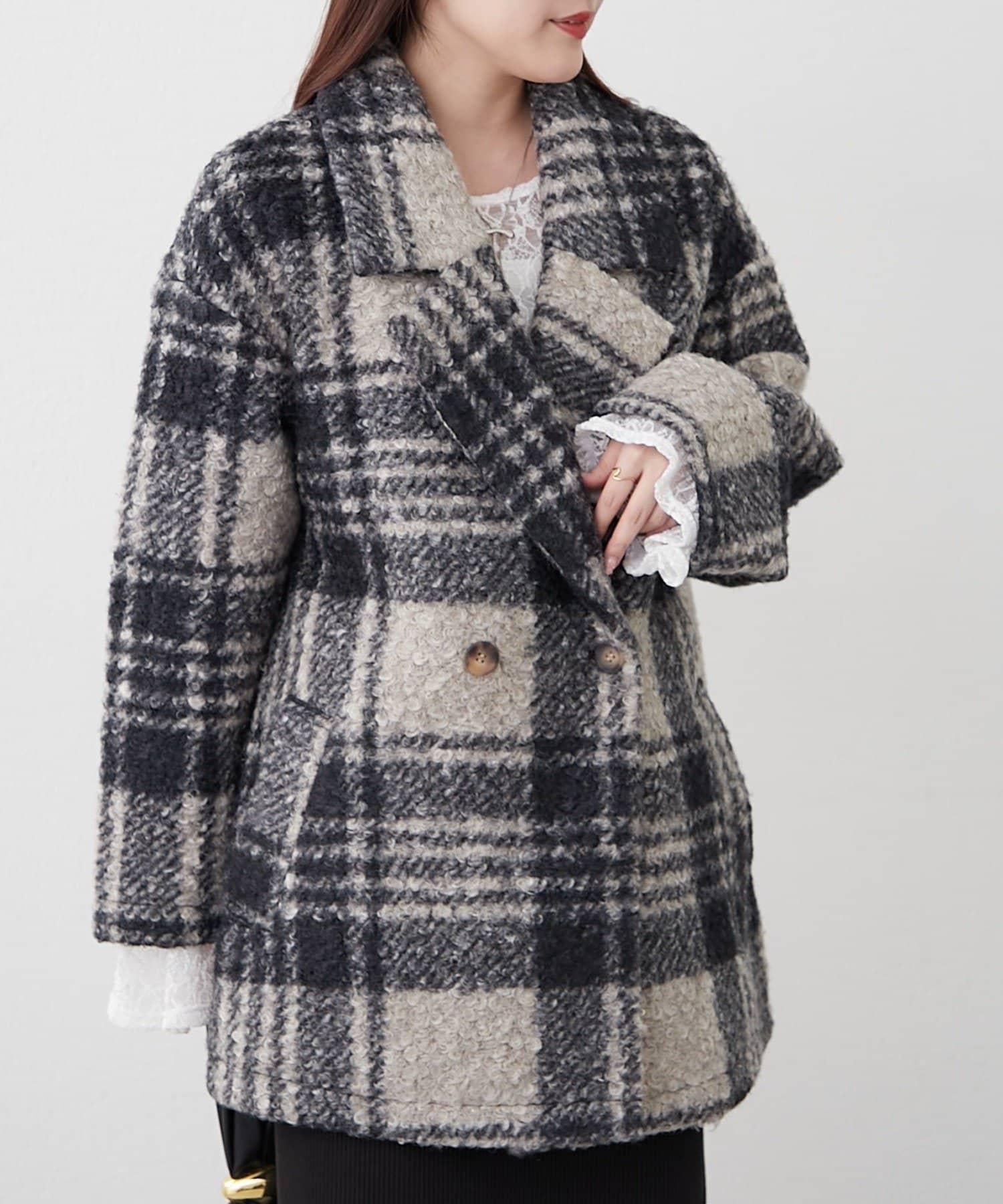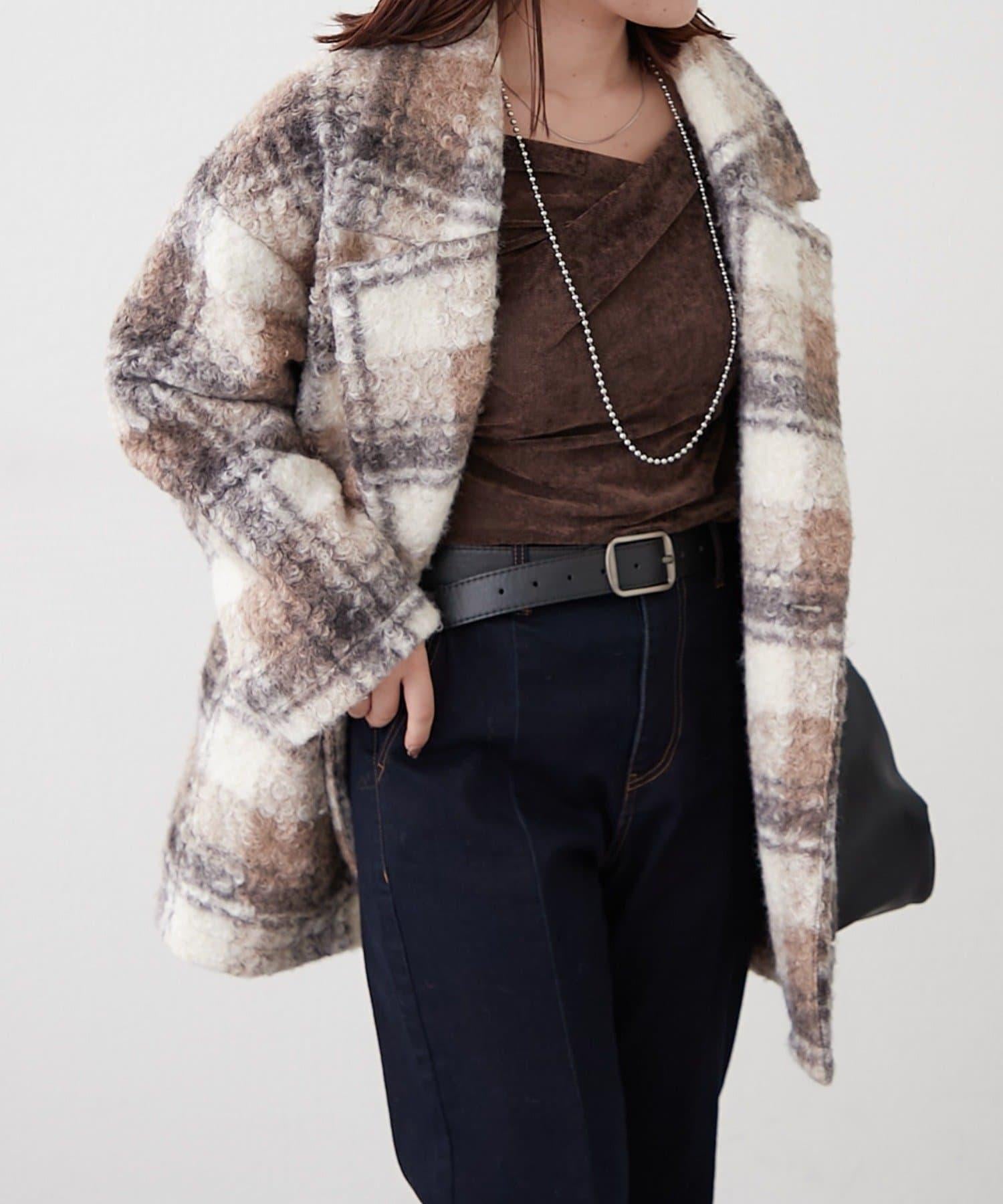 這款夾克採用捲曲的環狀羊毛面料製成,大面積的棋盤格圖案讓它成為全場的焦點。