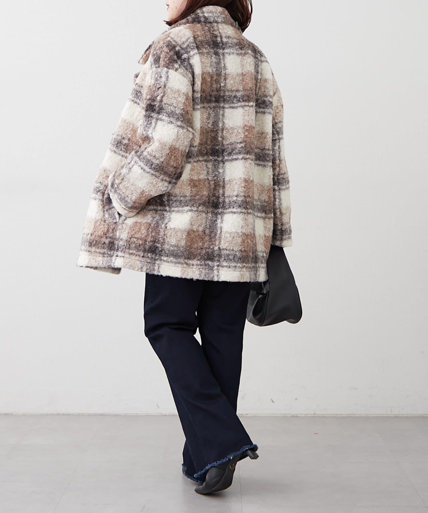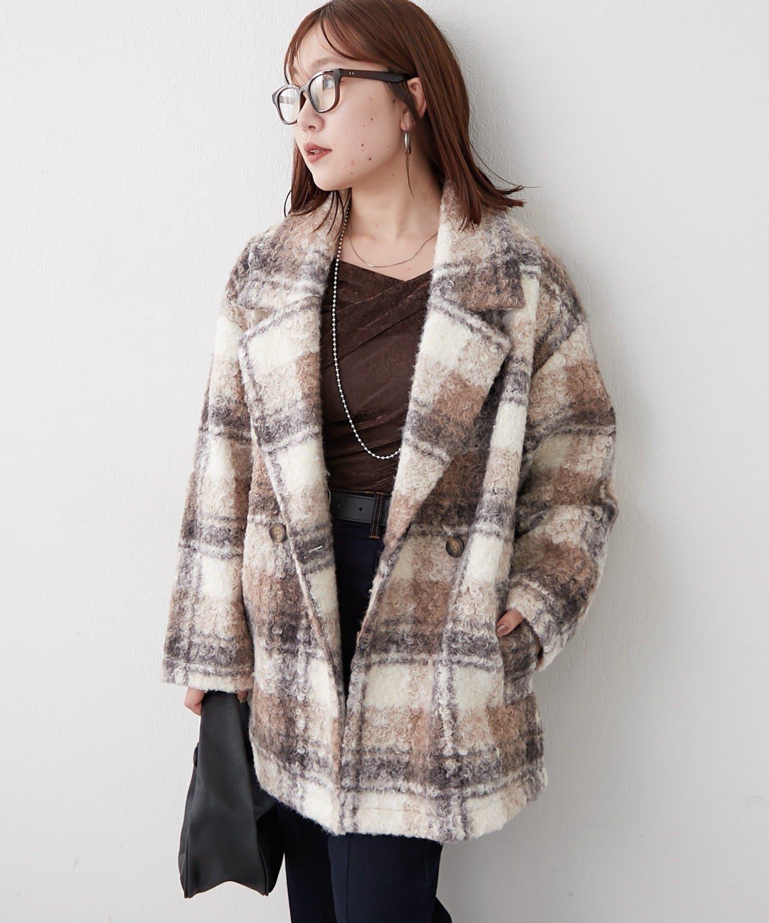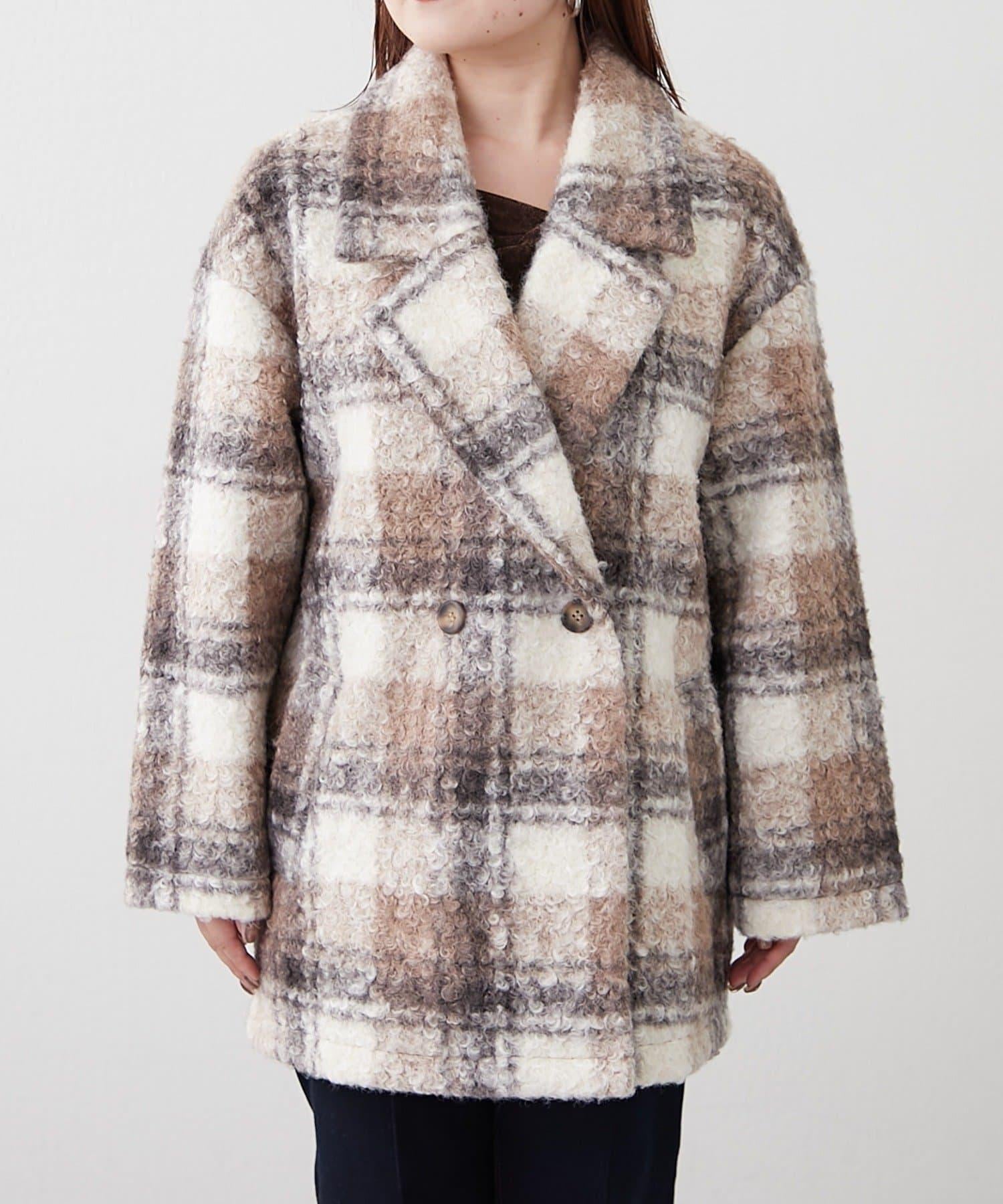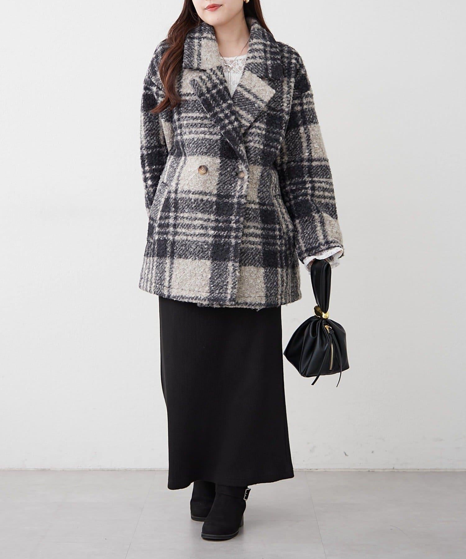 這款夾克採用捲曲的環狀羊毛面料製成,大面積的棋盤格圖案讓它成為全場的焦點。