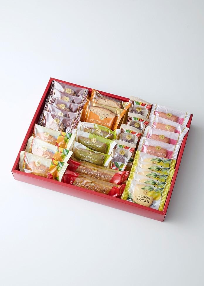 草莓巧克力蛋糕】 液體蛋白(日本製造)、人造黃油(日本製造)、糖粉(糖、糊精)、杏仁布丁、小麥粉、草莓巧克力(糖、可可脂、植物油和脂肪、全脂奶粉、草莓粉、乳糖)、還原糖漿/發泡劑、色素(紅曲、胭脂蟲)、布朗尼蛋糕] 巧克力(日本製造)、人造奶油、液態蛋、糖、小麥粉、還原糖漿、山核桃果仁、洋酒、可可粉、鹽/發泡劑、調味料(部分含有小麥、雞蛋、牛奶成分、杏仁、大豆、夏威夷果仁)。橘子瑪德琳]人造奶油(日本製造)、小麥粉、糖、液態蛋、白砂糖、橘子醬、蜜餞橘子皮、洋酒、橘子皮、鹽/發泡劑、調味料(部分含小麥、雞蛋、牛奶成分、橘子)[開心果 Financier]人造奶油(日本製造)、液態蛋白(日本製造)、糖粉(糖)、糖(糖)、橘子皮(日本製造)、可可粉、鹽(部分含小麥、雞蛋、牛奶成分、橘子)人造奶油(日本製造)、液體蛋白(日本製造)、糖粉(糖、糊精)、小麥粉、杏仁布丁、反式糖、開心果粉、糖漿、杏仁糊、開心果糊、鹽/色素(紅花黃色、梔子花色)、膨鬆劑、調味料(部分含有小麥、雞蛋、牛奶成分、杏仁成分)紅糖磅蛋糕] 小麥粉(日本製造)、液態蛋、人造黃油、細砂糖、蜜餞橙皮、蜜餞櫻桃、巧克力、加工紅糖、起酥油、甜蛋黃、洋酒/乳化劑、發酵劑、胭脂蟲染料、調味料(部分含有小麥、雞蛋、牛奶成分、橙子和大豆)。杏仁焦糖蛋糕] 糖(日本製造)、小麥粉、液態蛋、人造黃油、奶油、起酥油、杏仁、綿白糖、糖漿、焦糖糊、鹽/乳化劑、發酵劑、調味料(部分含有小麥、雞蛋、牛奶成分、杏仁和大豆 檸檬餅乾] 小麥粉(日本製造)、糖、黃油、奶油、起酥油、杏仁、綿白糖、焦糖糊、鹽/乳化劑、發酵劑、調味料(部分含有小麥、雞蛋、牛奶成分、杏仁和大豆)。(巧克力餅乾] 糖(日本製造)、黃油、人造黃油、杏仁布丁、液態蛋、加工檸檬產品、濃縮檸檬汁、糊精、鹽/調味劑、發酵劑、紅花色素、酸味劑(部分含有小麥、雞蛋、牛奶成分、杏仁) [巧克力餅乾] 糖(日本製造)、小麥粉、人造黃油、椰子、液態蛋、巧克力、玉米片、燕麥、鹽、糊精/膨鬆劑、乳化劑、調味料(部分含小麥、雞蛋、牛奶成分、大豆)