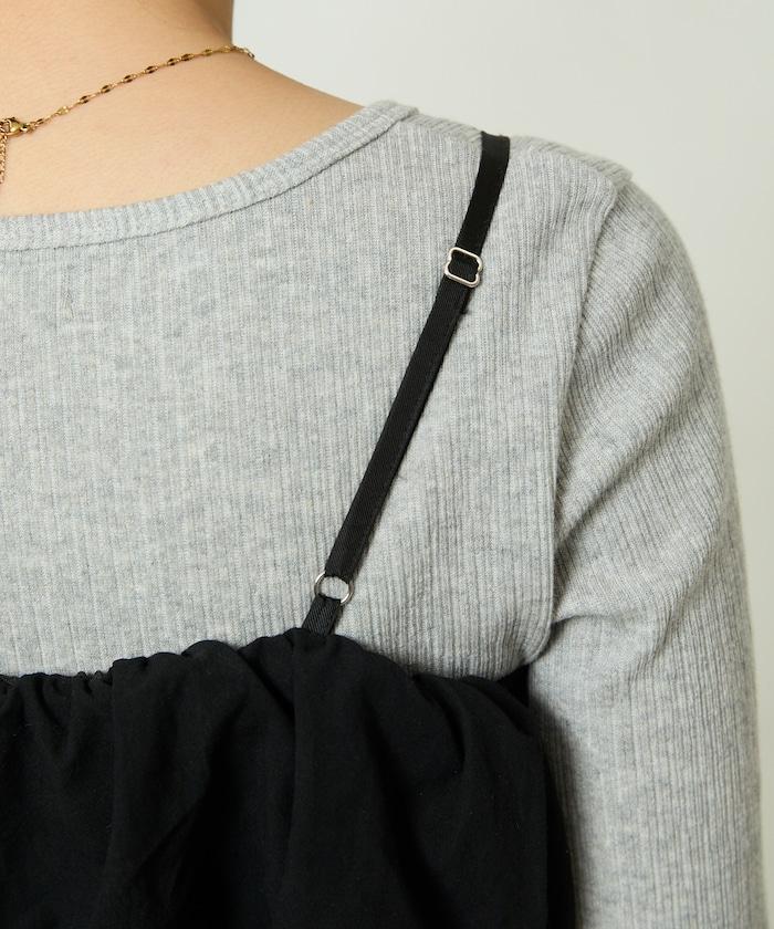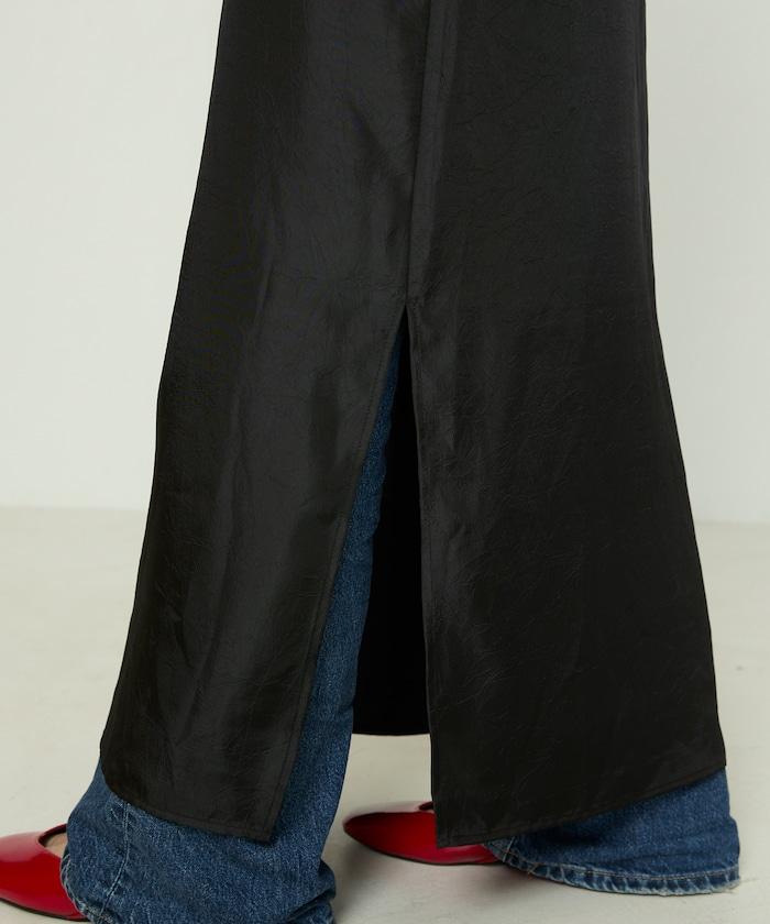 成人吊帶連衣裙,胸前飾有碎邊,採用亮面緞面。
