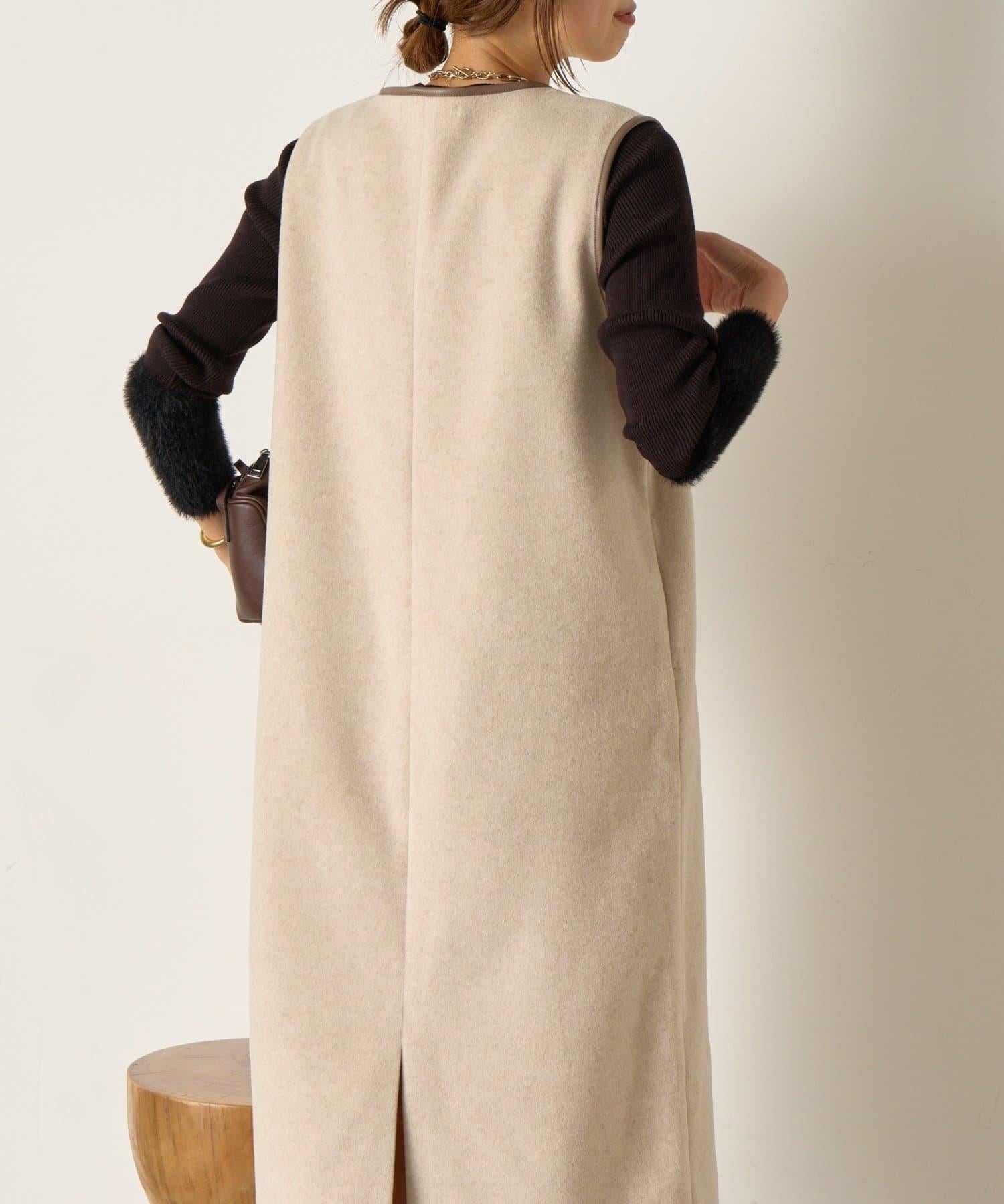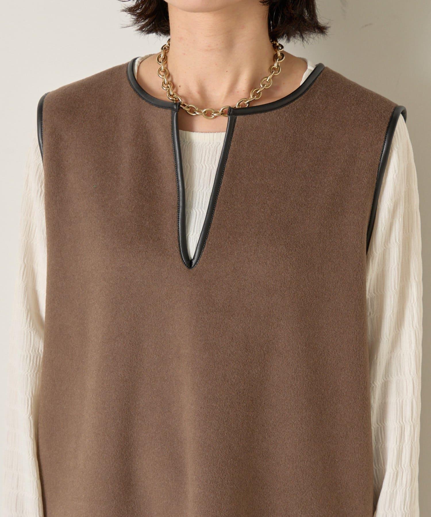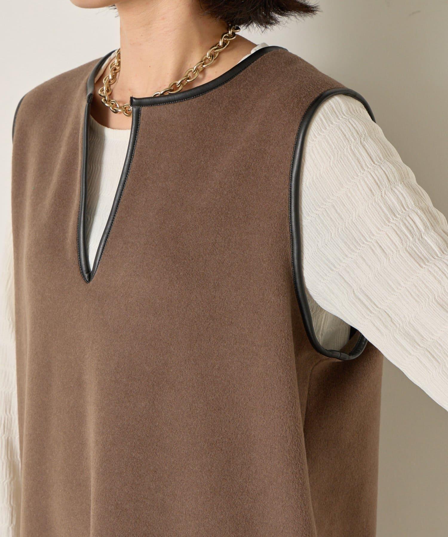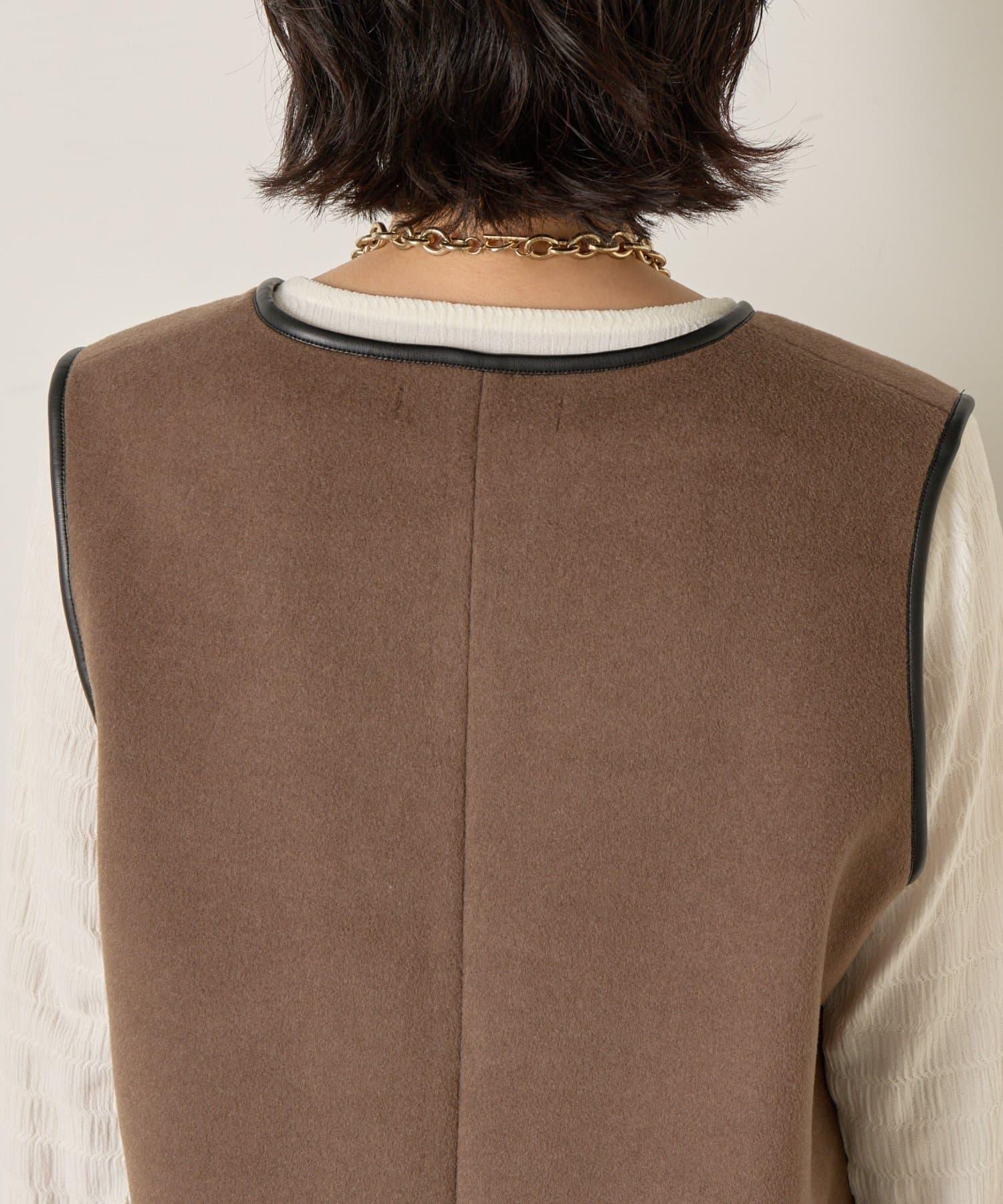 一款在臂環和袖口以皮革滾邊點綴的坎肩。