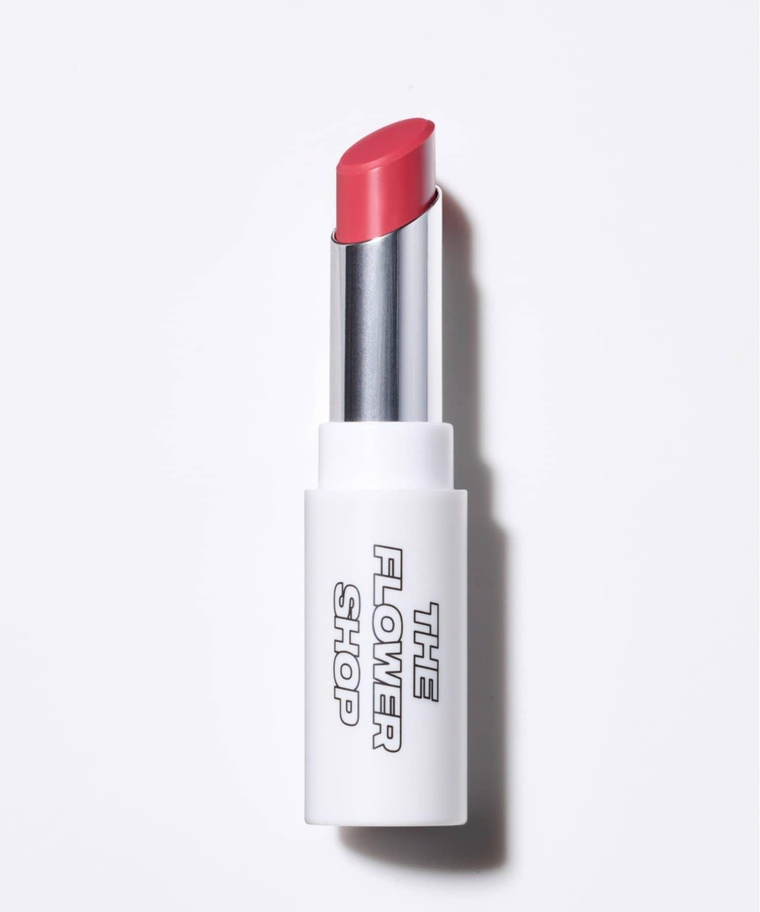 套裝中的唇色是 THE FLOWER SHOP 的 PETAL ROUGE。