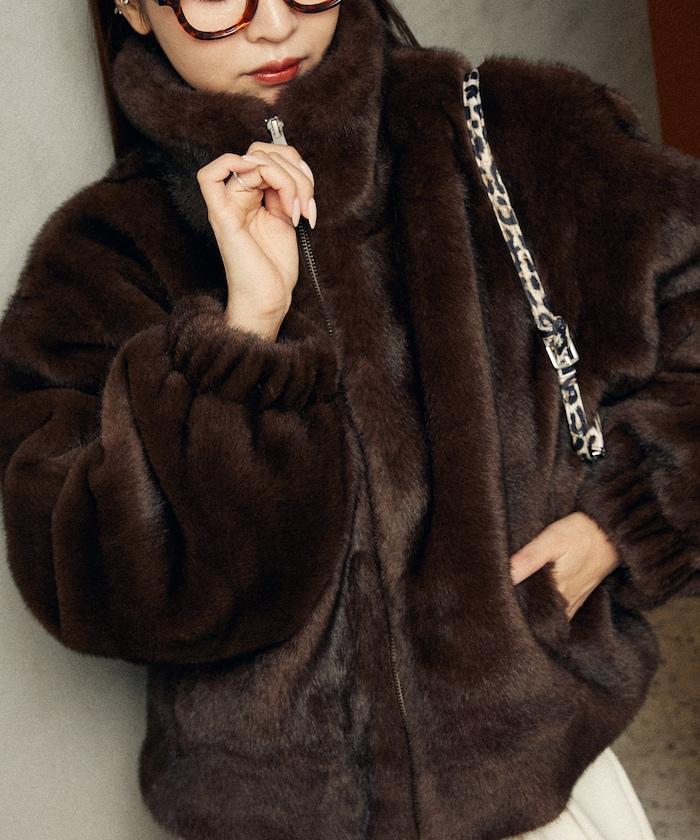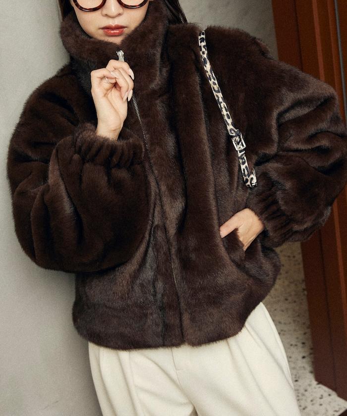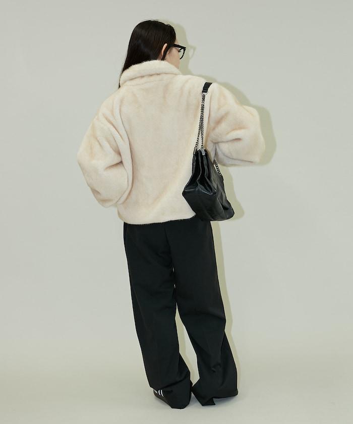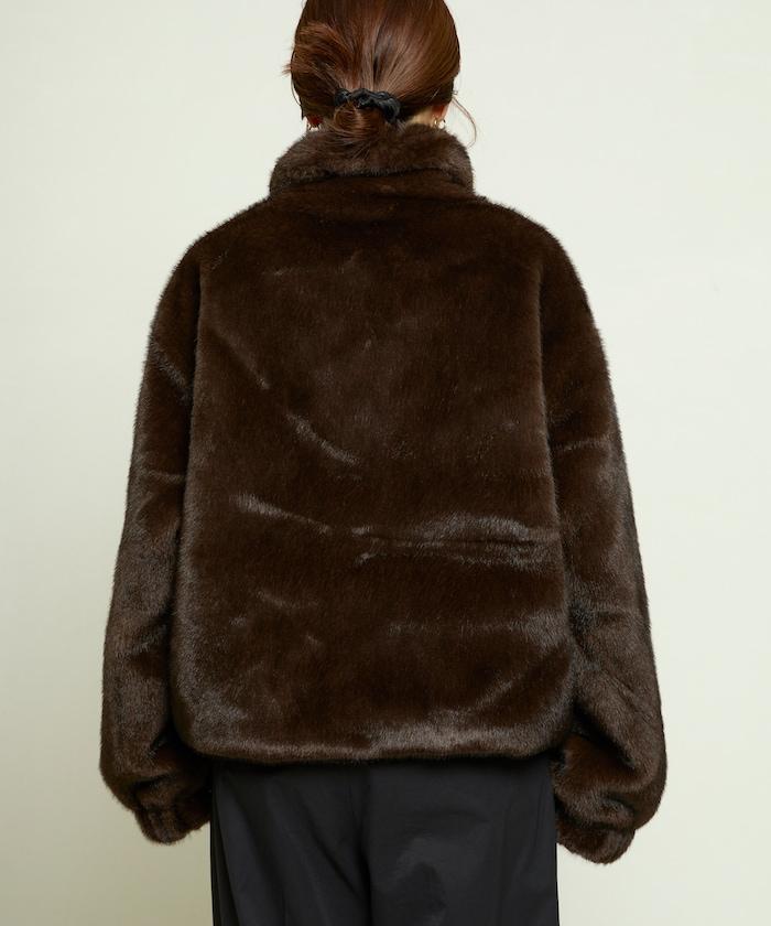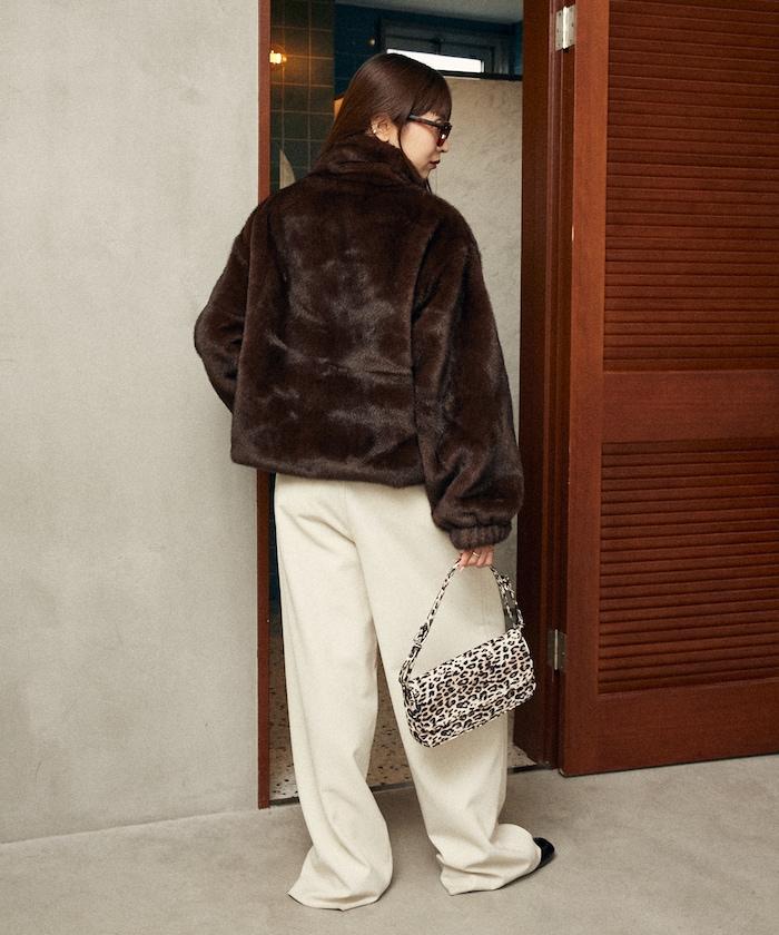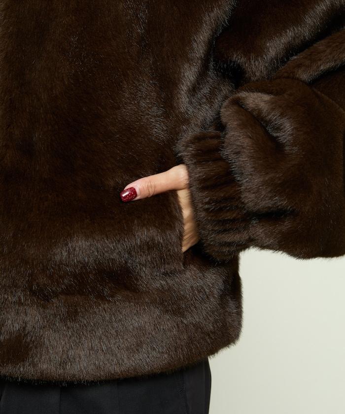 短款人造皮草罩衫,長度緊湊,質地蓬鬆。
