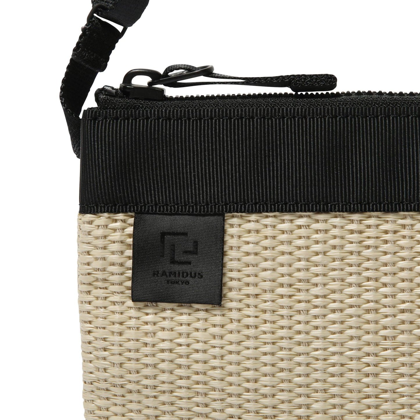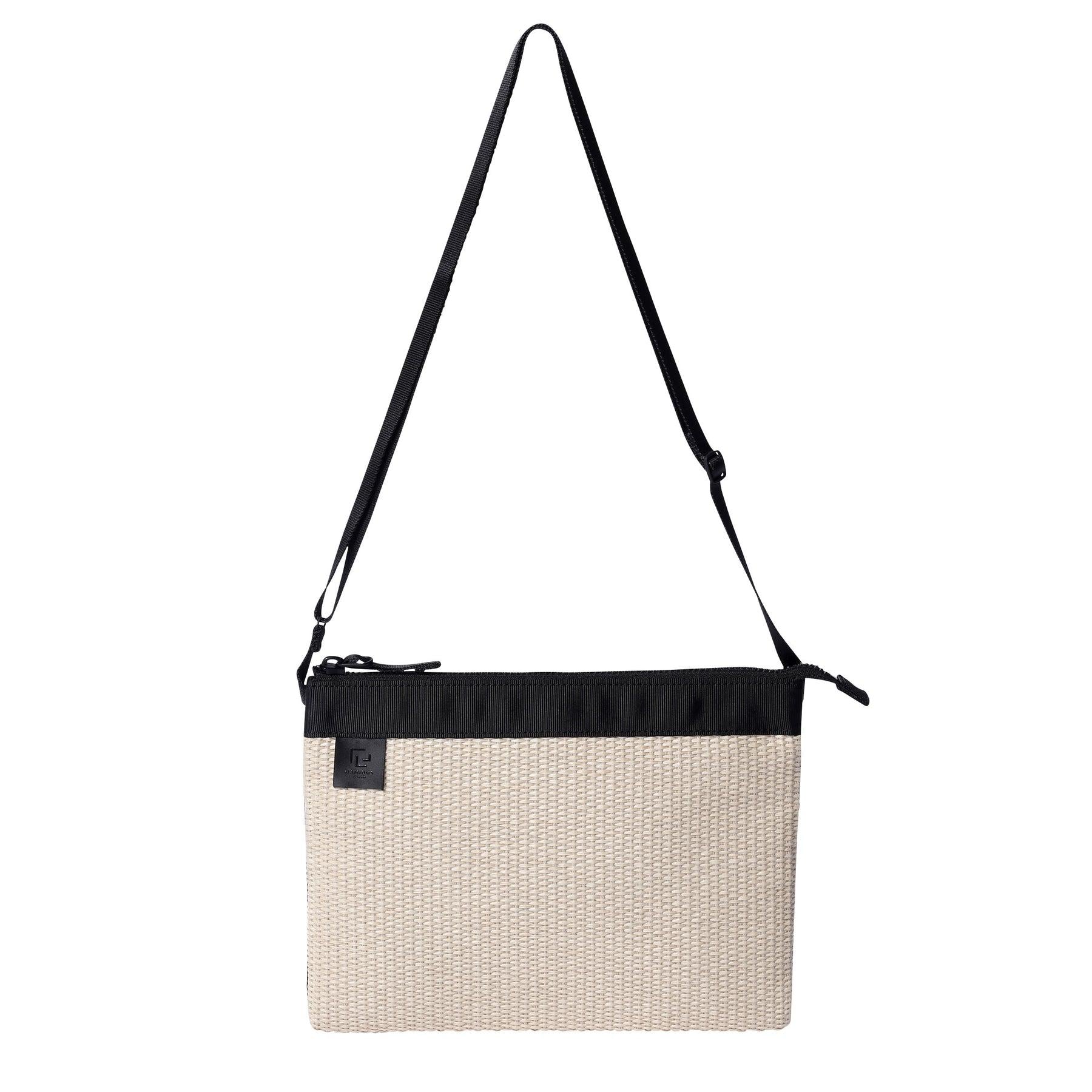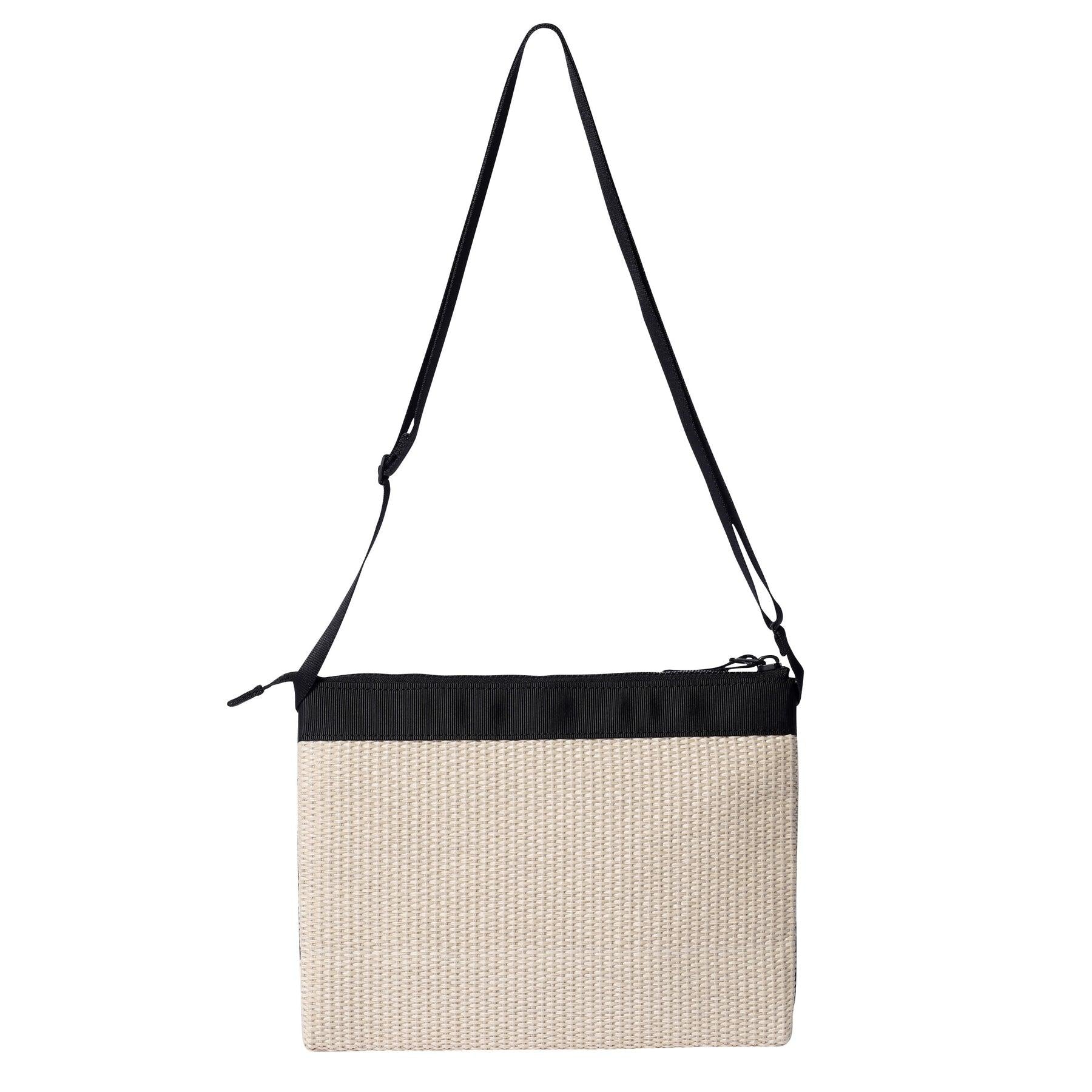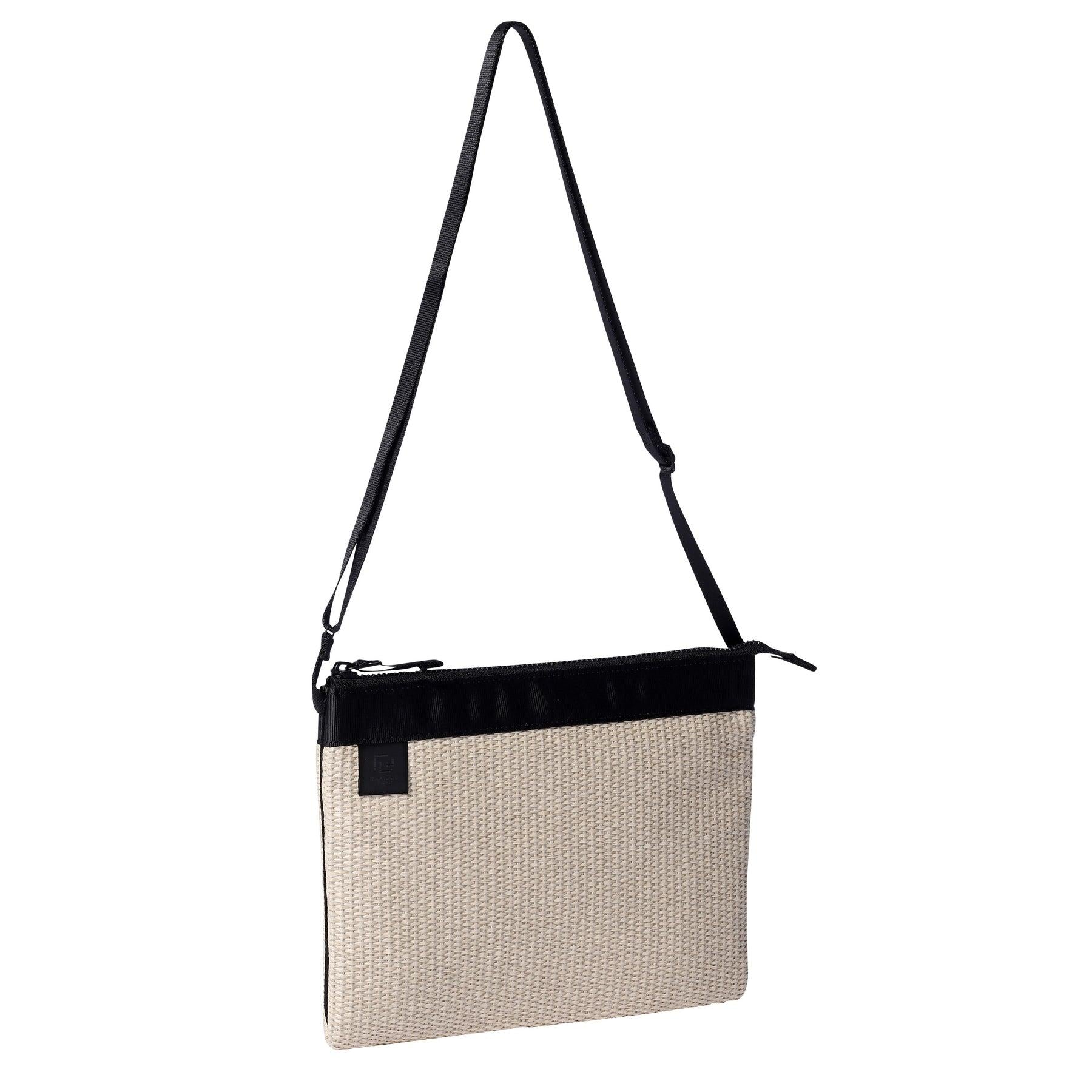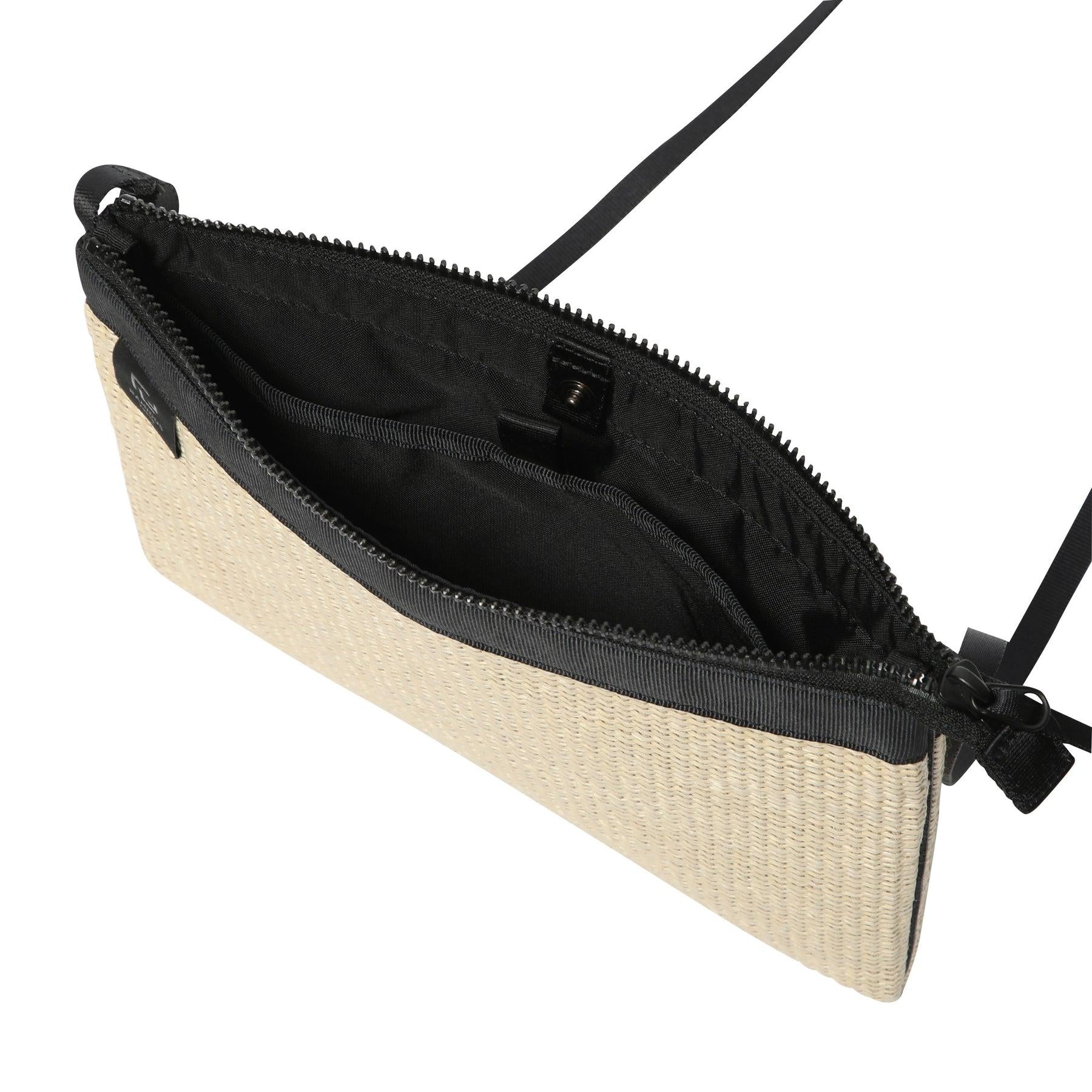 這是一款可橫向放置長錢包的袋子。內部設有一個掛鉤口袋,可存放小件物品。外觀簡潔大方,搭配協調,適用於各種場合。採用棉和人造絲與尼龍交織的混合材料製成。該系列手袋輕便耐用,同時再現了天然稻草材料的質感和外觀。