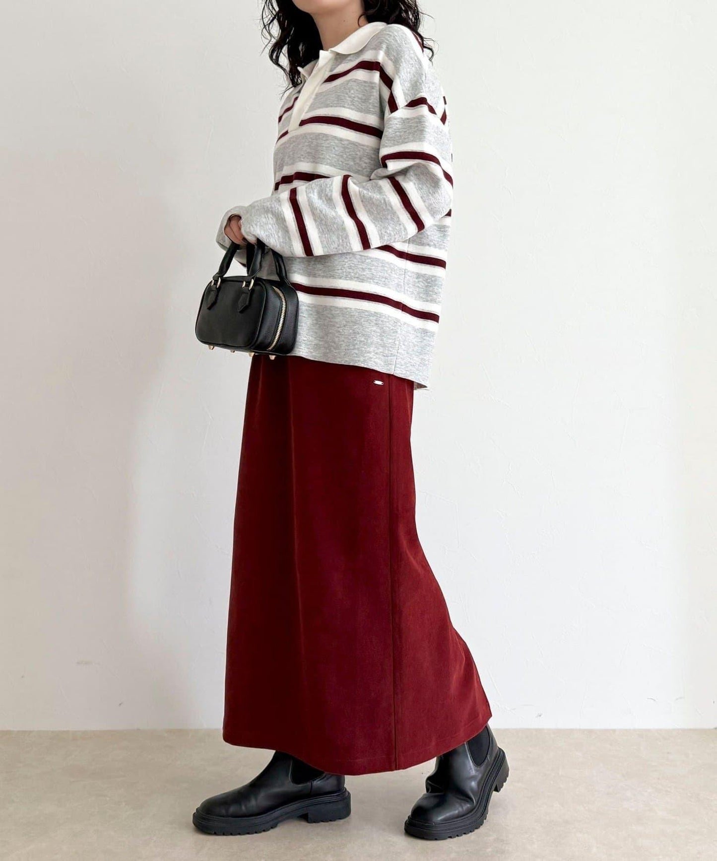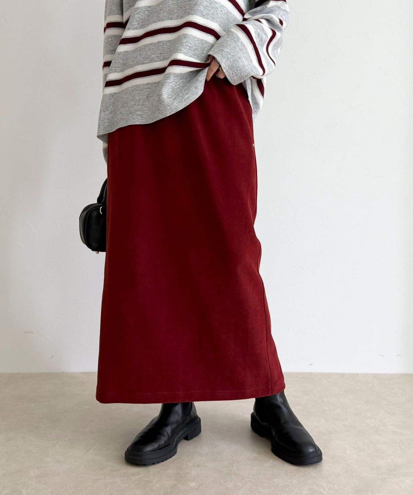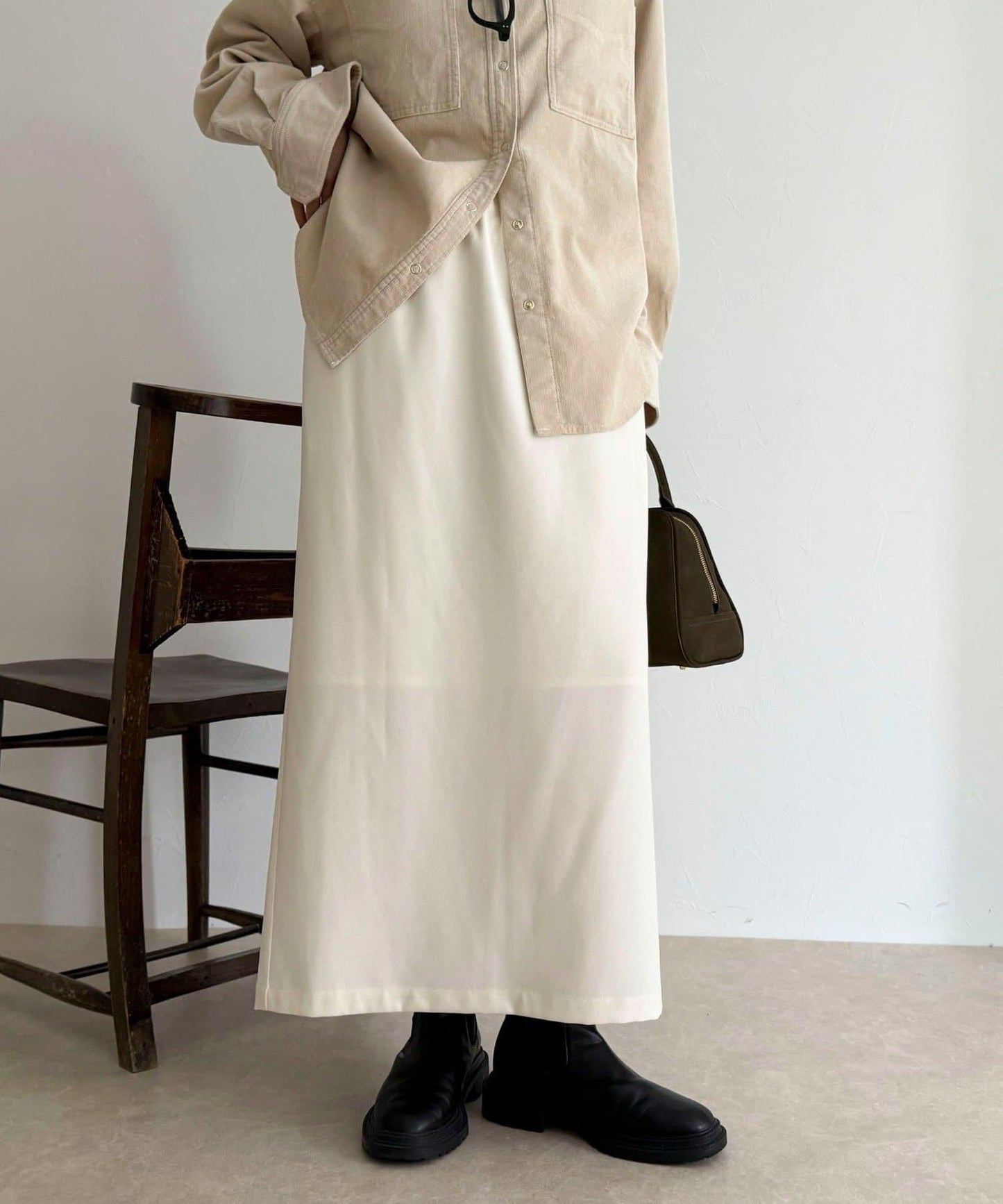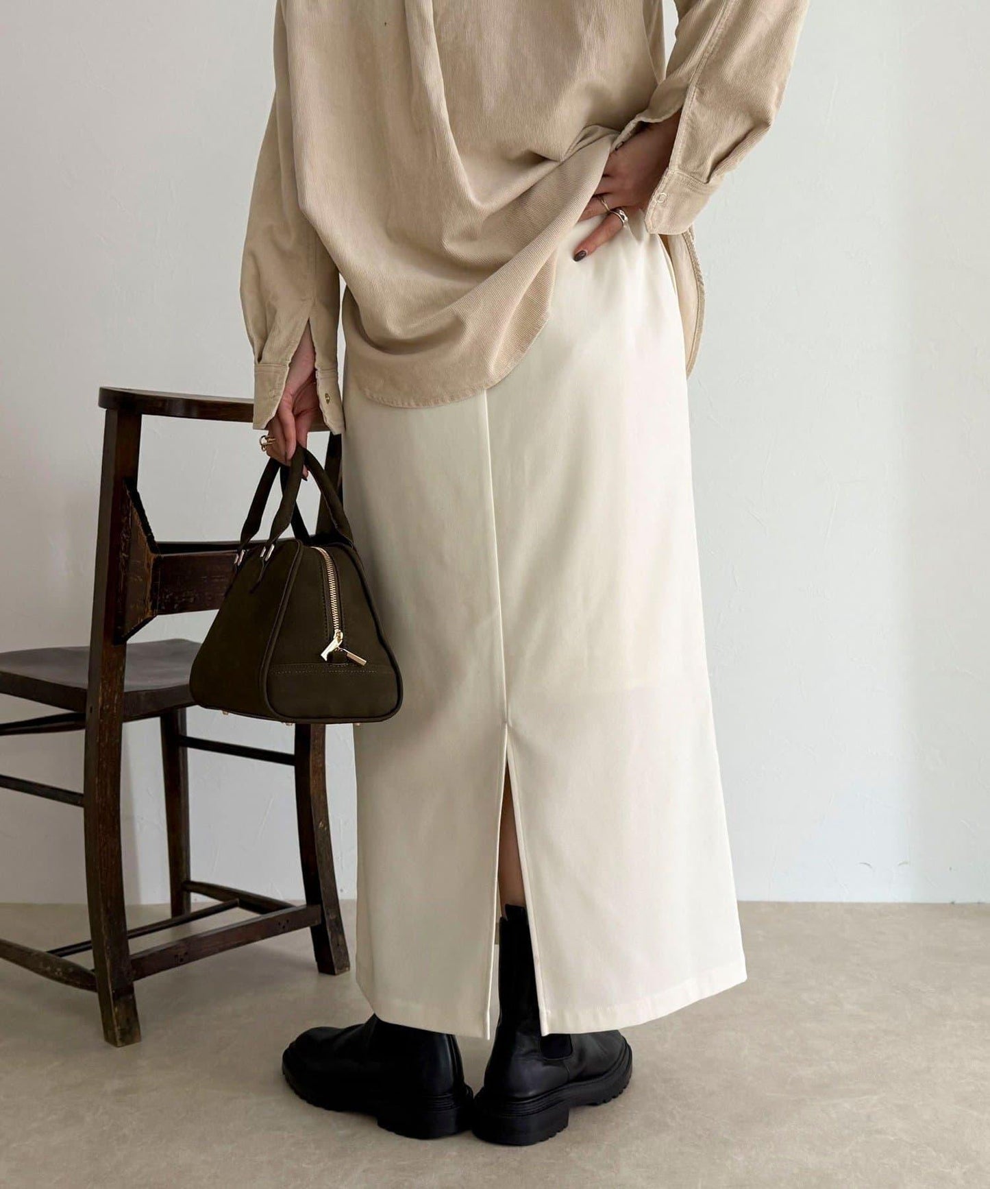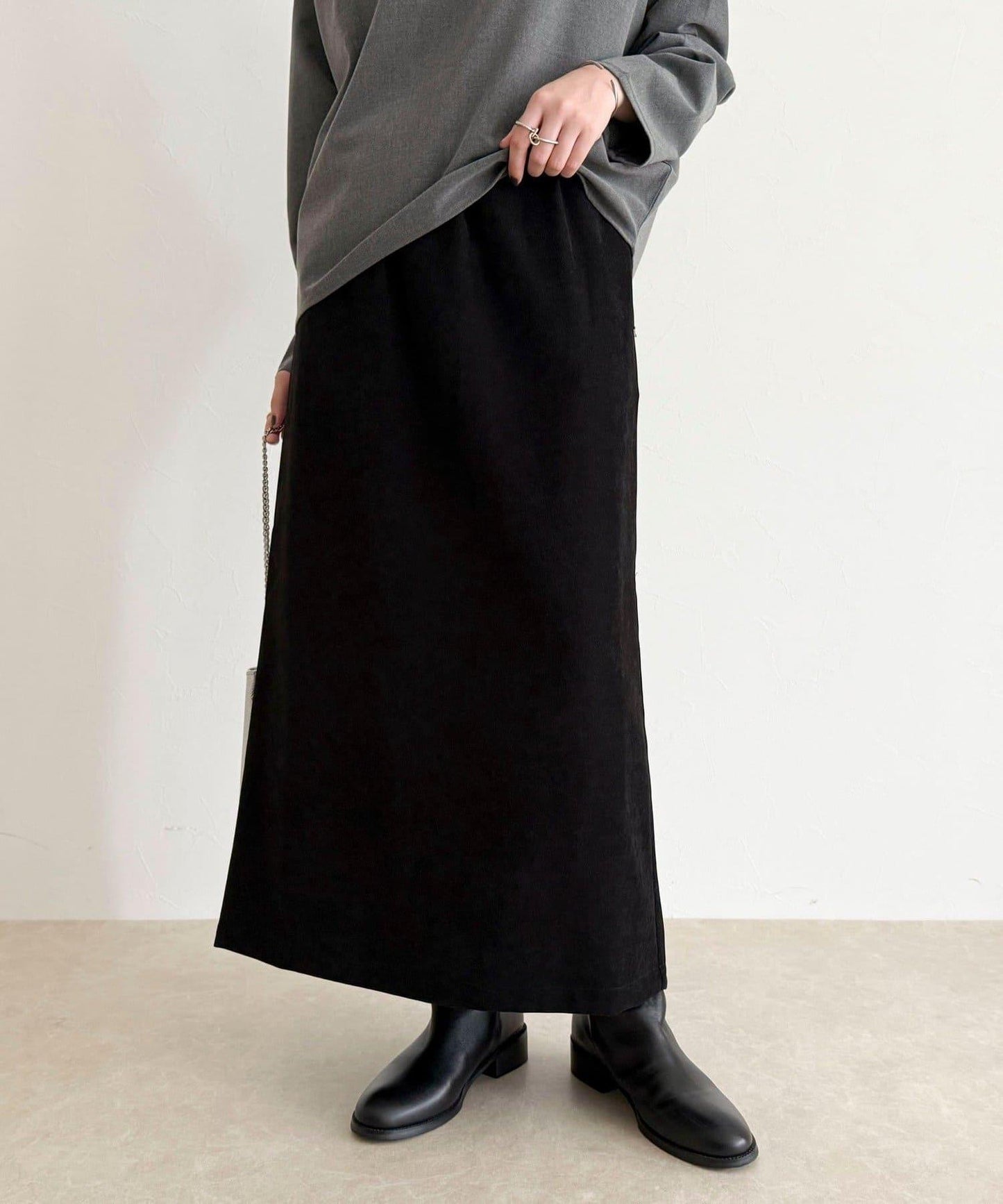 身高 156 厘米的工作人員(穿 38 號):長度剛好露出腳踝,與靴子和高跟鞋都很搭配。腰部的鬆緊設計讓人感覺舒適,但也不會顯得過於臃腫,看起來整潔大方!面料柔軟而有彈性,活動自如也是◎因為廓形優美,是一款無論是通勤還是假日外出都很方便的裙子!
