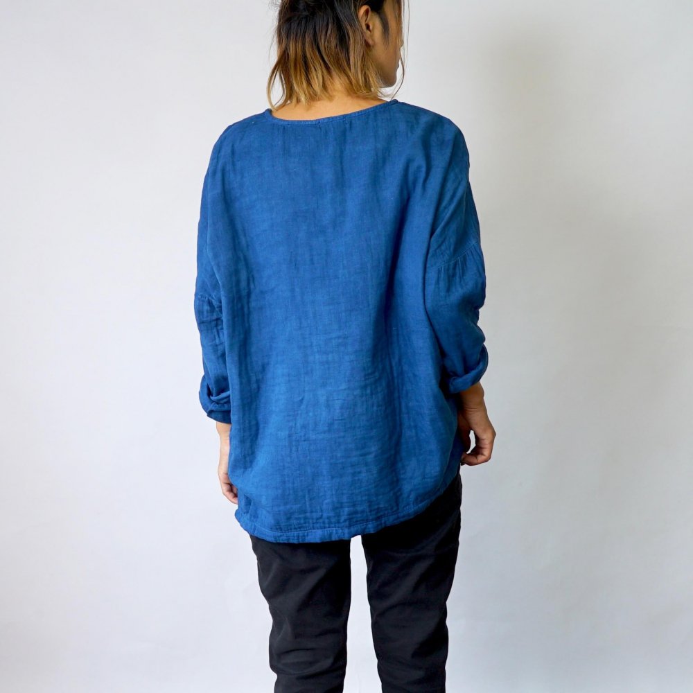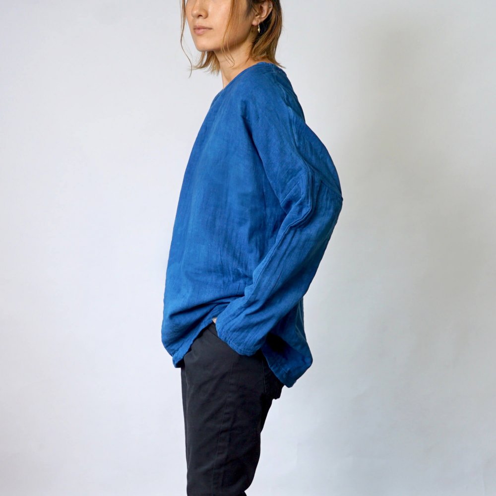 ,棉花的紋理保持完好,黑色的棉渣也沒有漂白。剛織成的布料直接從織布機上買來,在熱水中慢慢浸泡軟化,因此與植物染料的柔和色澤相得益彰,並有一種自然、蓬鬆、皺褶的味道。