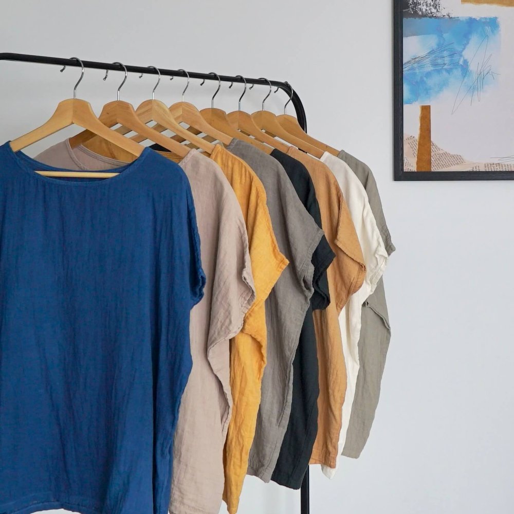 棉的質感由於沒有經過漂白,黑色的棉渣保持原樣。此外,新織成的織物直接從織布機上購買,在熱水中慢慢浸泡,使其變軟,因此與植物染料的柔和色彩相匹配,並具有自然、蓬鬆、皺褶的味道。