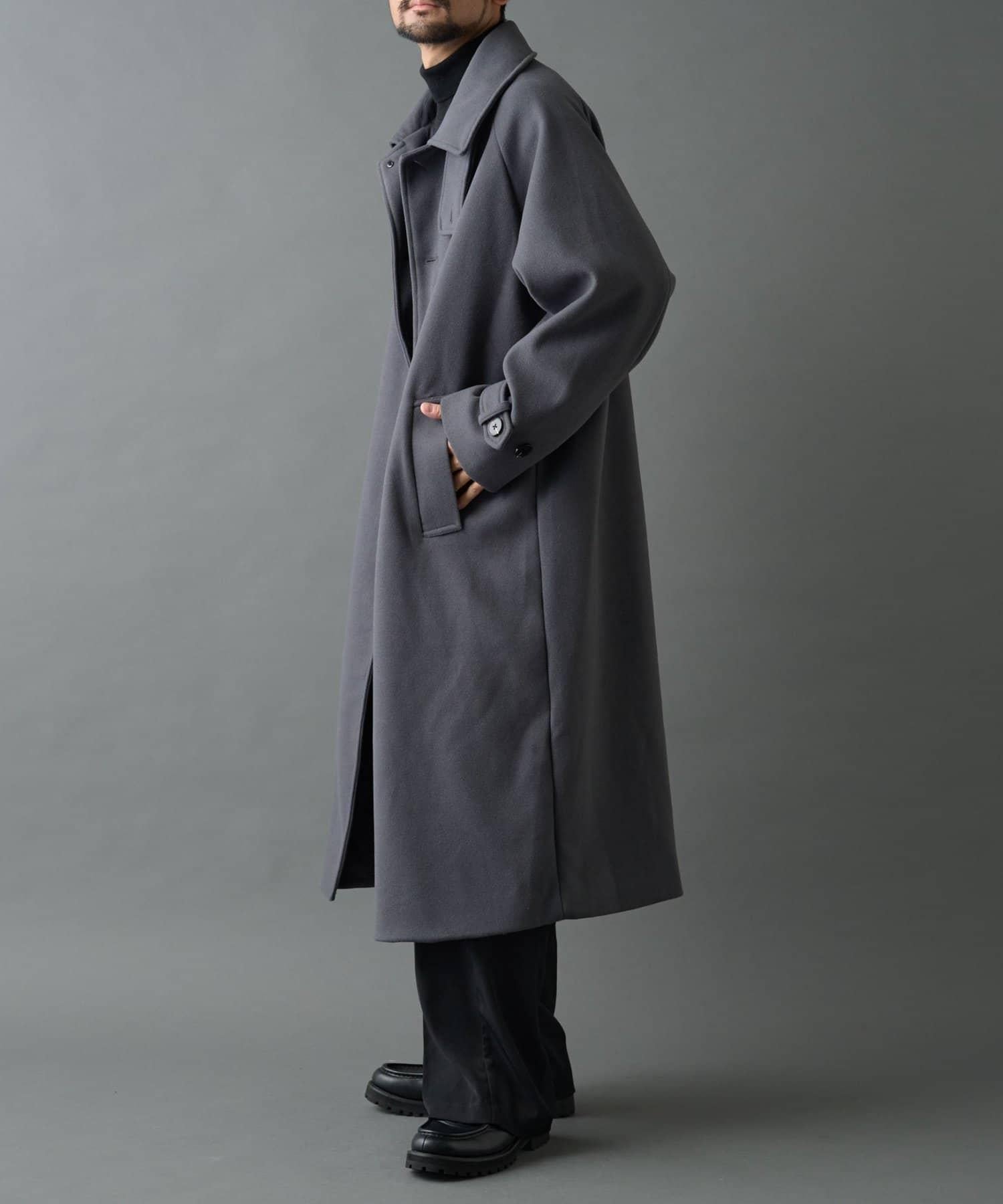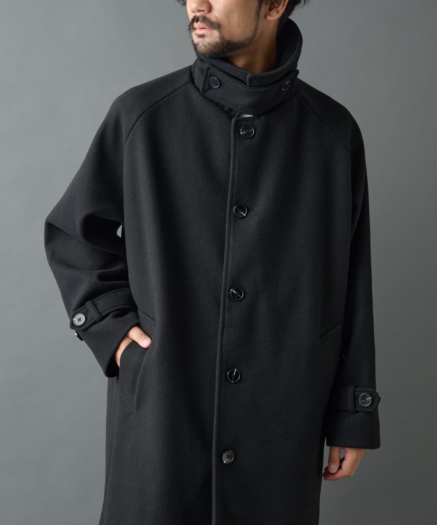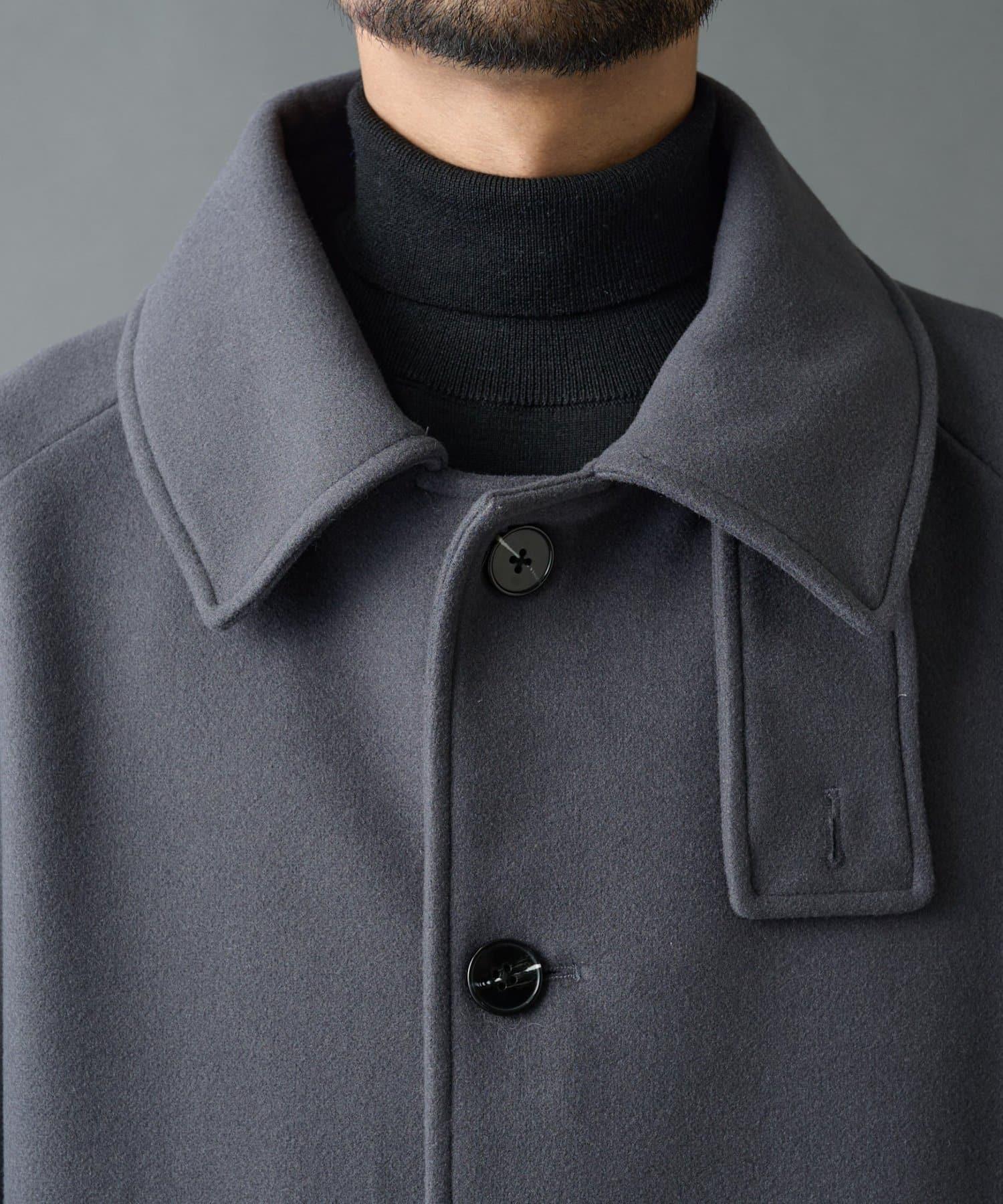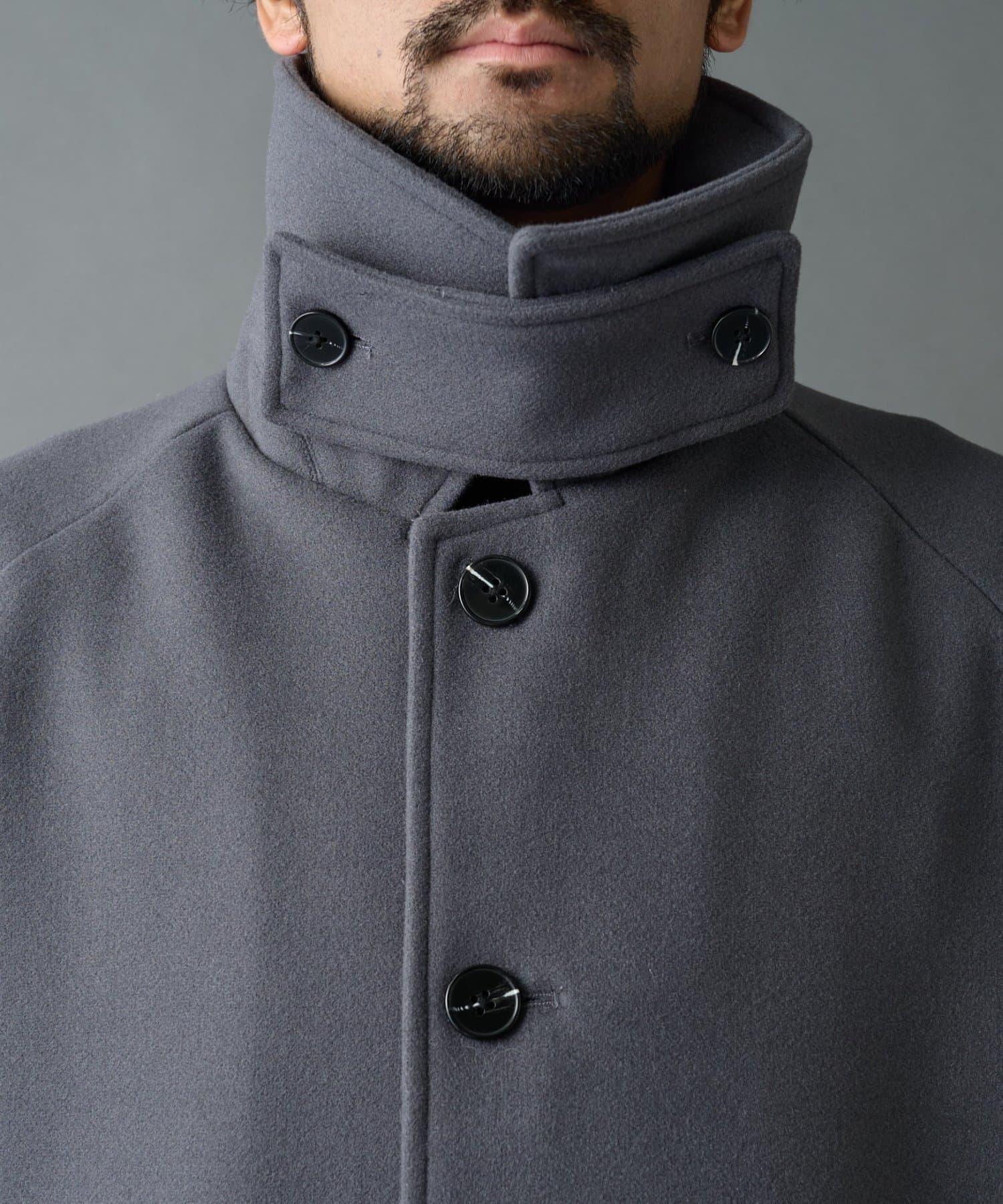 科技羊毛製成的不鏽鋼領長款外套,兼具古典外觀與現代功能。