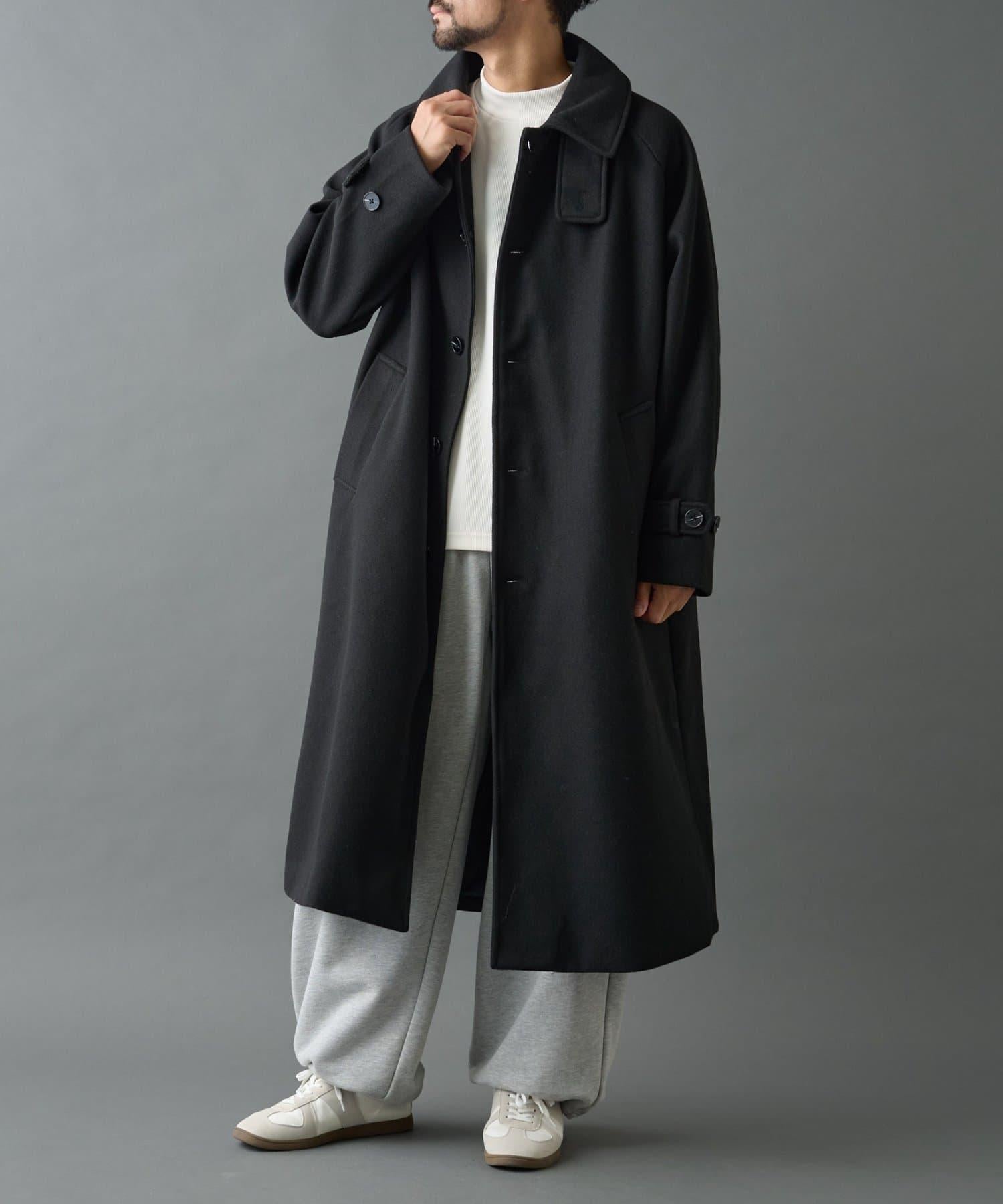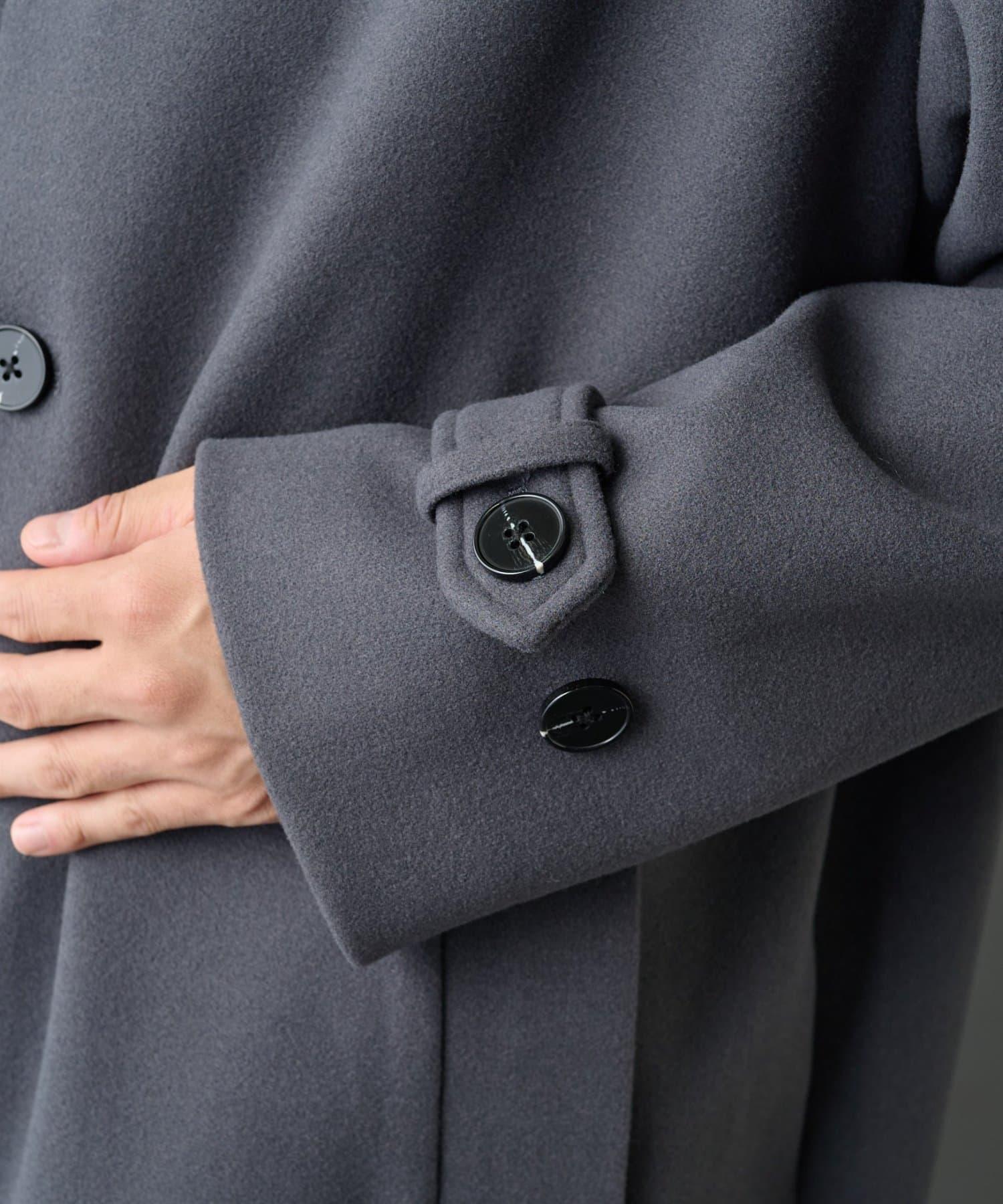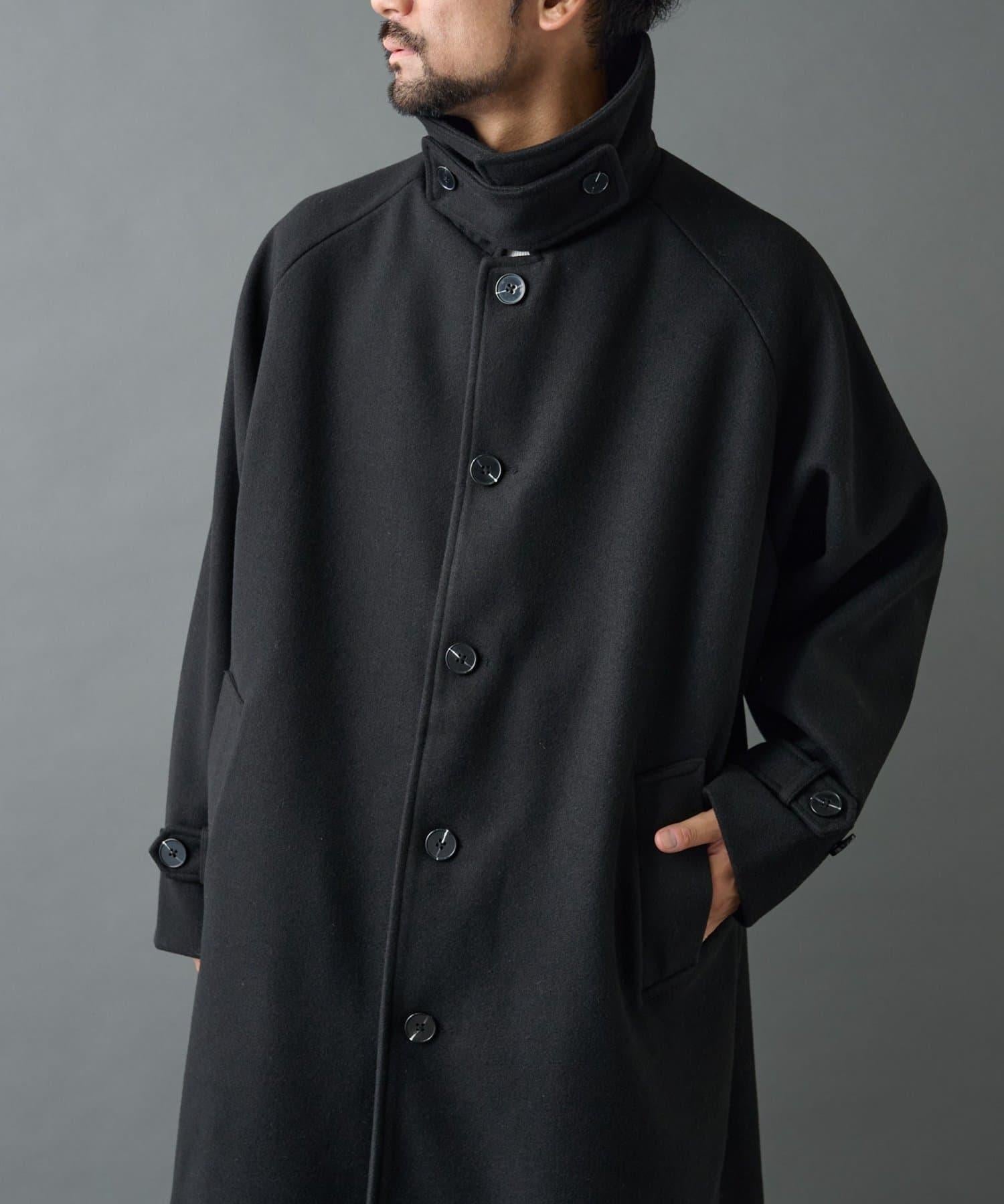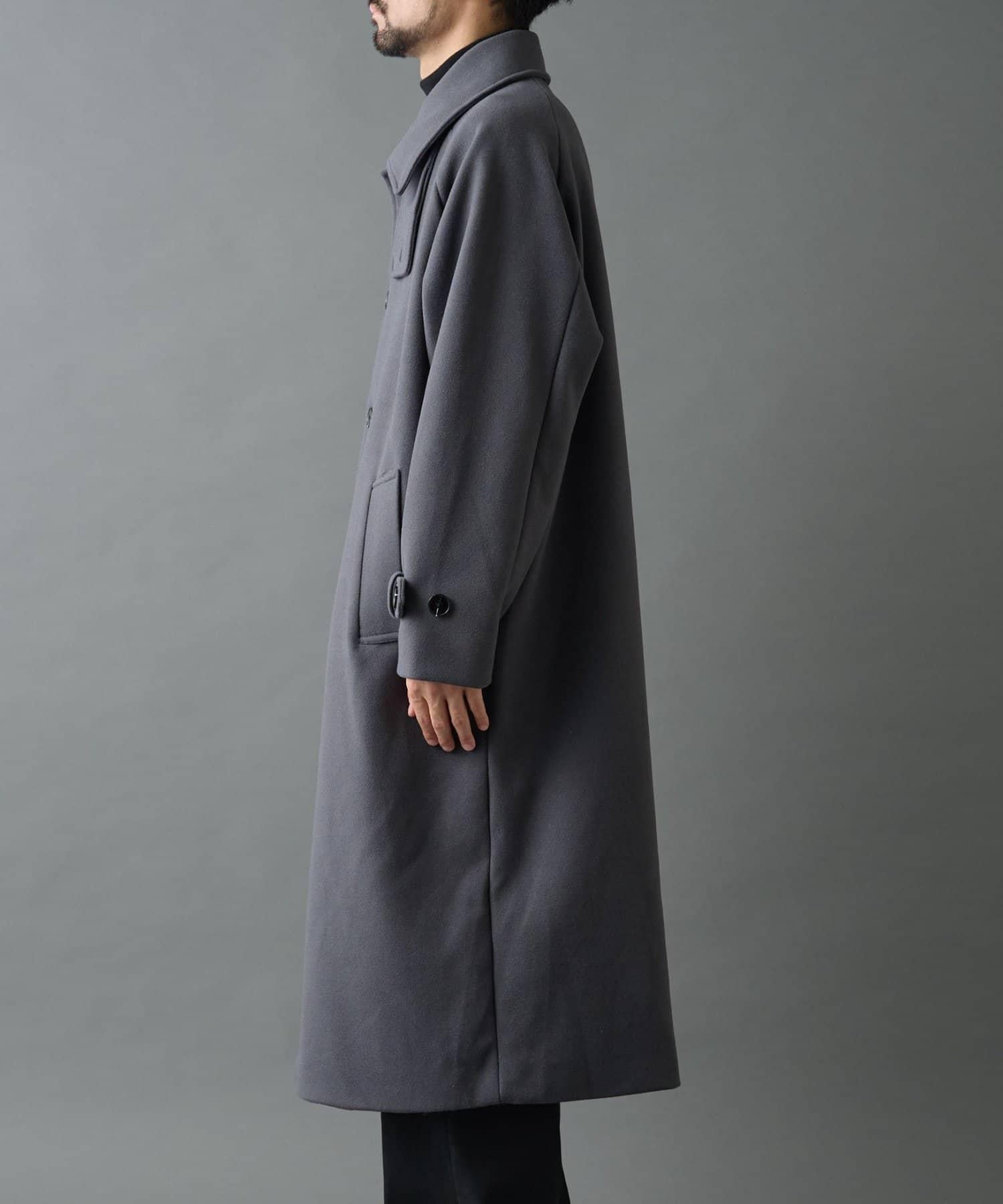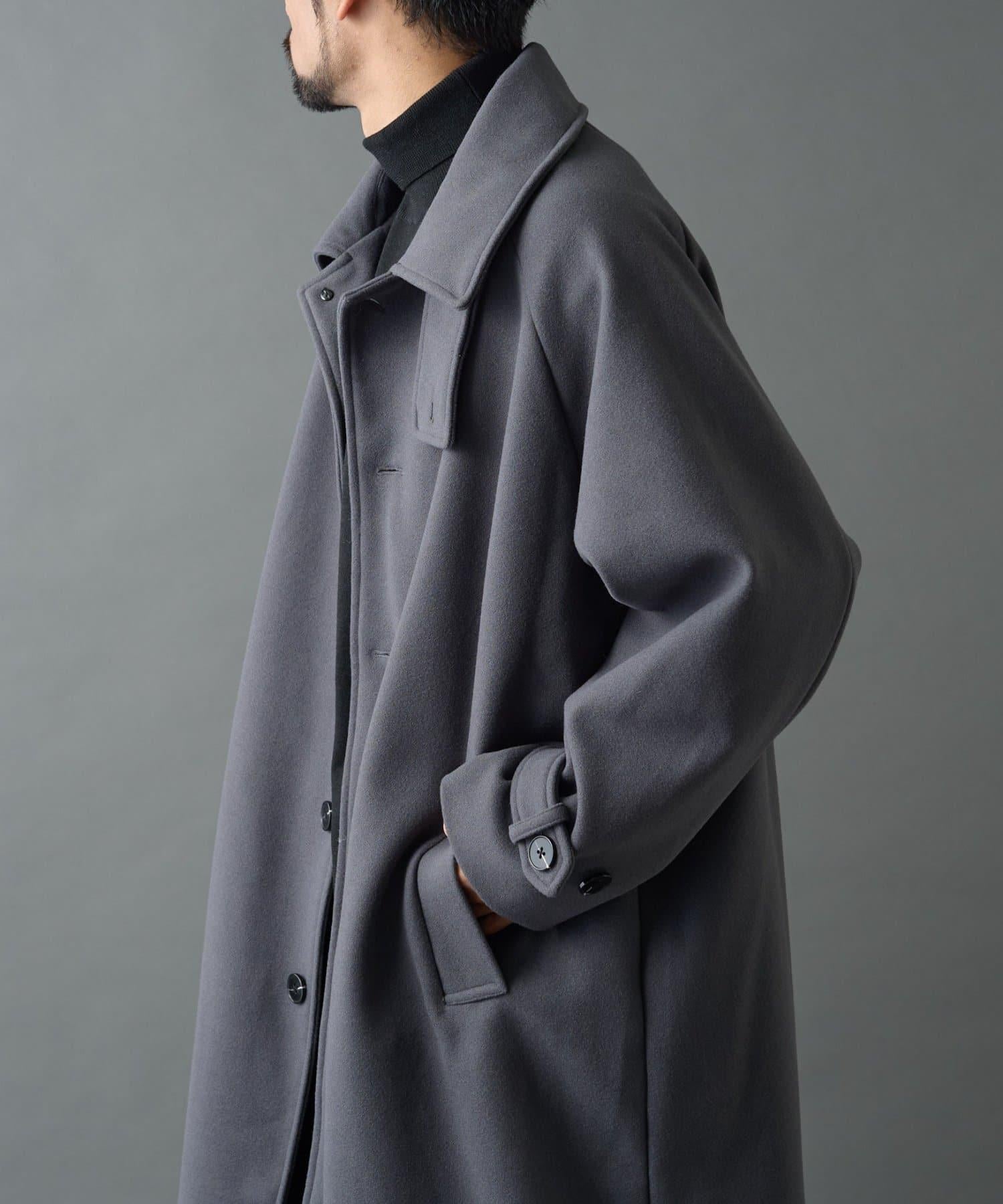 科技羊毛製成的不鏽鋼領長款外套,兼具古典外觀與現代功能。
