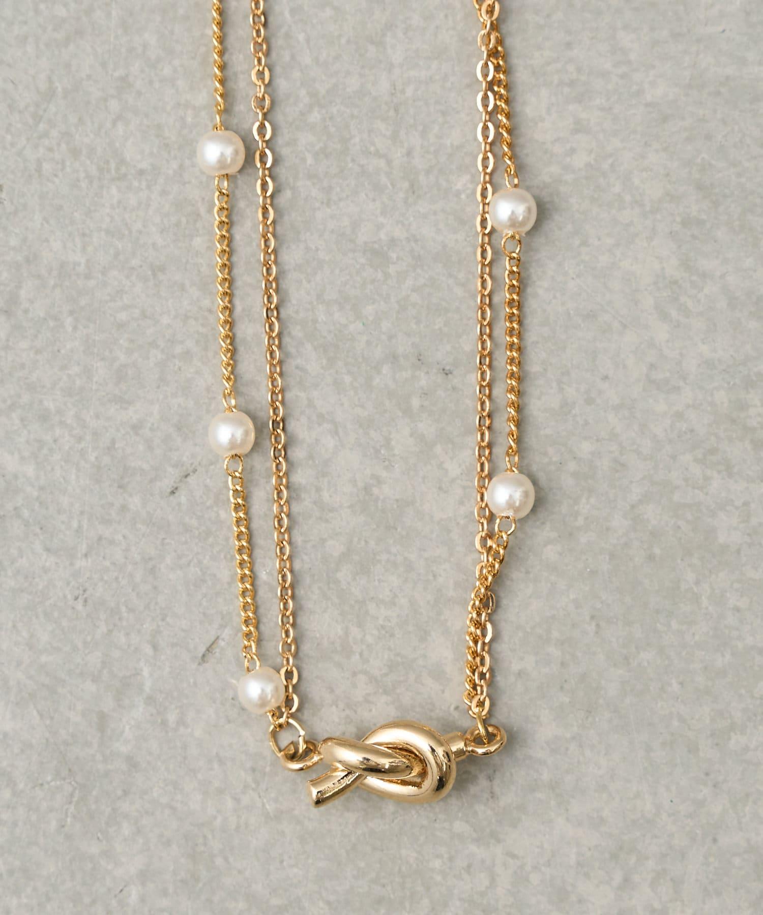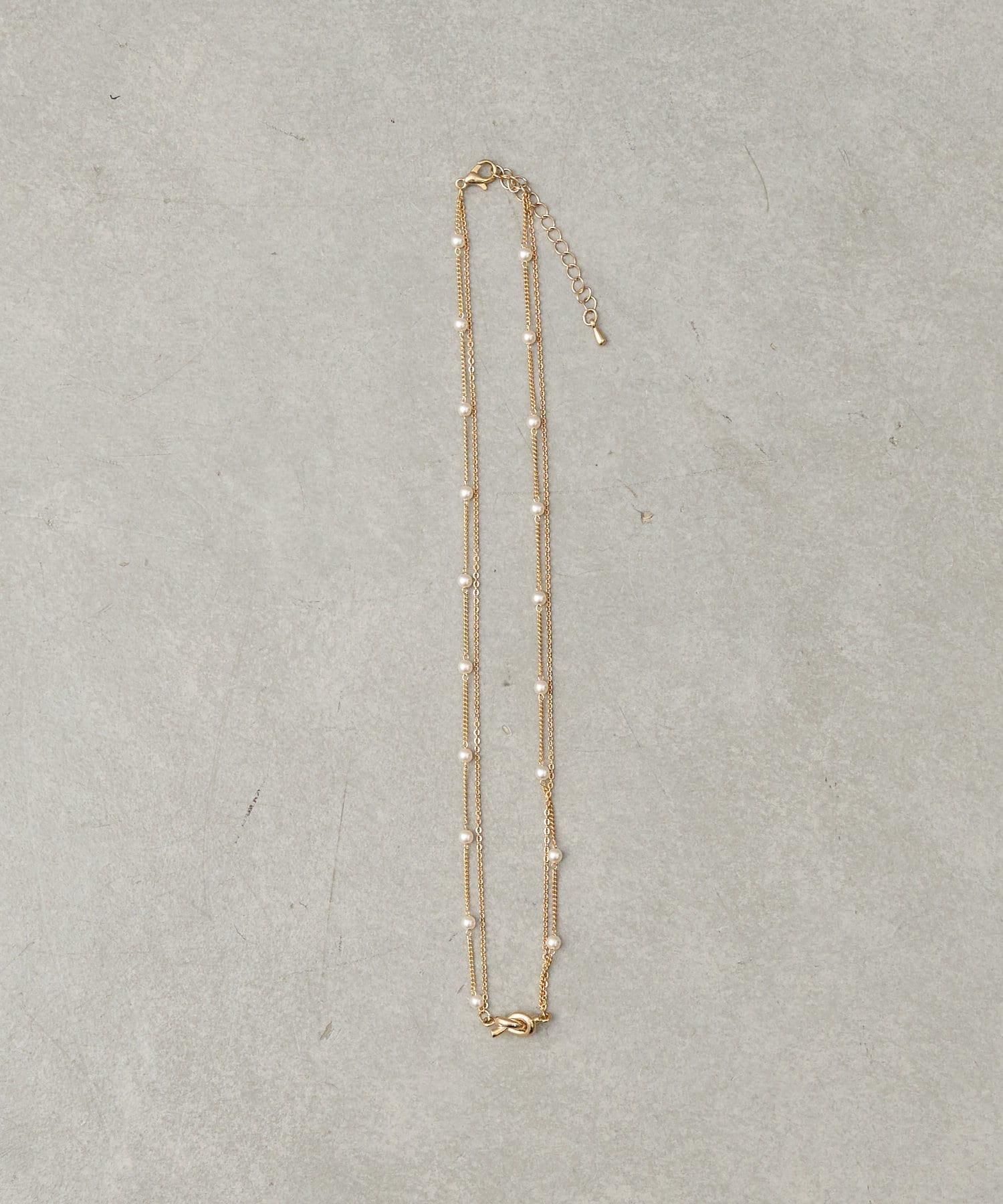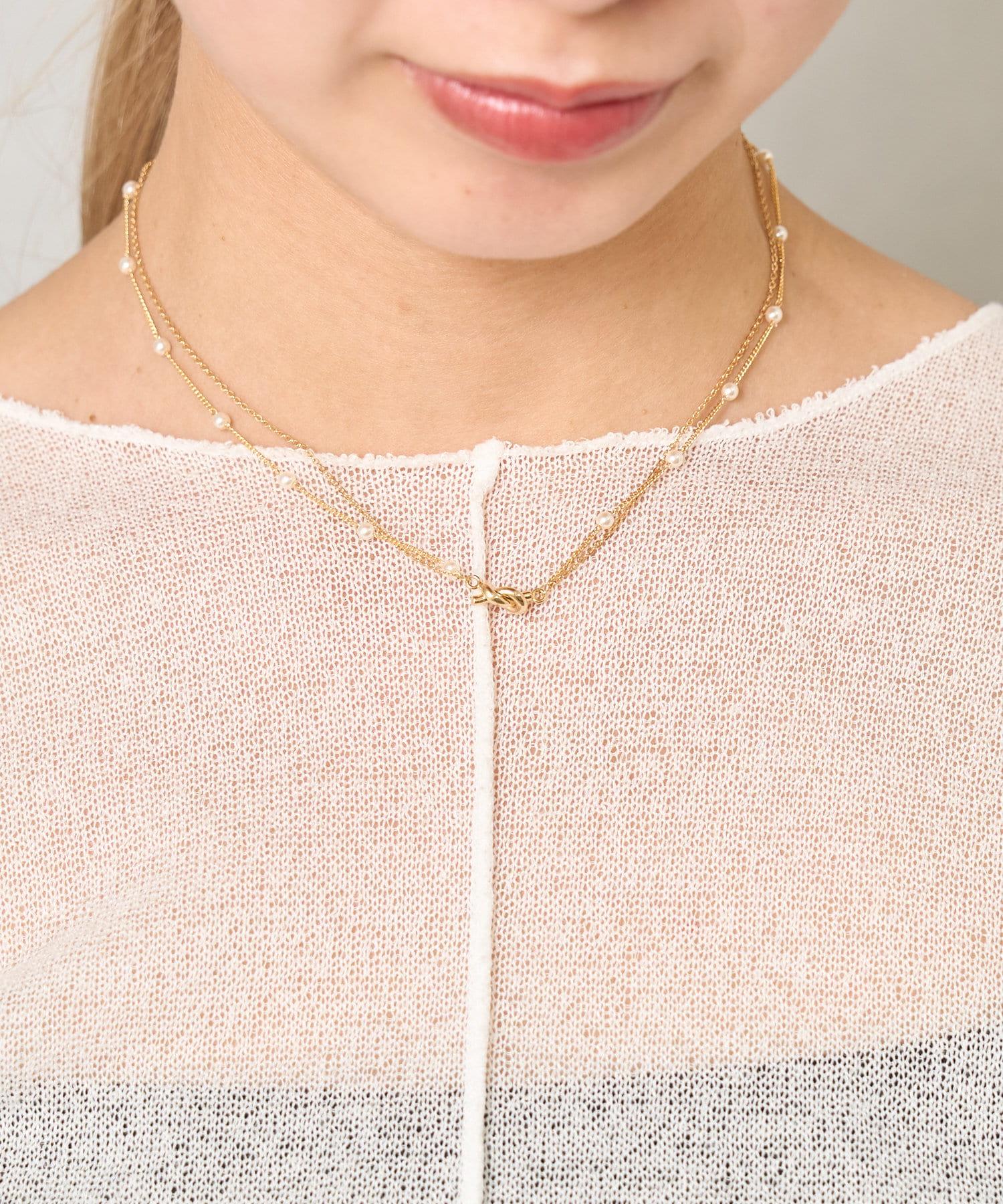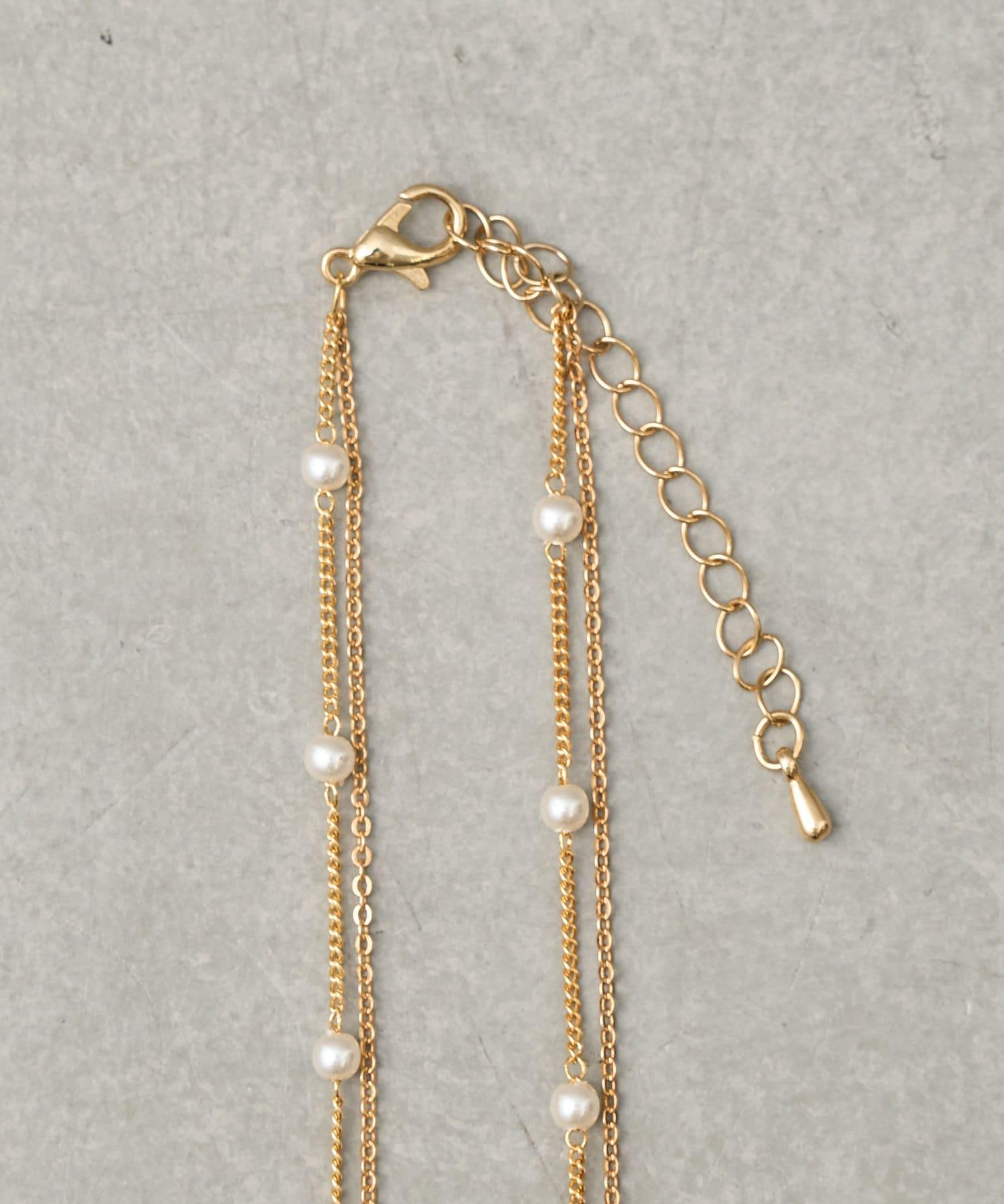 金鍊和珍珠狀部分的項鍊將視線吸引到胸部。