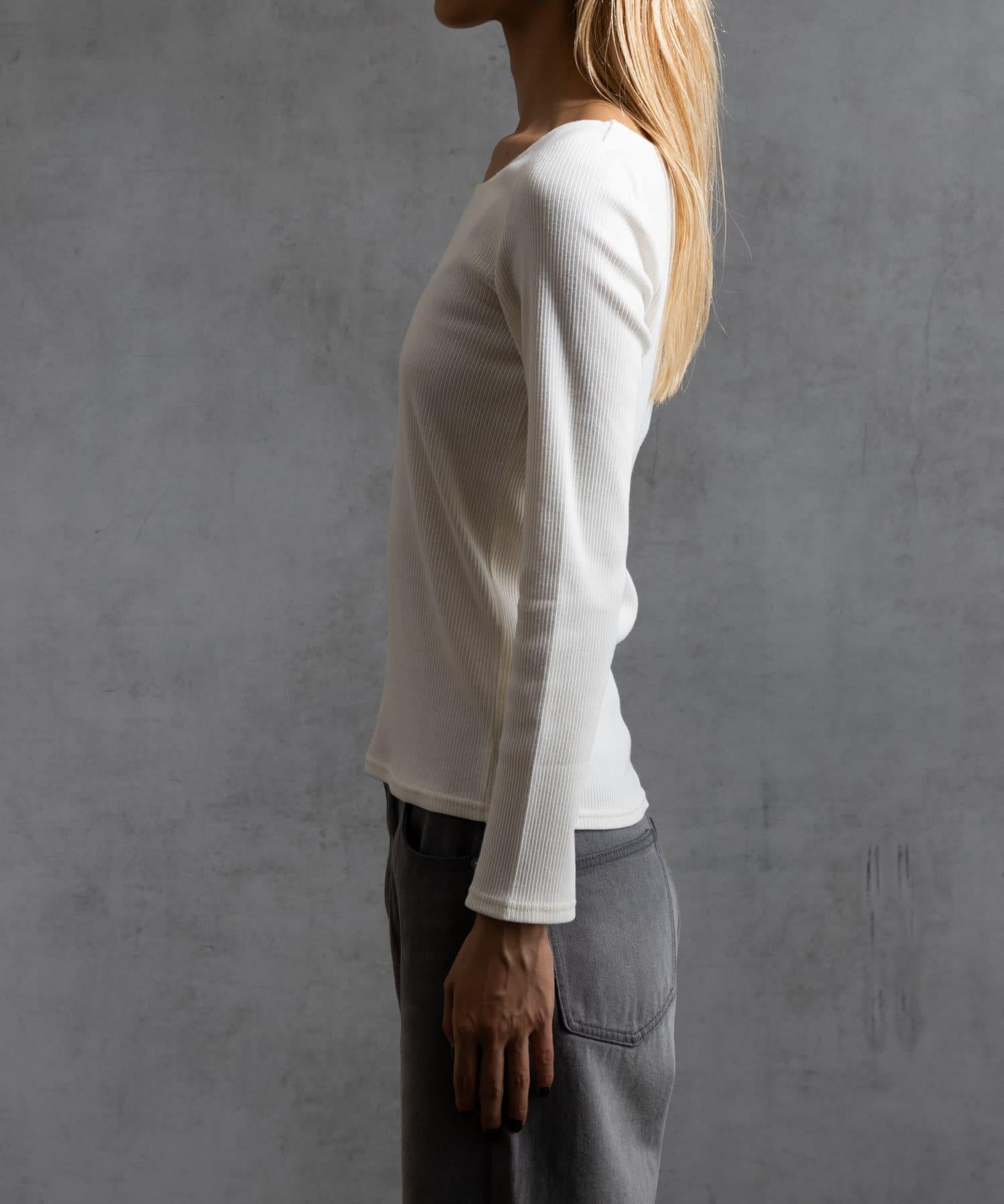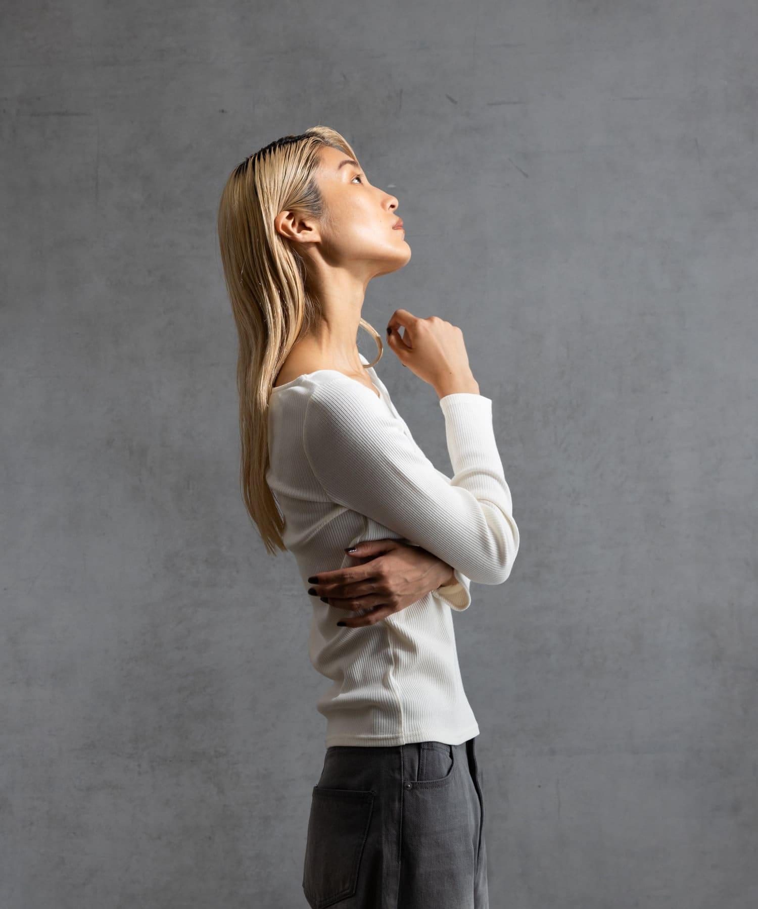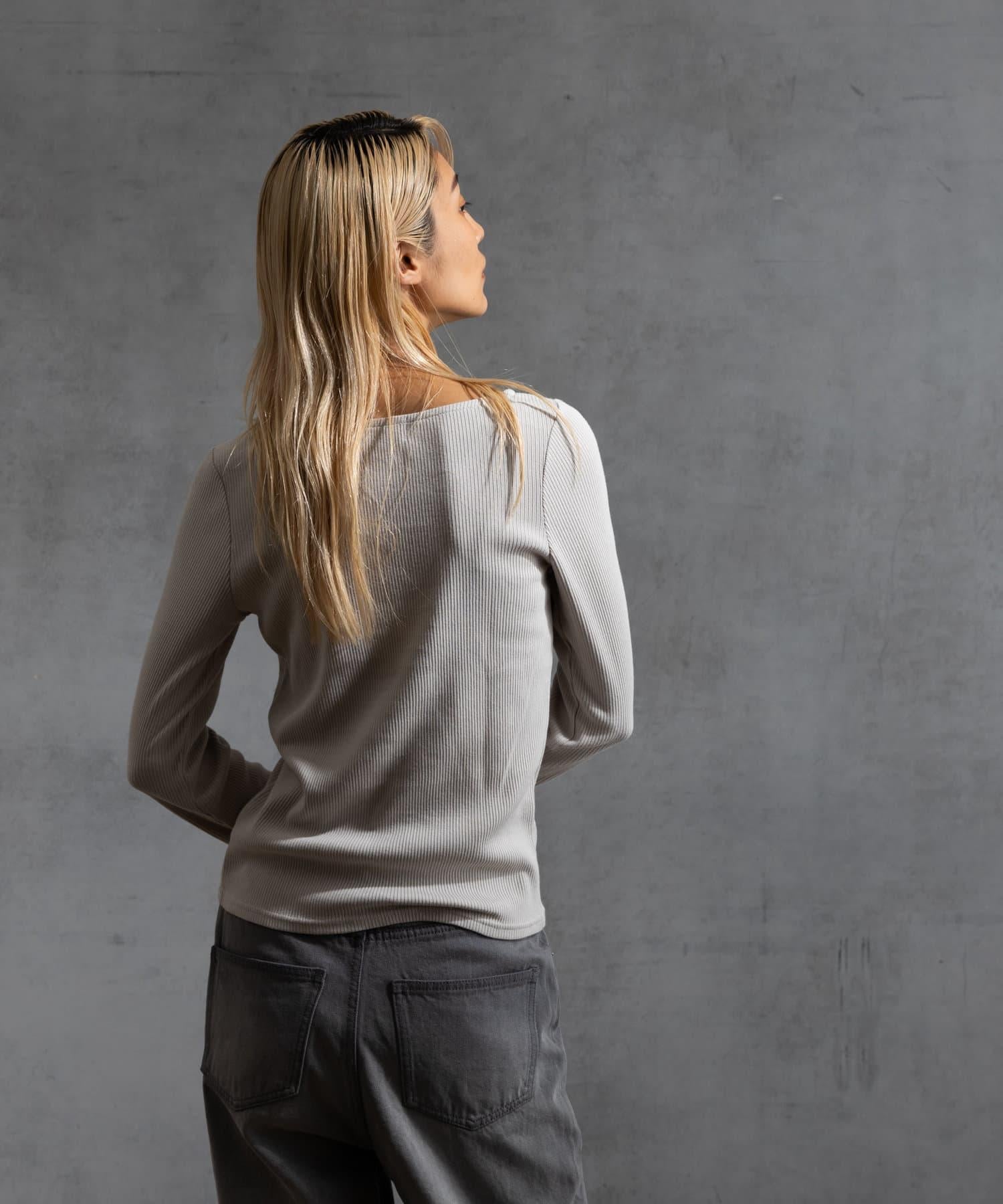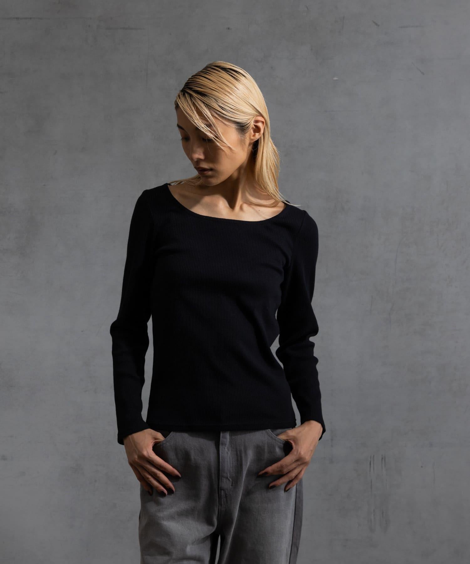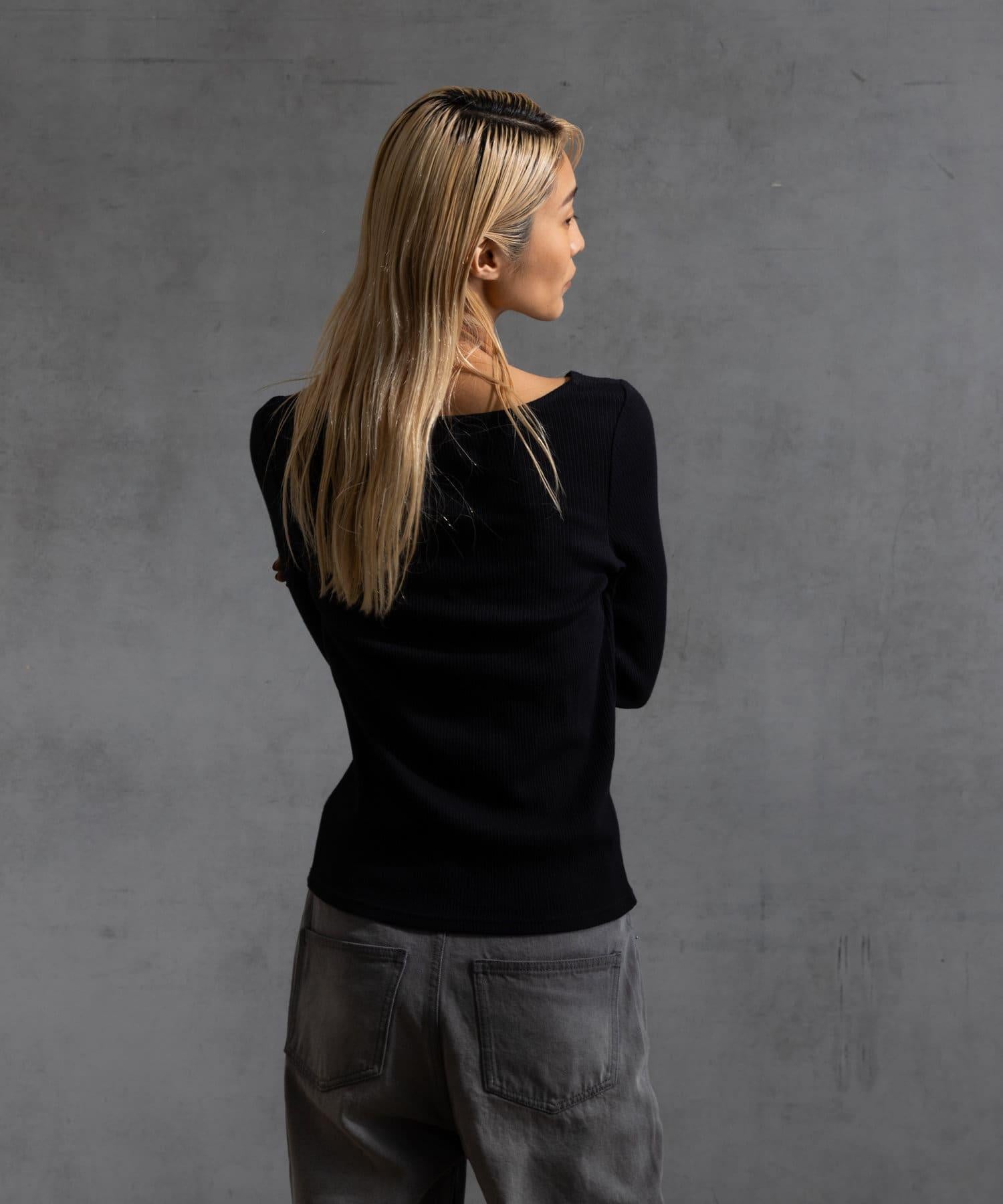 這款方領 T 採用柔軟的紗線編織而成,呈現出微妙的光澤,非常優雅。