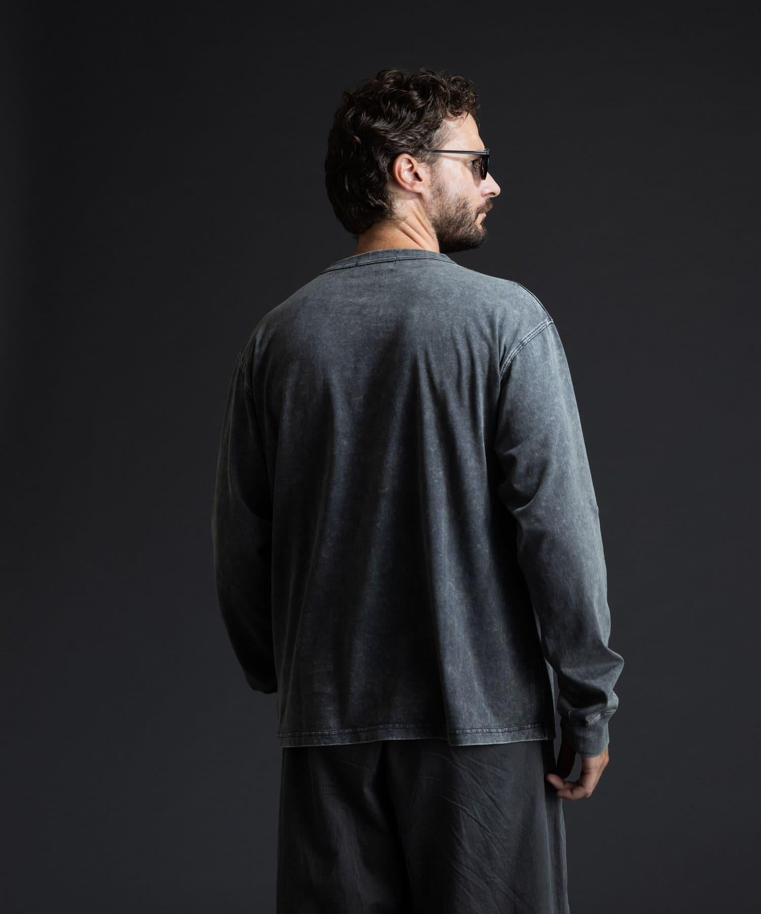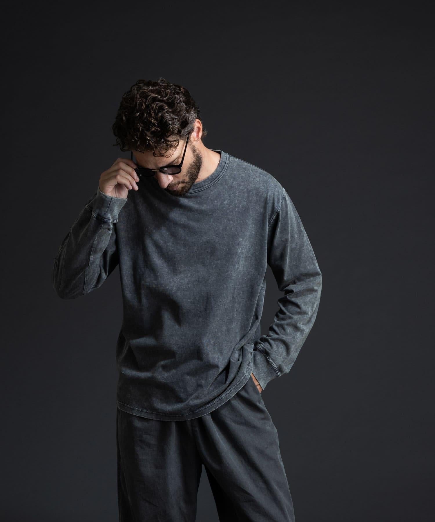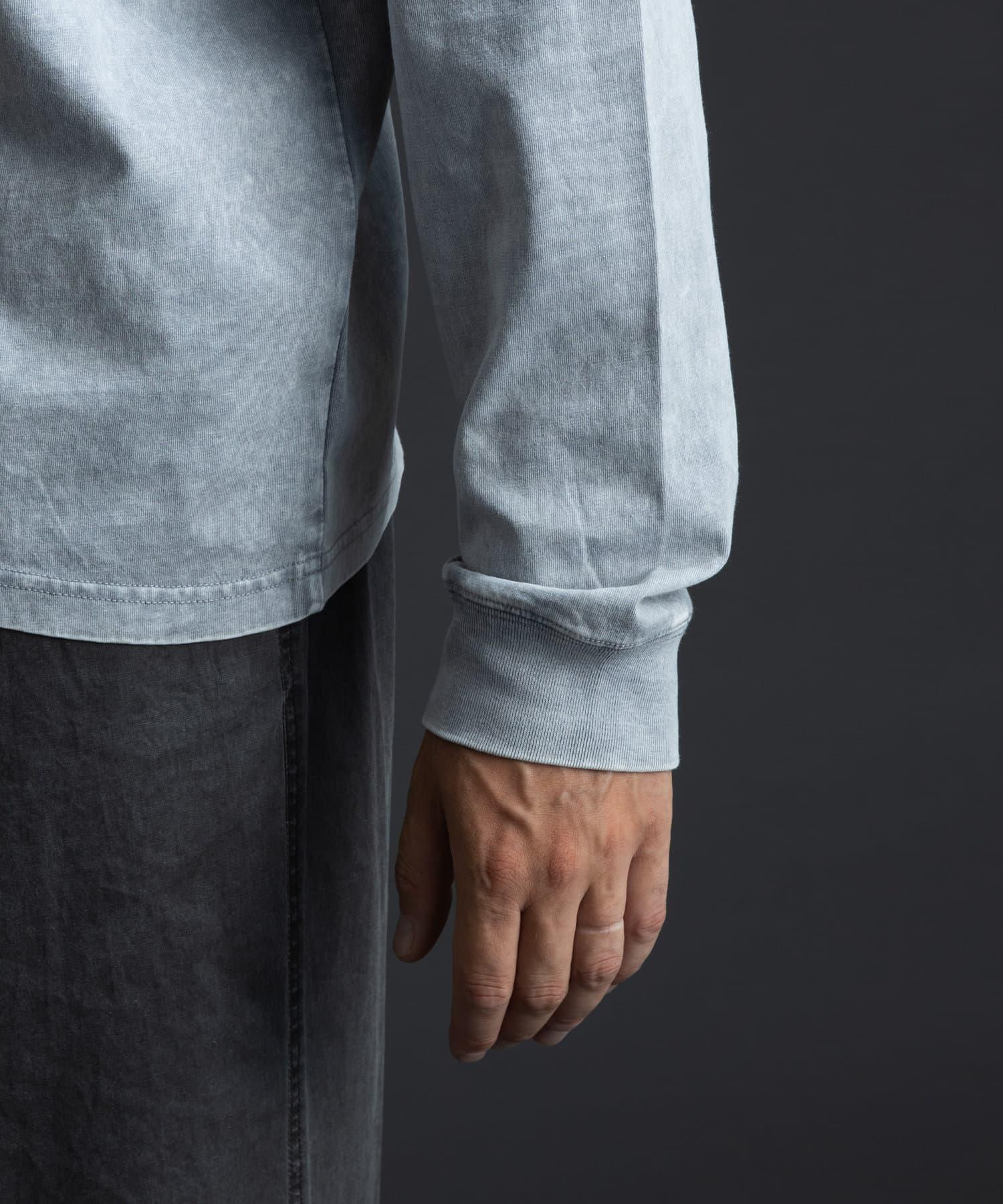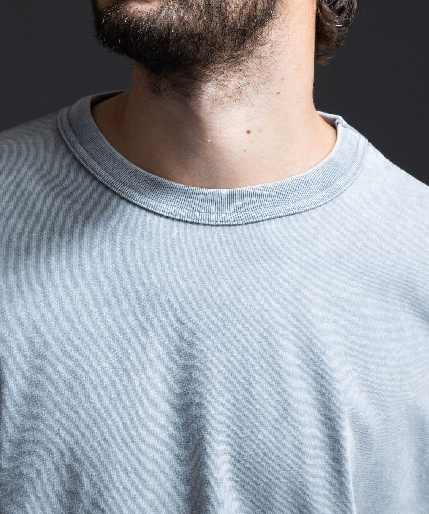 經過硫化染色和粉末處理後,T恤呈現出精緻的褪色和鄉村風格。