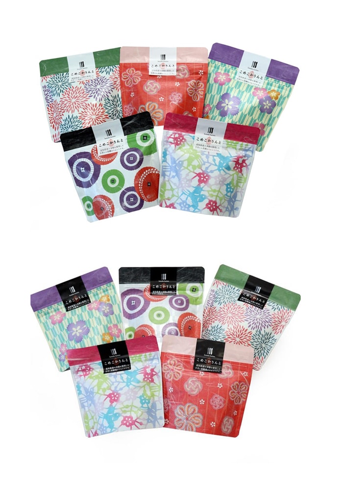 這五袋糖分別裝在一個可愛的日本紙質圖案袋中,是送小禮物的好選擇。