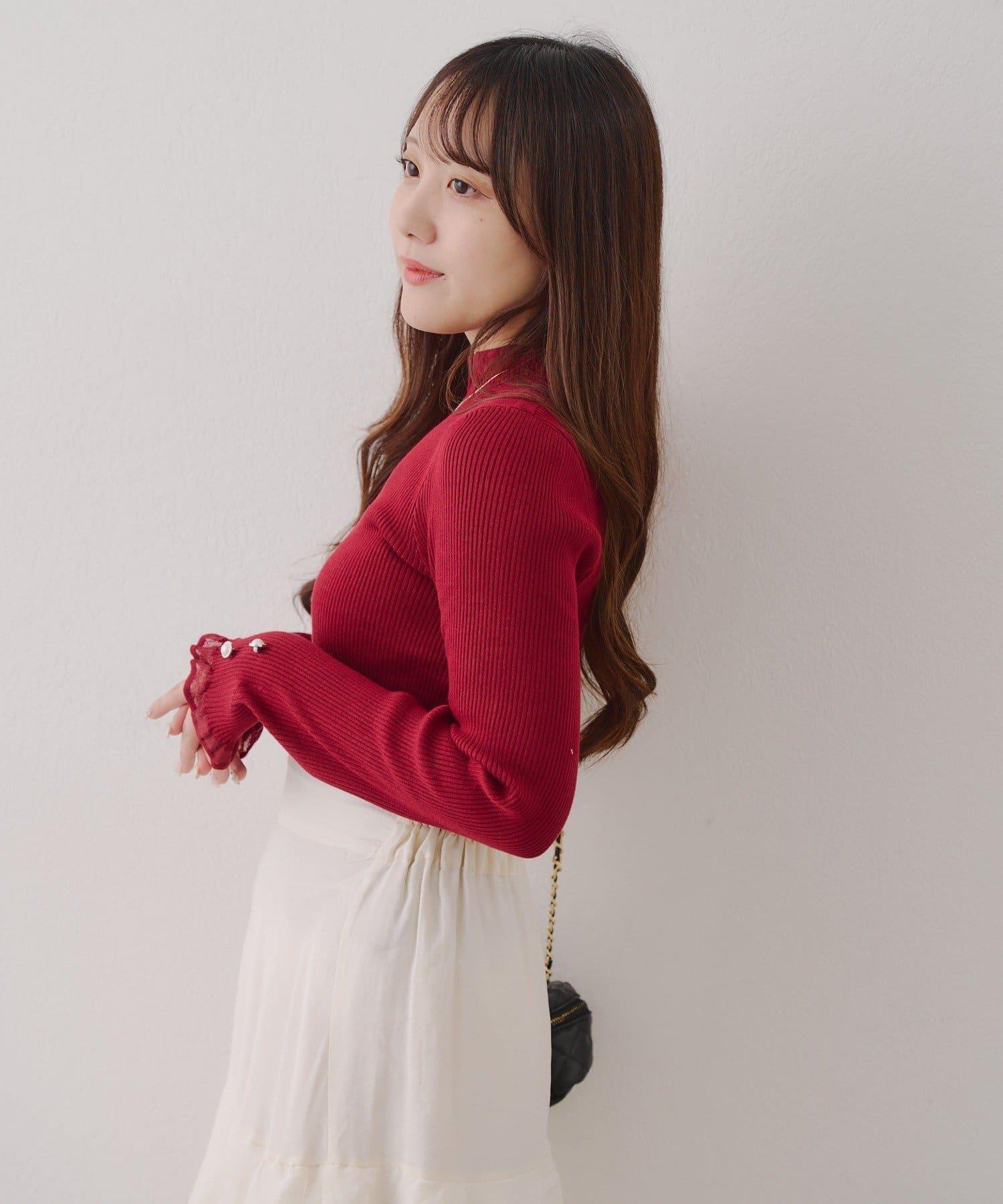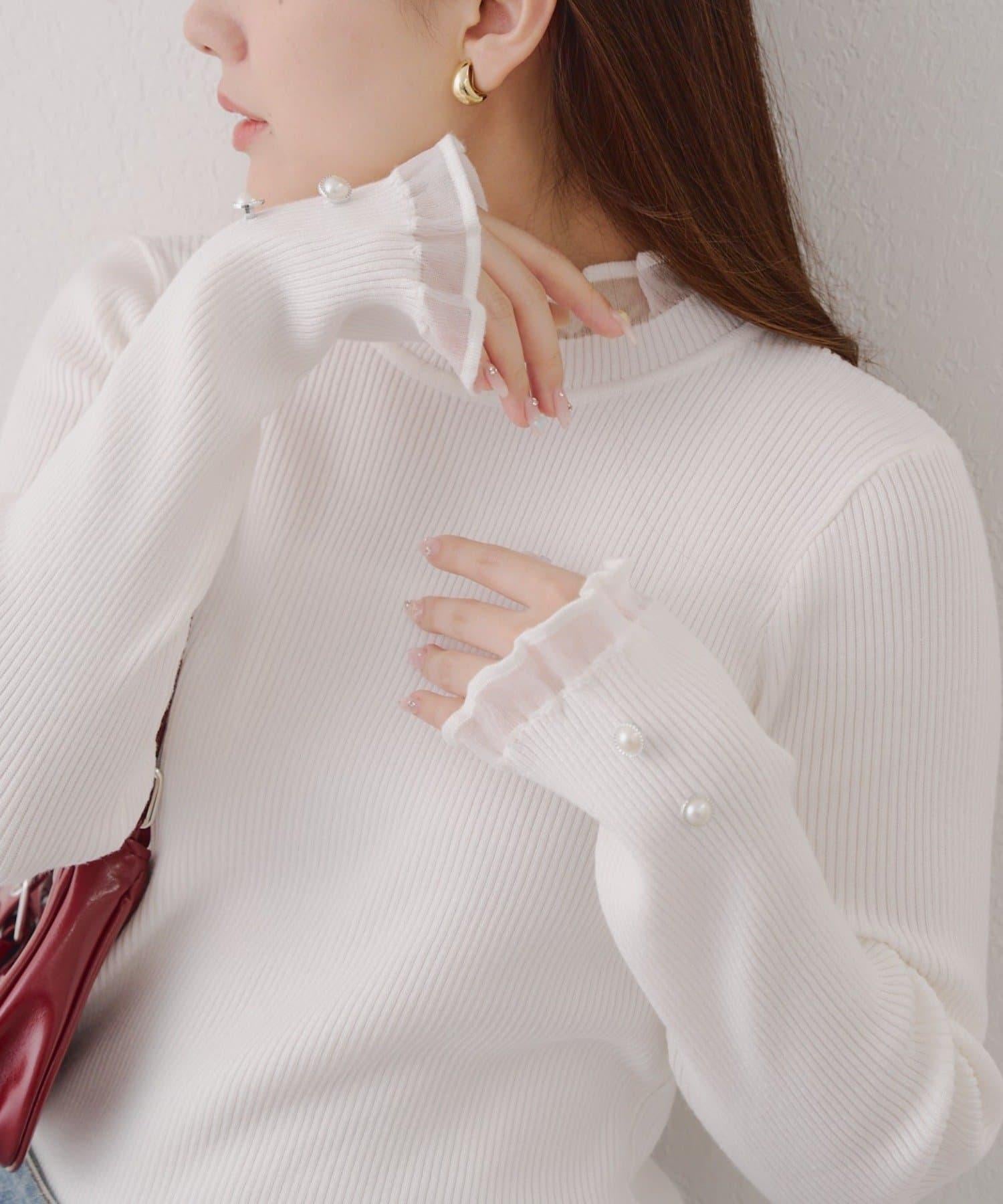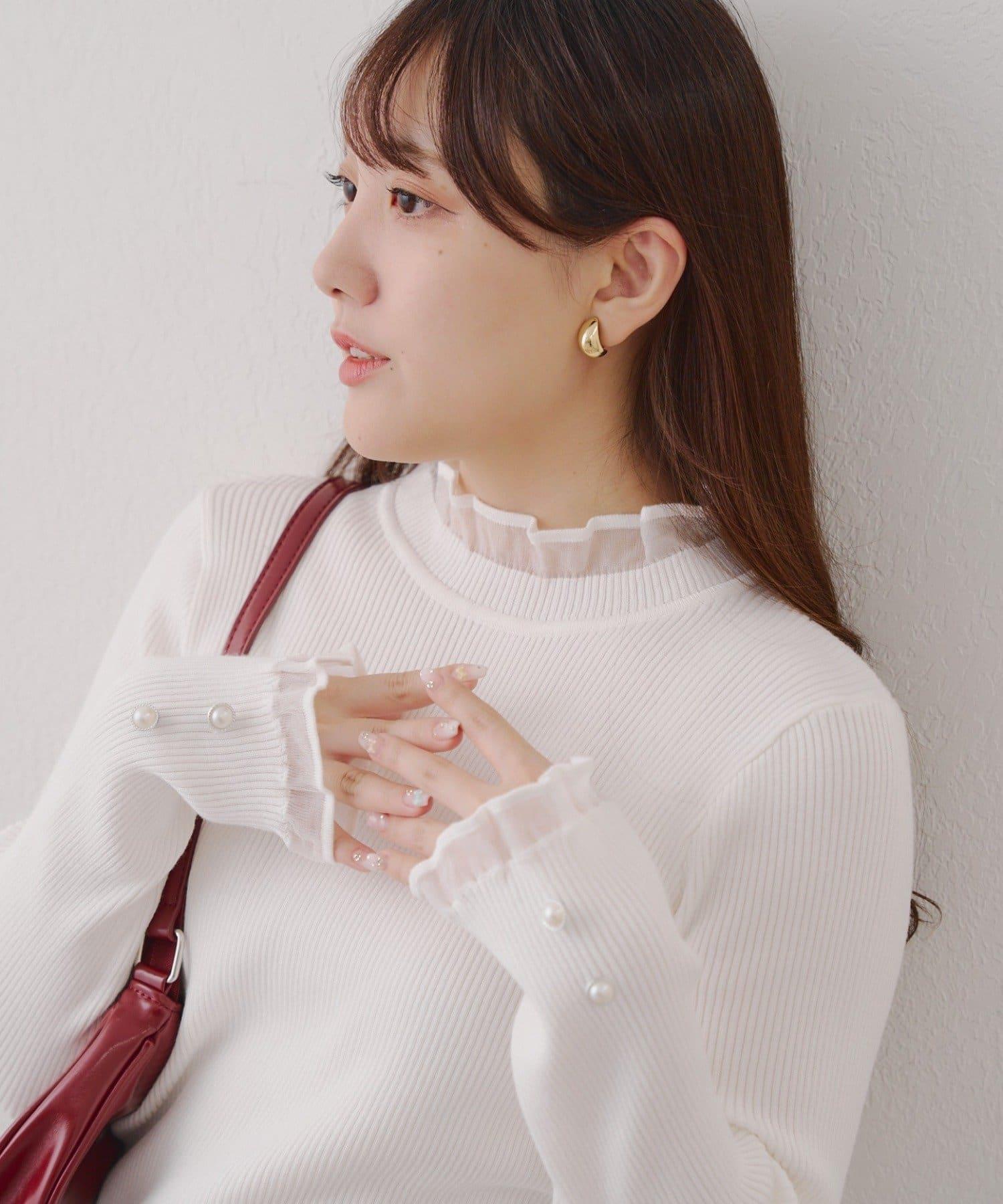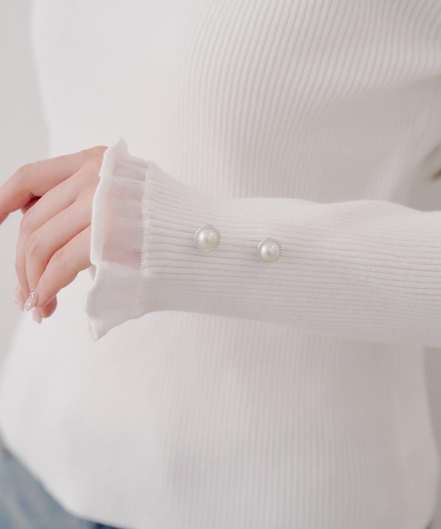 這款針織衫的袖口呈喇叭狀,並配有珠光鈕釦。