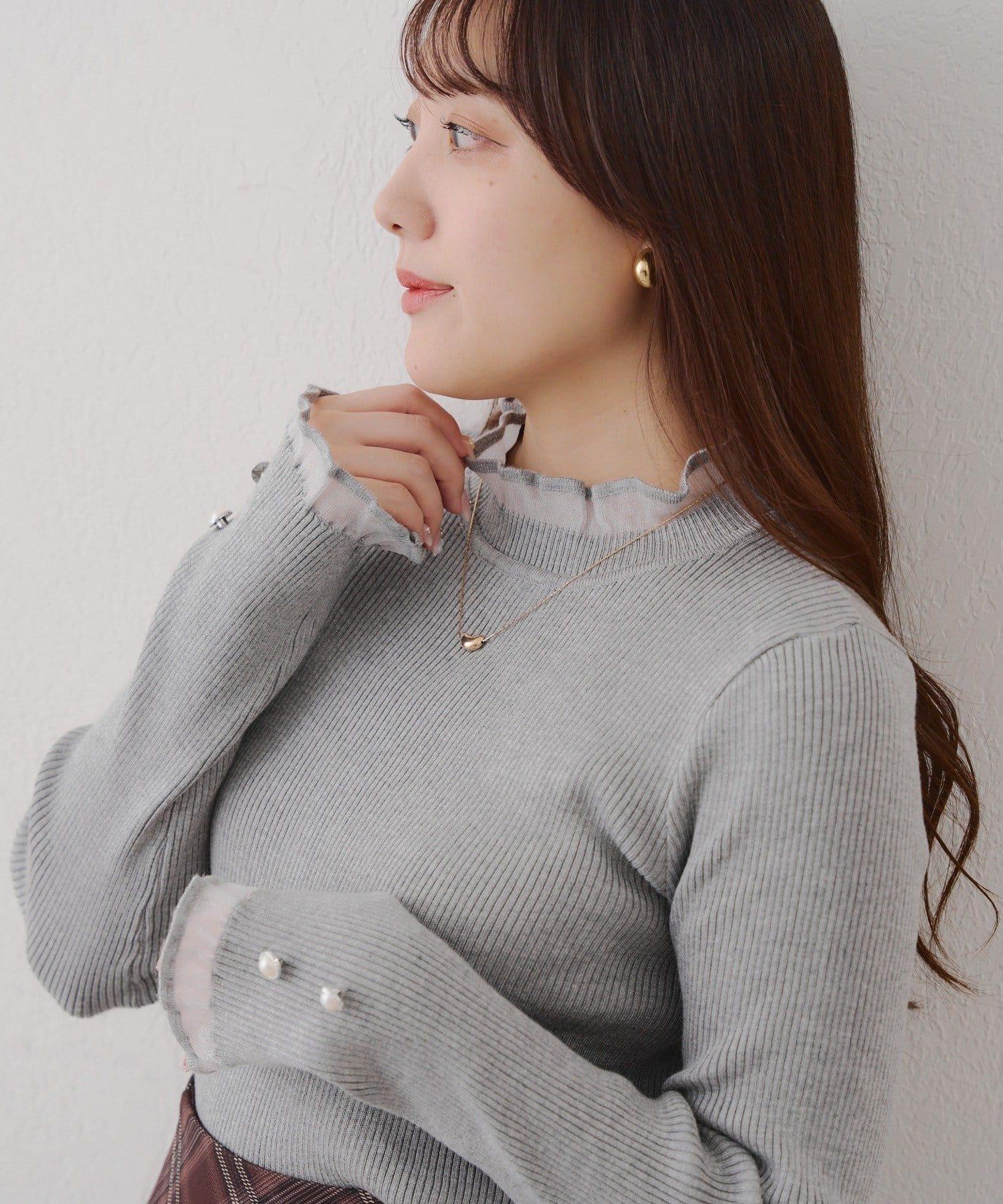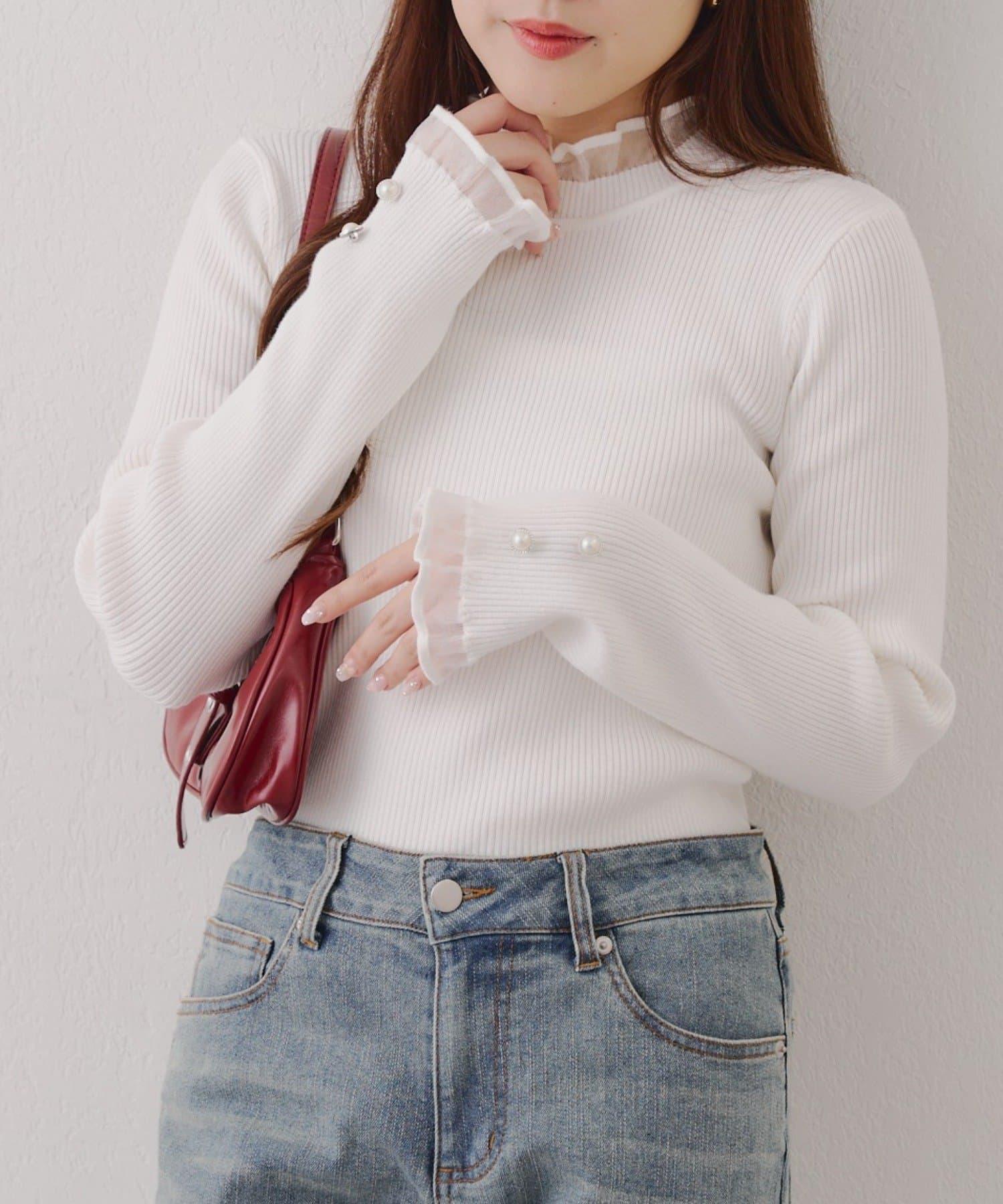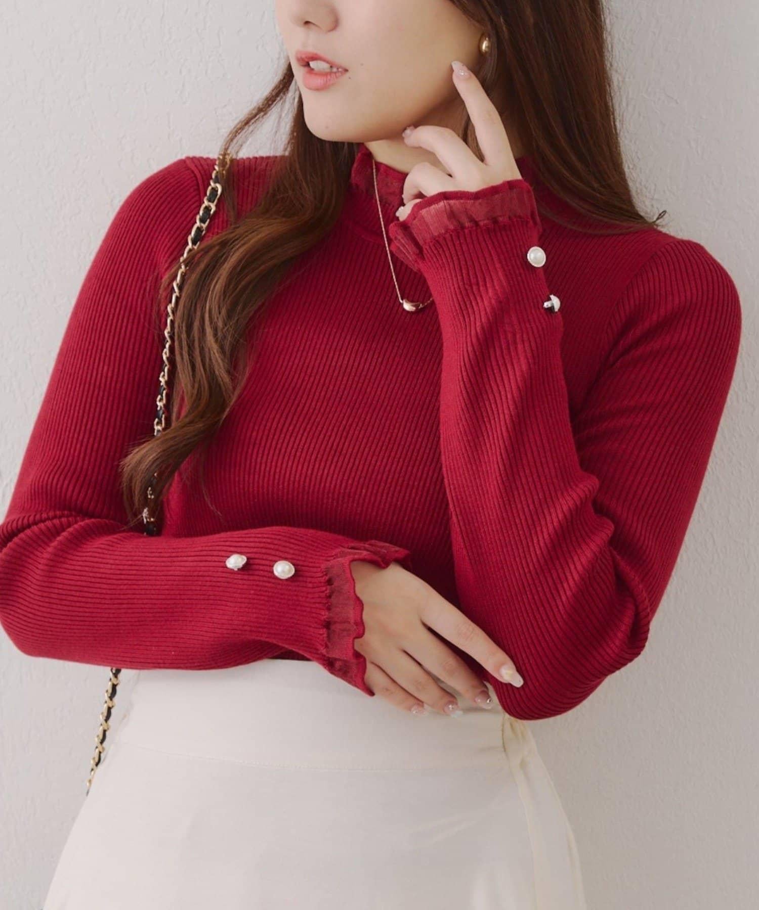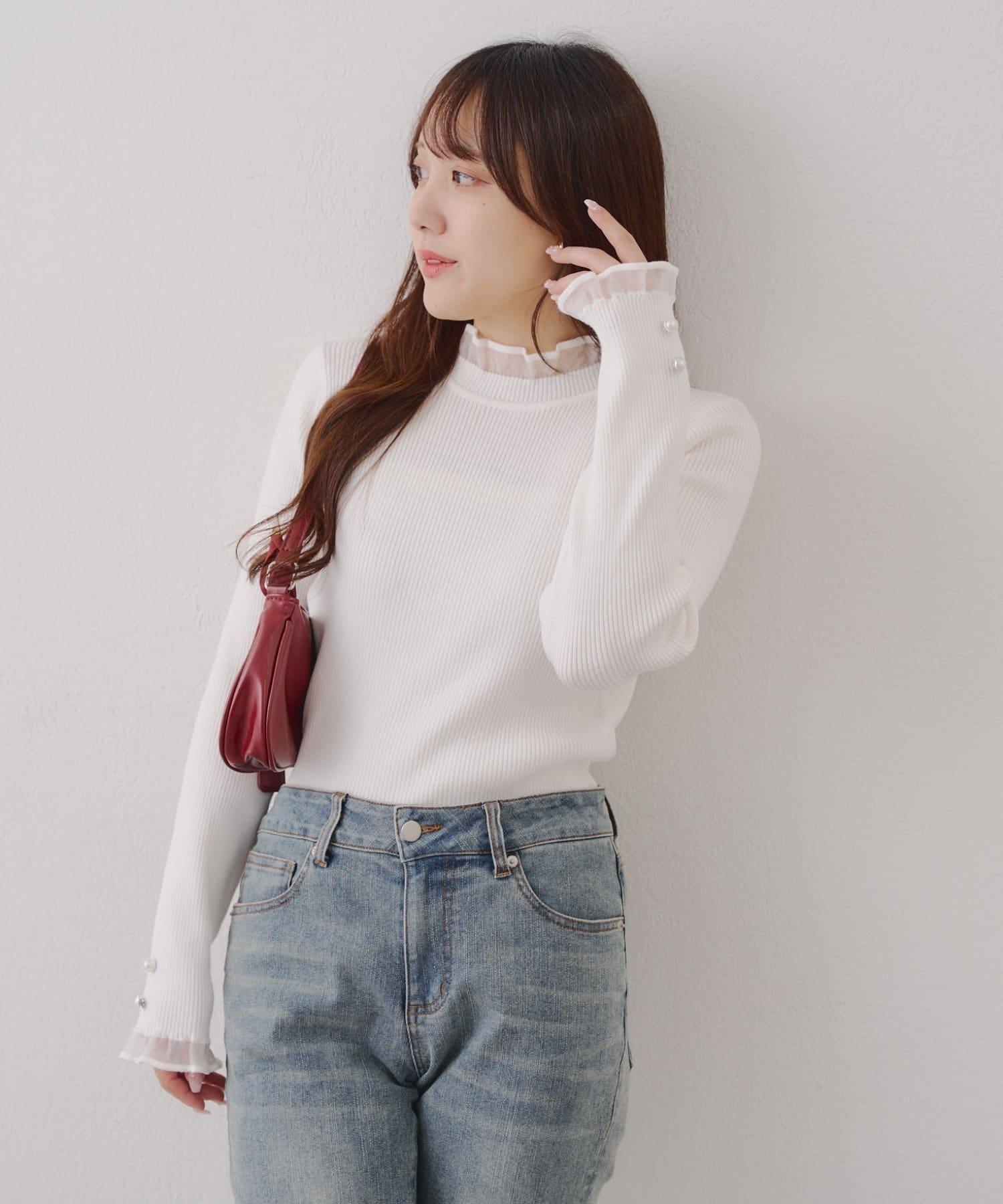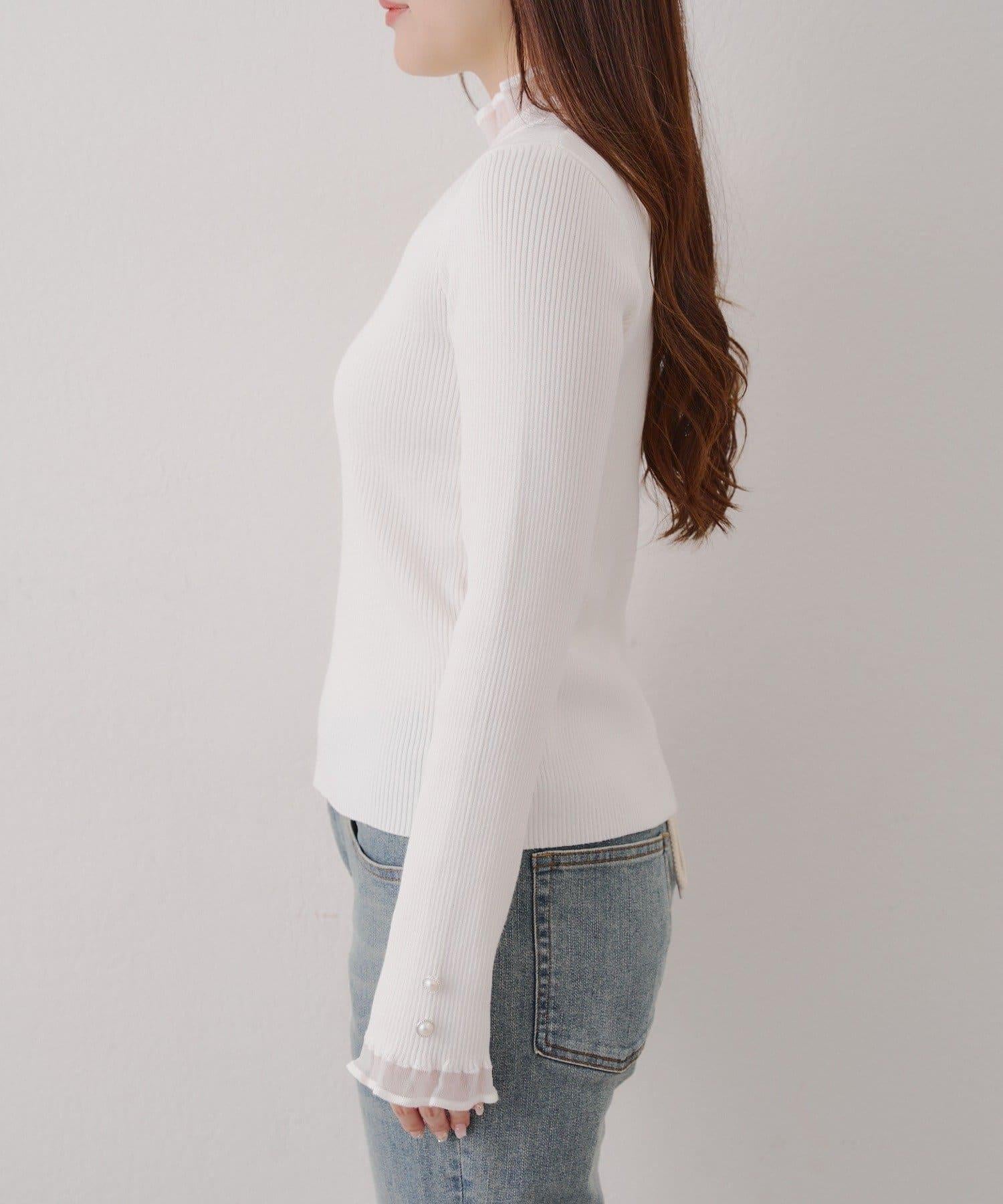 這款針織衫的袖口呈喇叭狀,並配有珠光鈕釦。