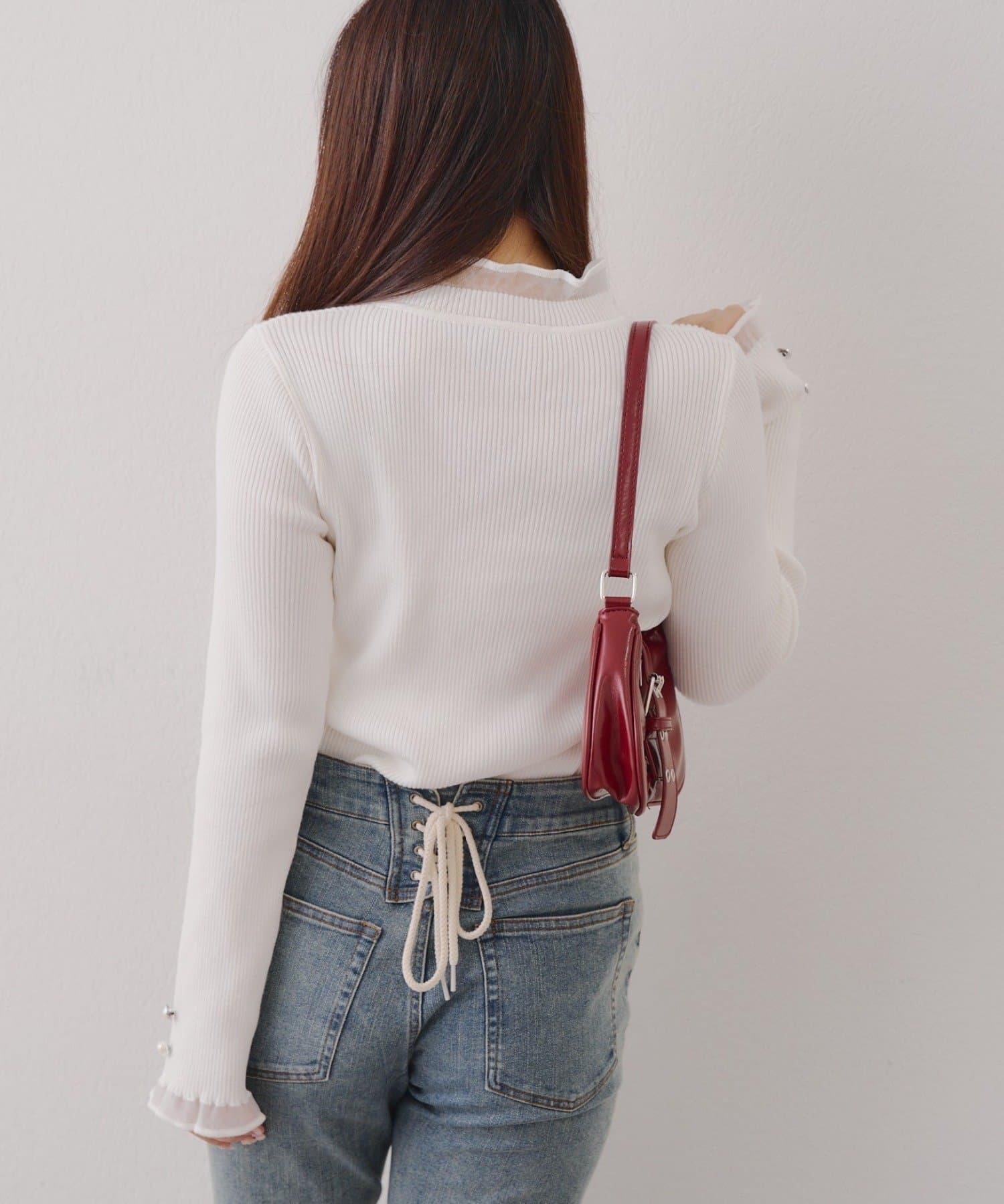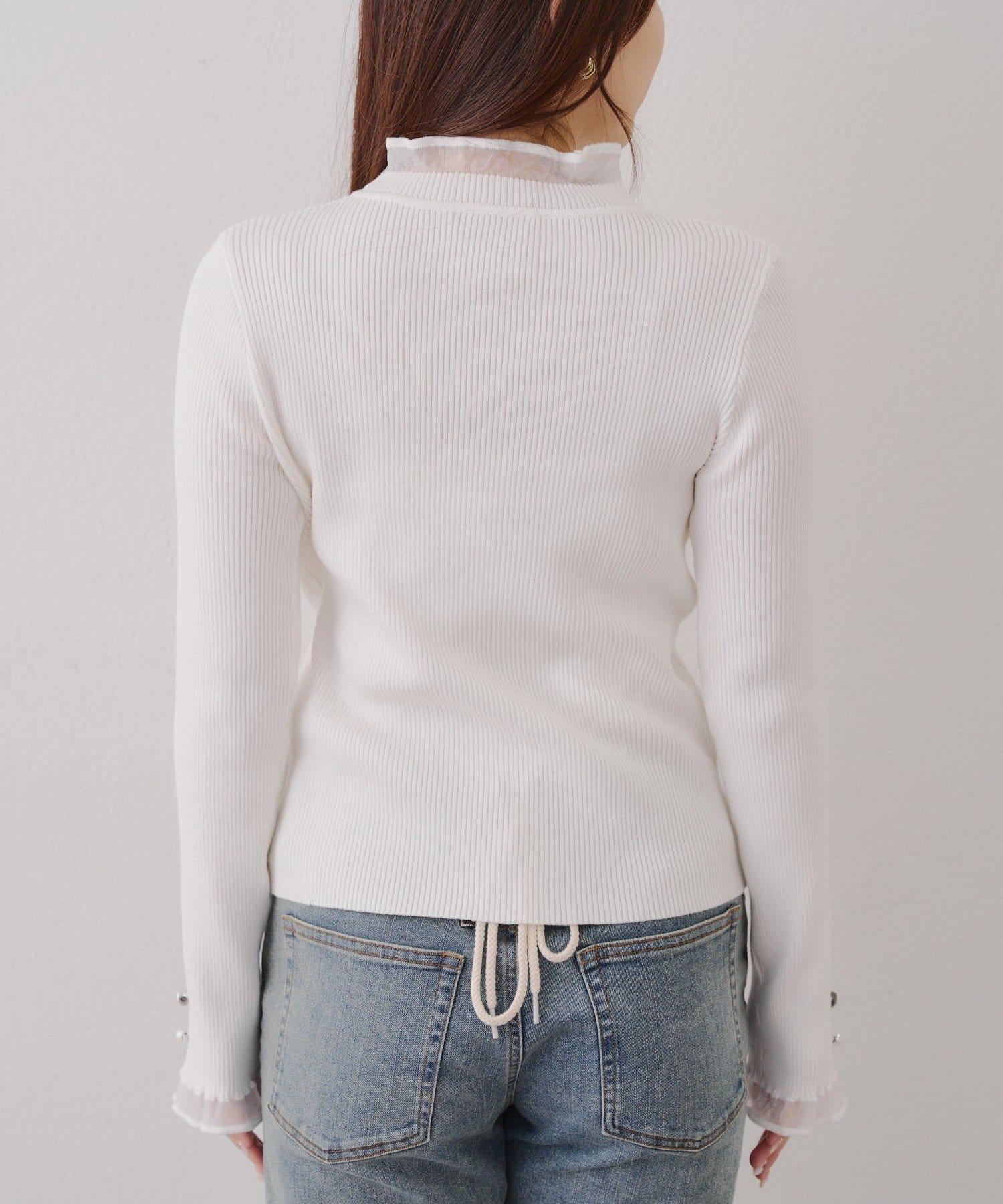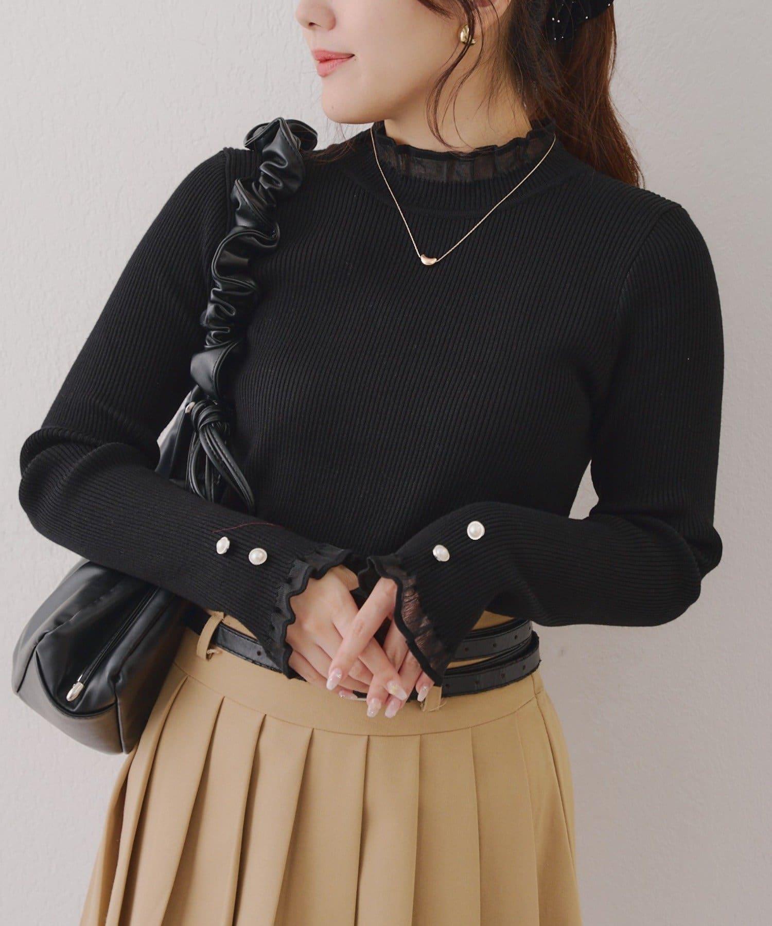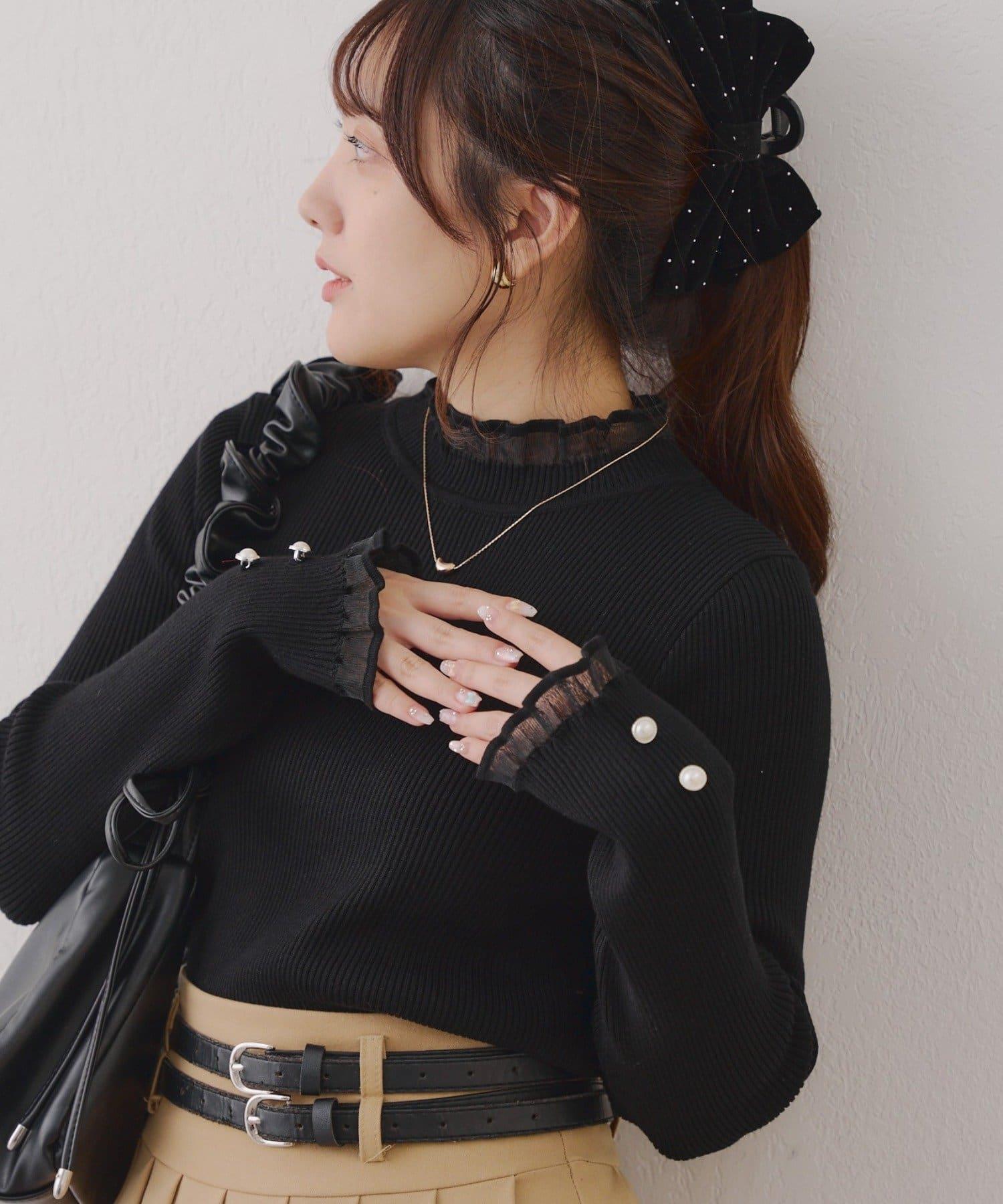 這款針織衫的袖口呈喇叭狀,並配有珠光鈕釦。