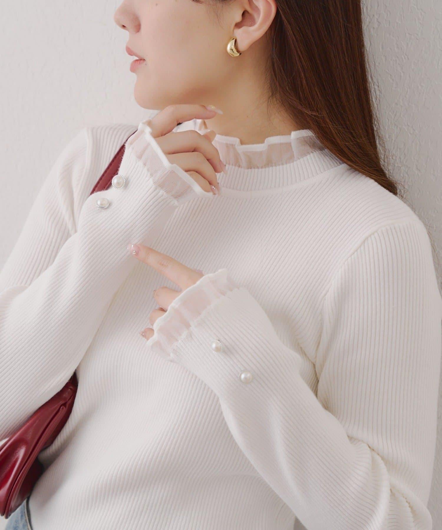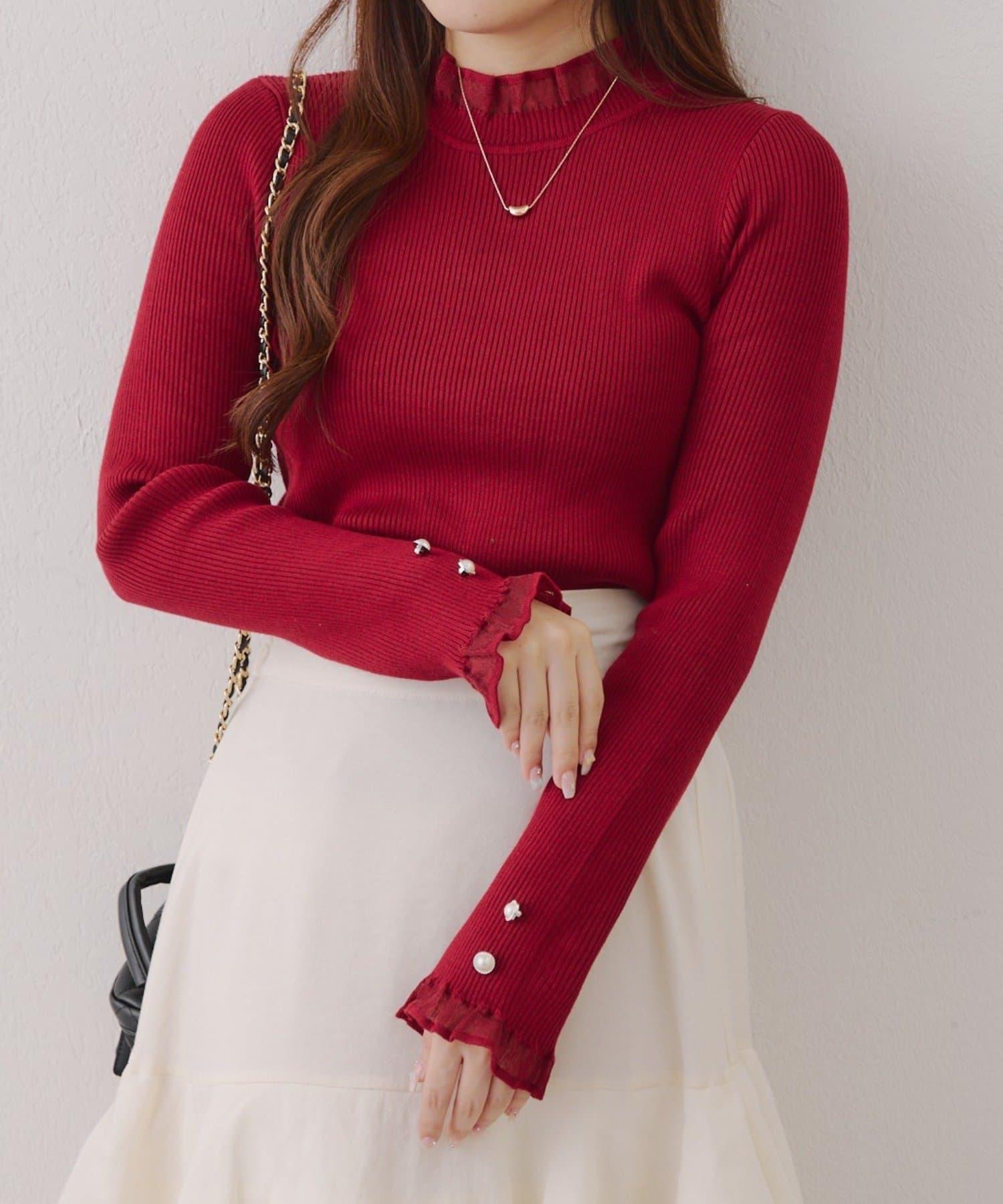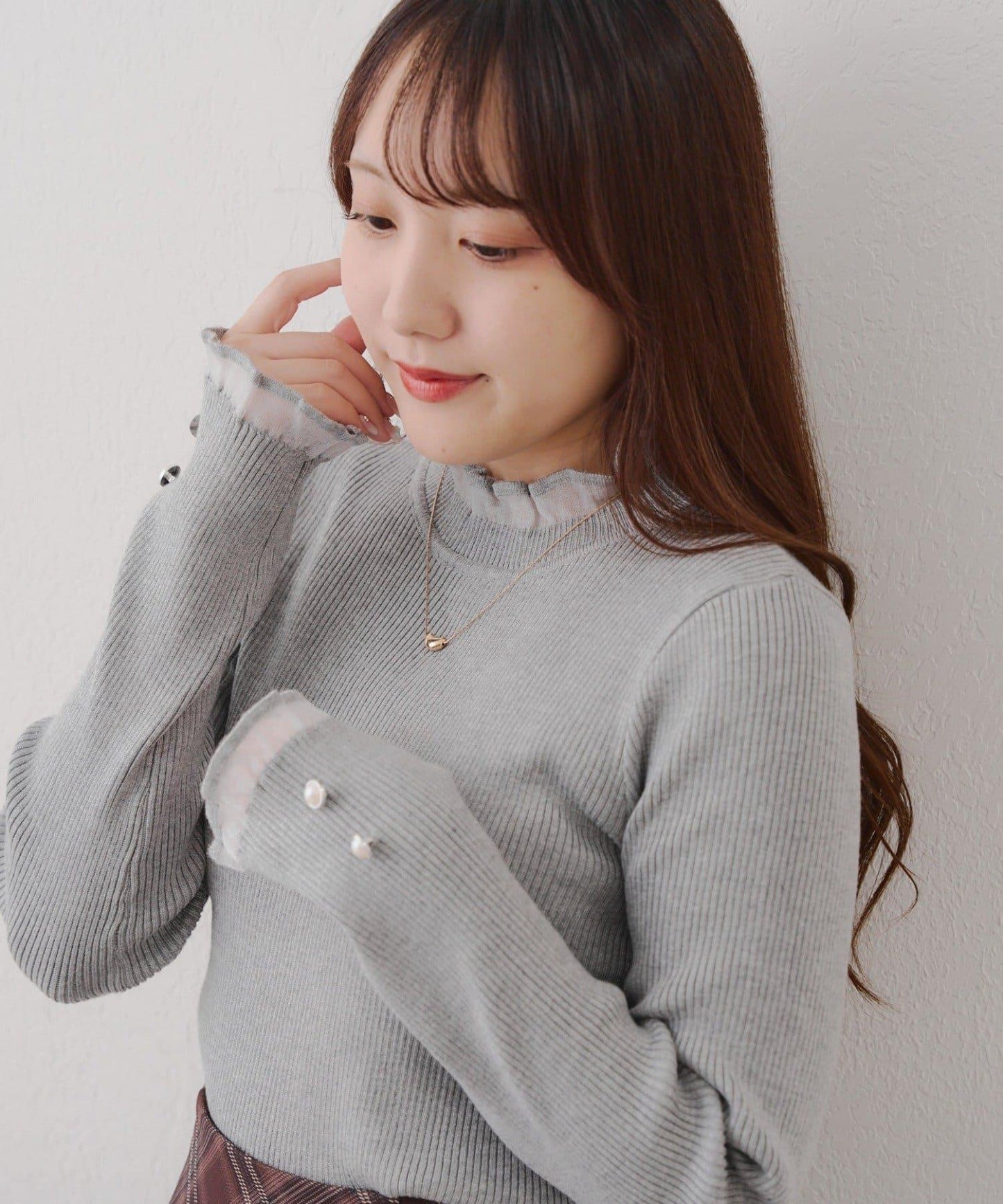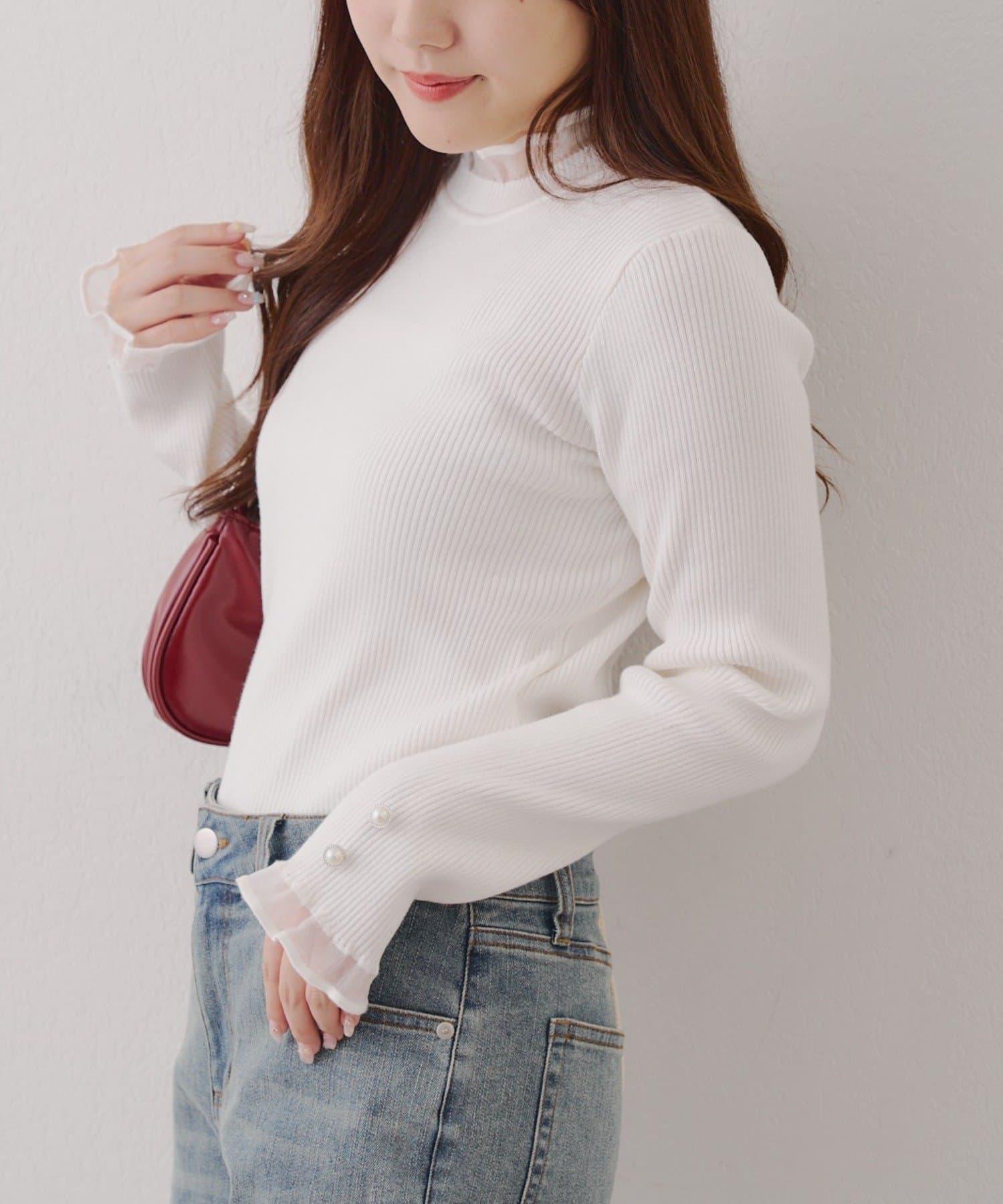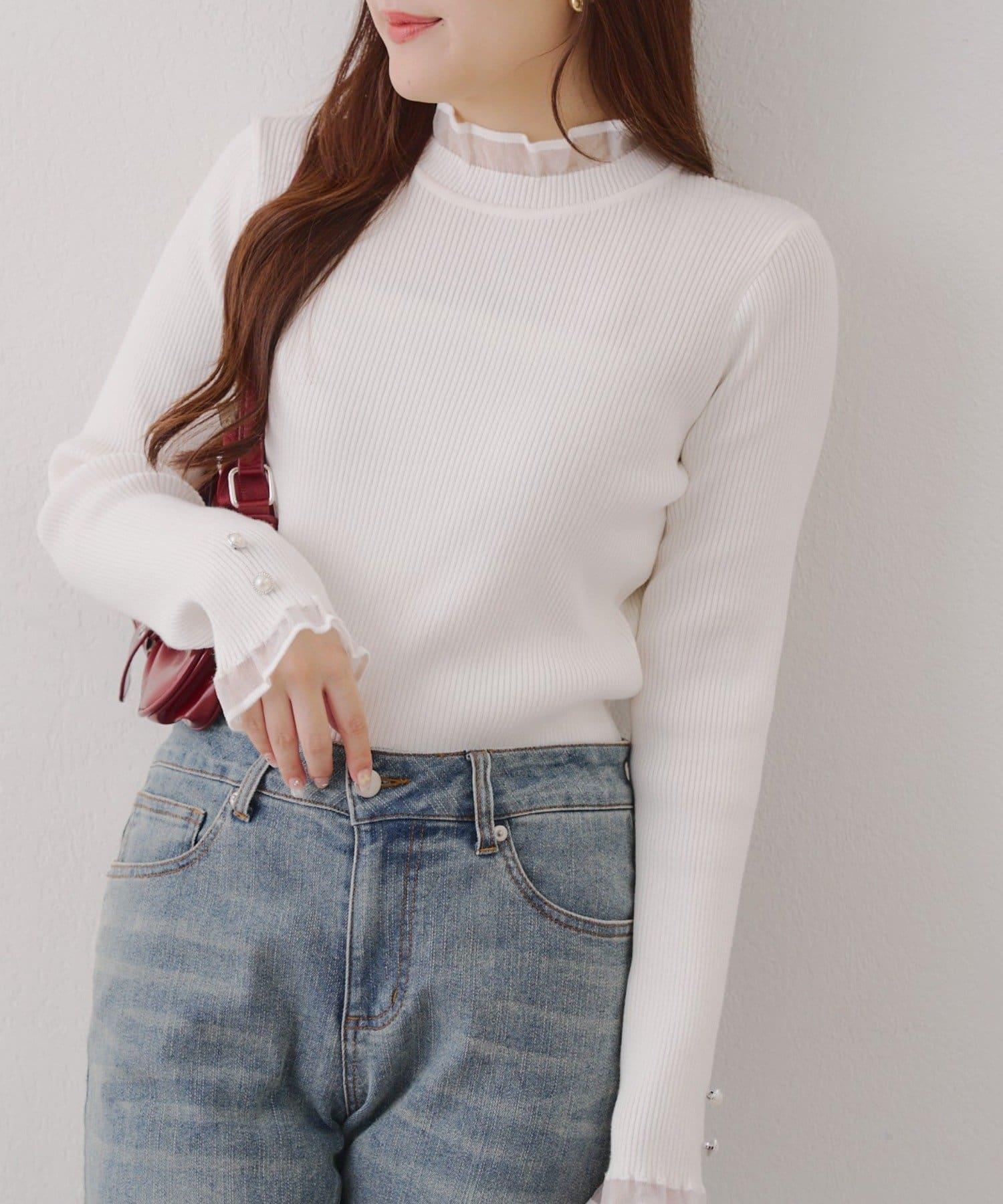 這款針織衫的袖口呈喇叭狀,並配有珠光鈕釦。