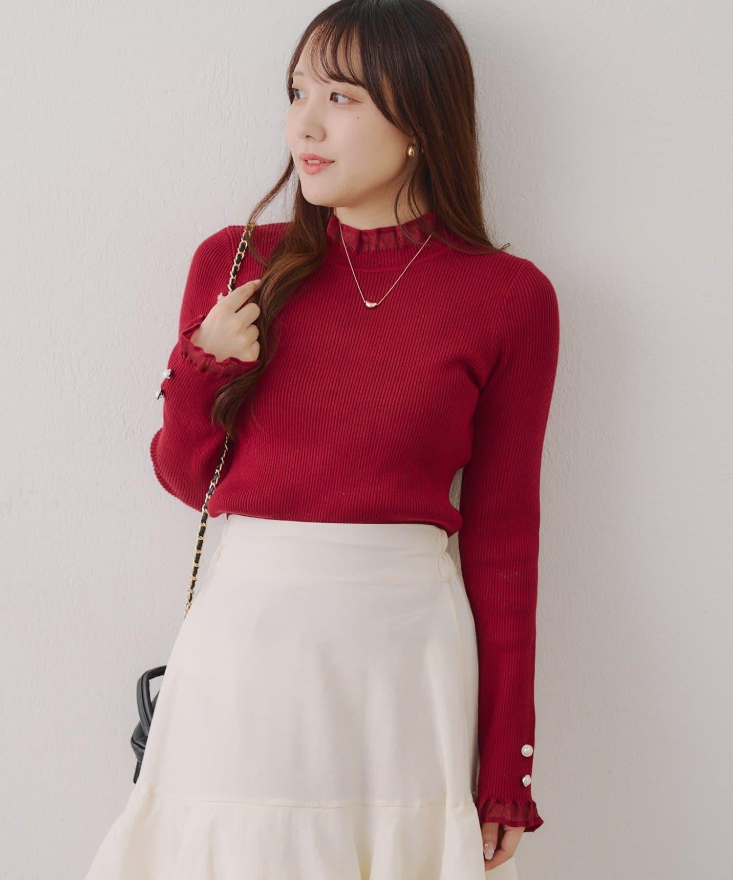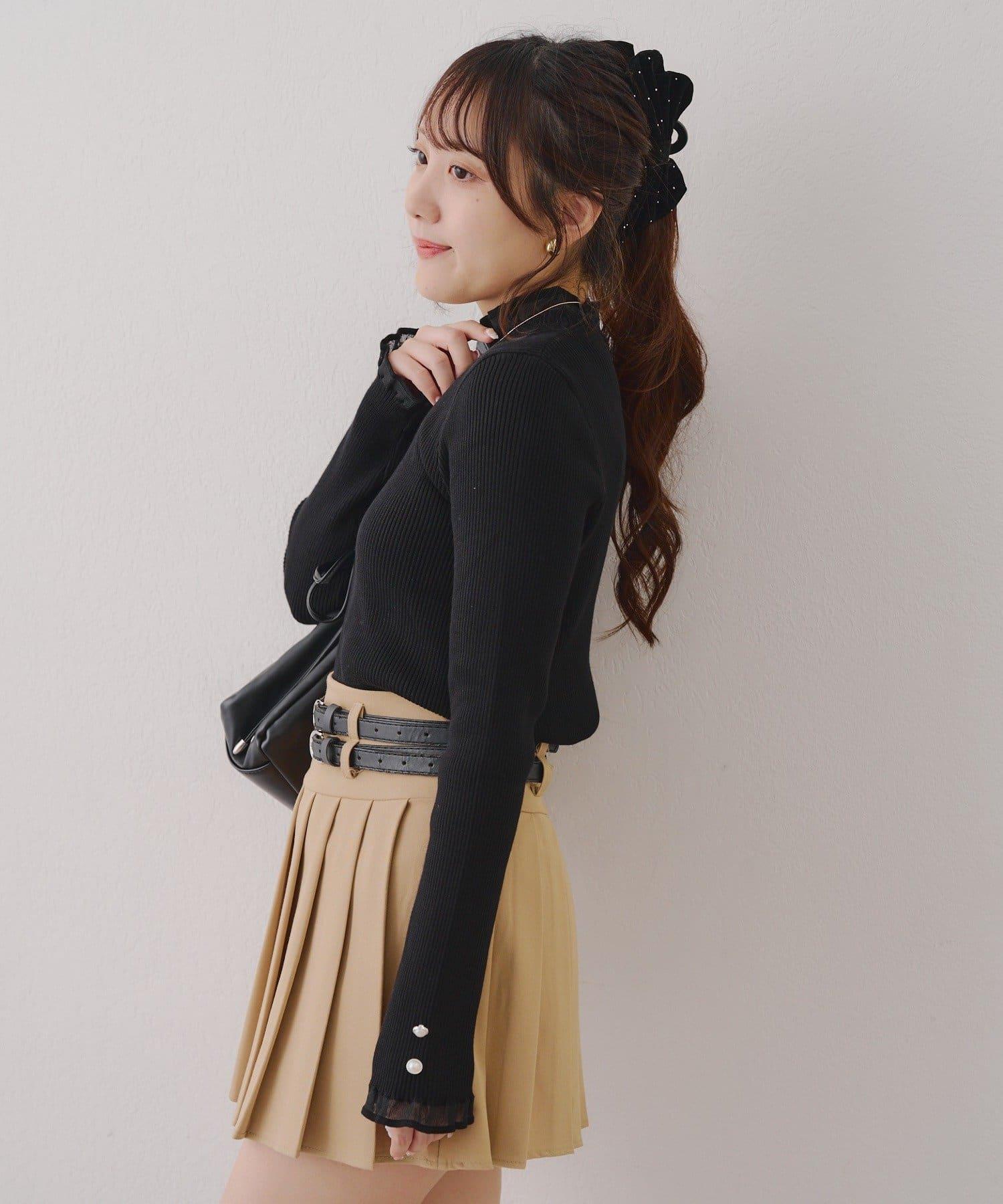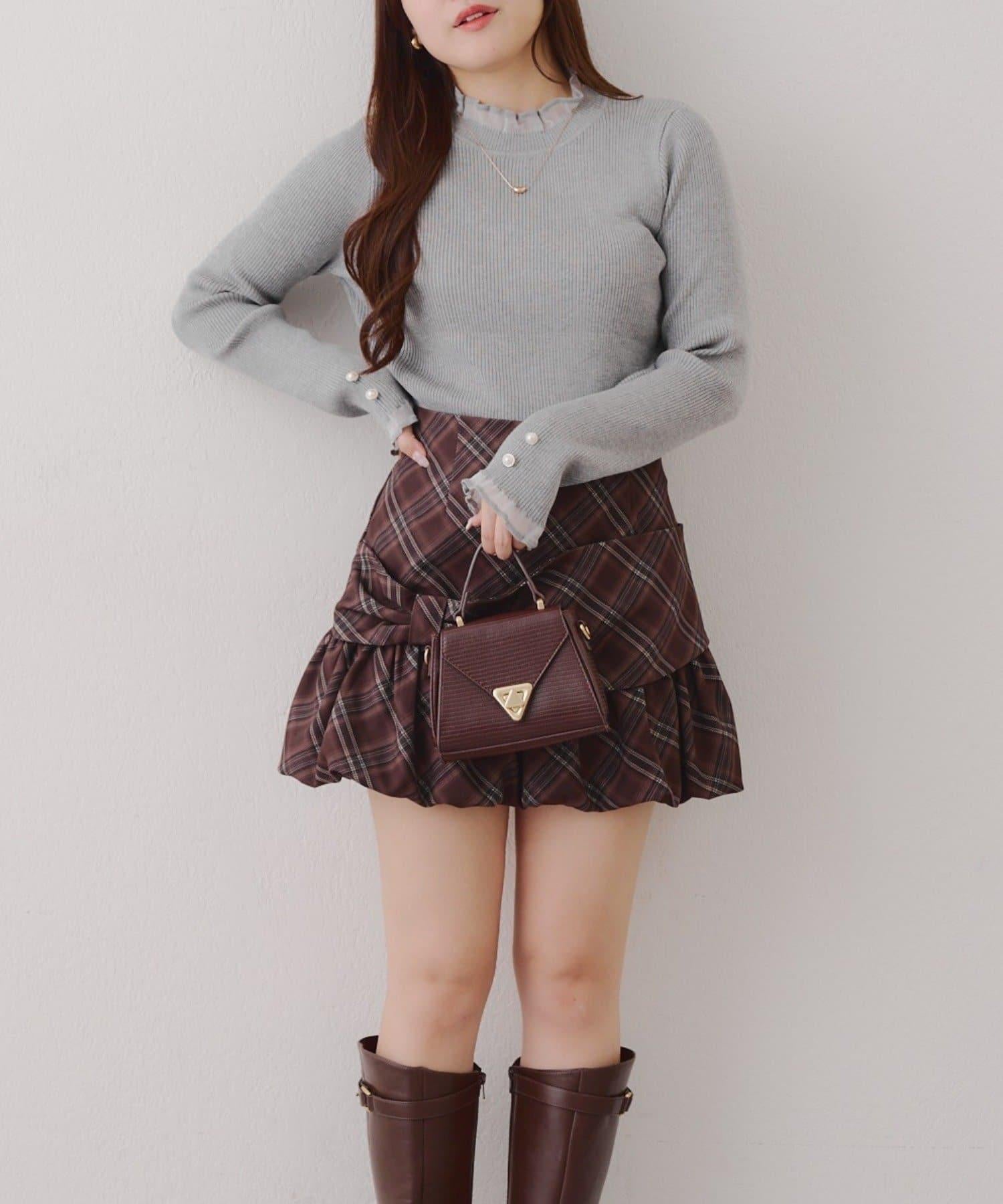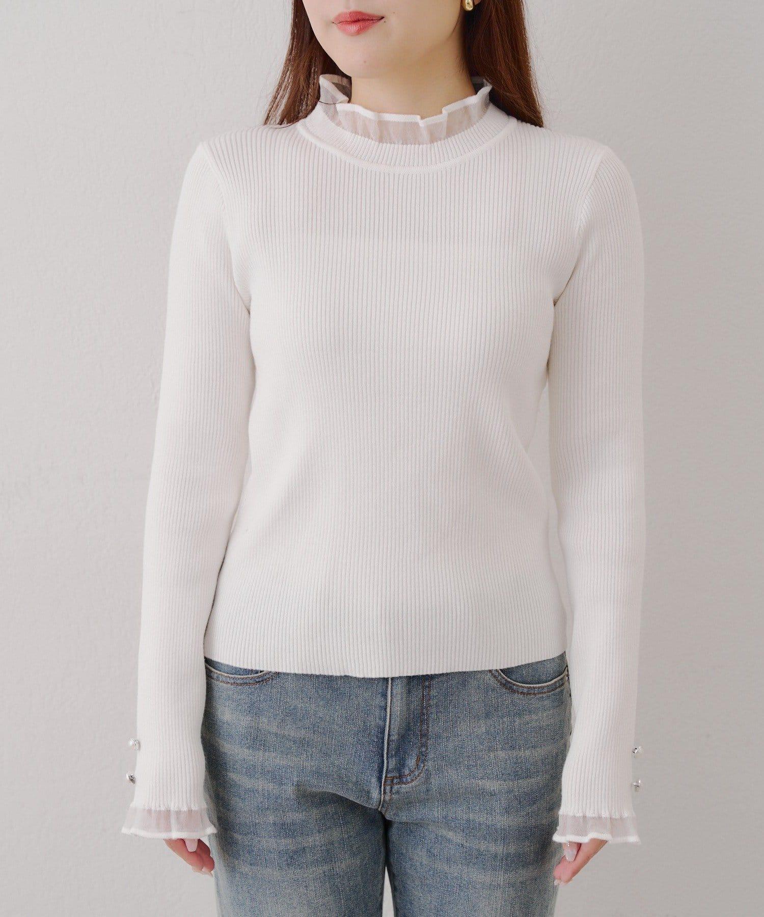 這款針織衫的袖口呈喇叭狀,並配有珠光鈕釦。
